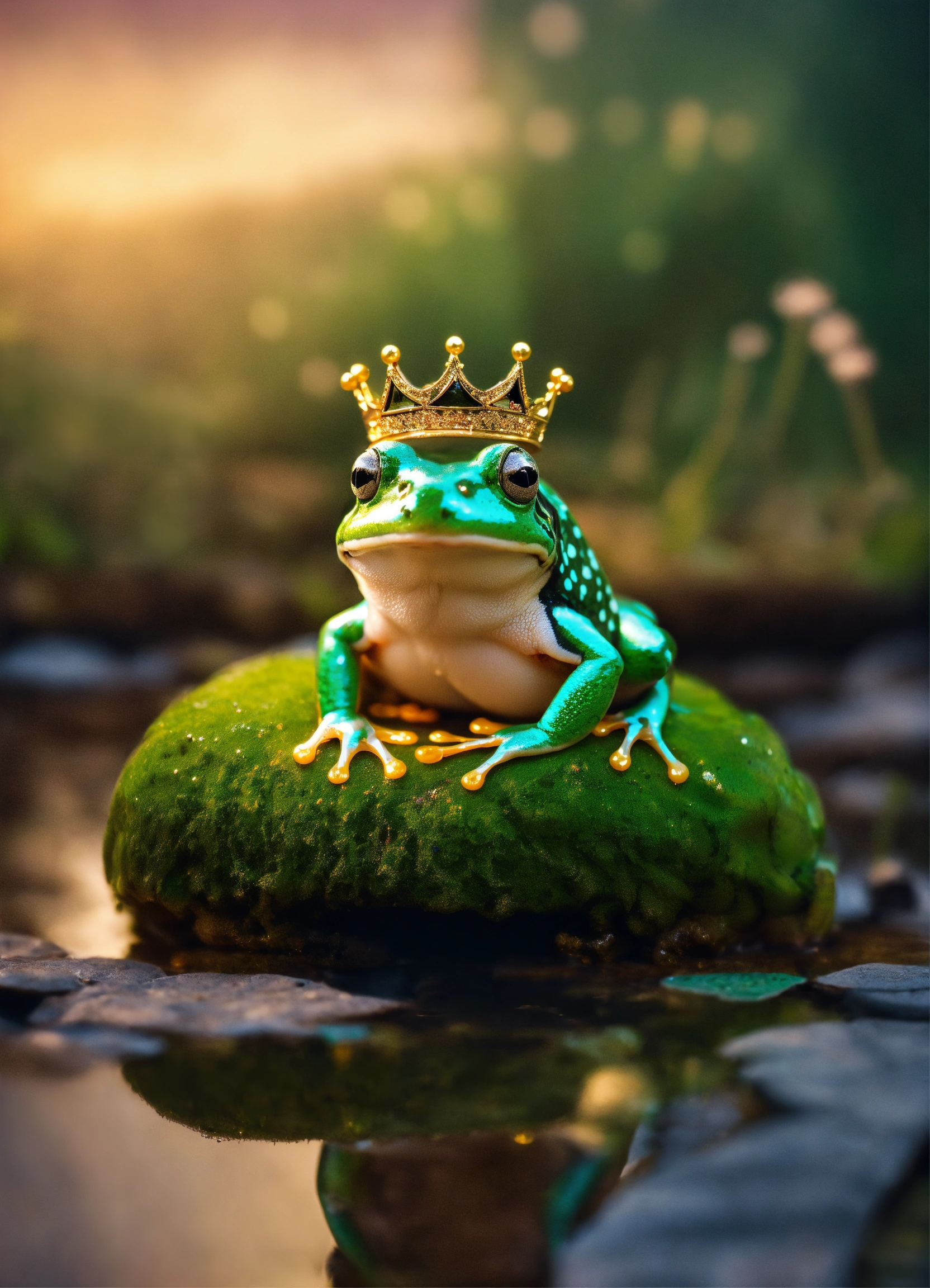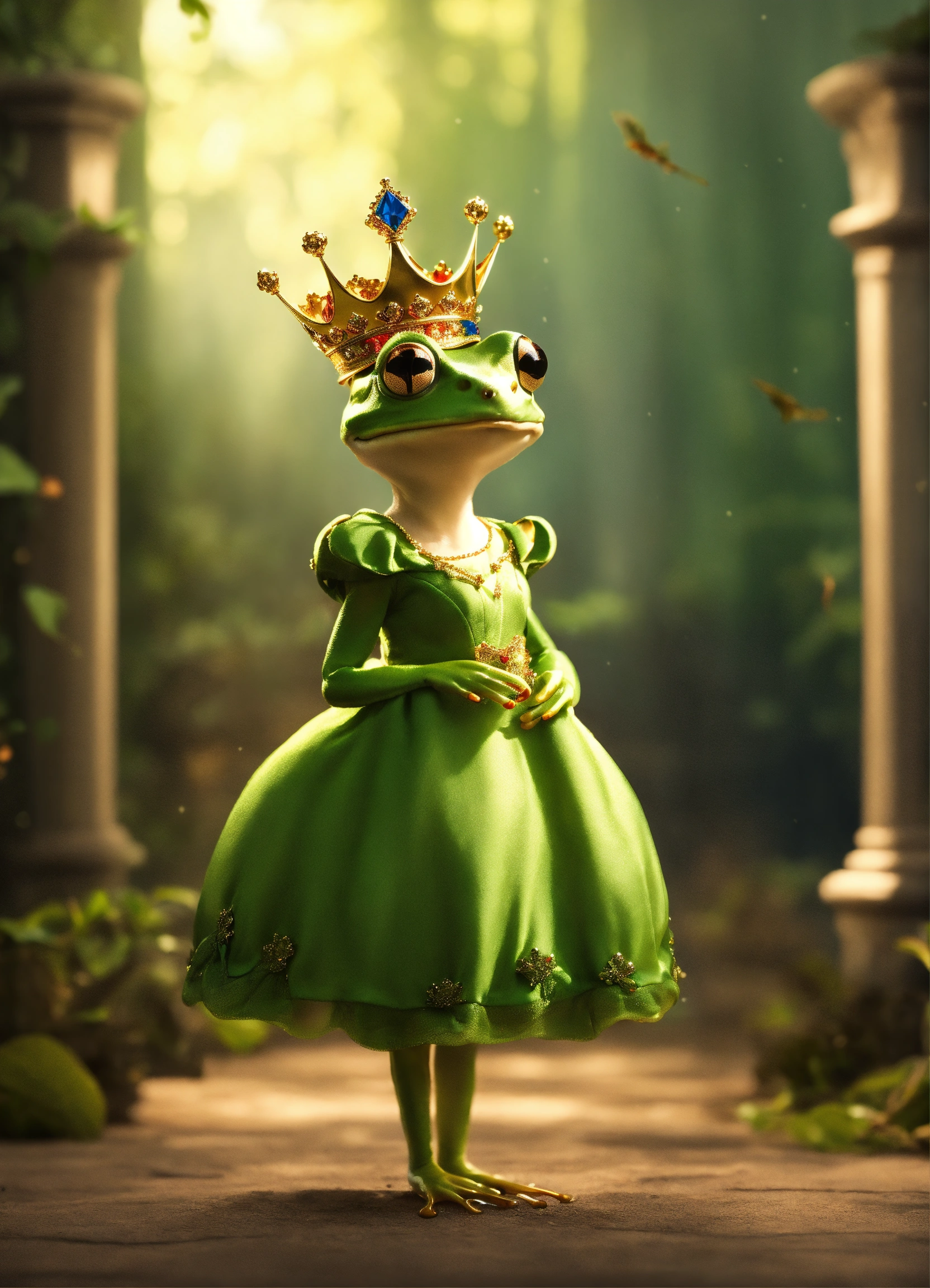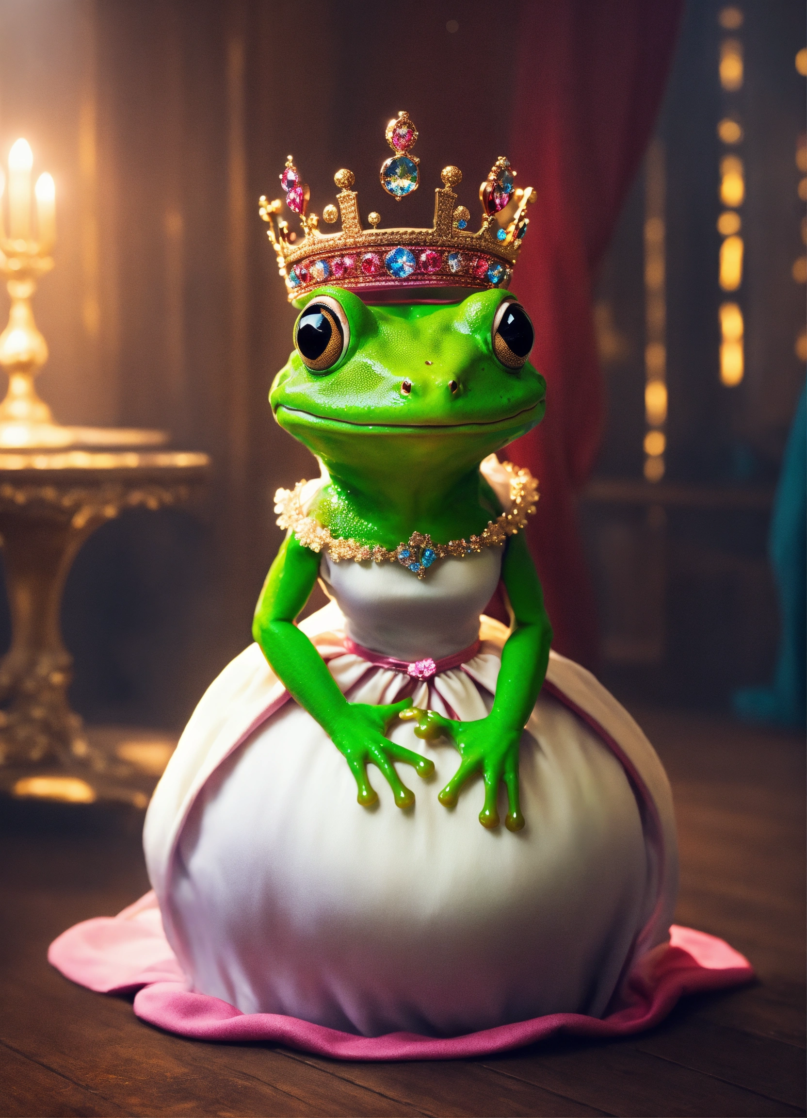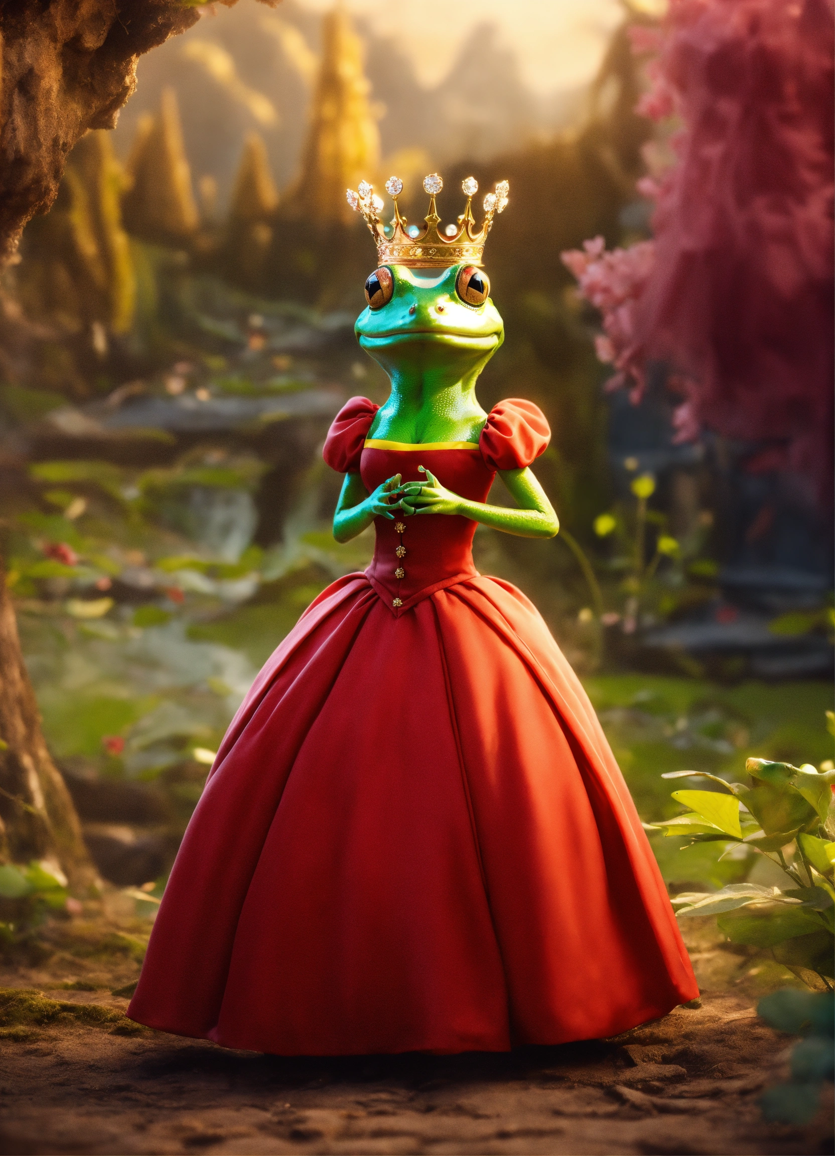 Cute lady frog in dress and crown dressed in gown in cinematic environment