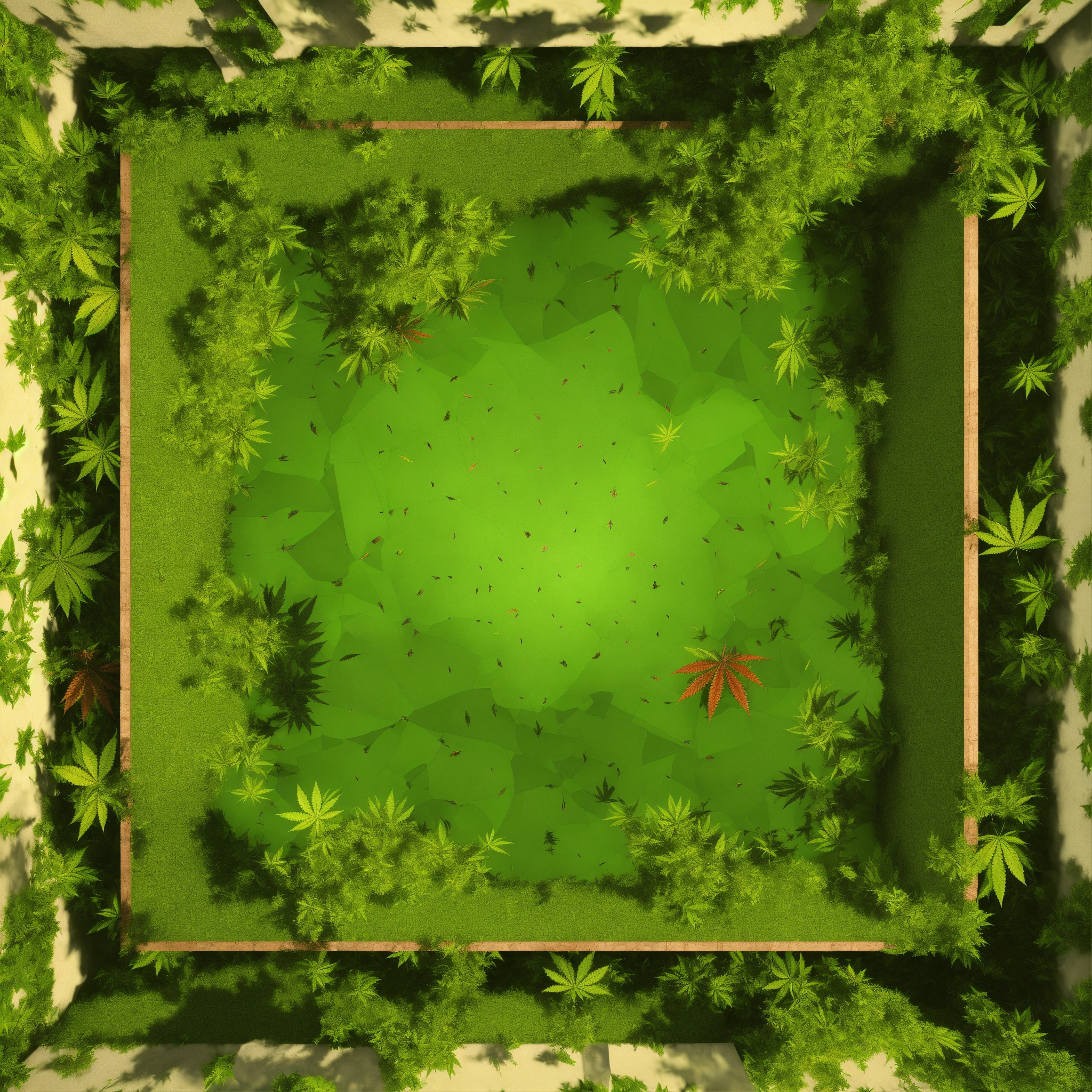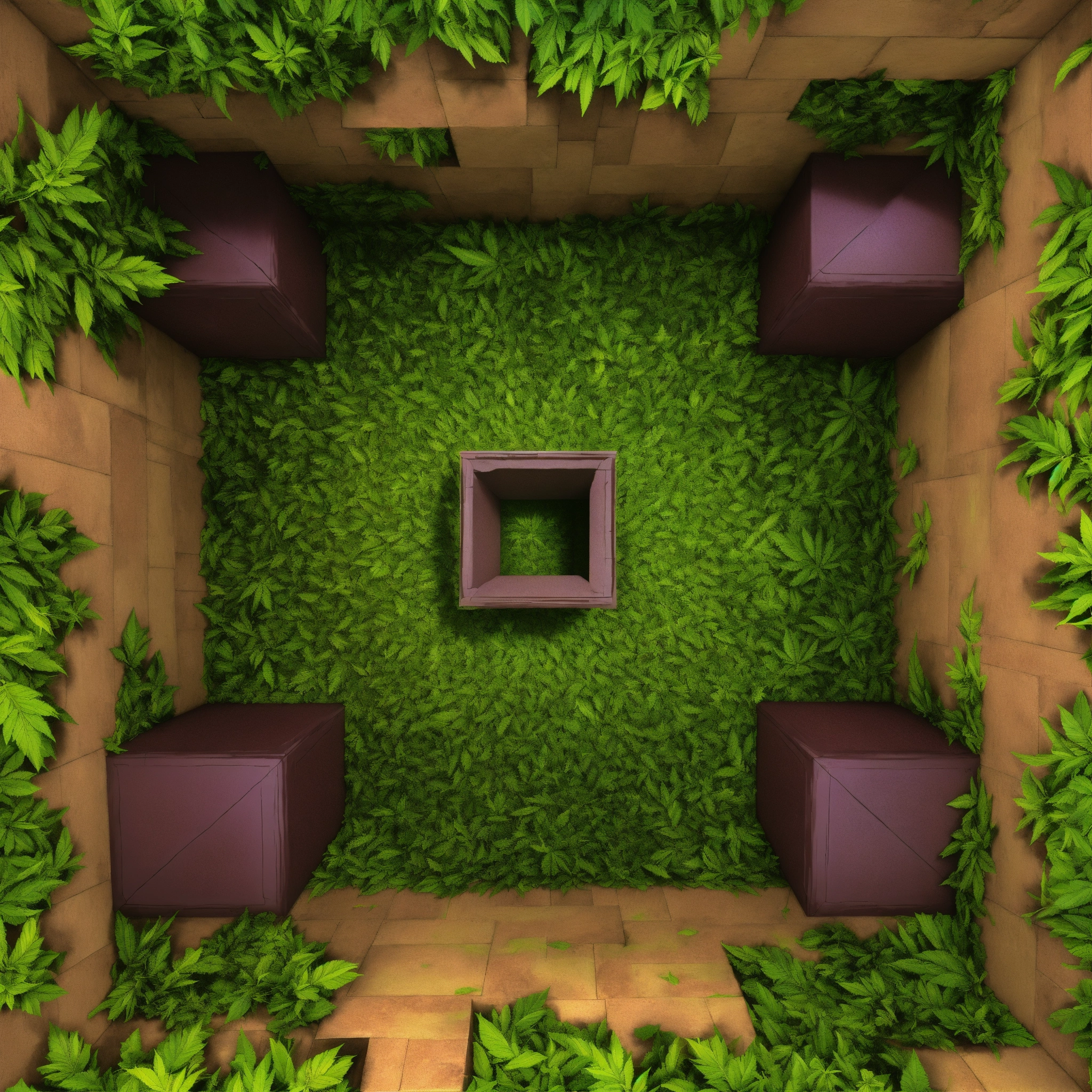A texture for cubemap 3 sides projection with optical illusion where ganja leaves falling down into the huge rabbit hole, symmetrical, top view