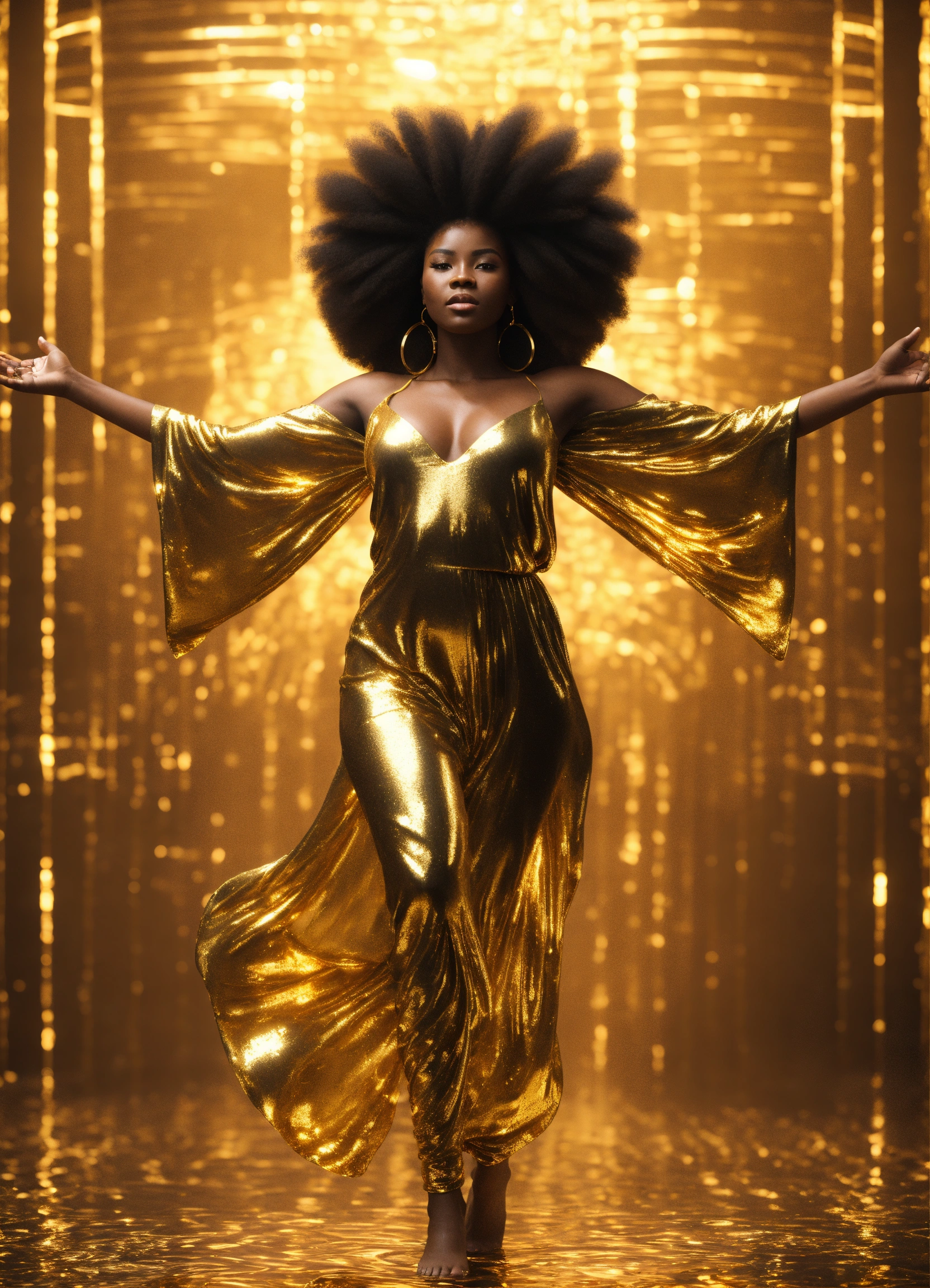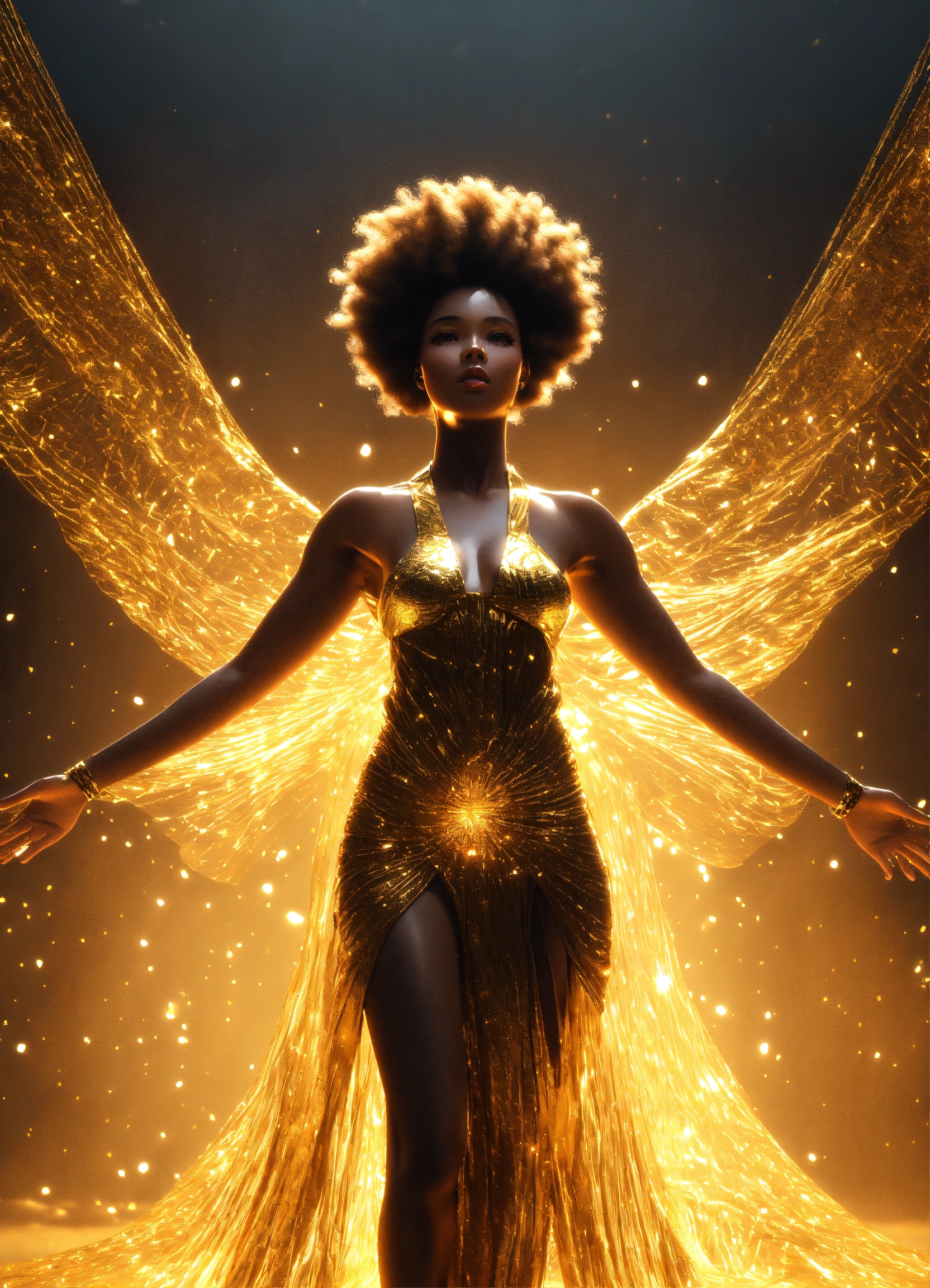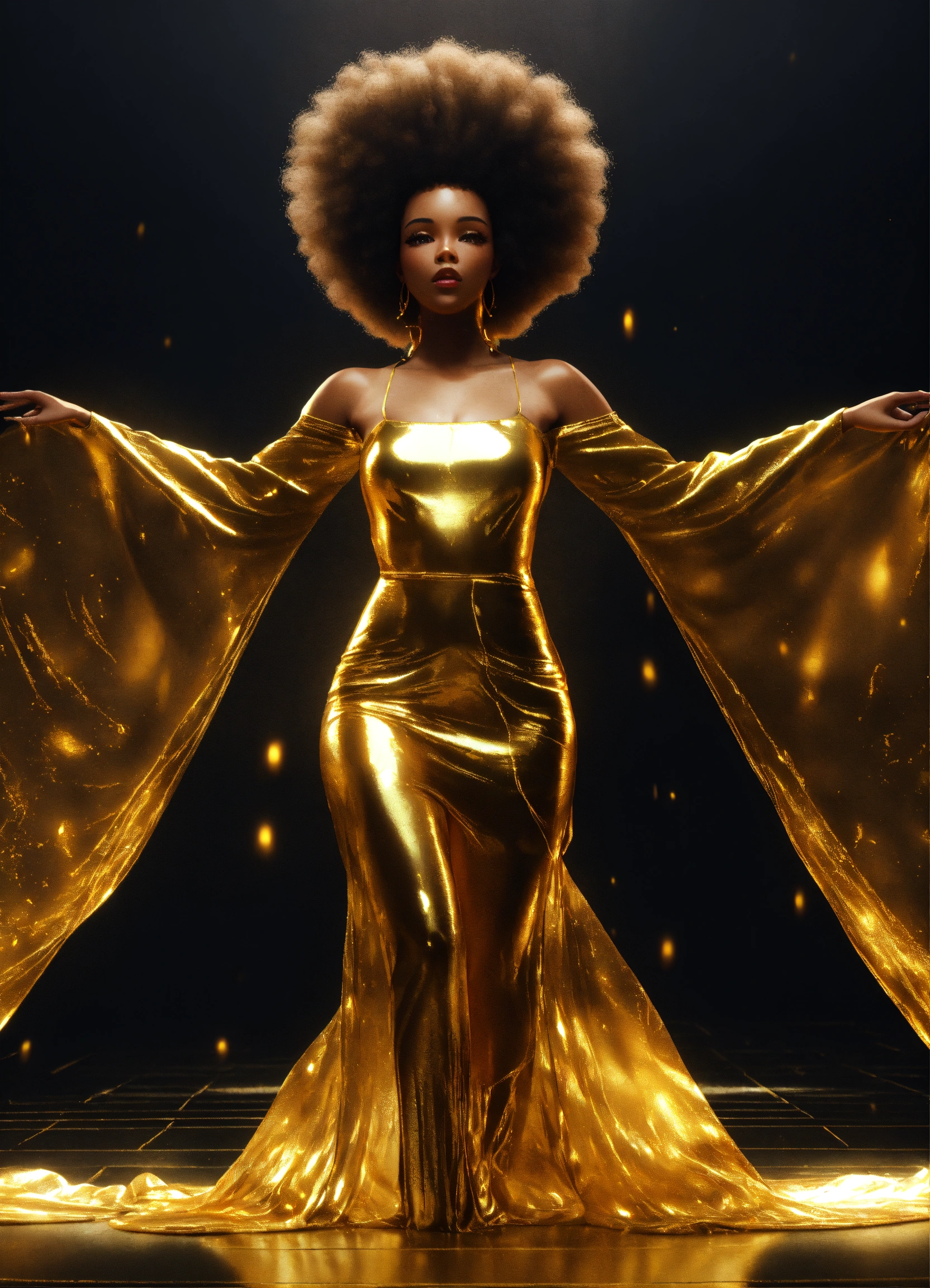 3d render of black woman with afro, full body shot, standing, arms outstretched to sides at shoulders palms up, eyes open looking directly into camera, translucent skin, liquid gold flows through her entire translucent face and body, illuminating her form from within, wearing long, flowing gold african style clothing