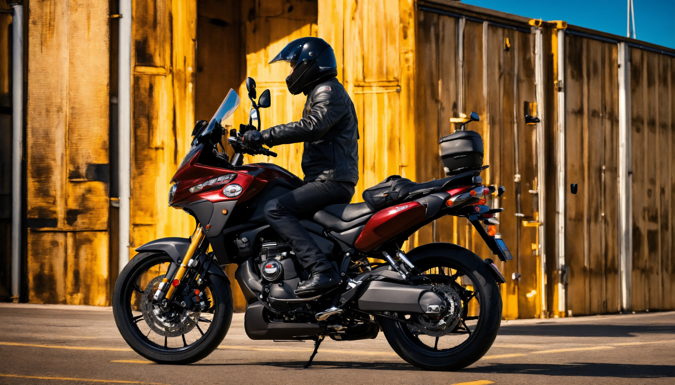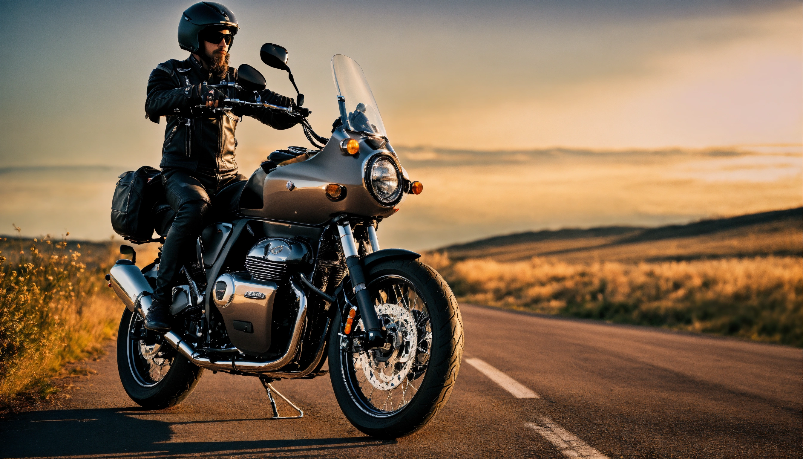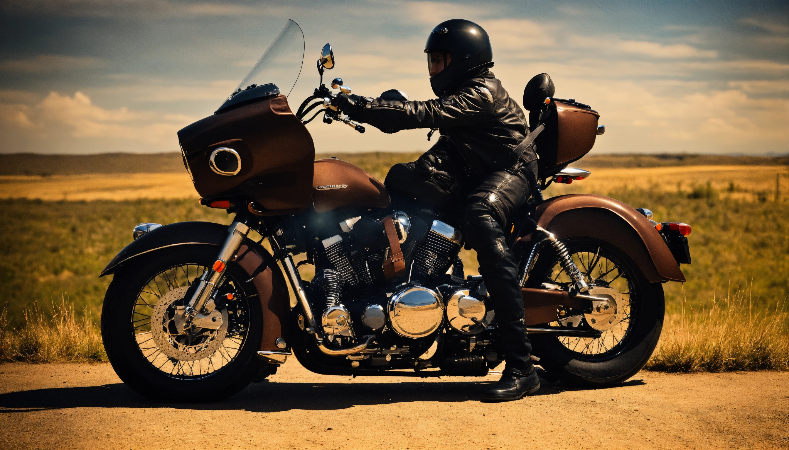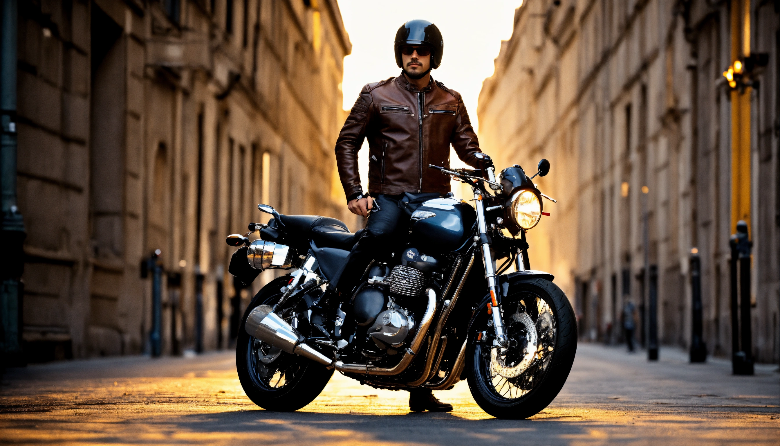 "generate images of a man dressed as a motorcyclist with a motor-touring style. the outfit should include a leather or cordura jacket, typical of motorcycle travelers or tourers. show variations of this style with different poses and backgrounds."