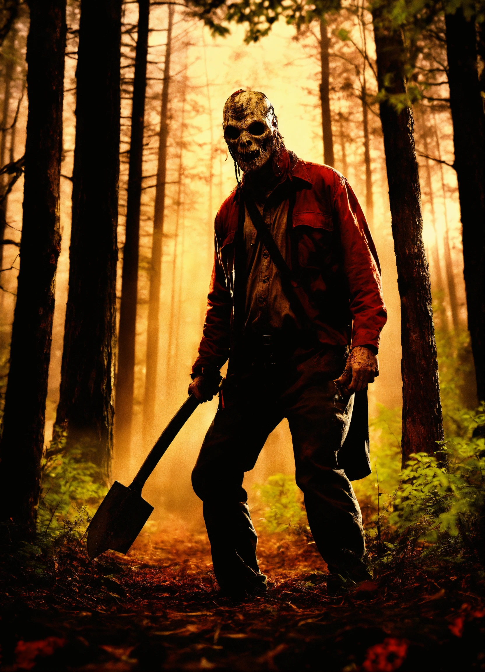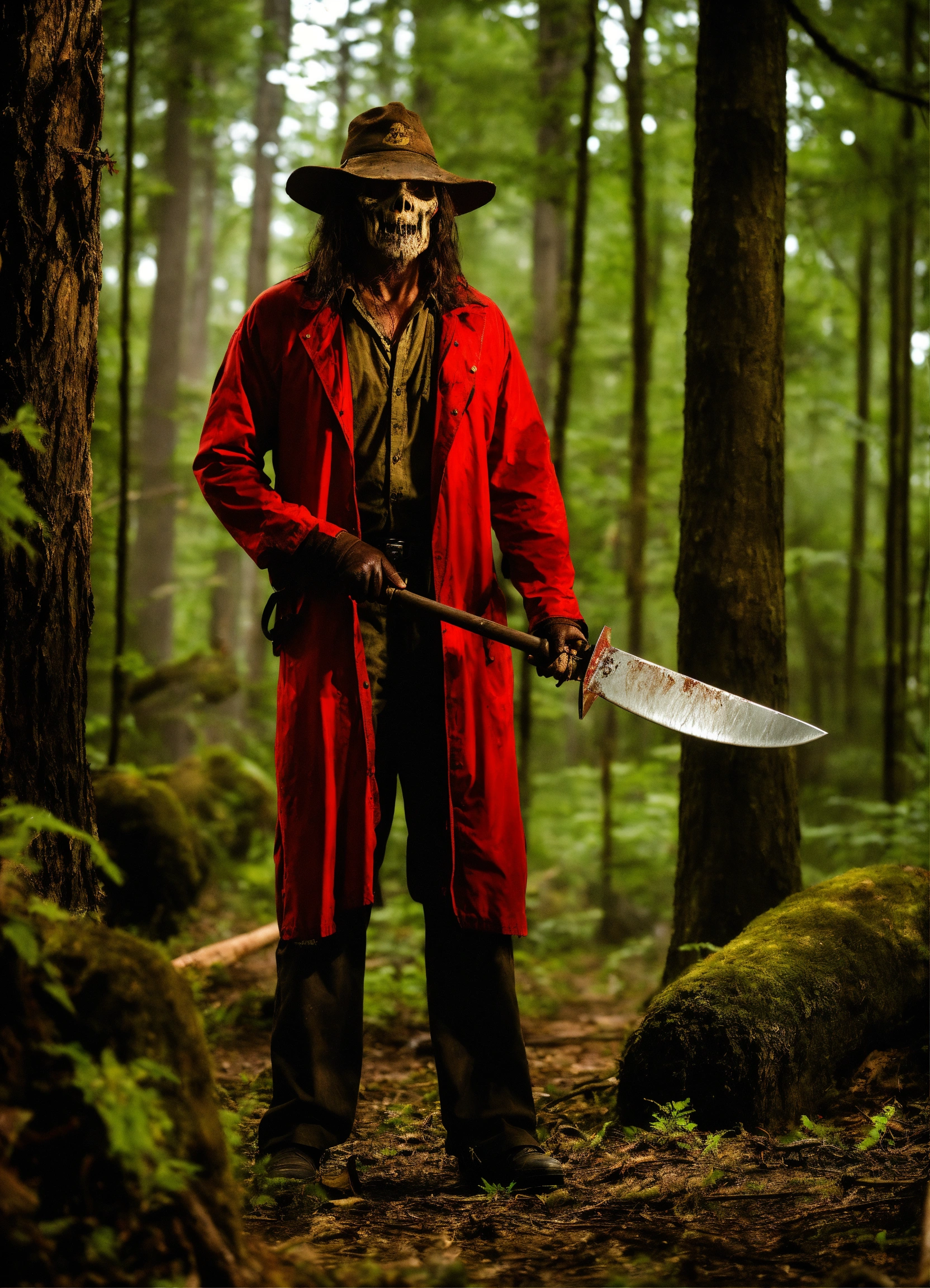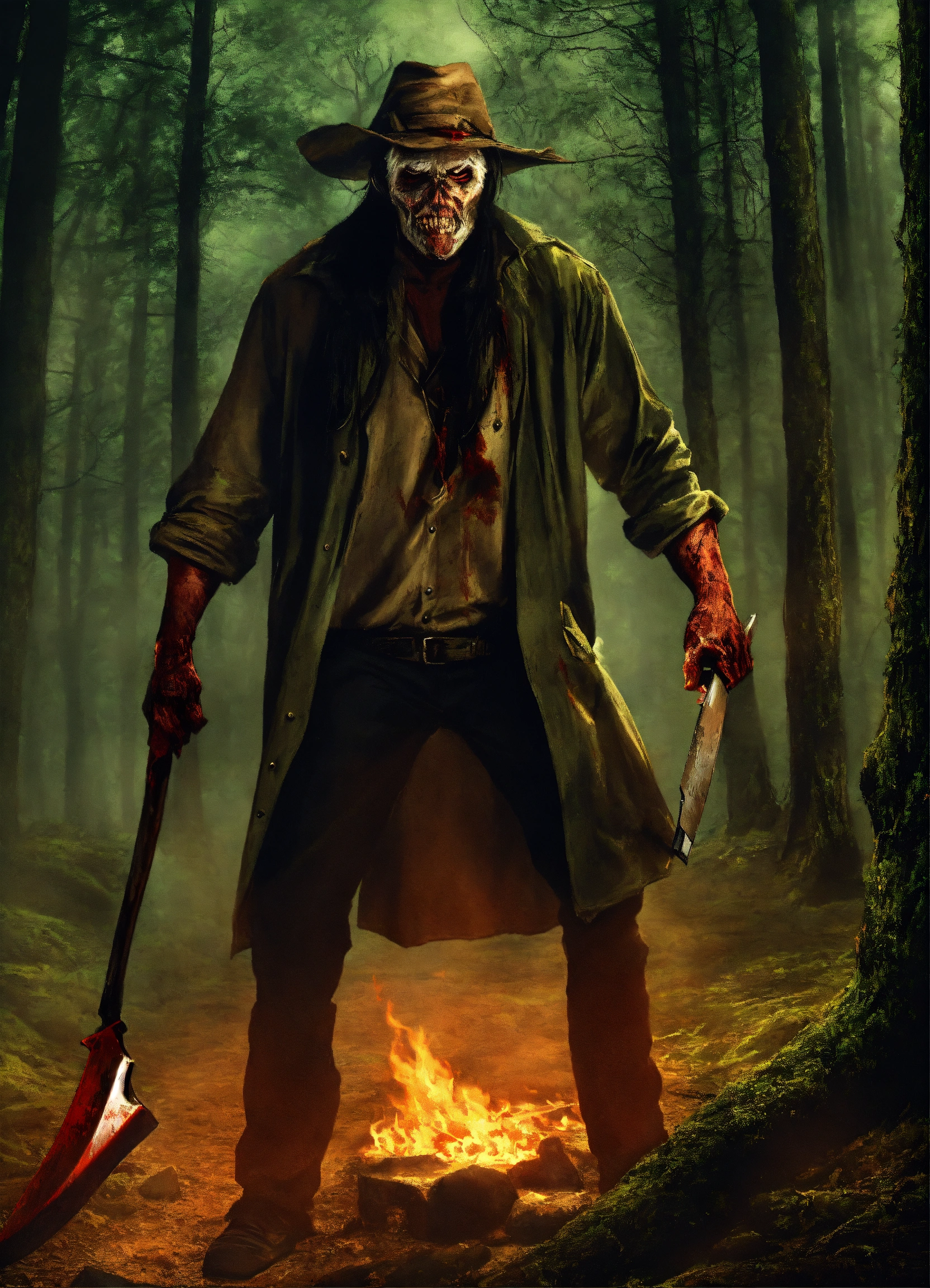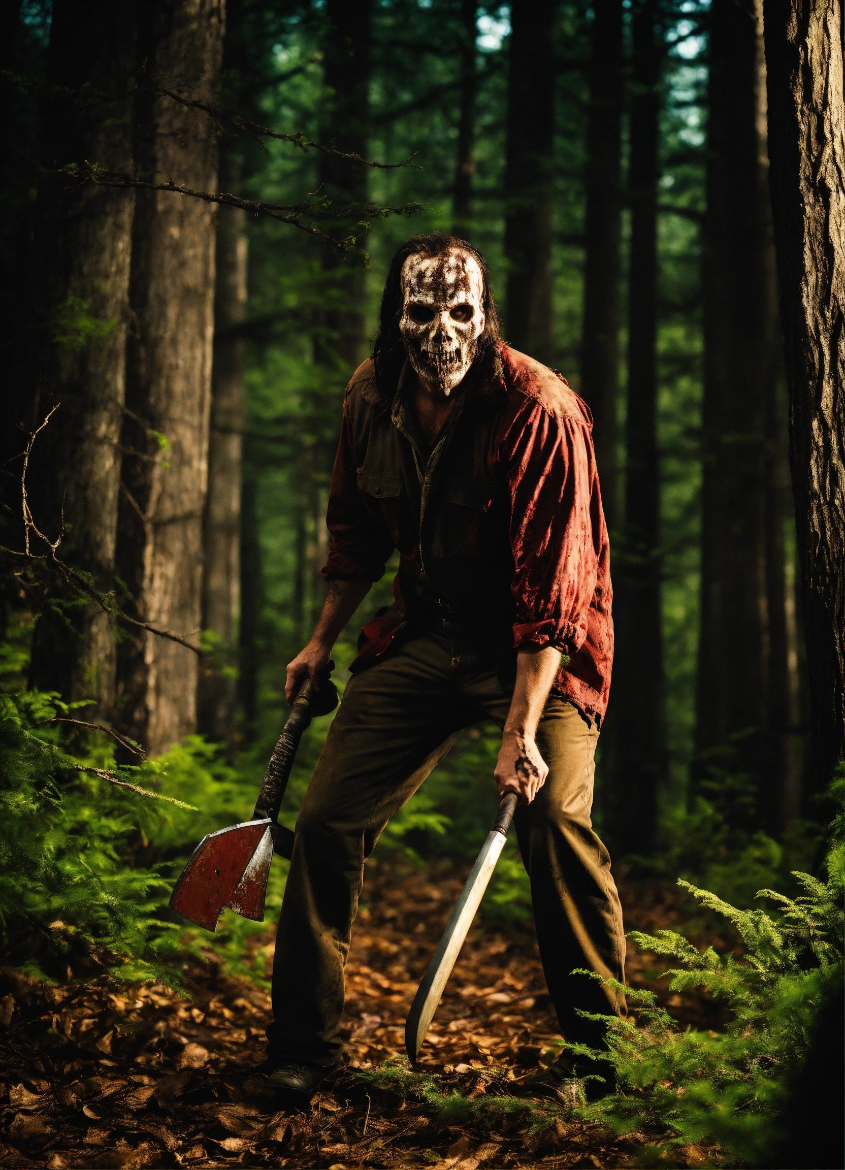 A creepy man with a hatchet, lurking in a creepy forest, the antagonist three fingers from wrong turn 3 left for dead hillbilly.