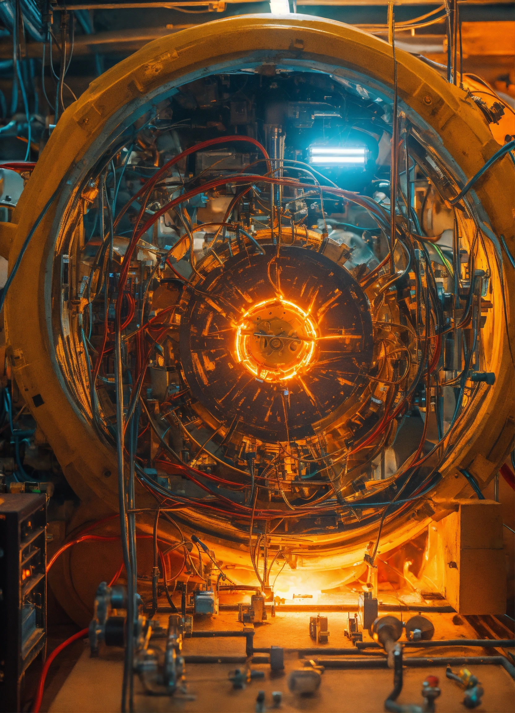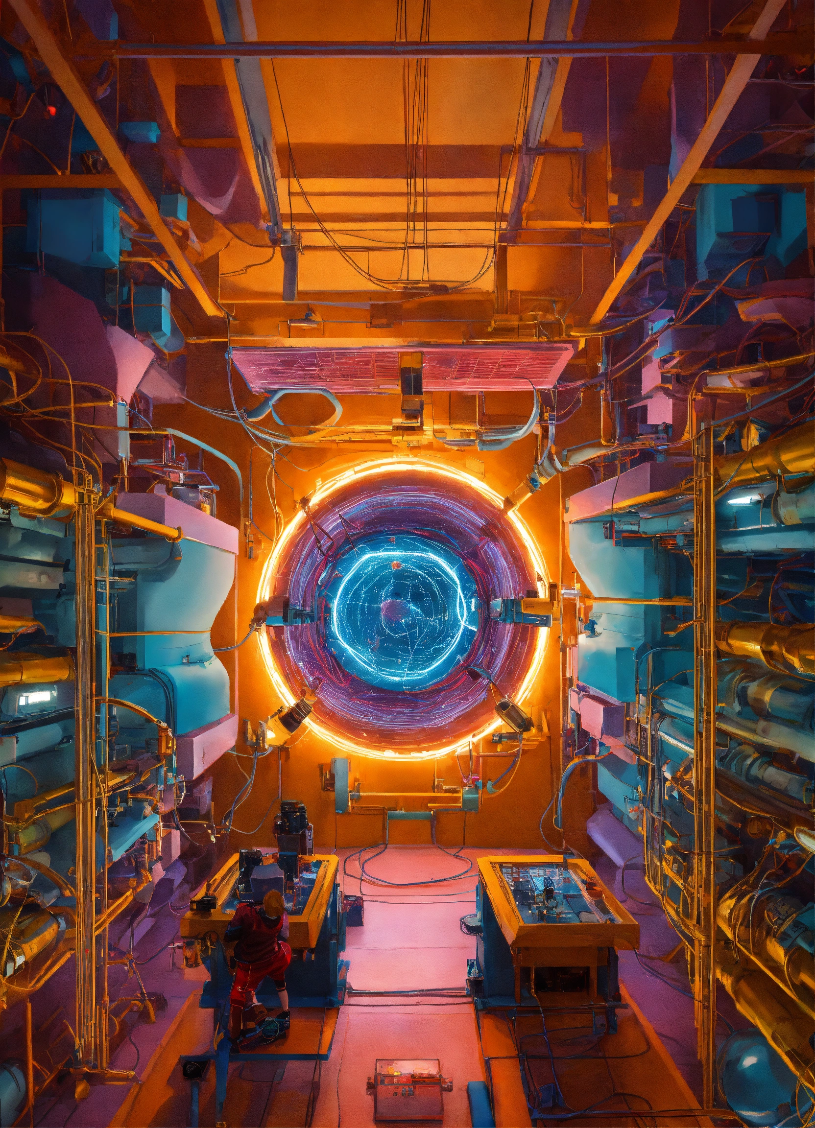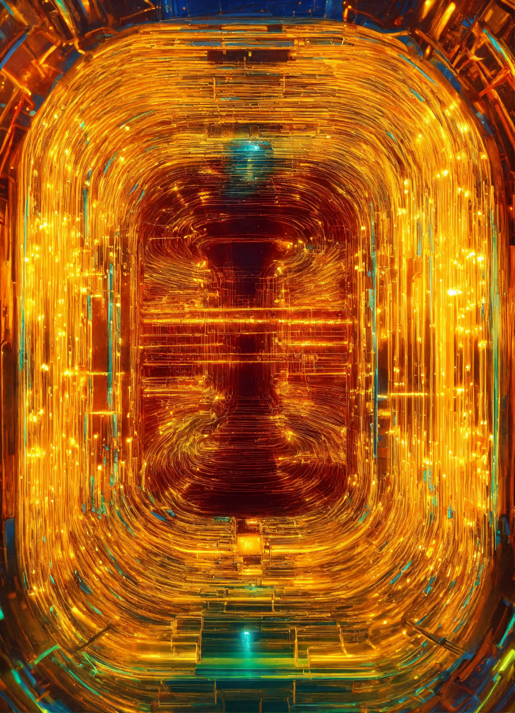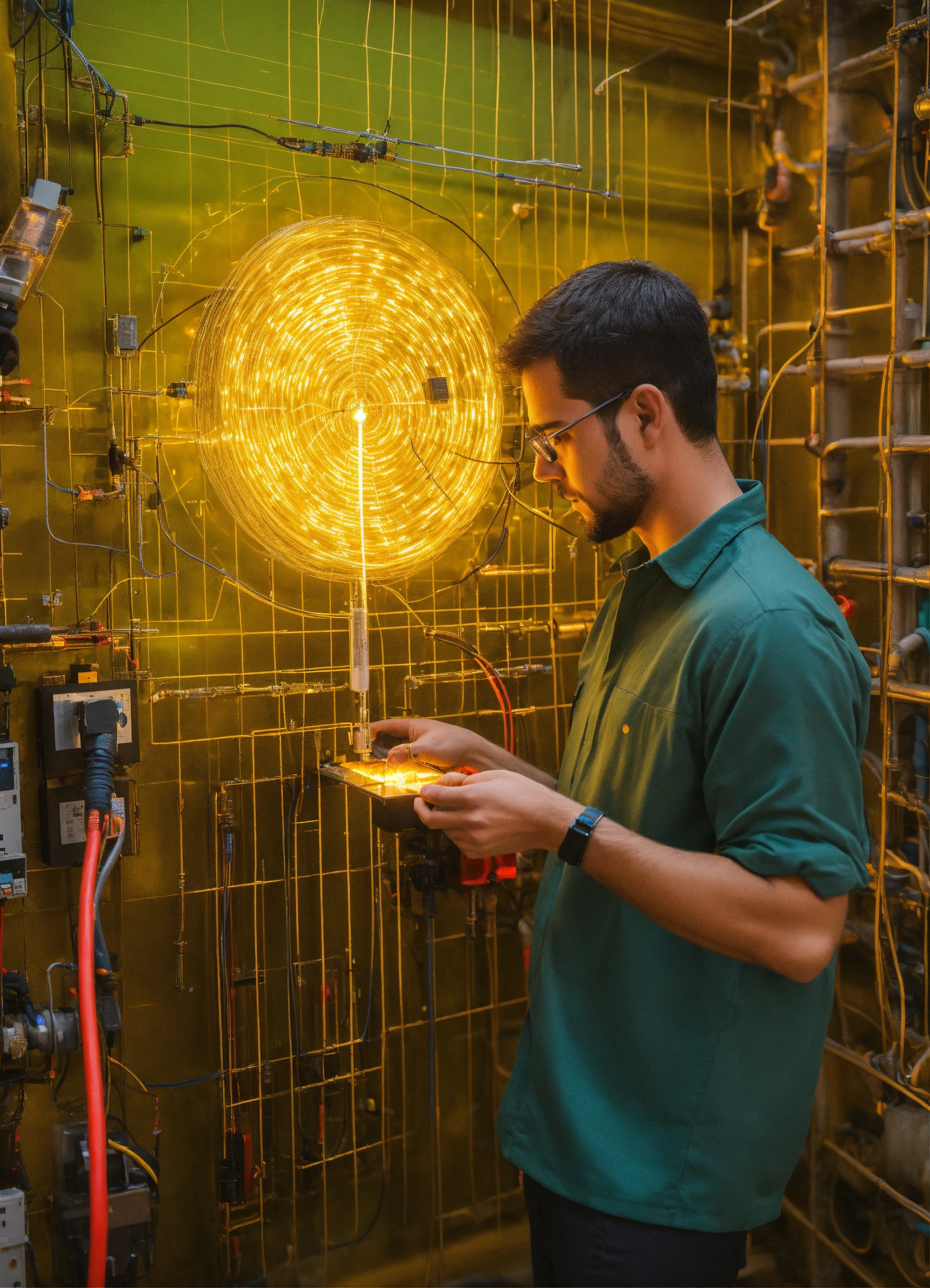 Una mano sosteniendo un dispositivo cuantico electron invertido spin down -1/2 con formacion de campo electrico invertido disrrupción de particula fermionica bicónica en el baricentro
