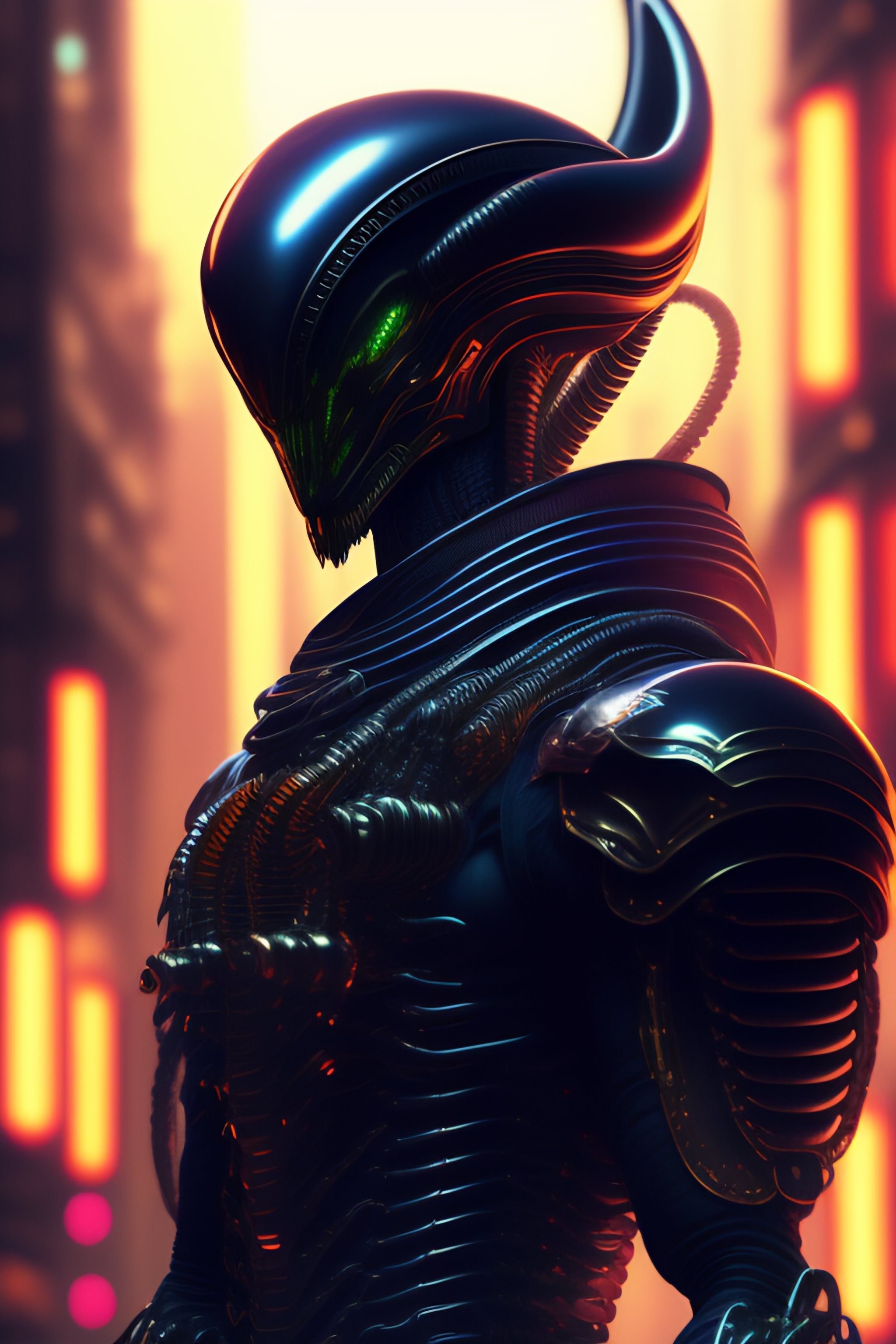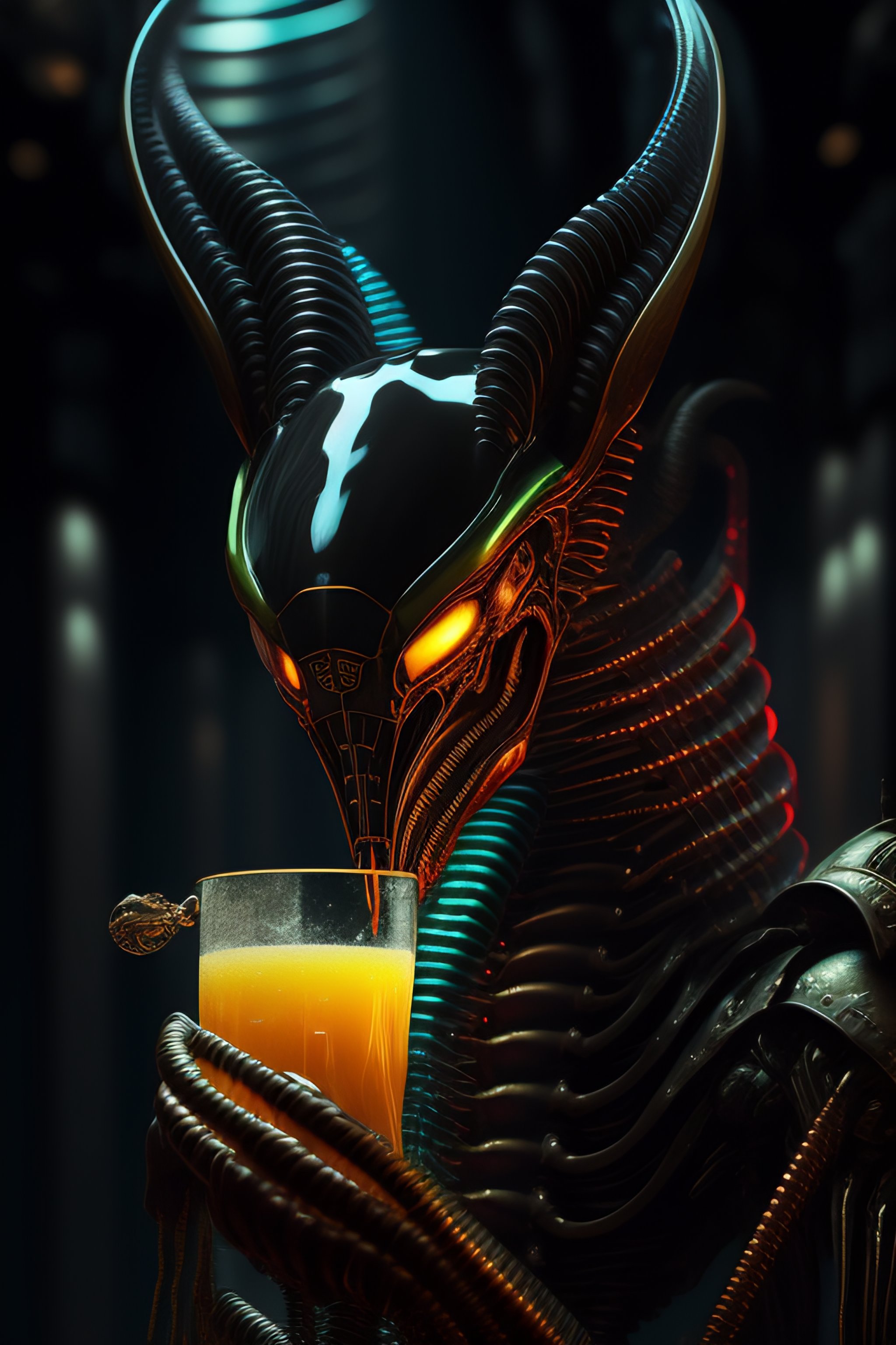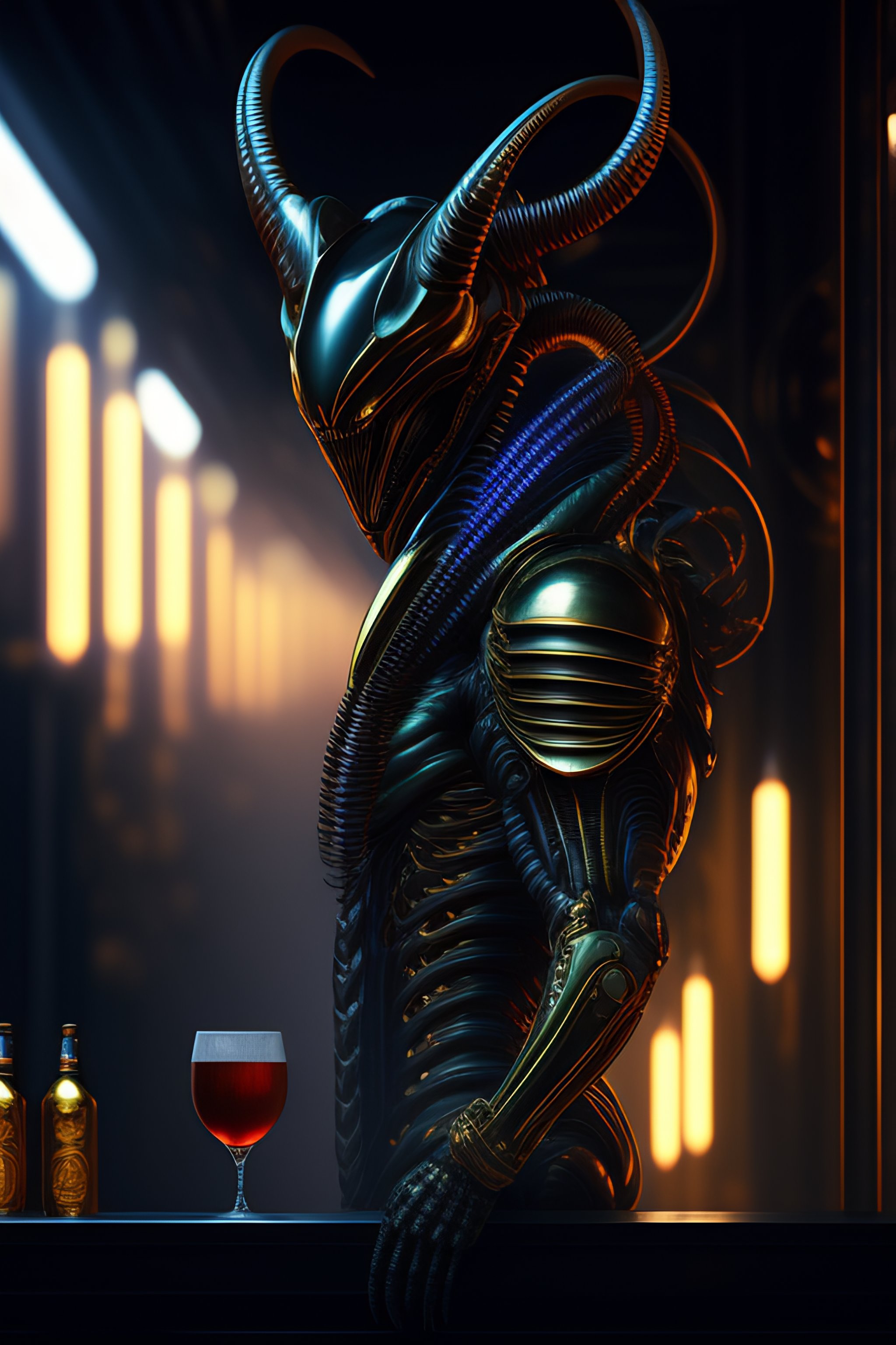 Alien xenomorph male biomechanical, full body cinematic style digital art render with mechanical and futuristic details in a cyberpunk underworld, (((drinking a bloody cocktail))), moody atmospheric lighting, bizarre, dangerous, art by yoshiyuki sadamoto and giger