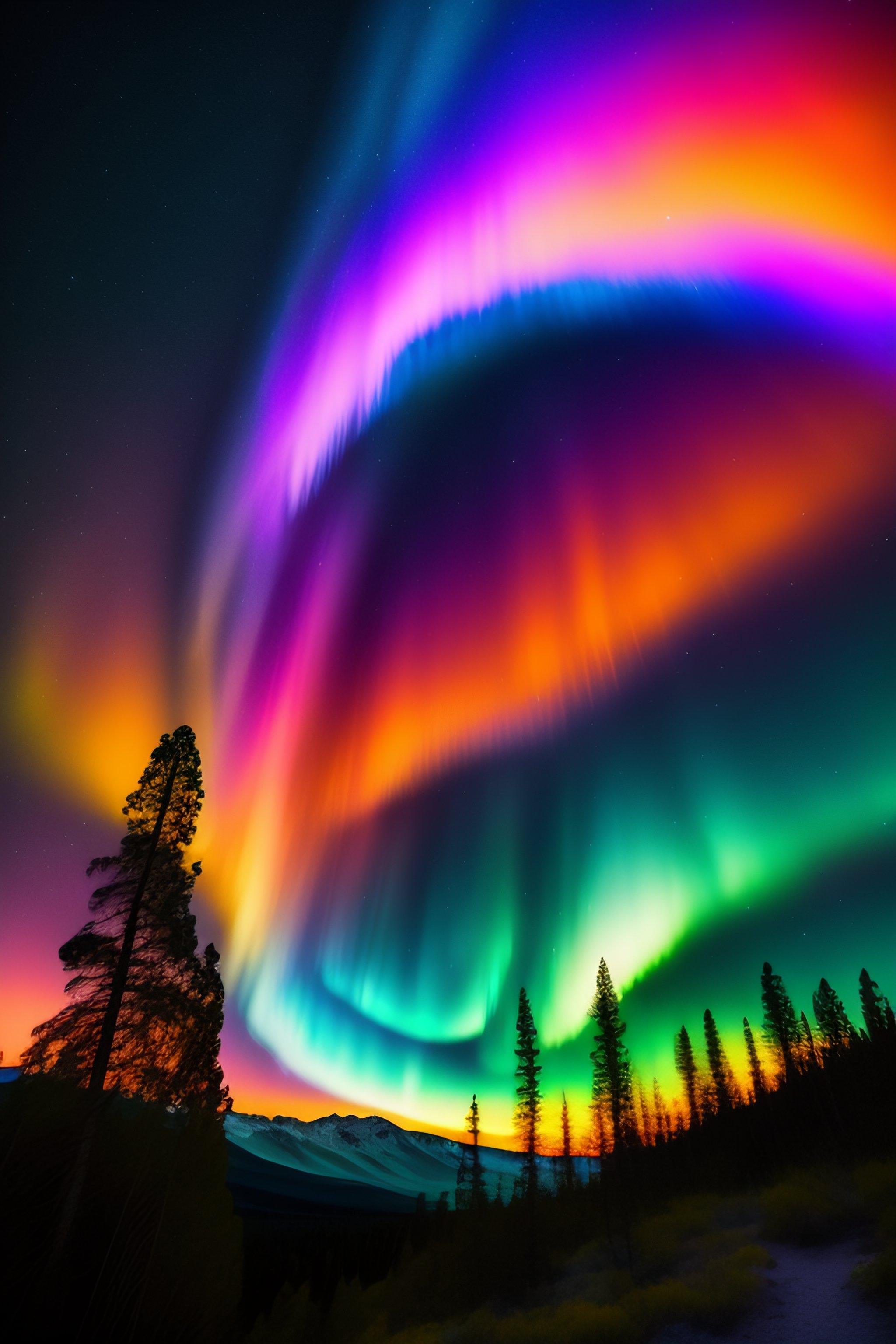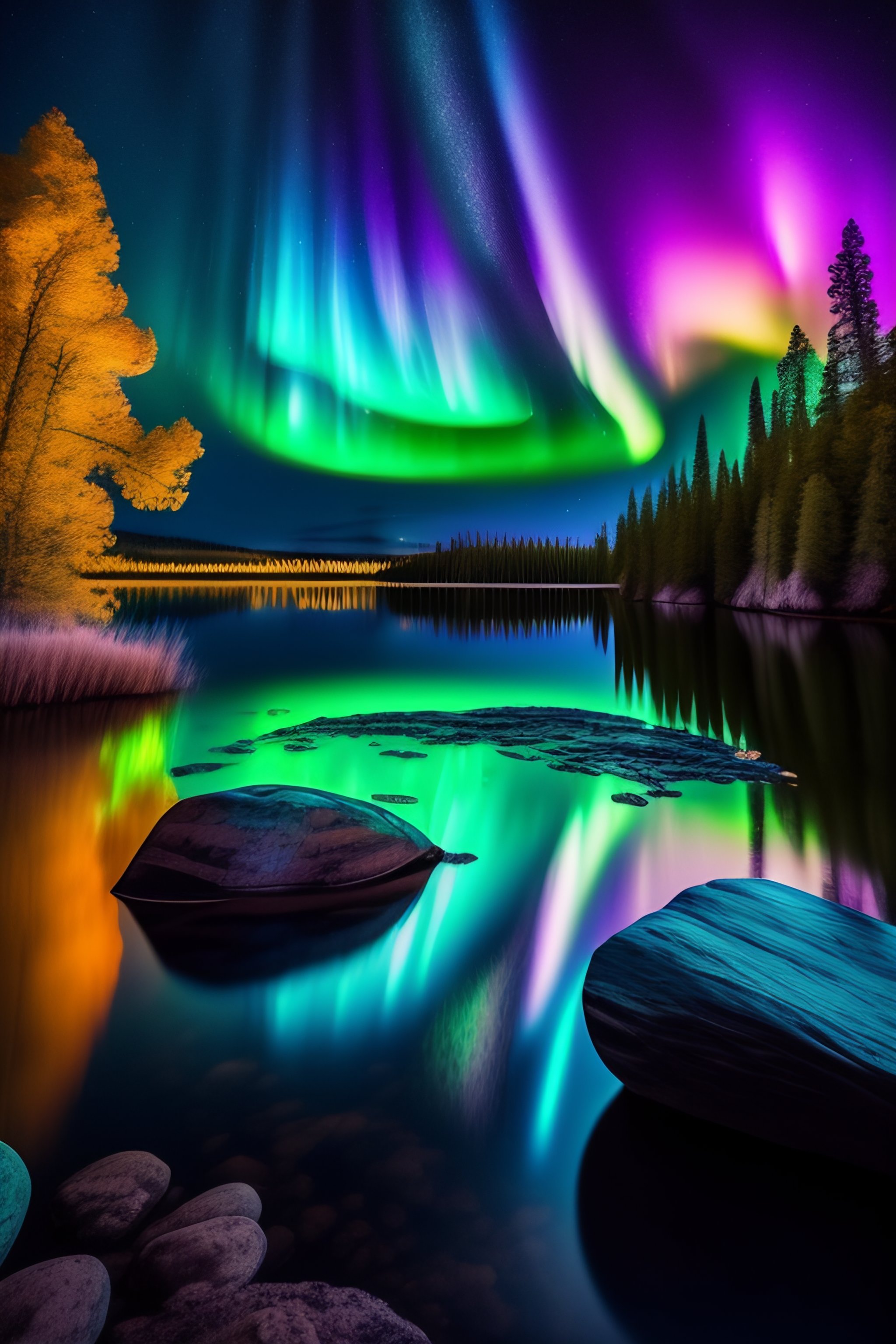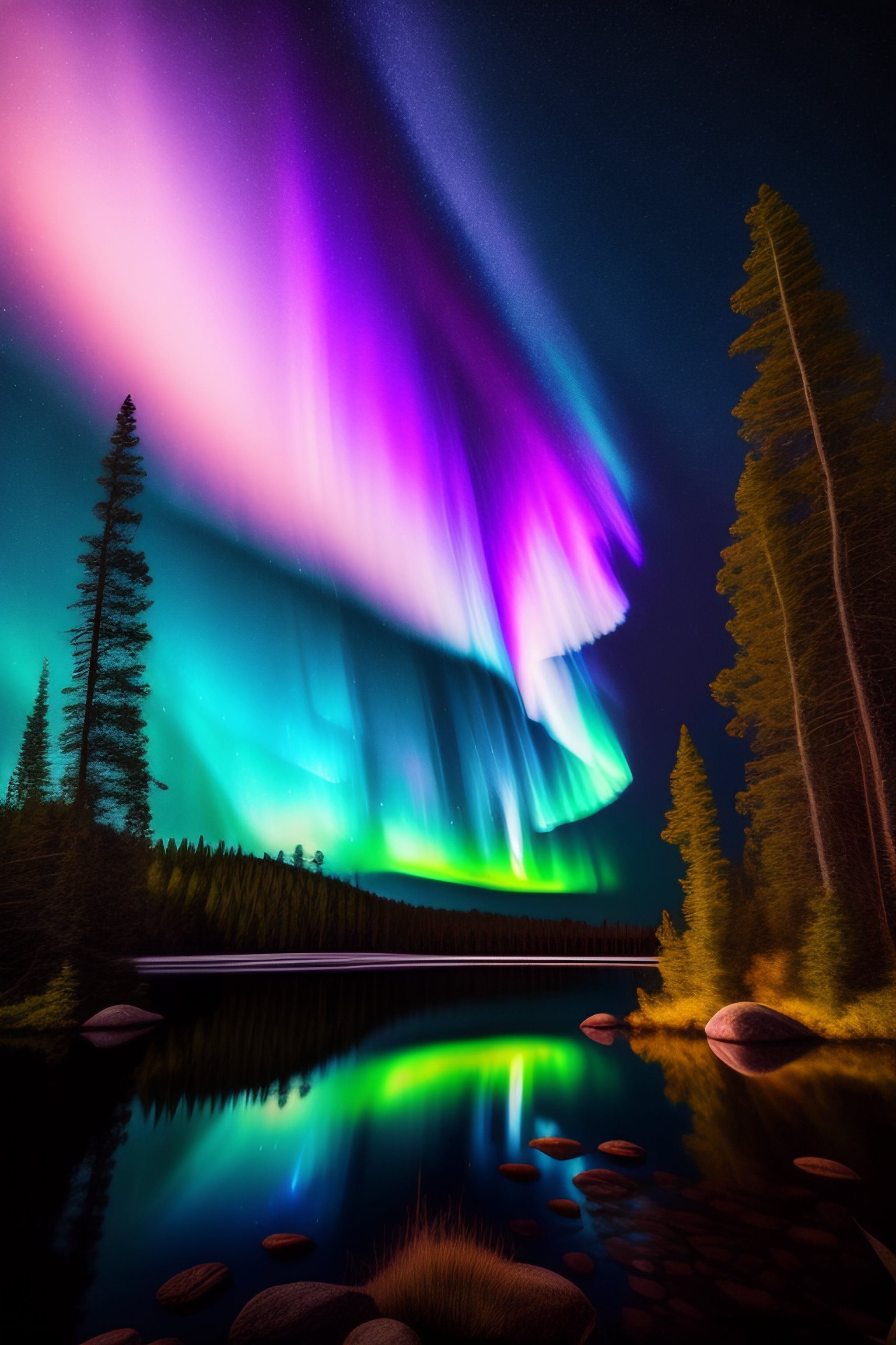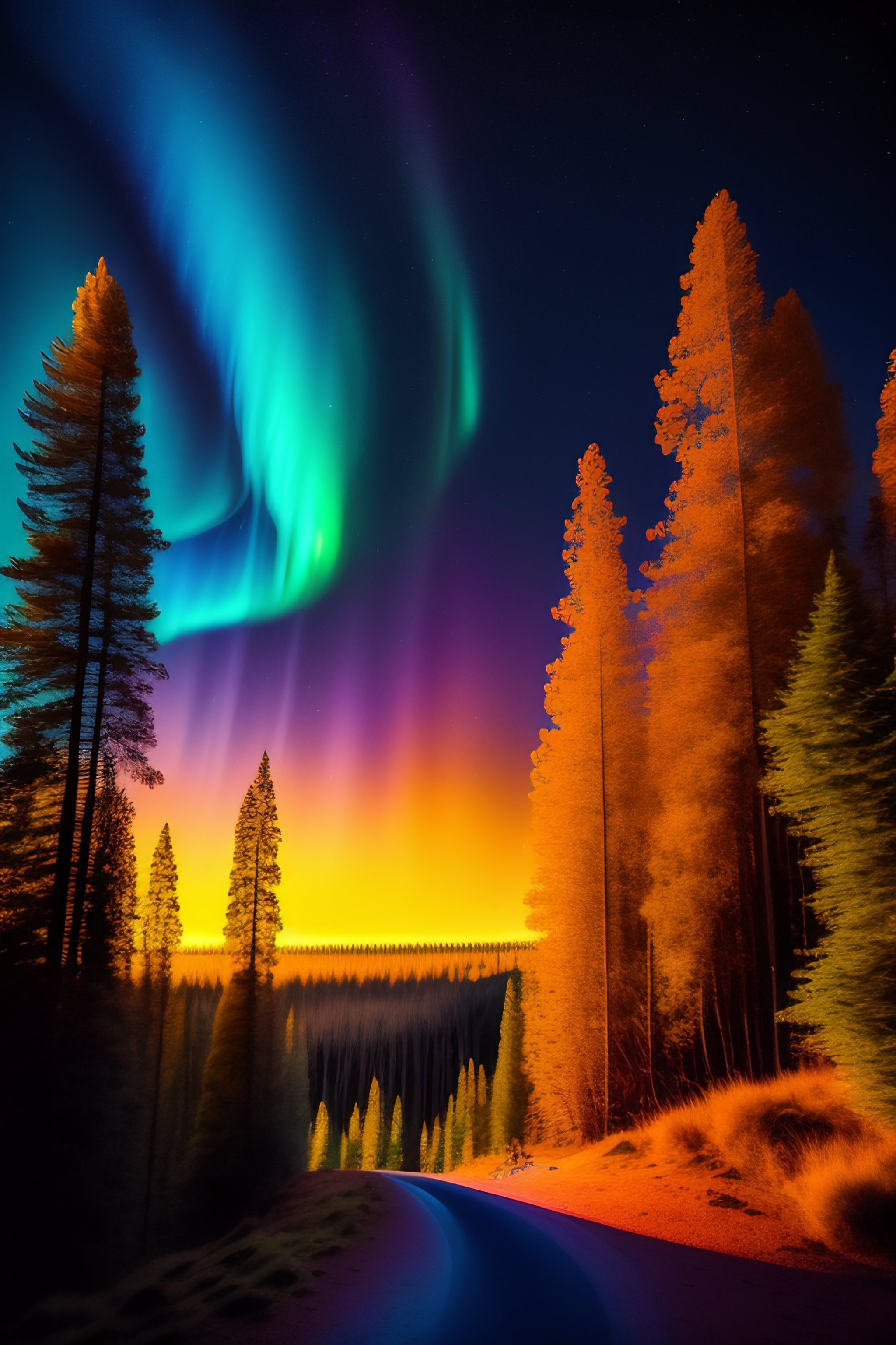 Alma de lobo color turquesa sobre un bosque oscuro y una aurora boreal en el cielo