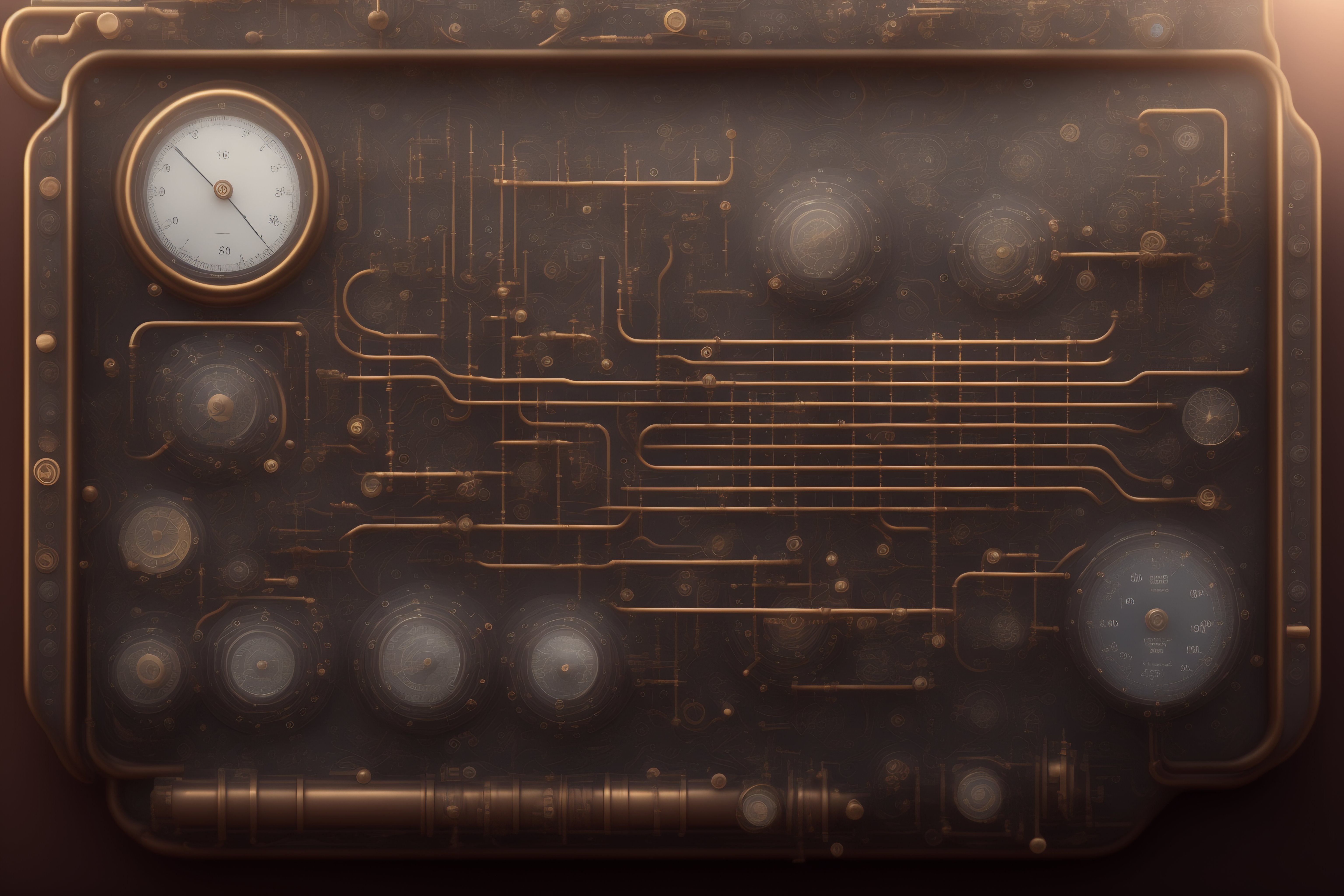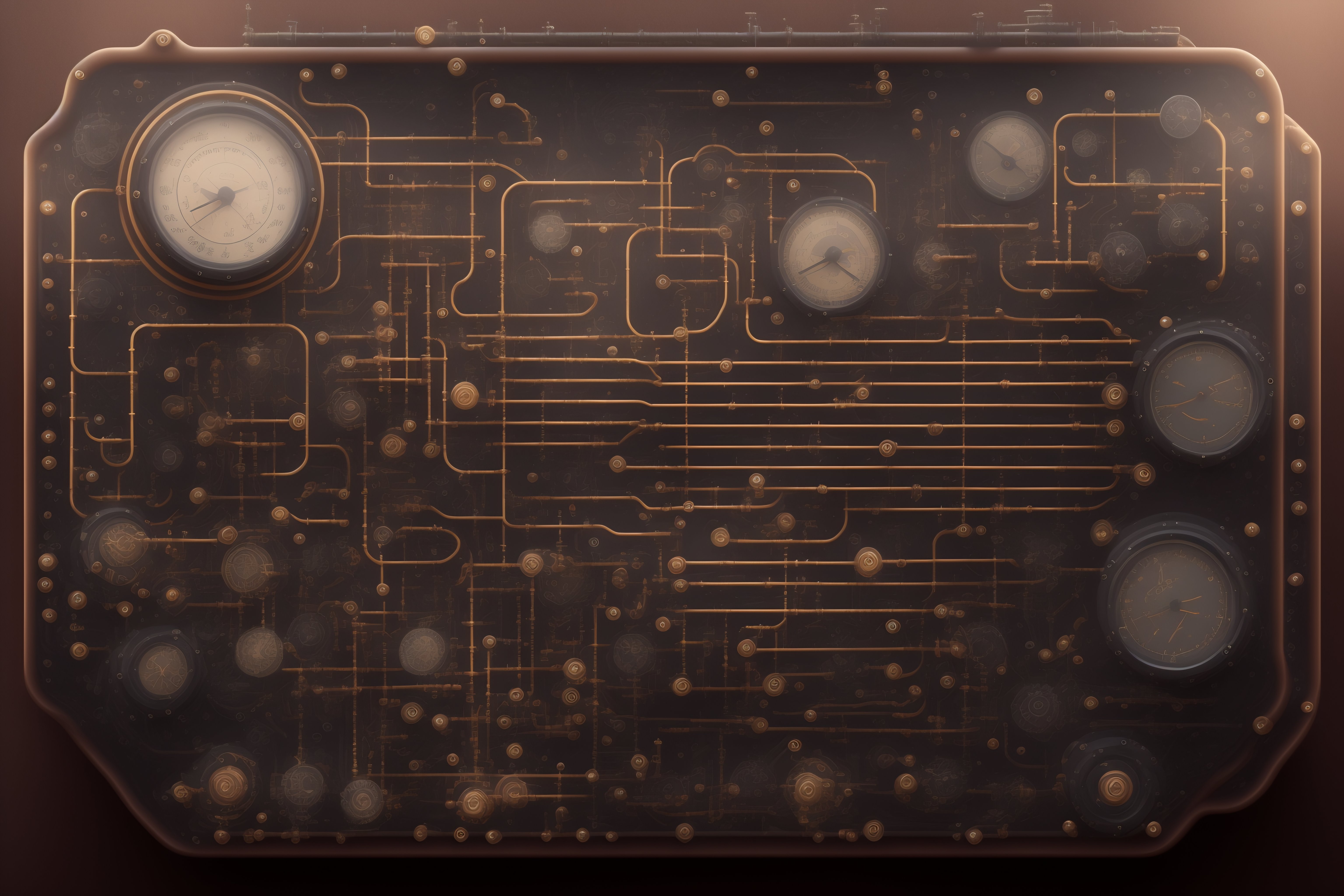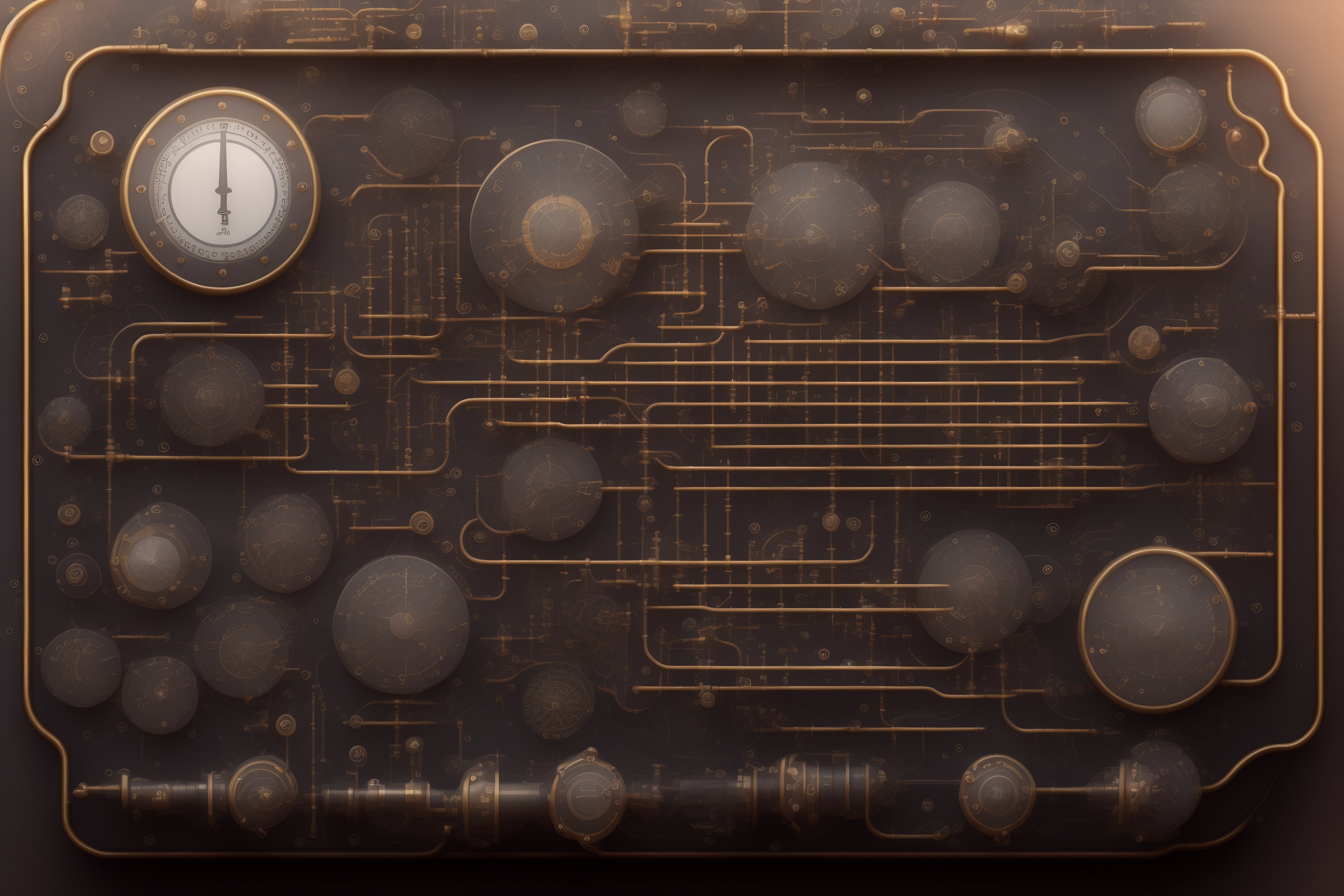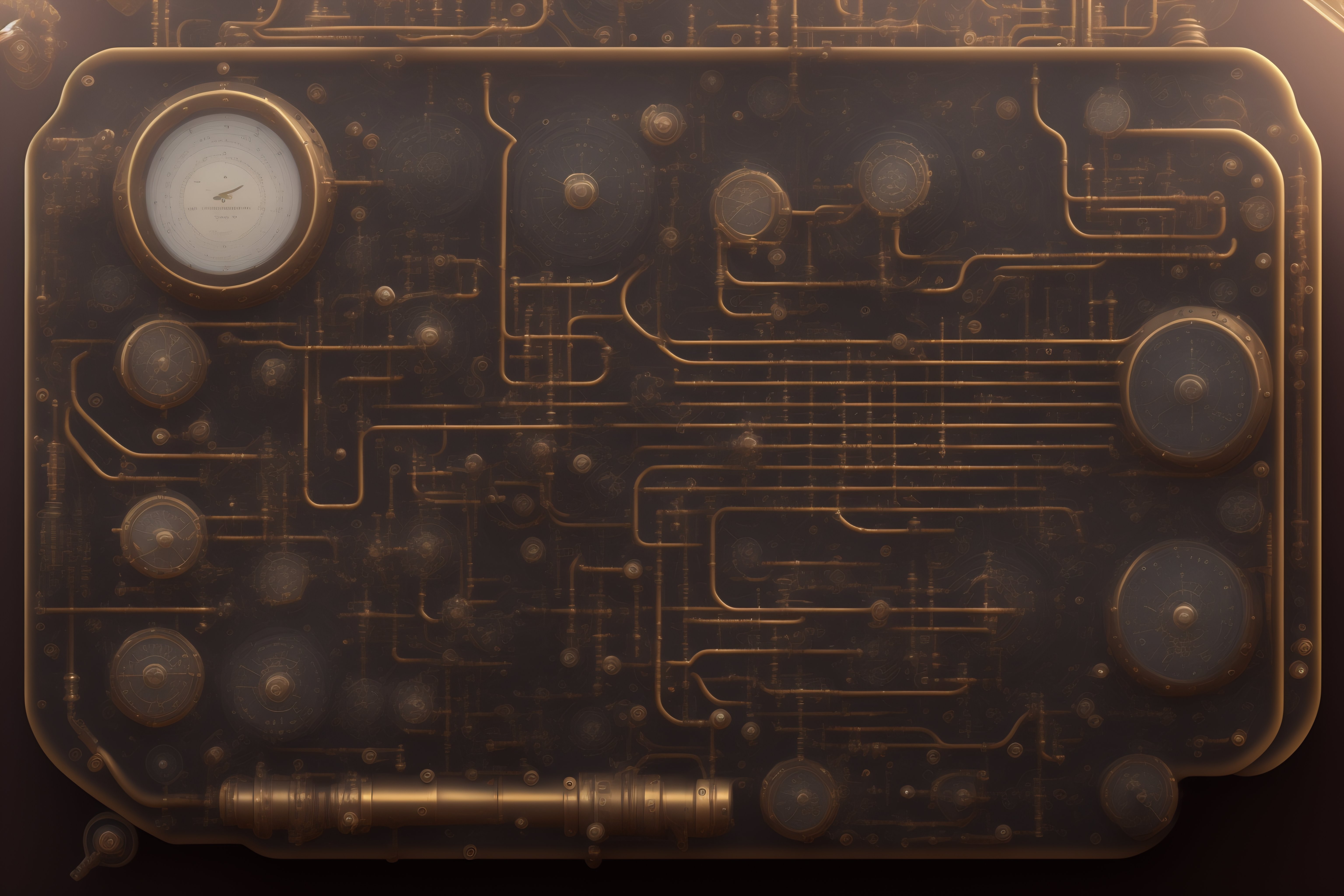 Steampunk technical drawing of a control panel with lot of gauges and screens