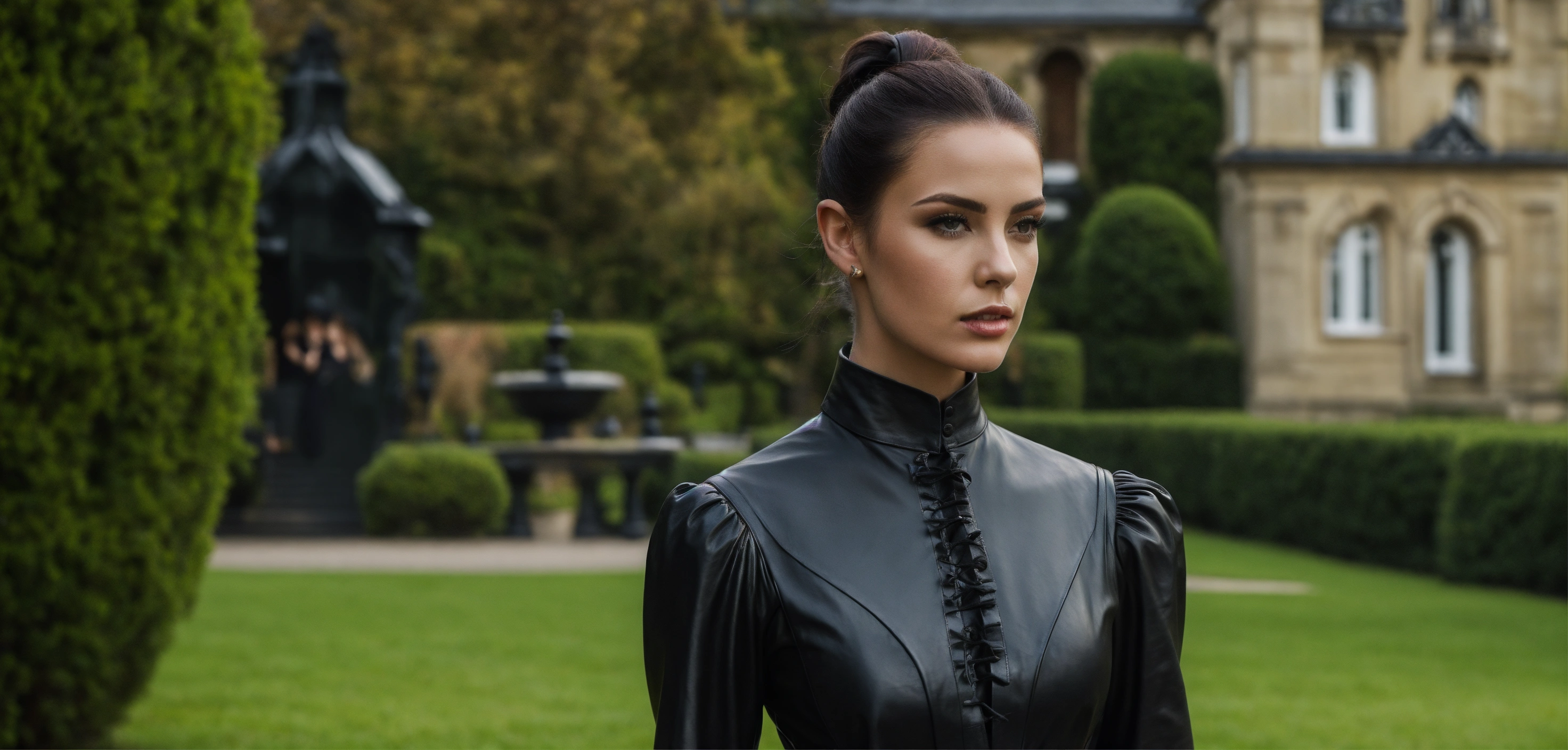 Stunning arrogant woman fashion model, strict victorian black leather governess shirt dress, black straight high ponytail, mansion park
