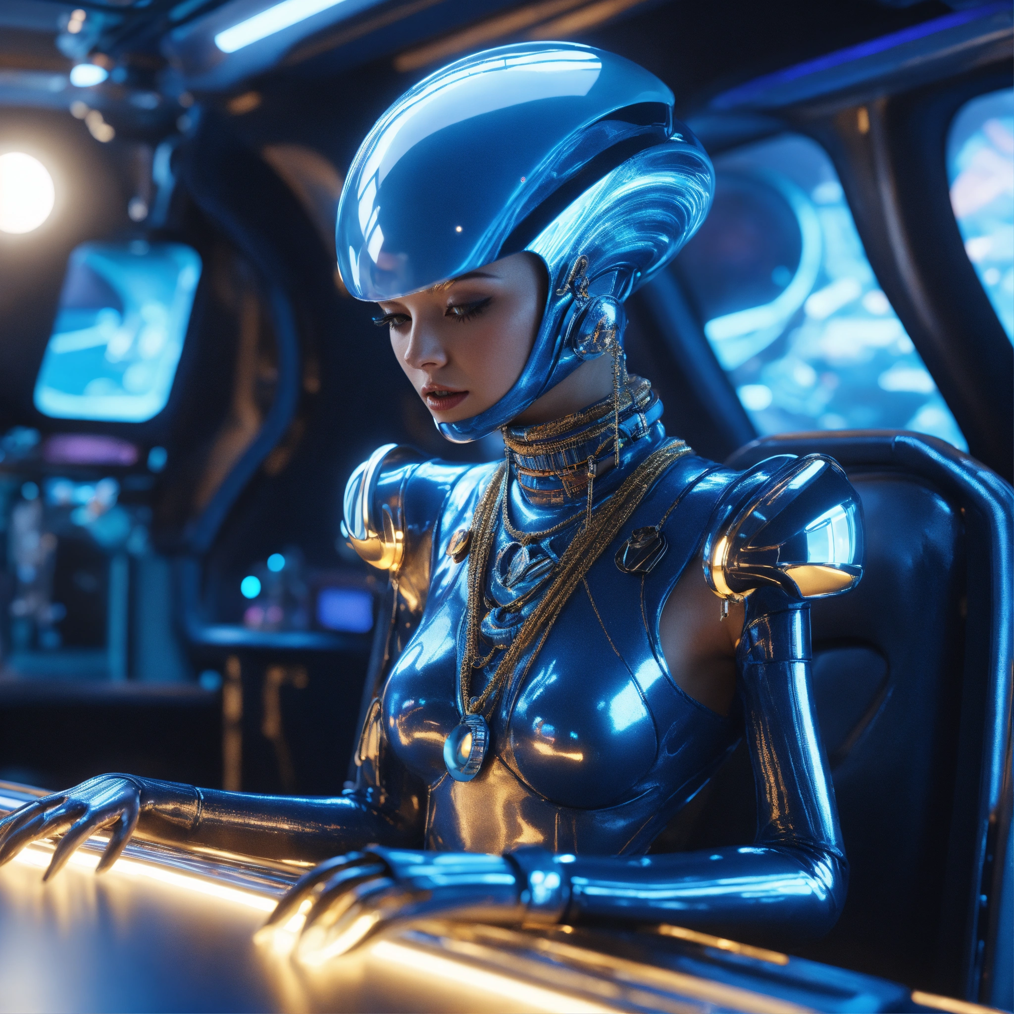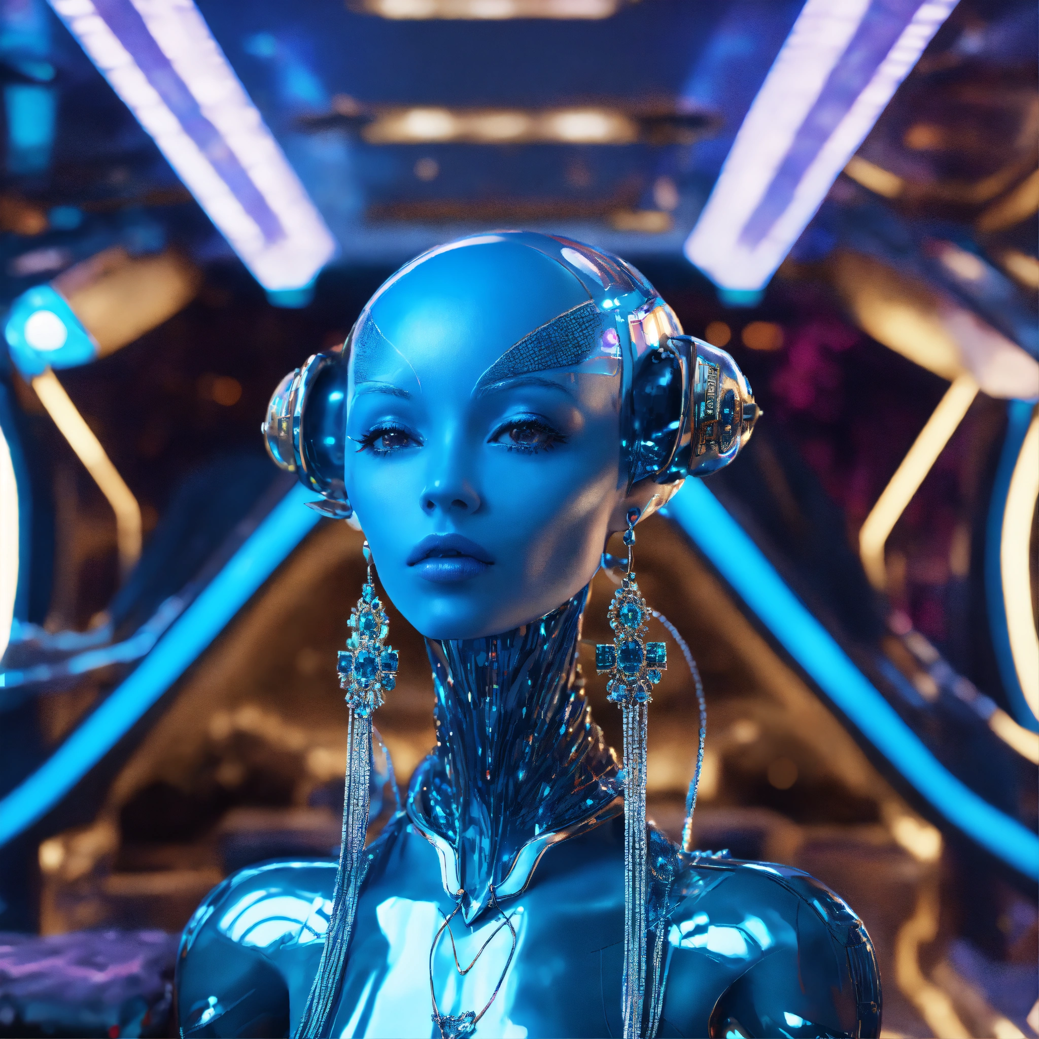 Zoom out from a cool blue alien wearing space fashion with alot of jewelry lounging in a futuristic space yacht, realistic, futuristic, sci-fi, 8k, unreal engine