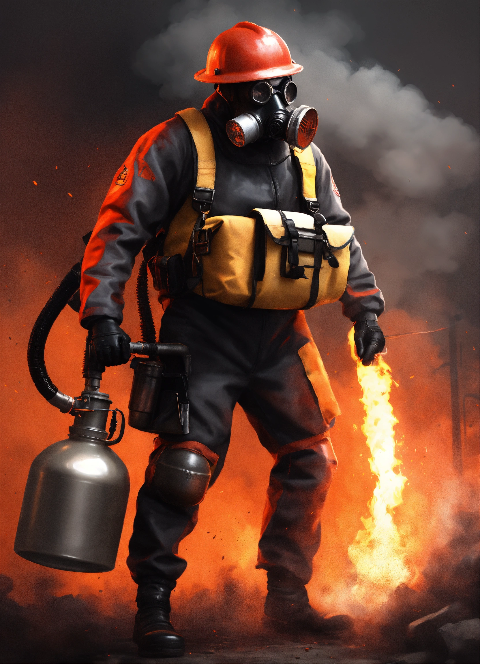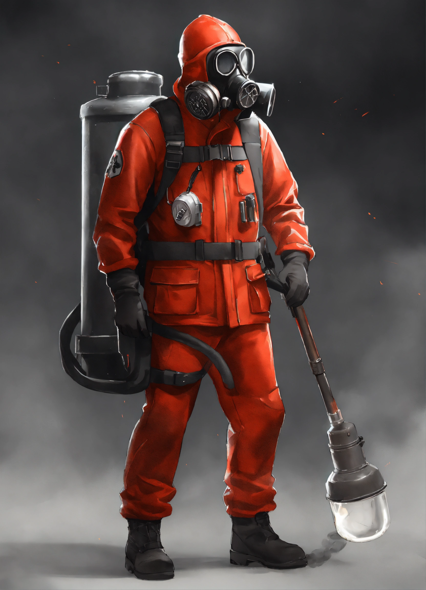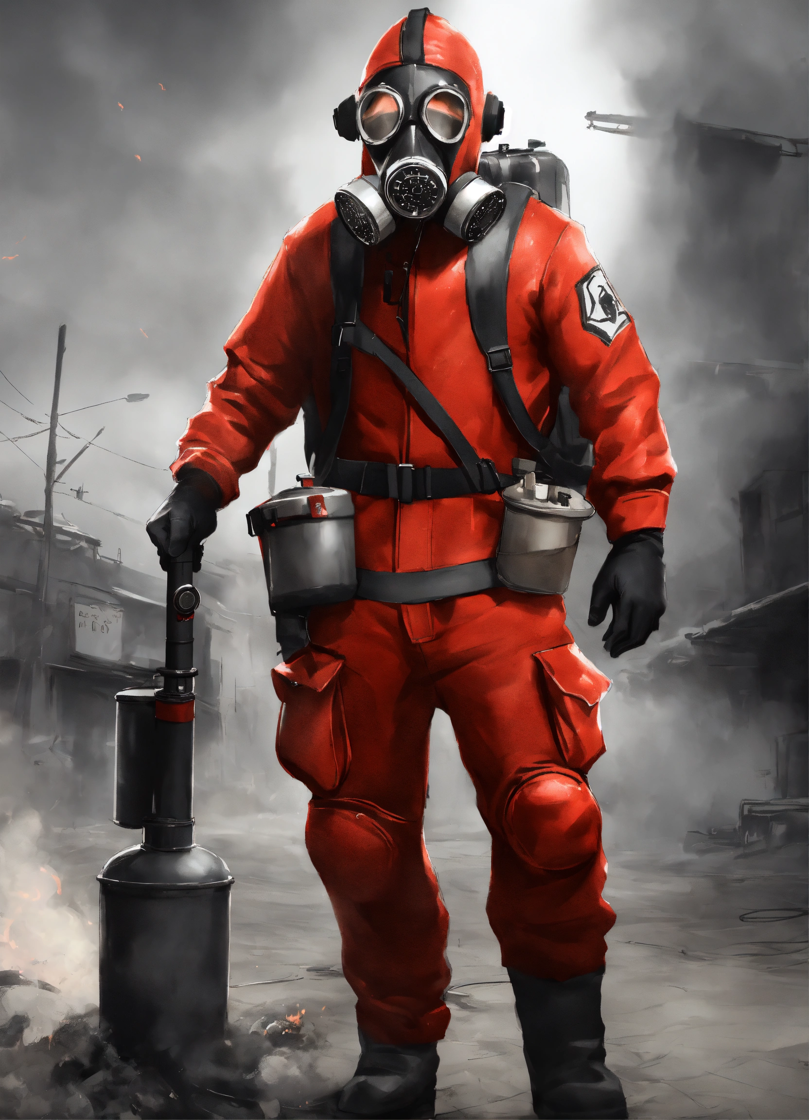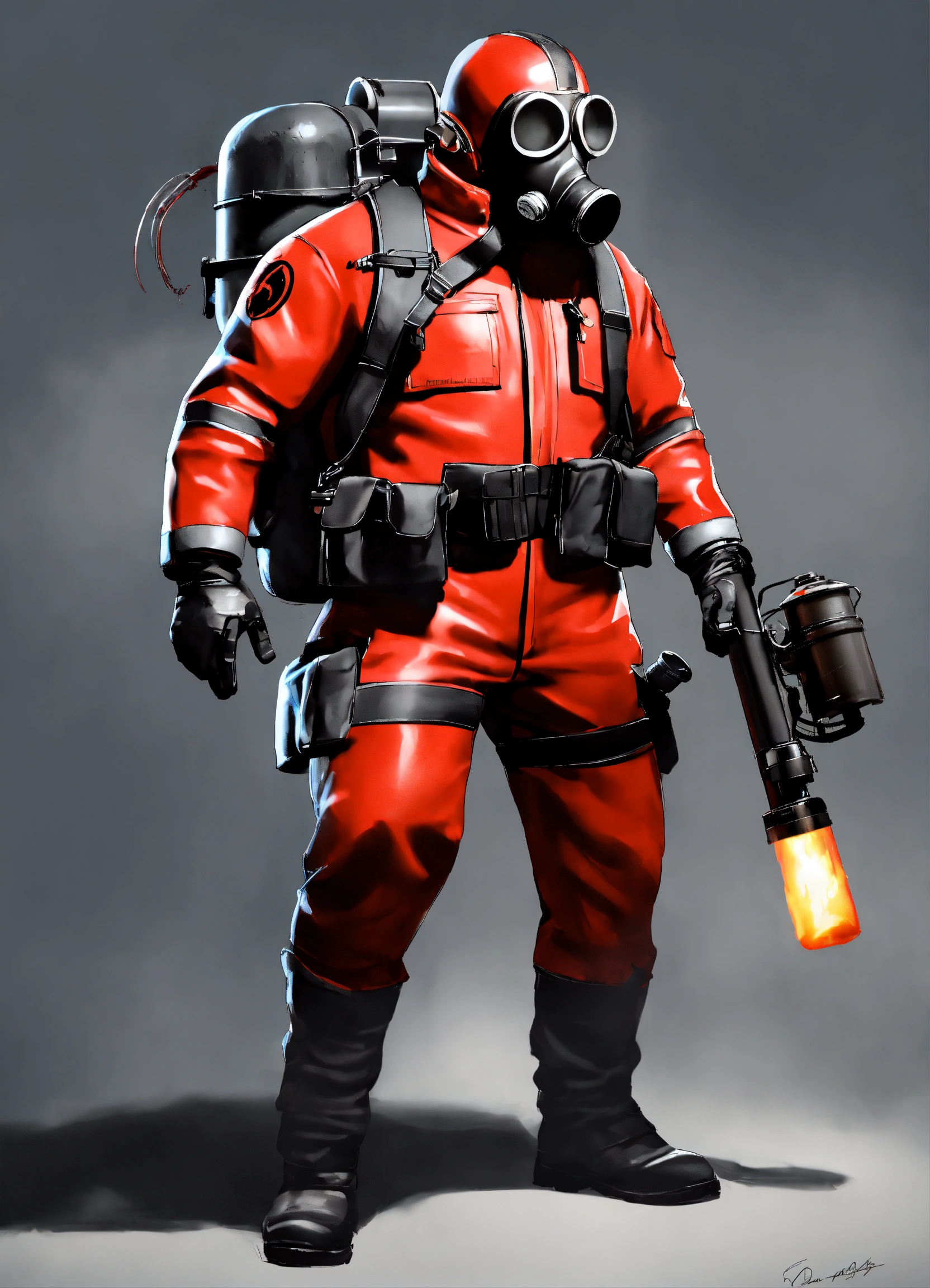 The pyro from team fortress 2 wearing a red full-body latex suit with black slacks and wearing a black gas mask and wearing black fireman gloves and holding a flamethrower, best quality, cloudy gray background, digital hd art, black and white, pencil sketch, ink sketch, beautiful drawing, highly detailed, concept art, ultra-realistic digital illustration, 3dart++, blender++, unreal 5++