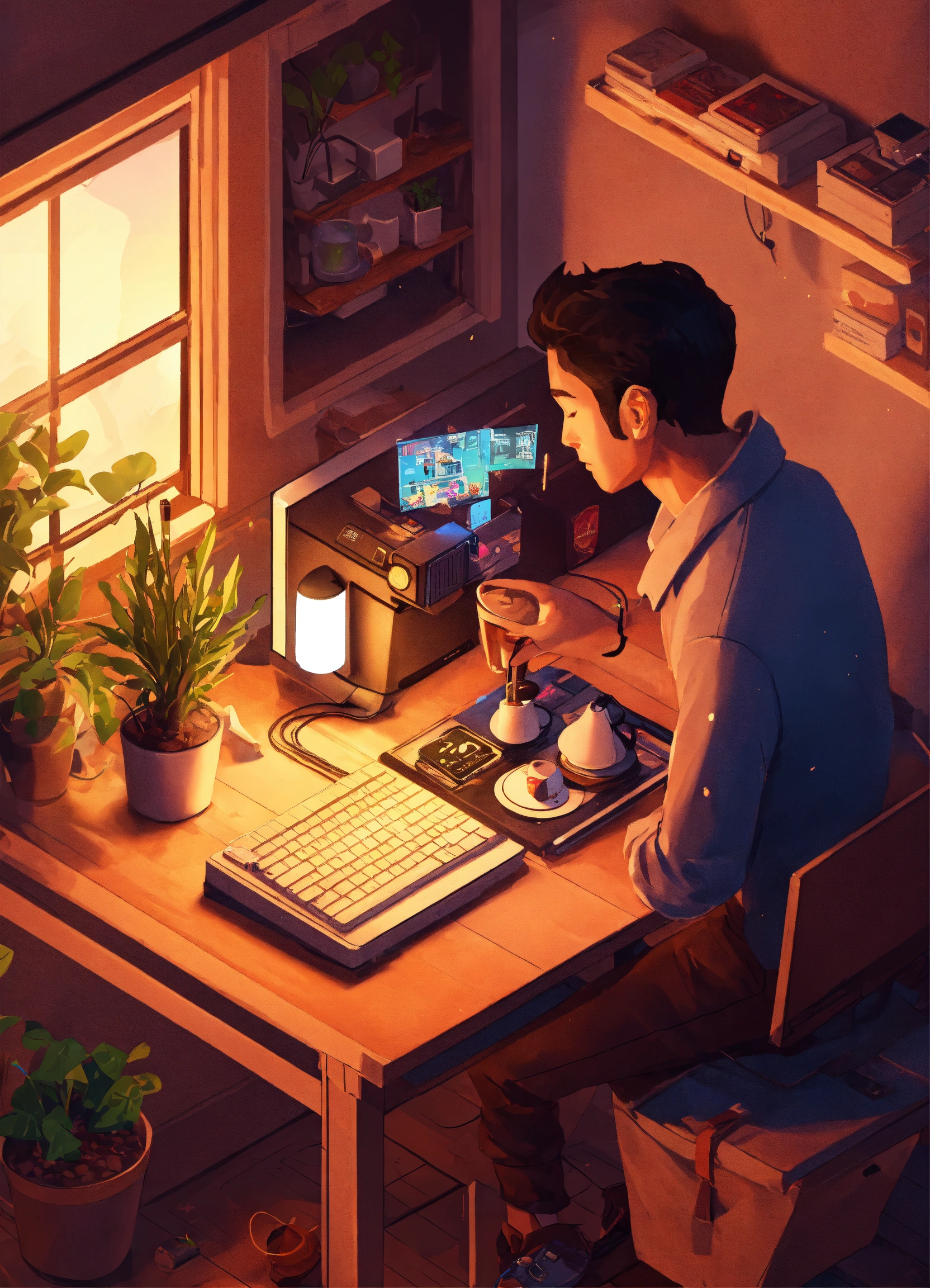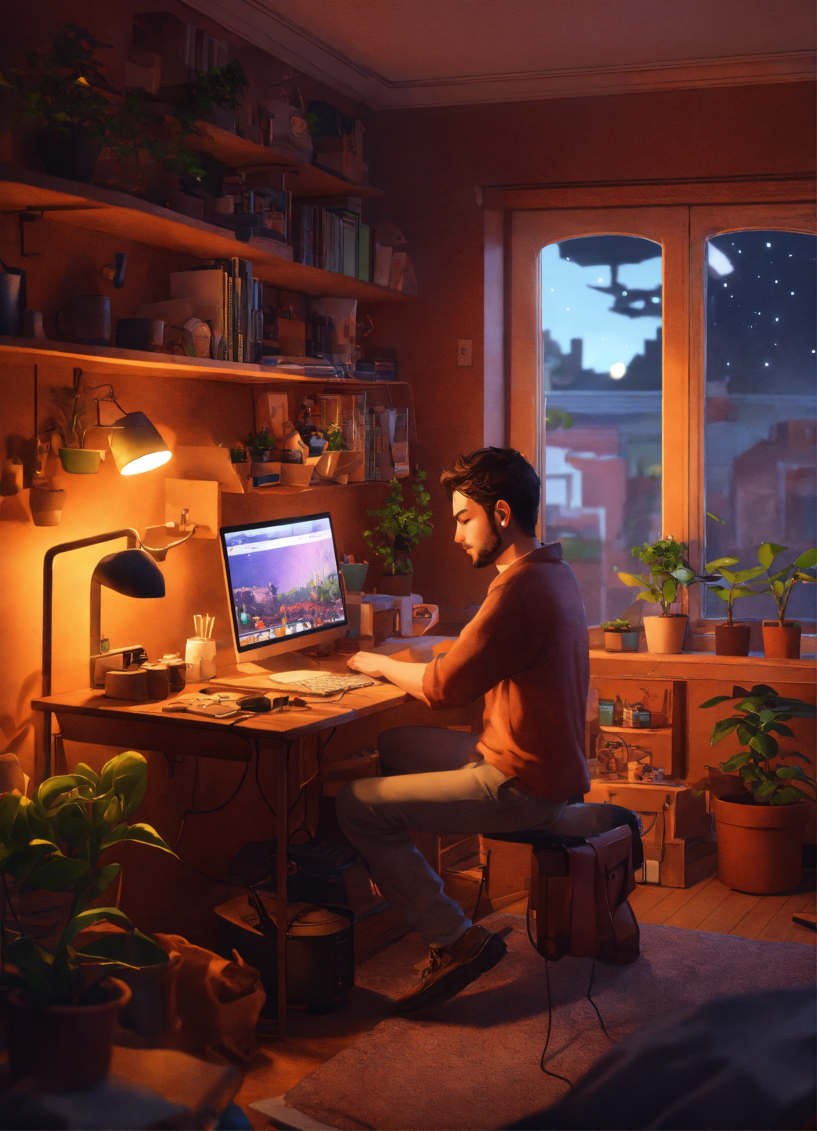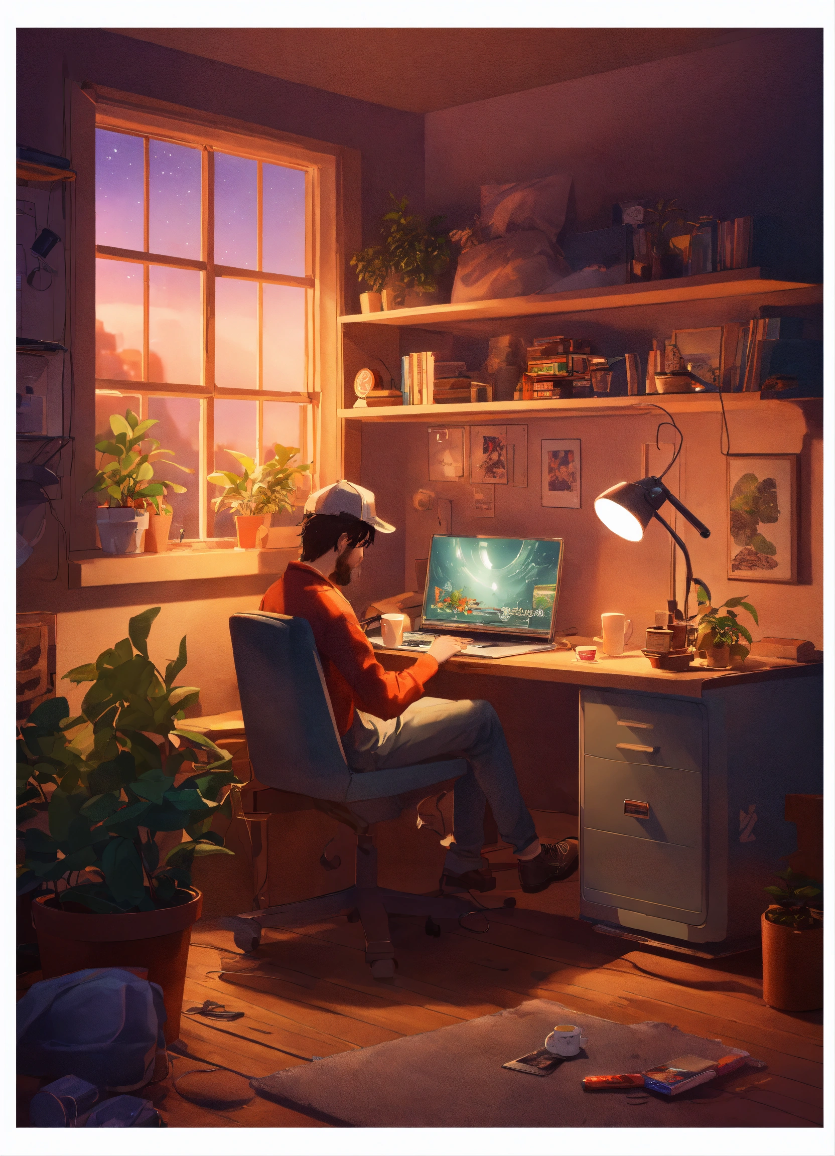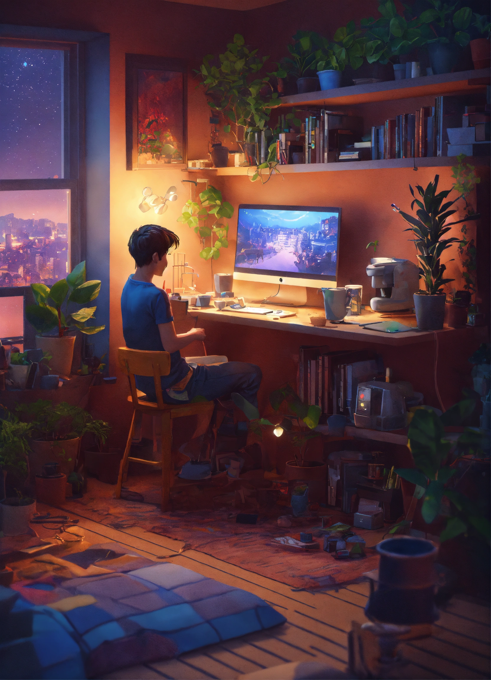Man working in front of his laptop, kids playing around, small coffee machine, in the night, isometric render, messy nostalgic bedroom with a gaming pc, windows, plants bookshelves, desk, 3d art, muted colors, perfect lighting, high detail, concept art, behance