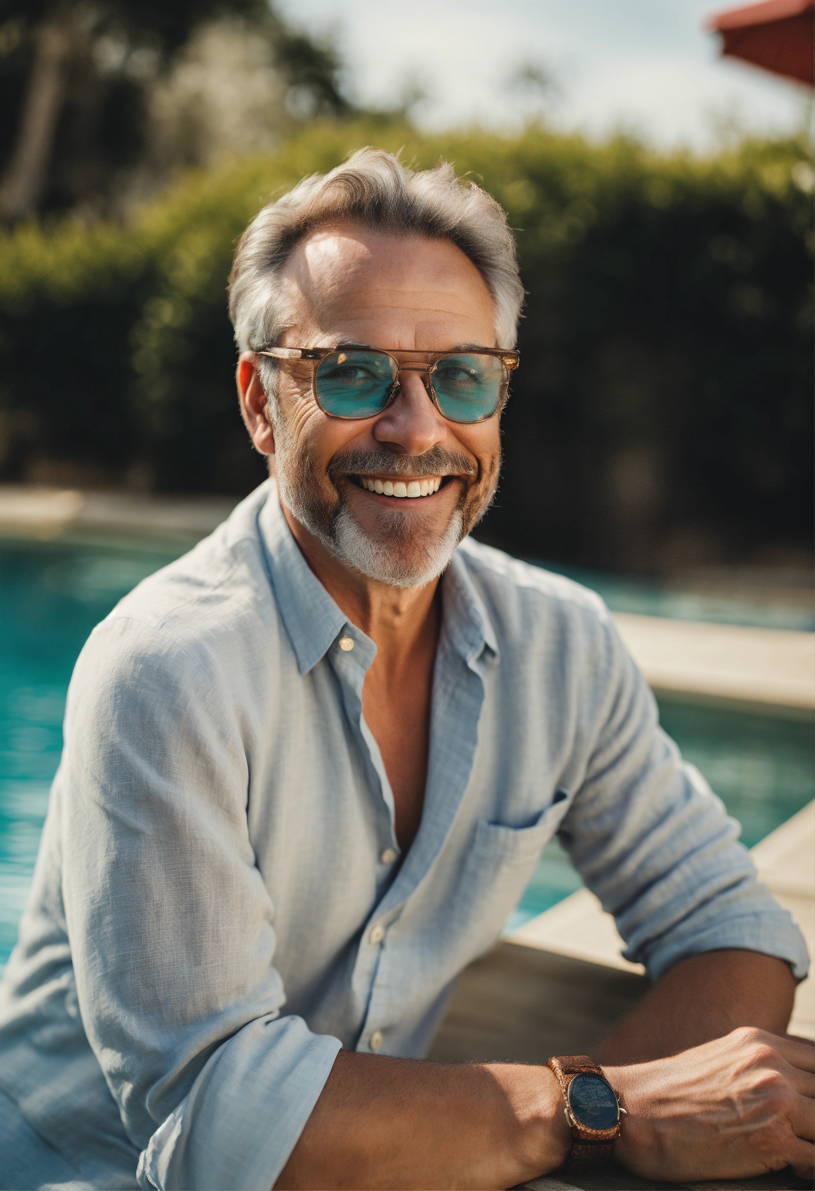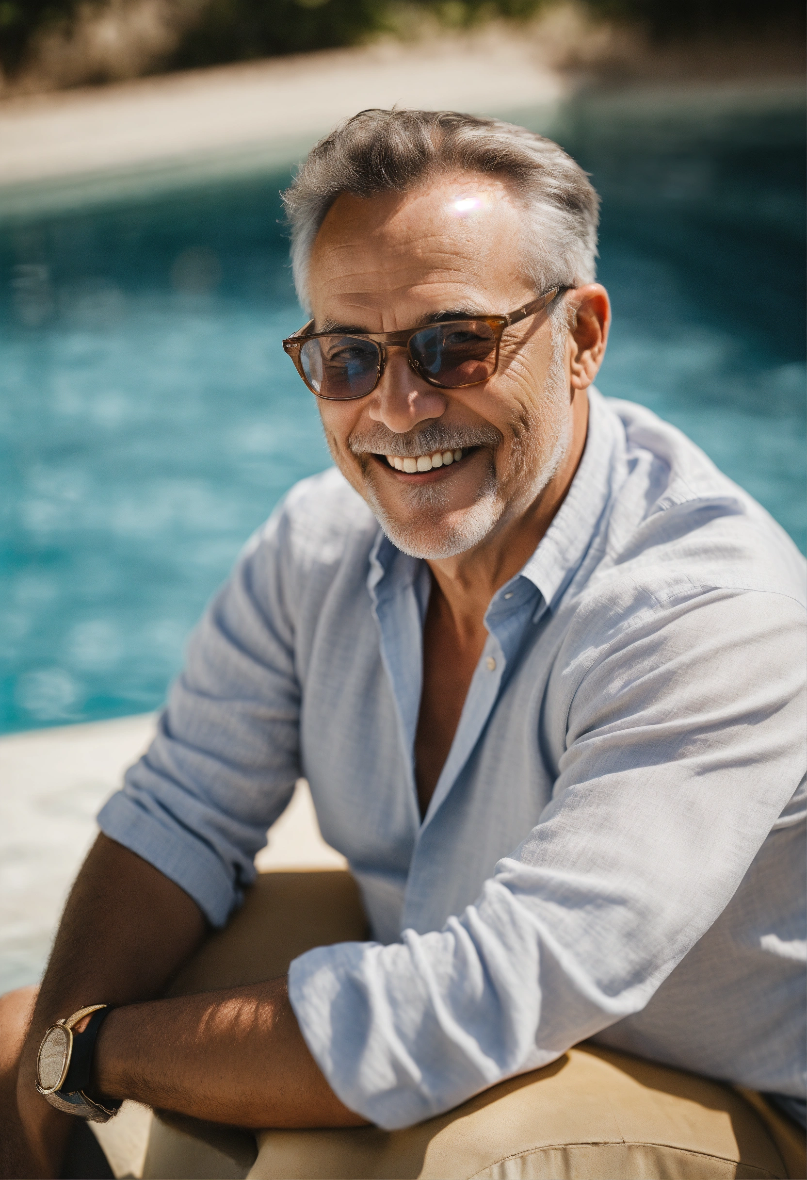 Outdoor portrait of a 50-year-old smiling rich man relaxing by the pool, wearing a linen shirt and glasses