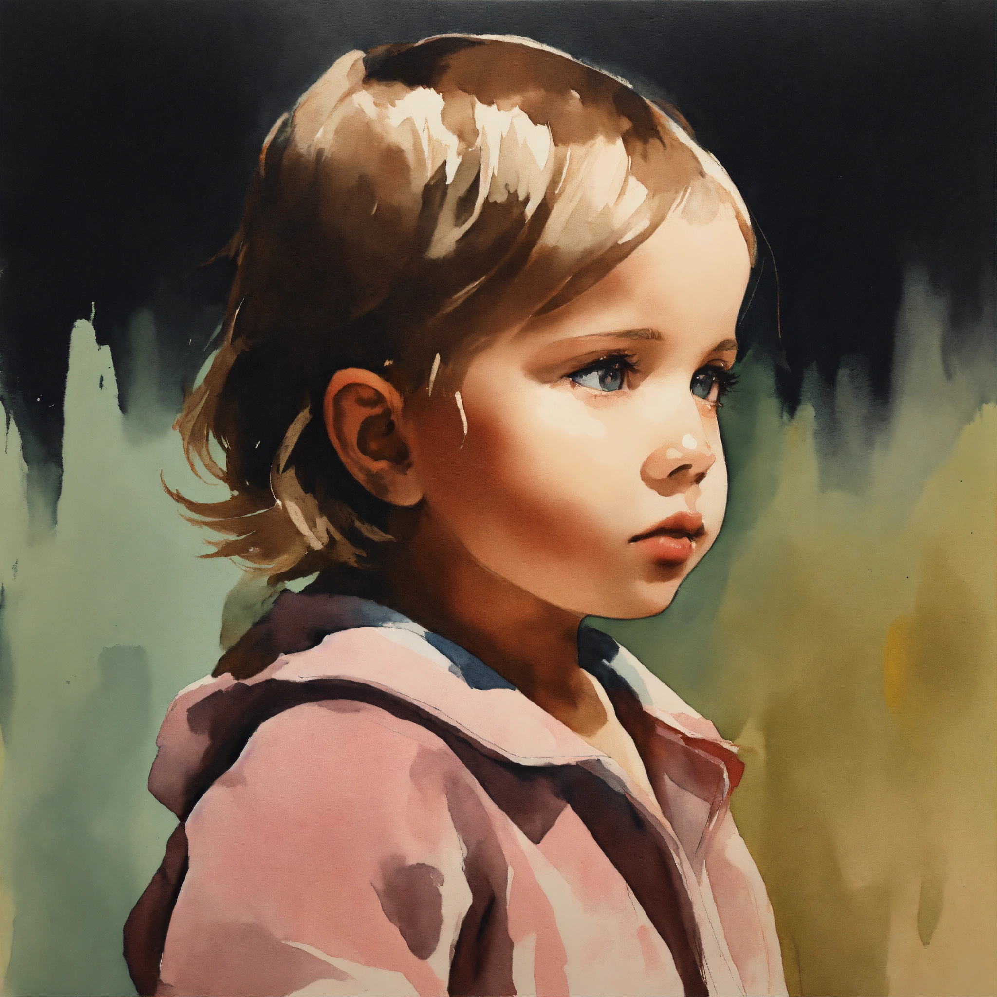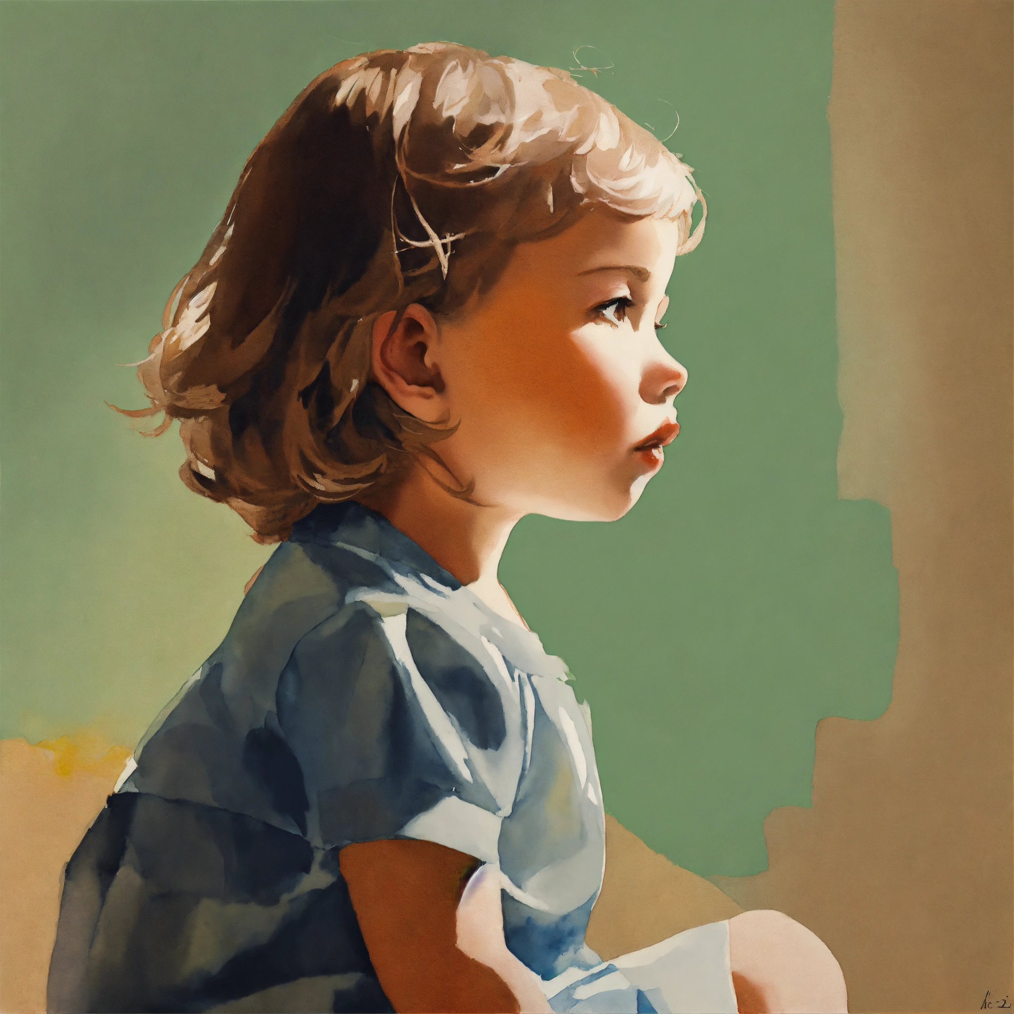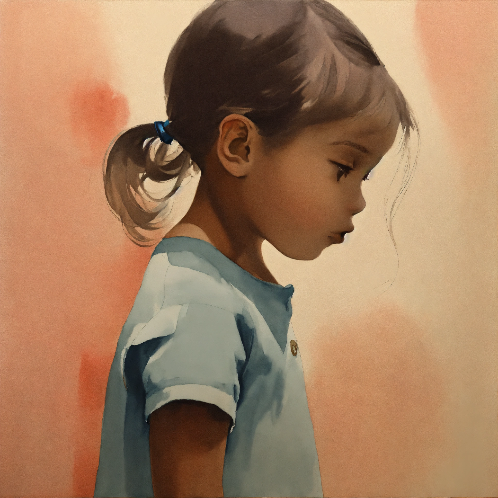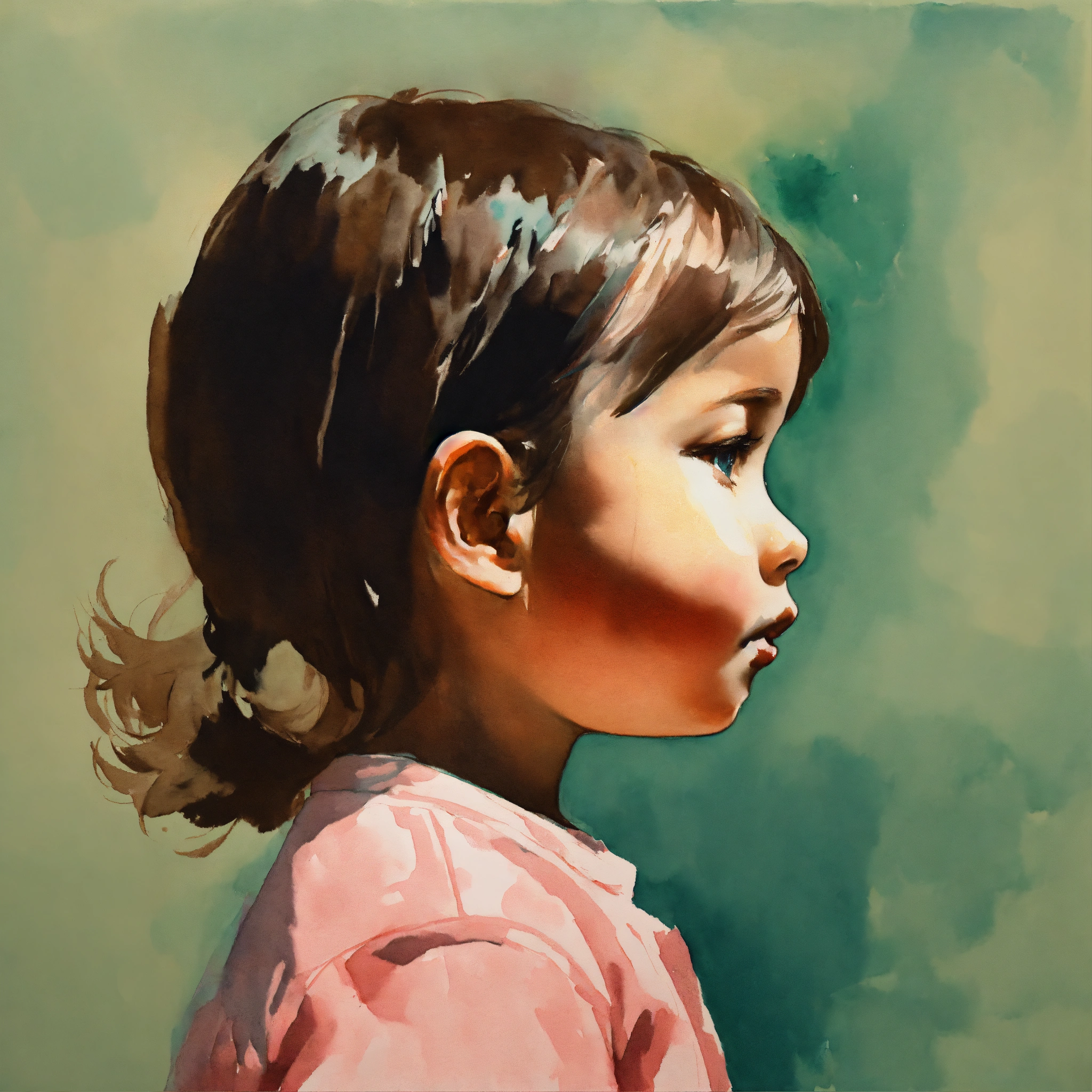 Painted image of a 2-year old girl from the side, muted colors, minimalistic, surreal, gouache and flashe color and tempera on watercolor paper, one color background