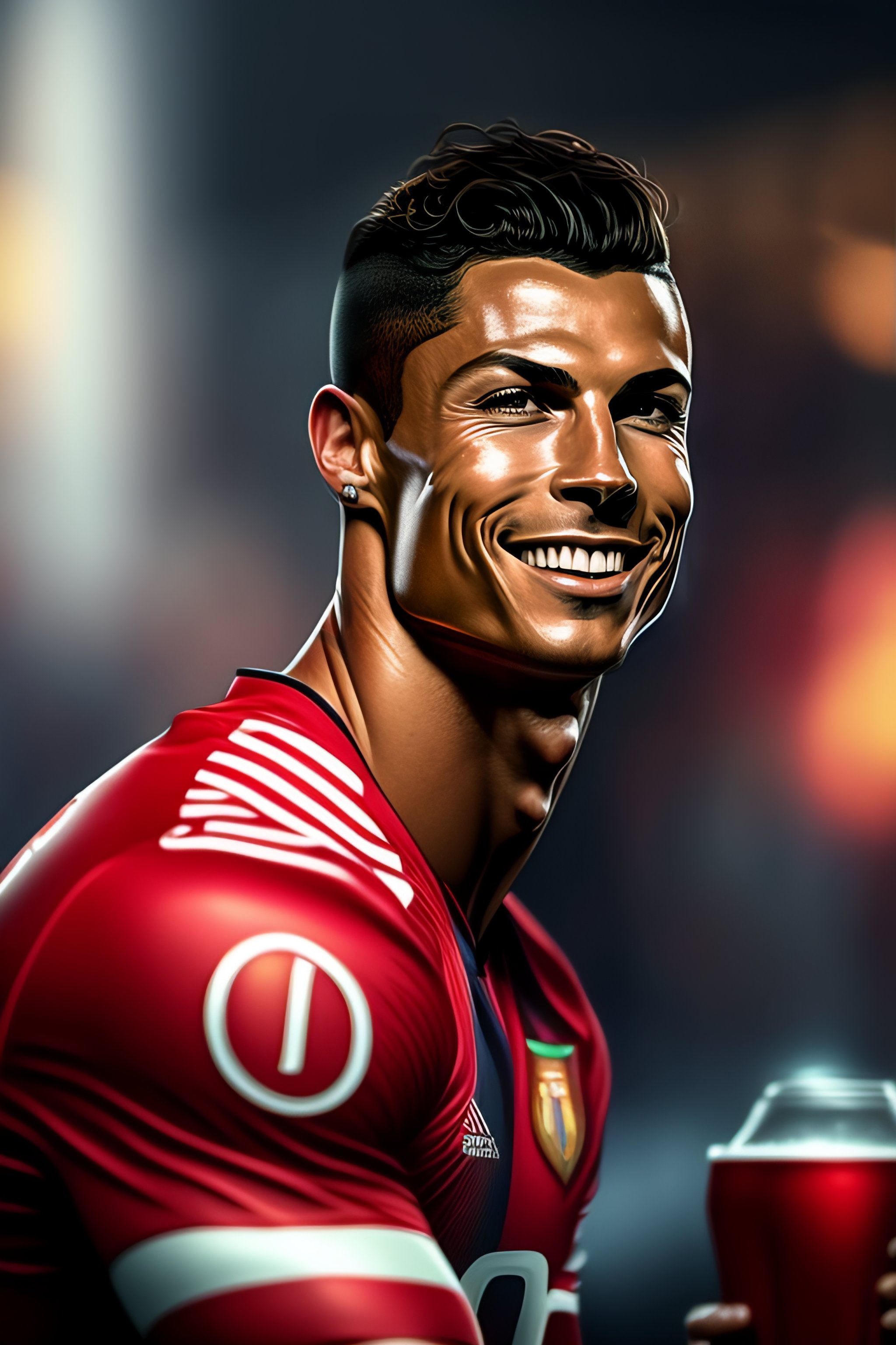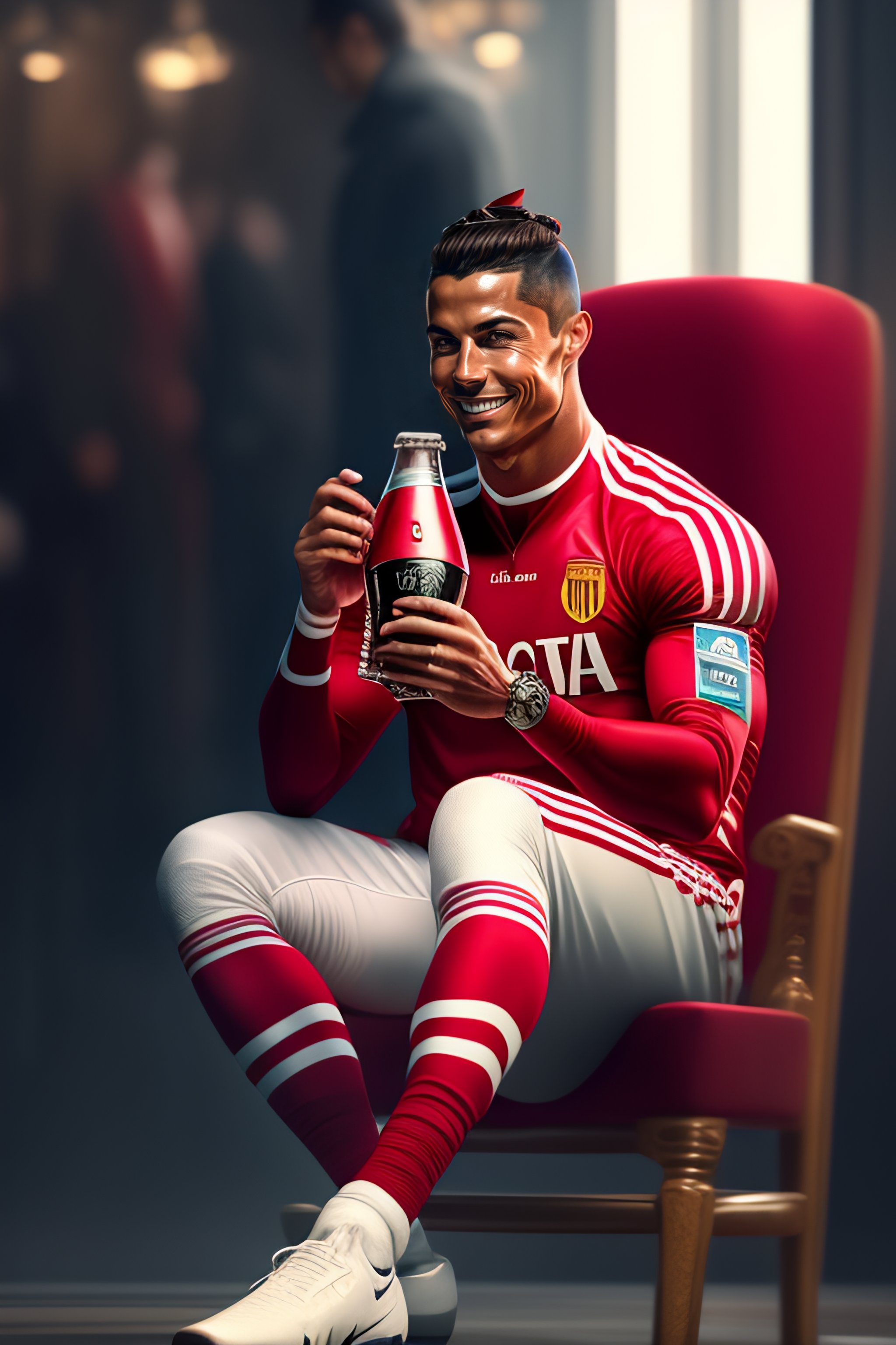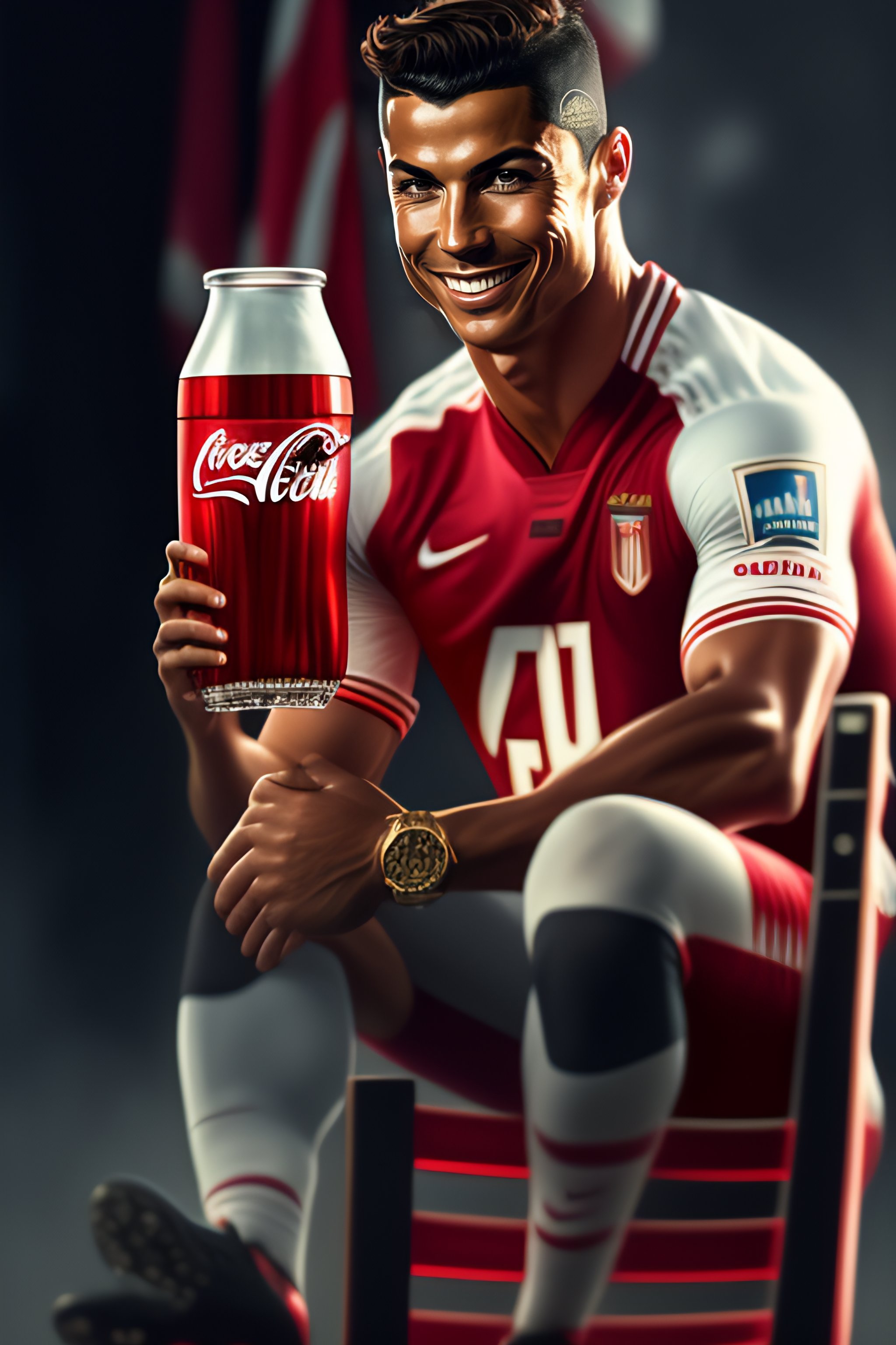 Cristiano ronaldo showing coca-cola in hand, 4k, coca-cola, sitting at a chair, sarcastic smile on face, highly detailed, digital painting, artstation, concept art, smooth, sharp focus, illustration, unreal engine 5, 8 k, art by and greg rutkowski and alphonse mucha