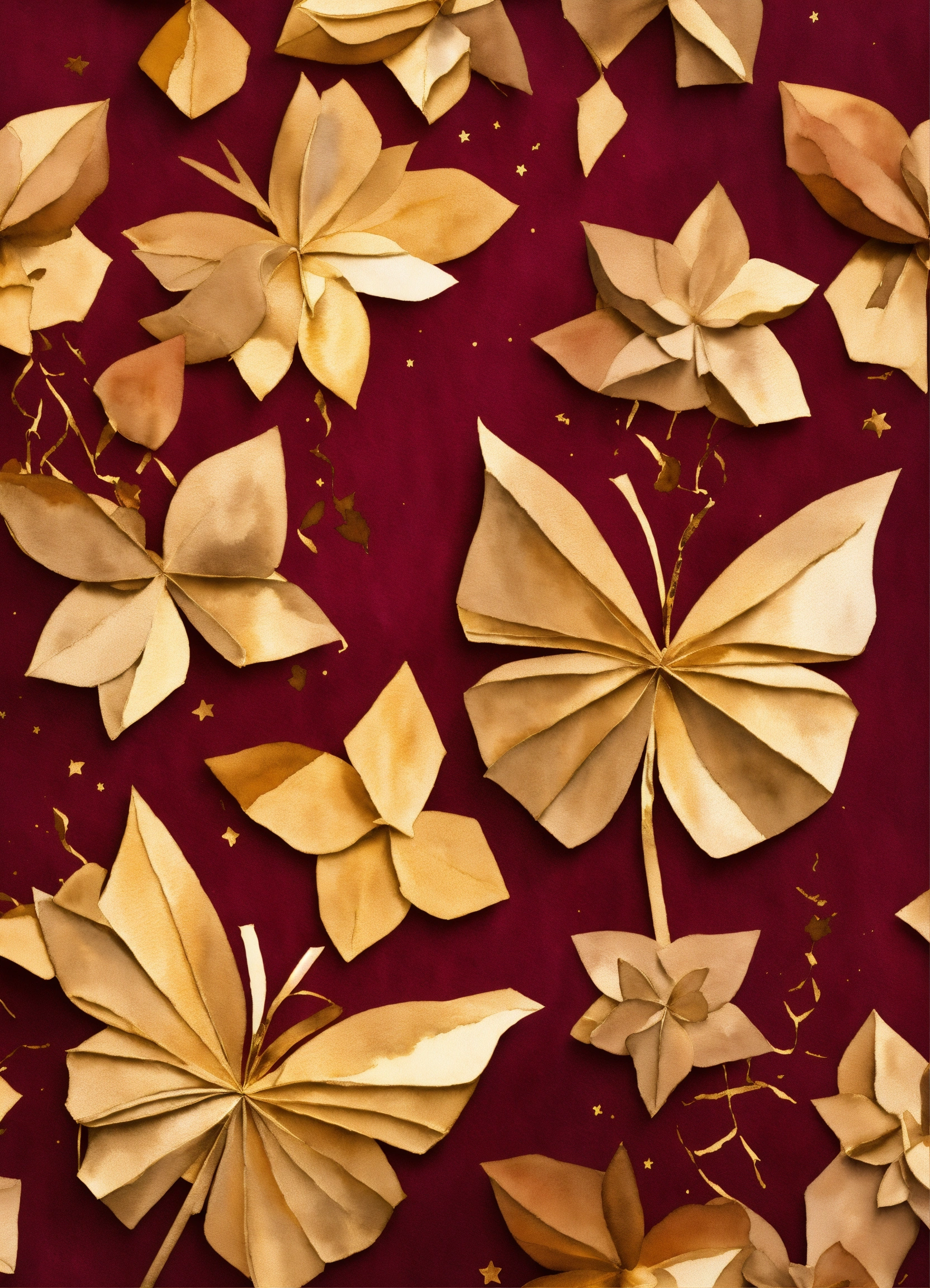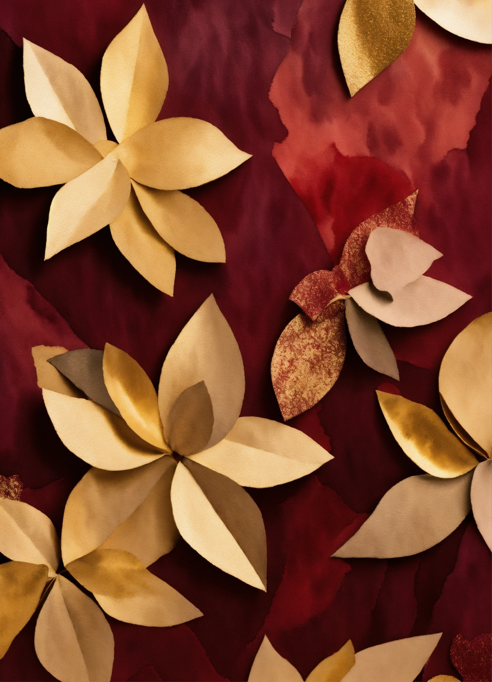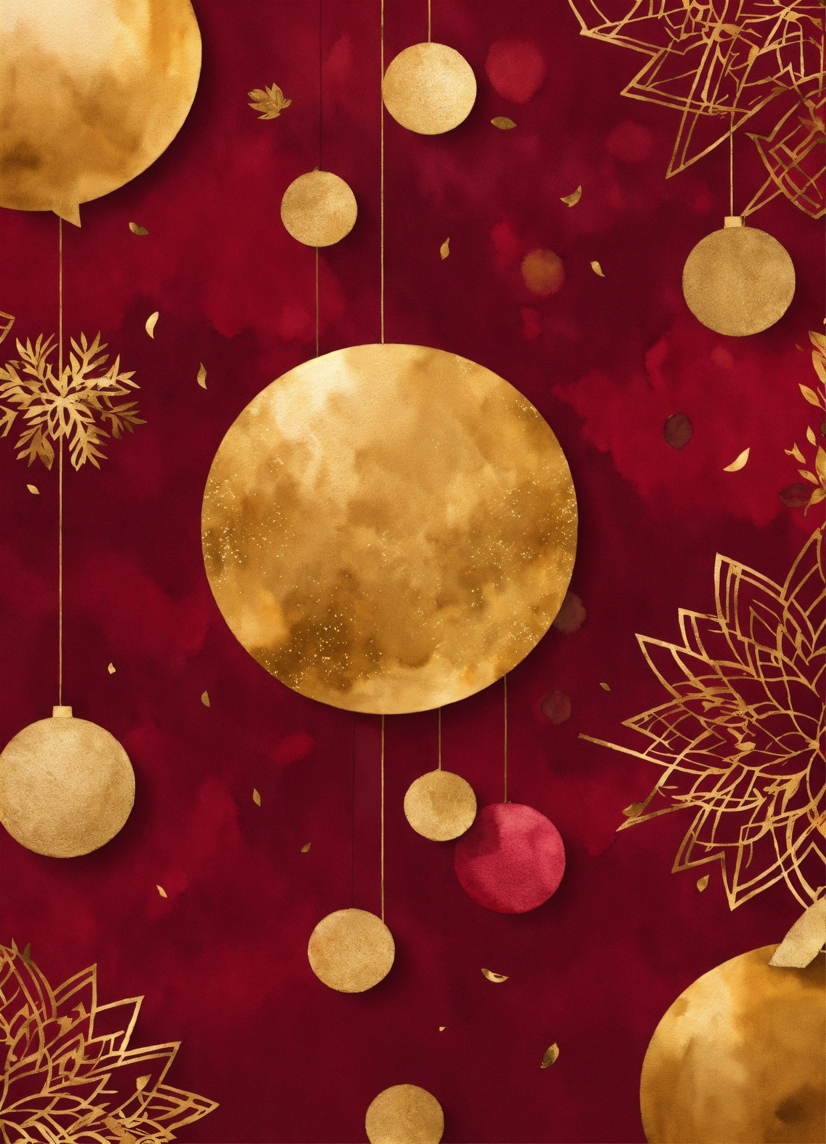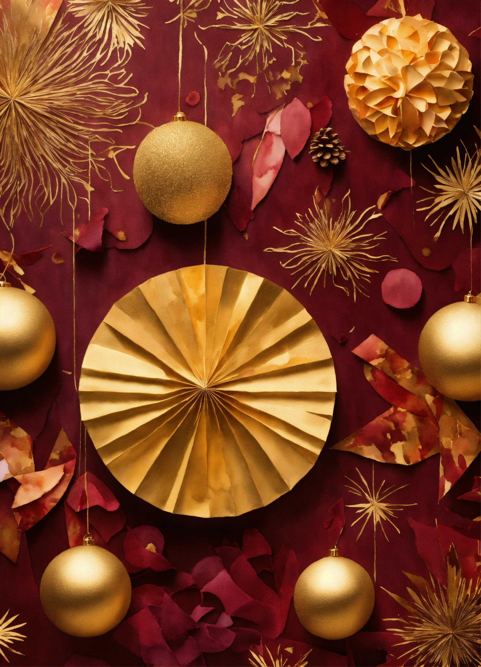 Paper collage art, watercolor golden new year pattern on the burgundy background, photorealistic with warm tones, 8k high resolution