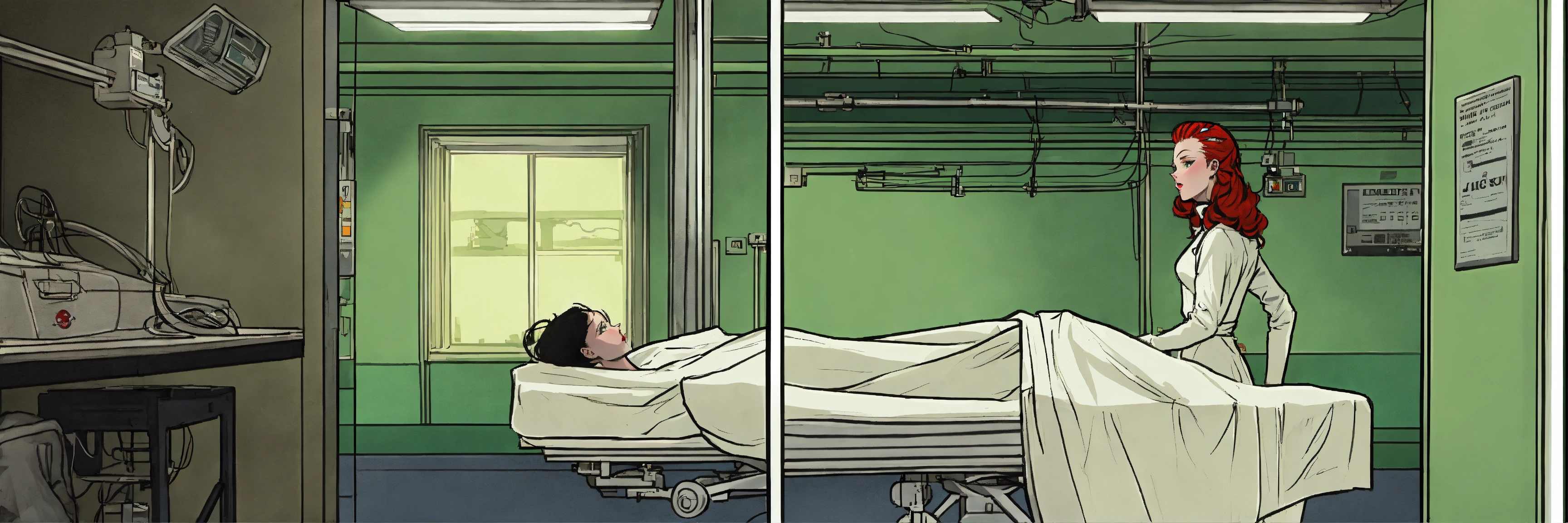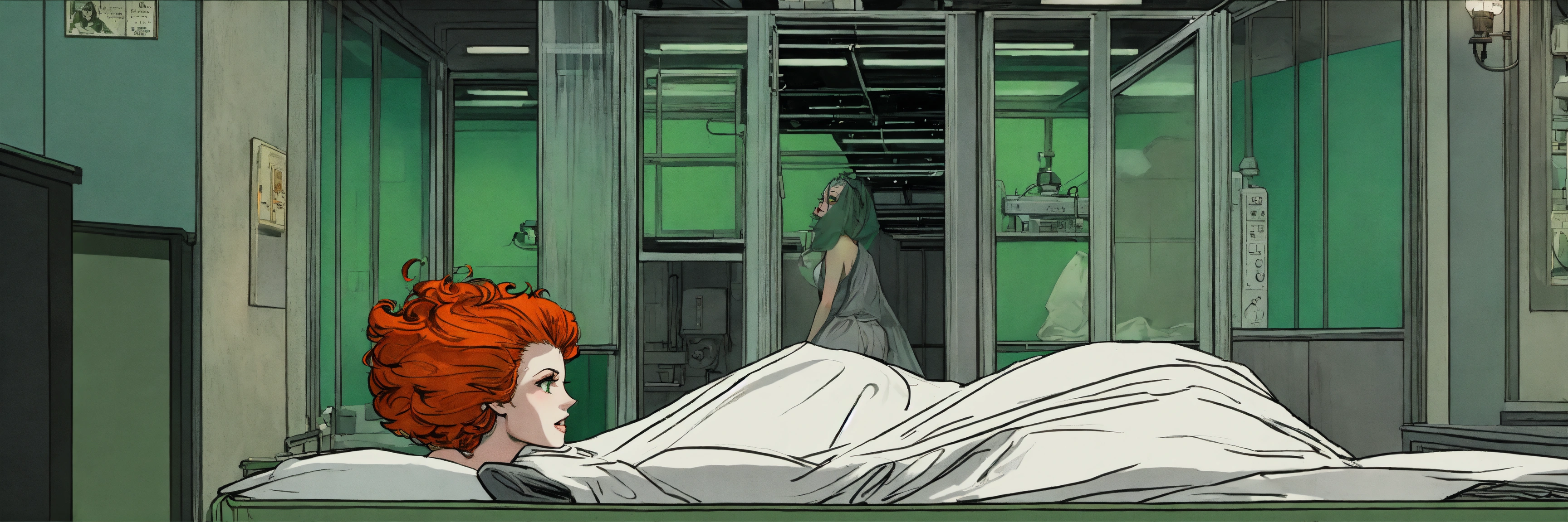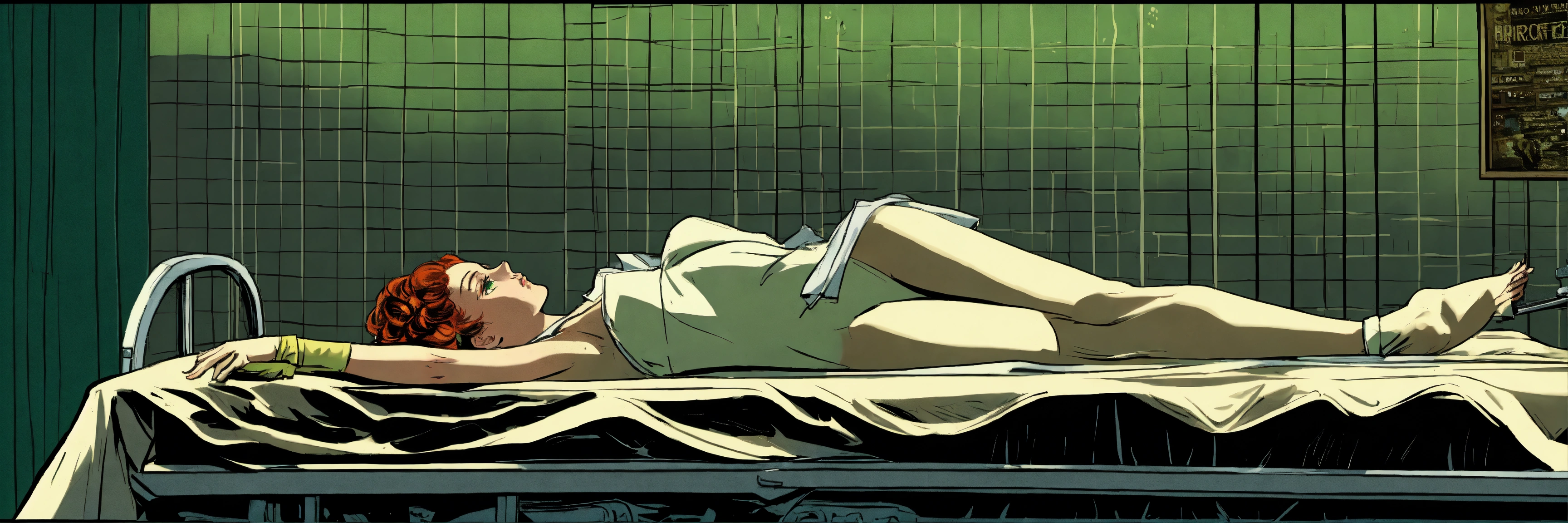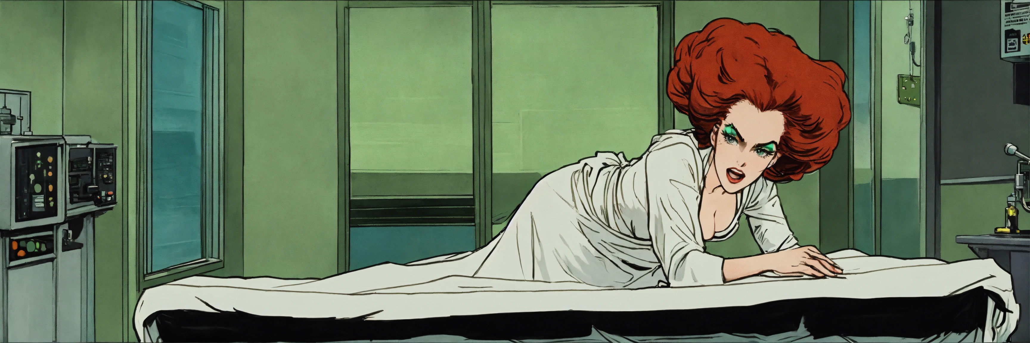 Frame by frame, full body view of a redheaded green-eyed woman as the bride of frankenstein, rising up from the dead from under a sheet, off from on top of a hospital operating table, from her back in a laboratory, she has white streaks of gray hair through her hair from behind her eyes, that run root to tip. drawn like a 1960 black and white comic book.