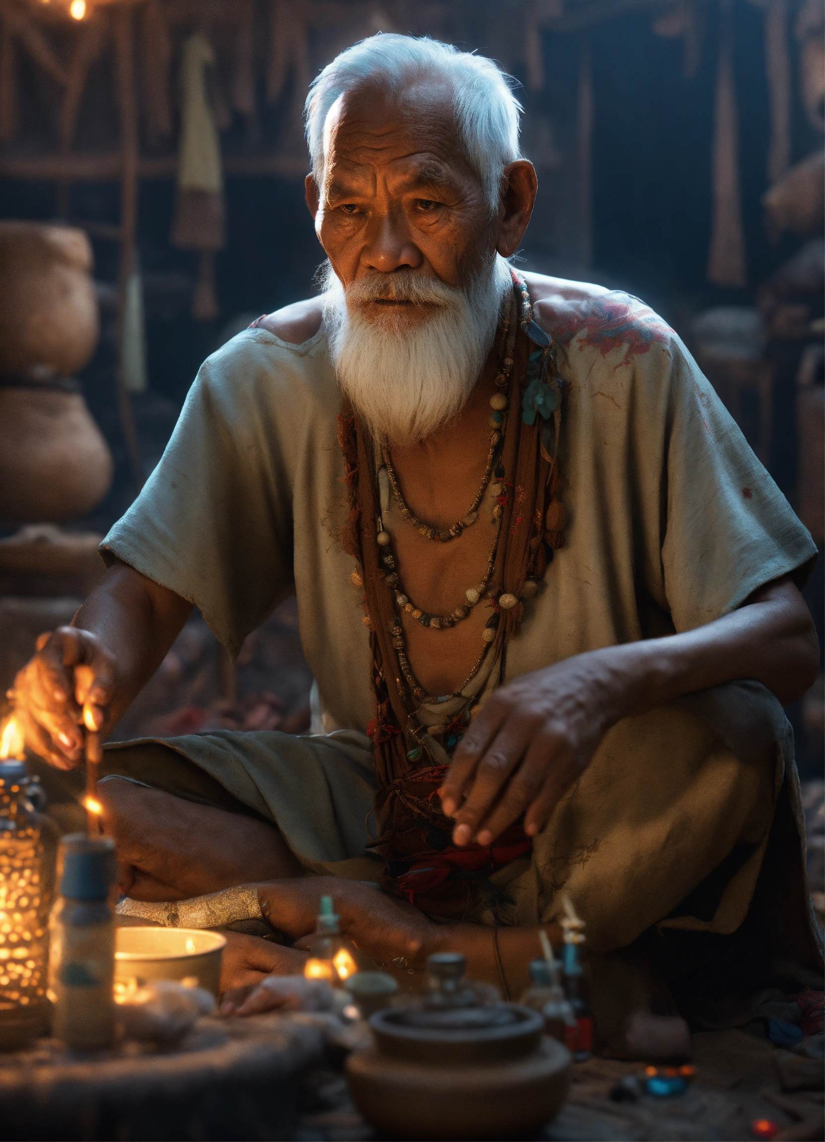 Pilipino albularyo dirty old man making ritual, traditional healer giving medicine, old shamman wearing old short and simple t shirt, philippines, intricate, sharf focus, concept art, artstation, fantasy, octane render, cinematic lighting, otherworldy