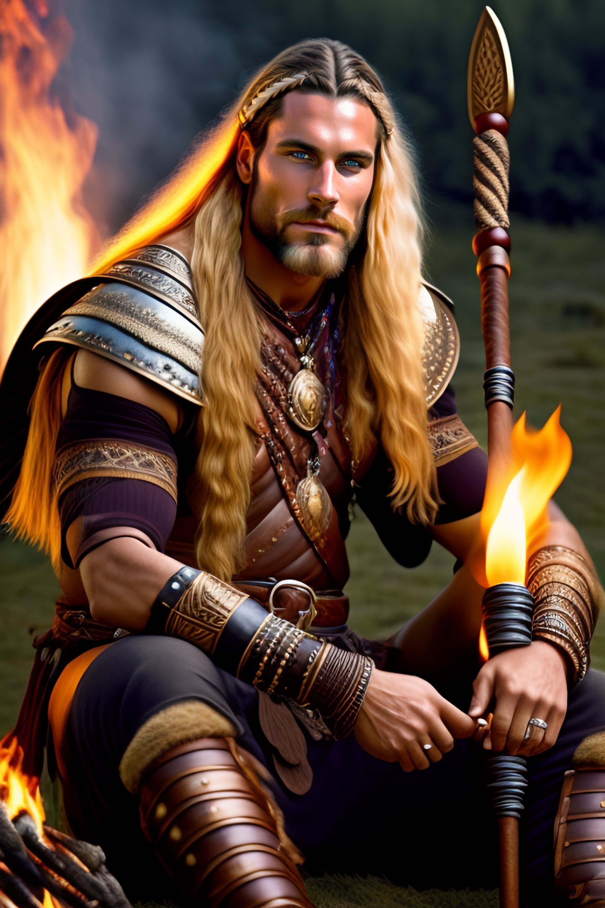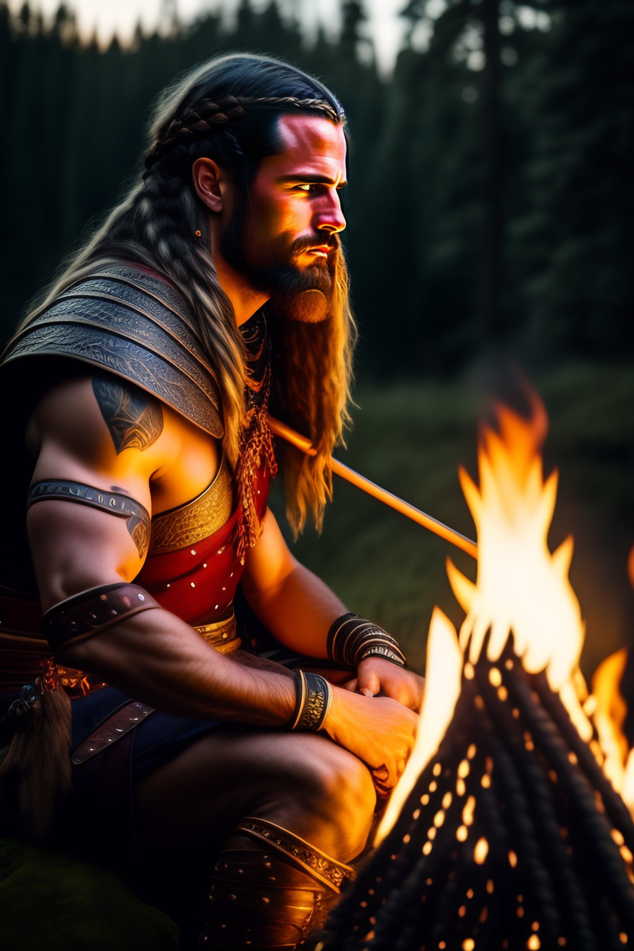Masculine viking warrior male sitting around the campfire, braided hair, wears breastplate, barbarian, horn instrument, shamanic clothes