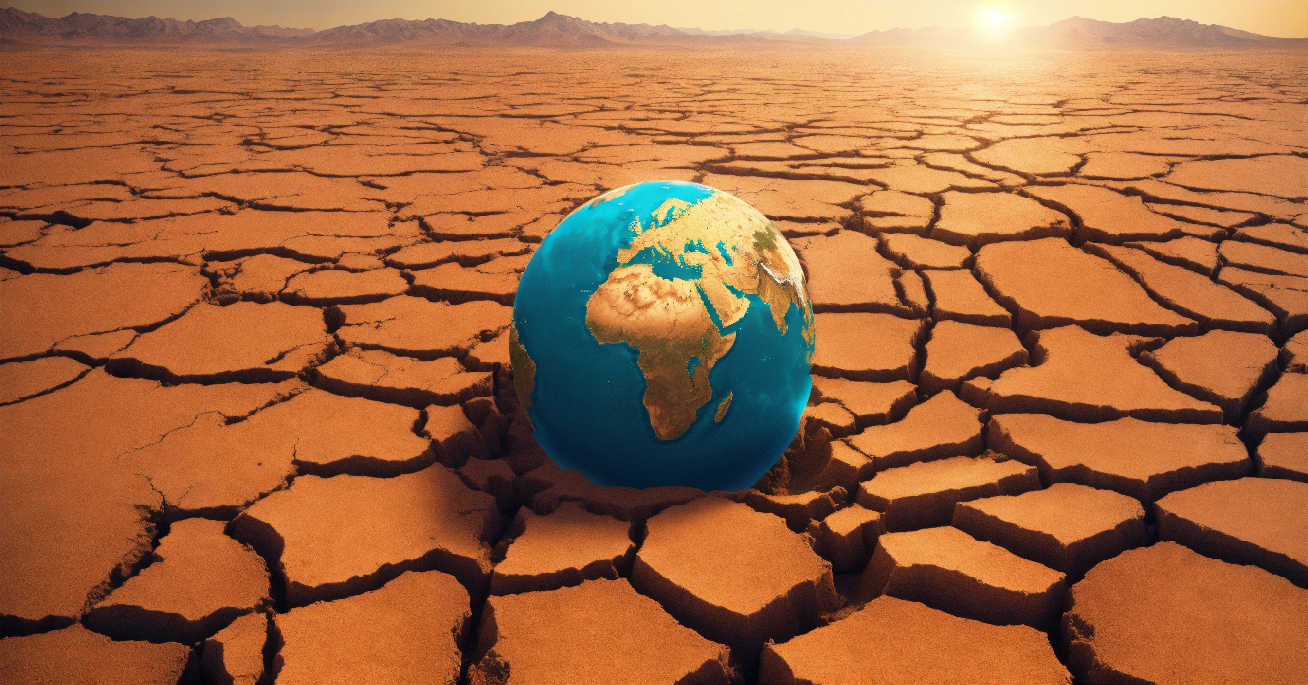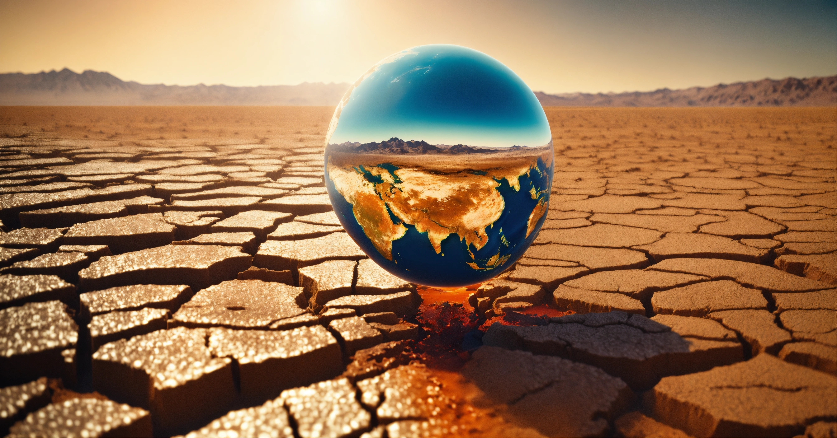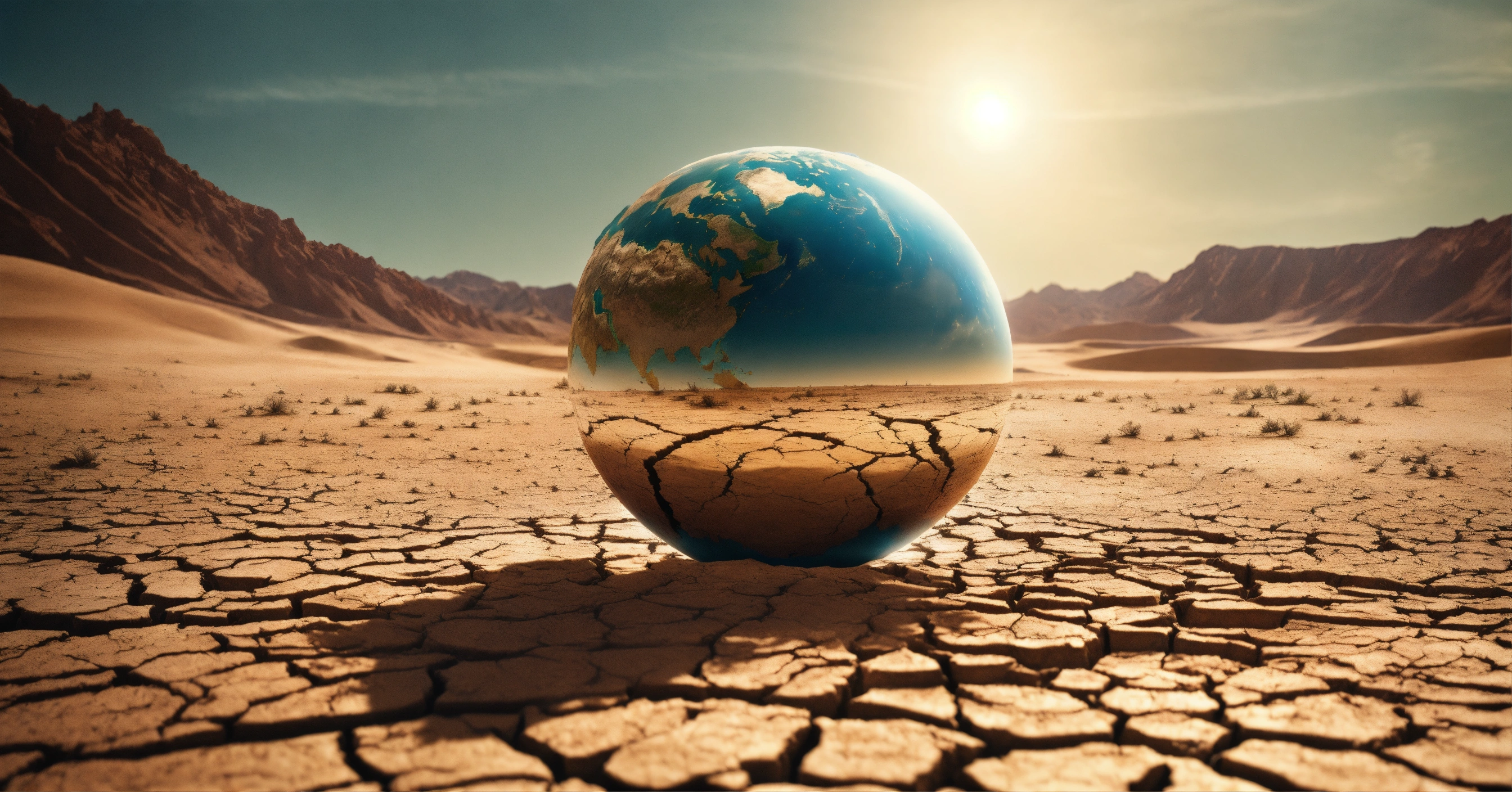 Make a surreal concept of global warming with the close-up of a melting planet earth on a cracked arid desertic ground under a harsh sun, high quality photo, cinematic shot, realistic, film grain, volumetric light, imax, photorealistic