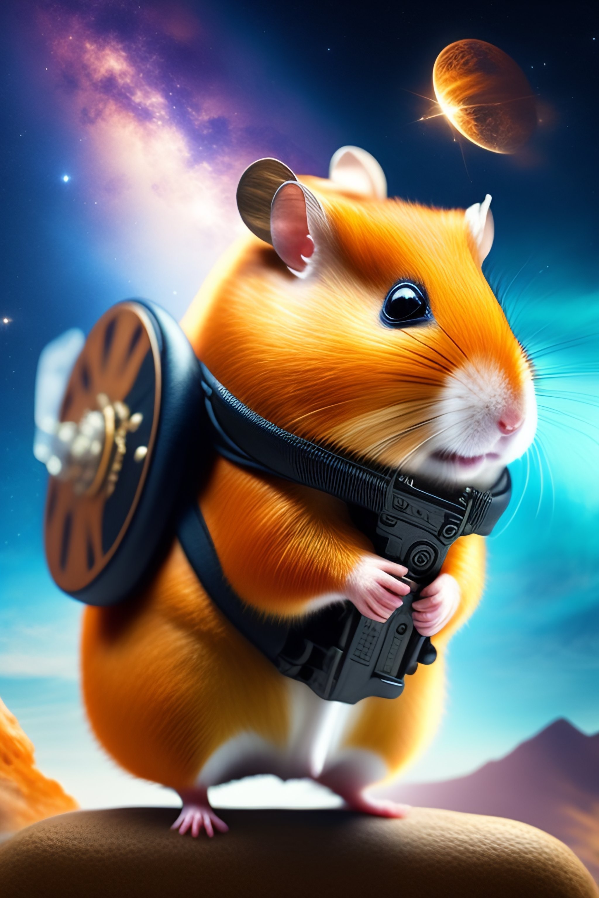 Hamster fantasy cowboy with guns on a horse in space