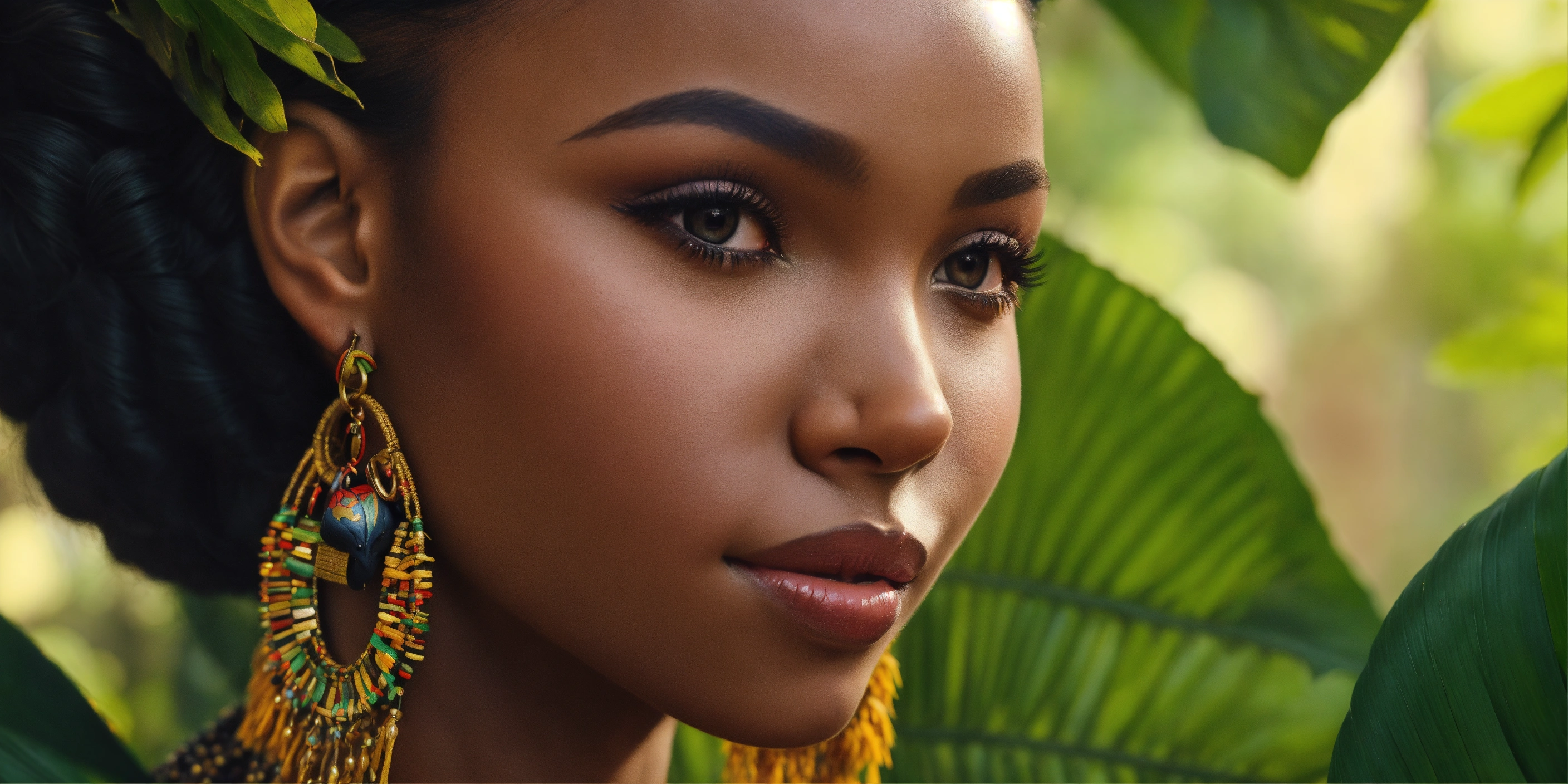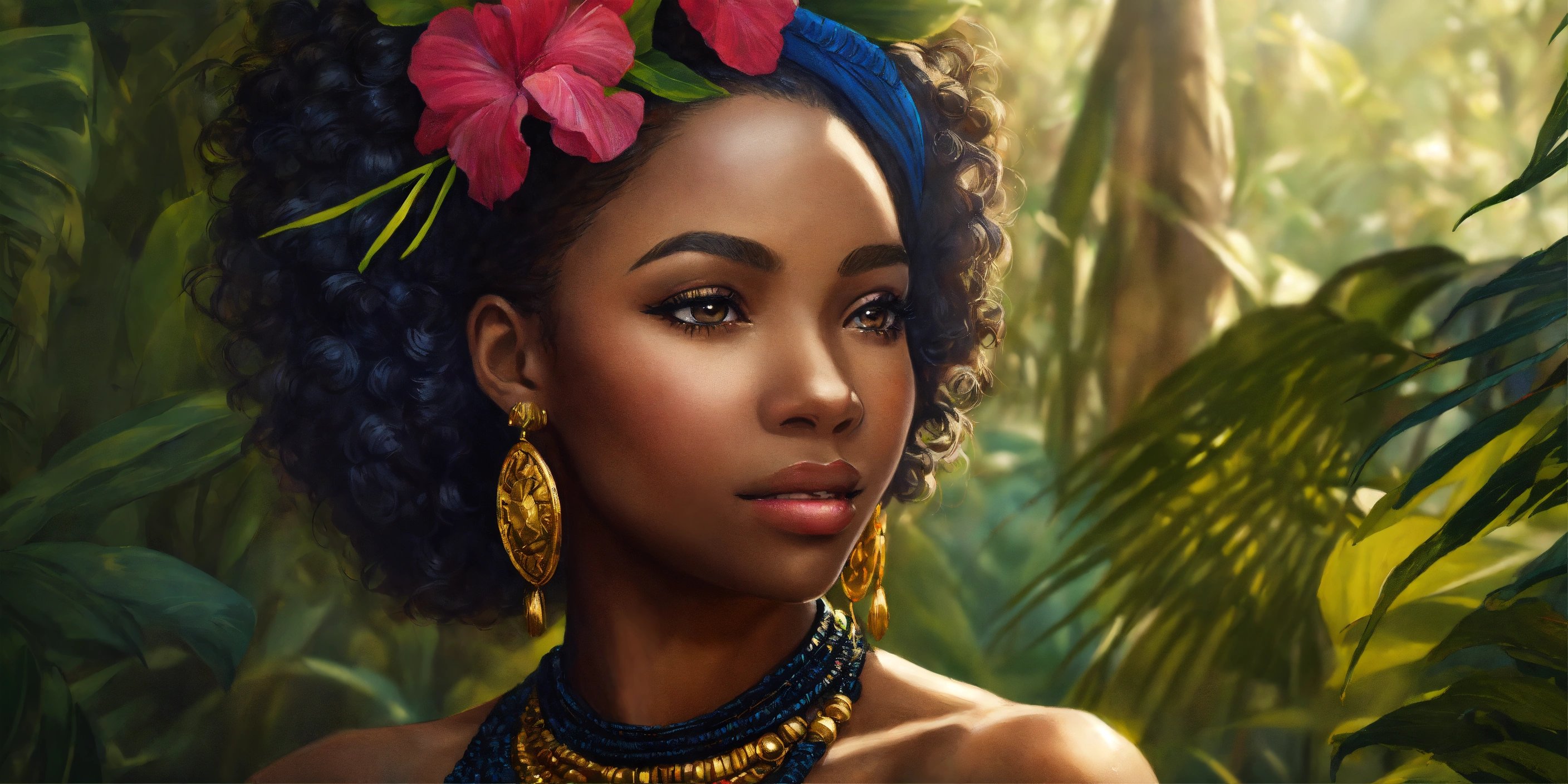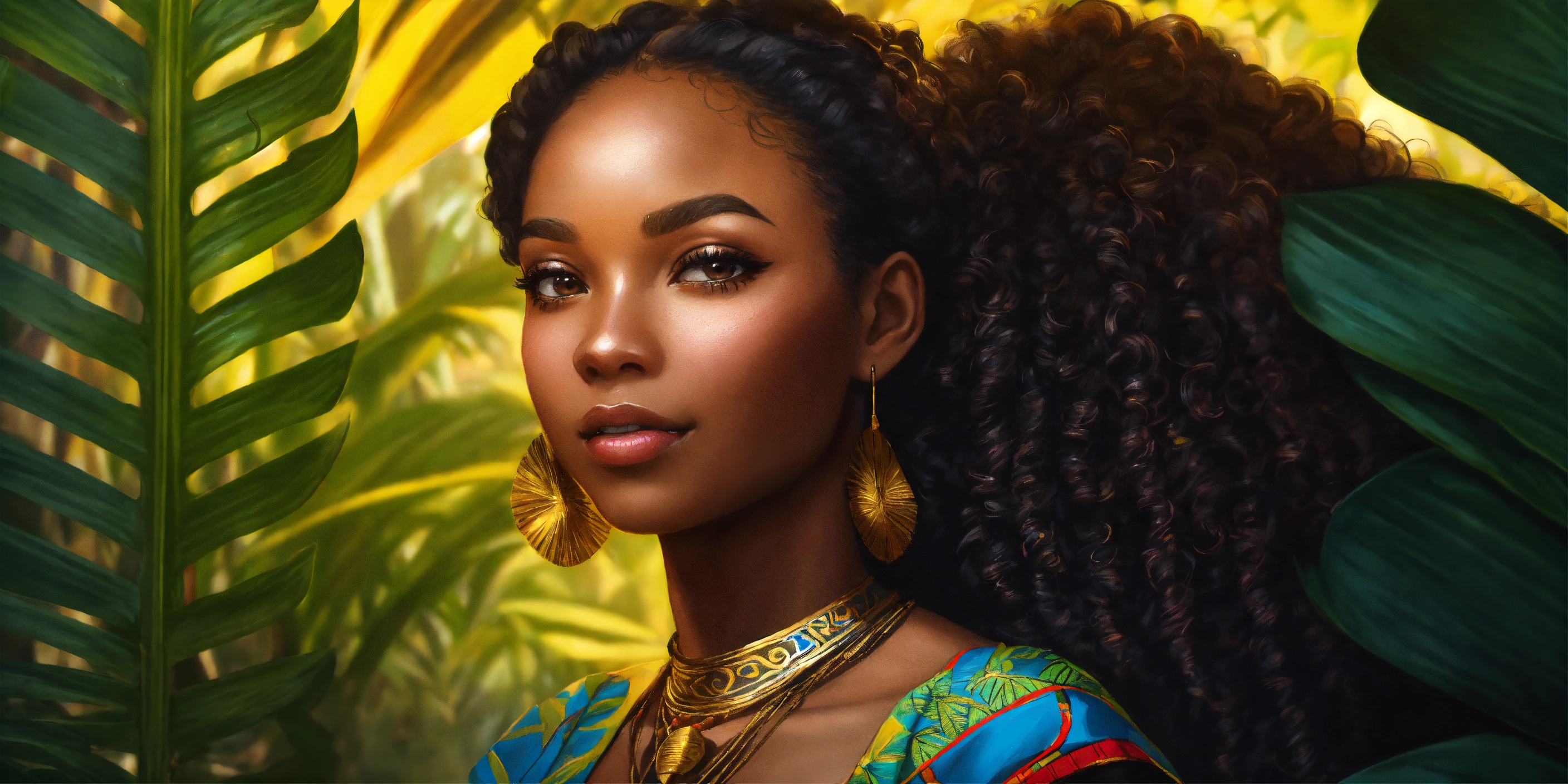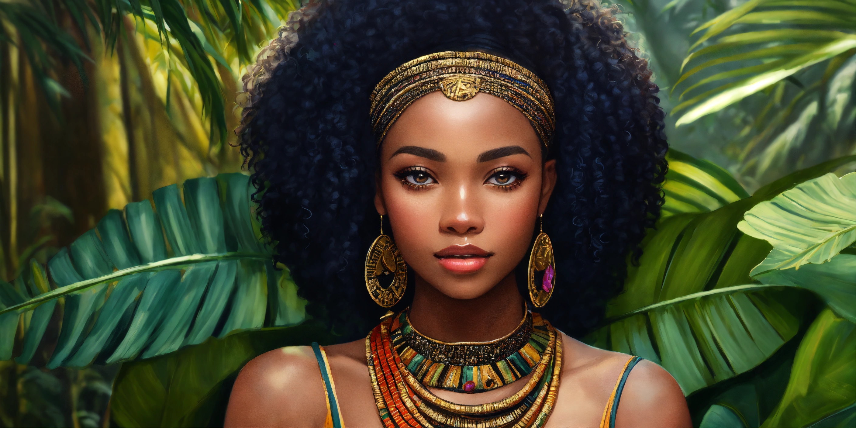 Realistic and detailed portrait, stanley artgerm, very coherent. beautiful young black african woman. traditional ceremony clothing. mysterious tropical jungle. large tropical leaves. curly brown black hair. queen hairstyle. raffia. traditional ceremonial makeup painting. black panther in the background. cute. dove cameron. smiling.
