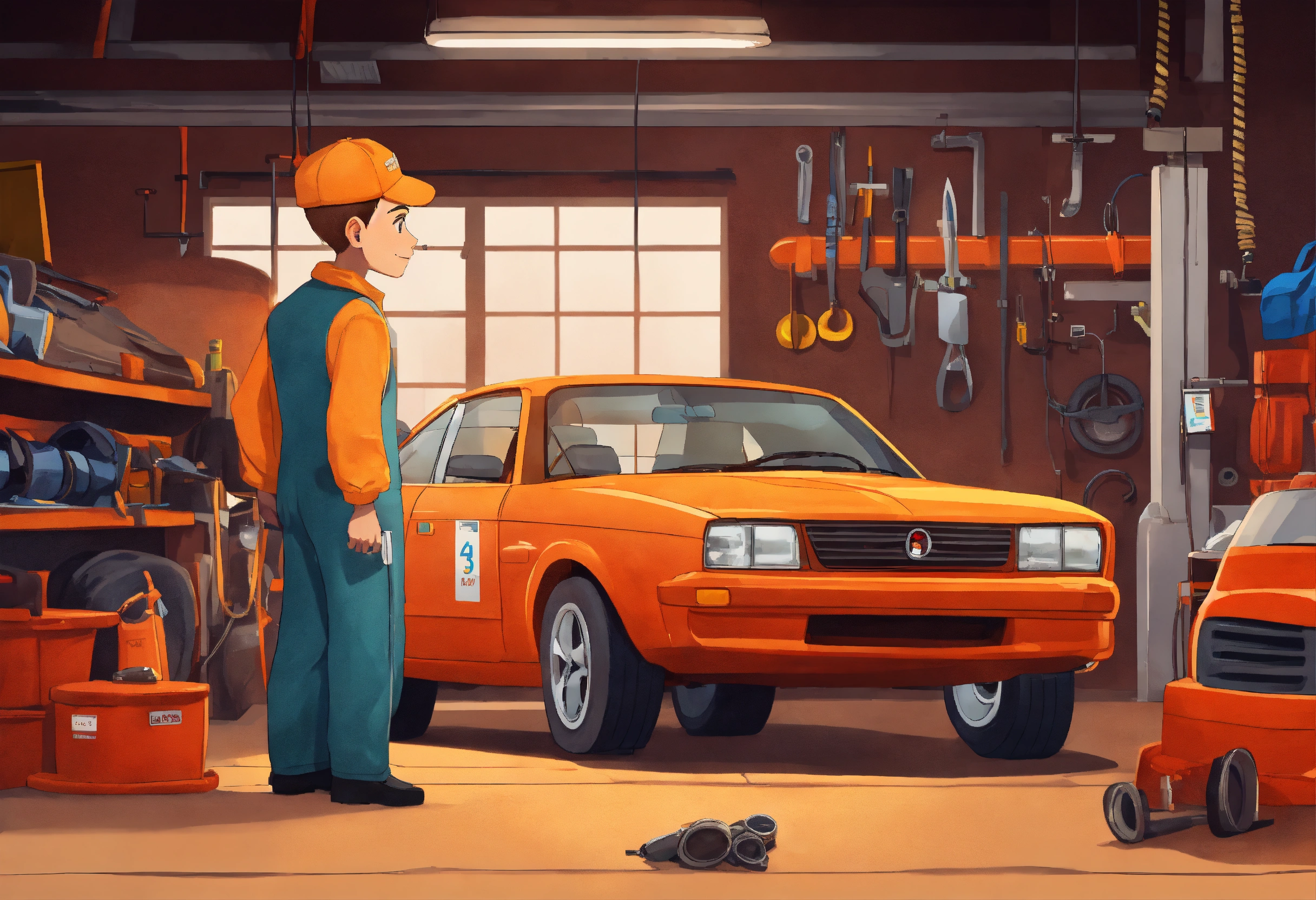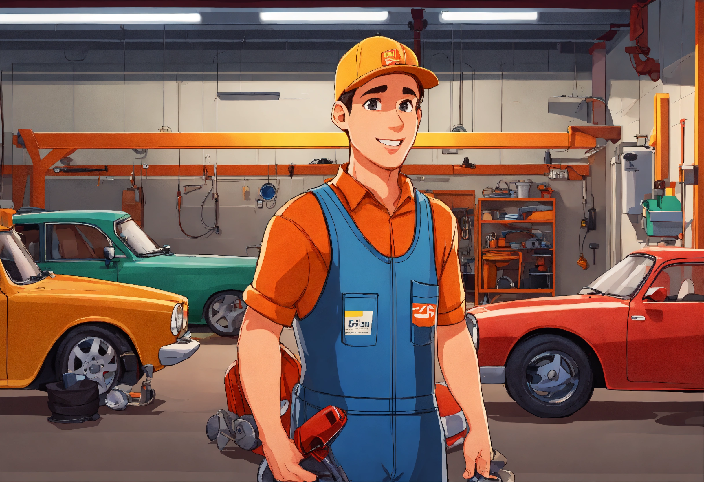 Young boy 33 year old, car mechanic dress, cap, car garage cartoon animation, garage name india europe automobile