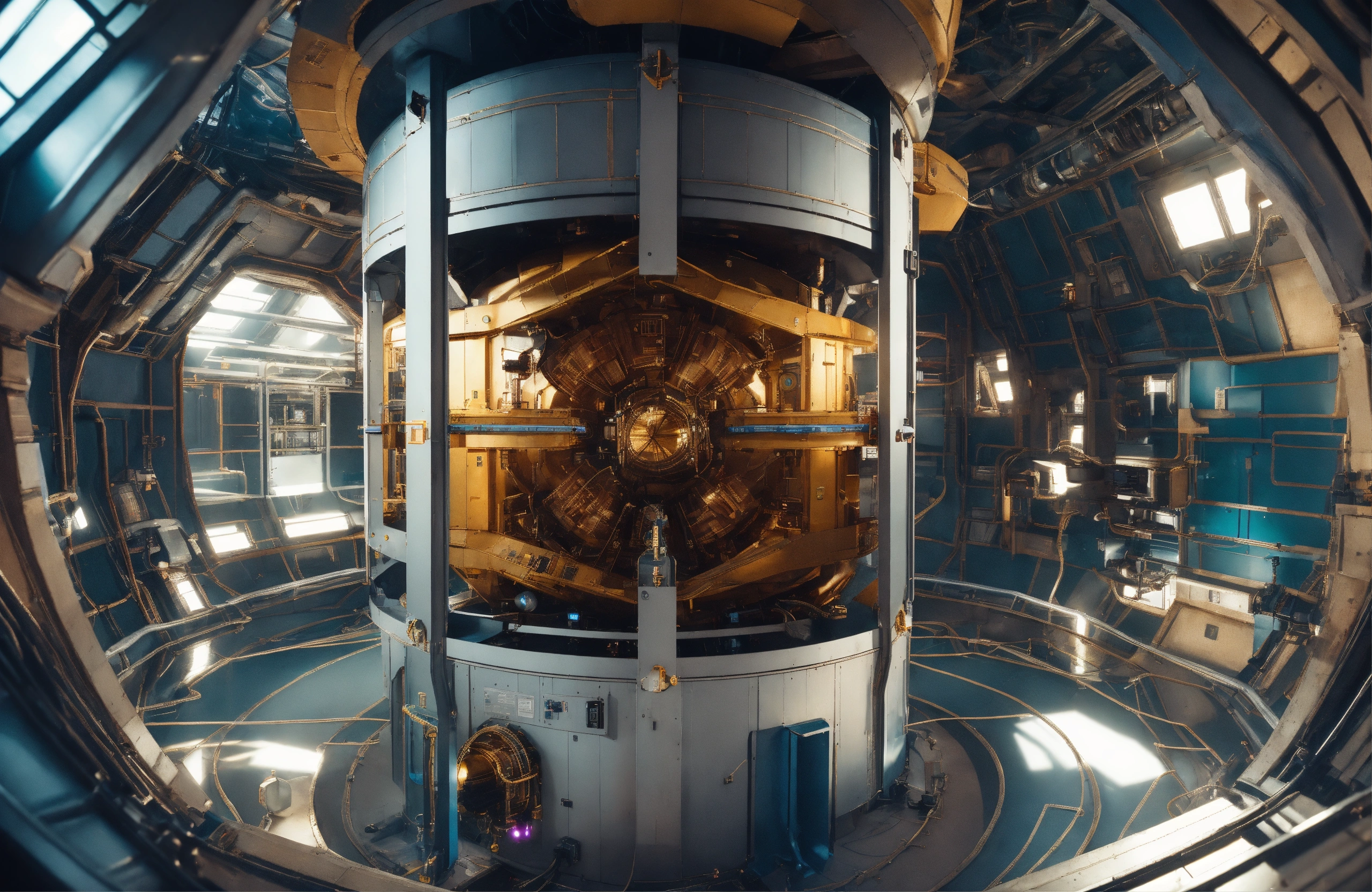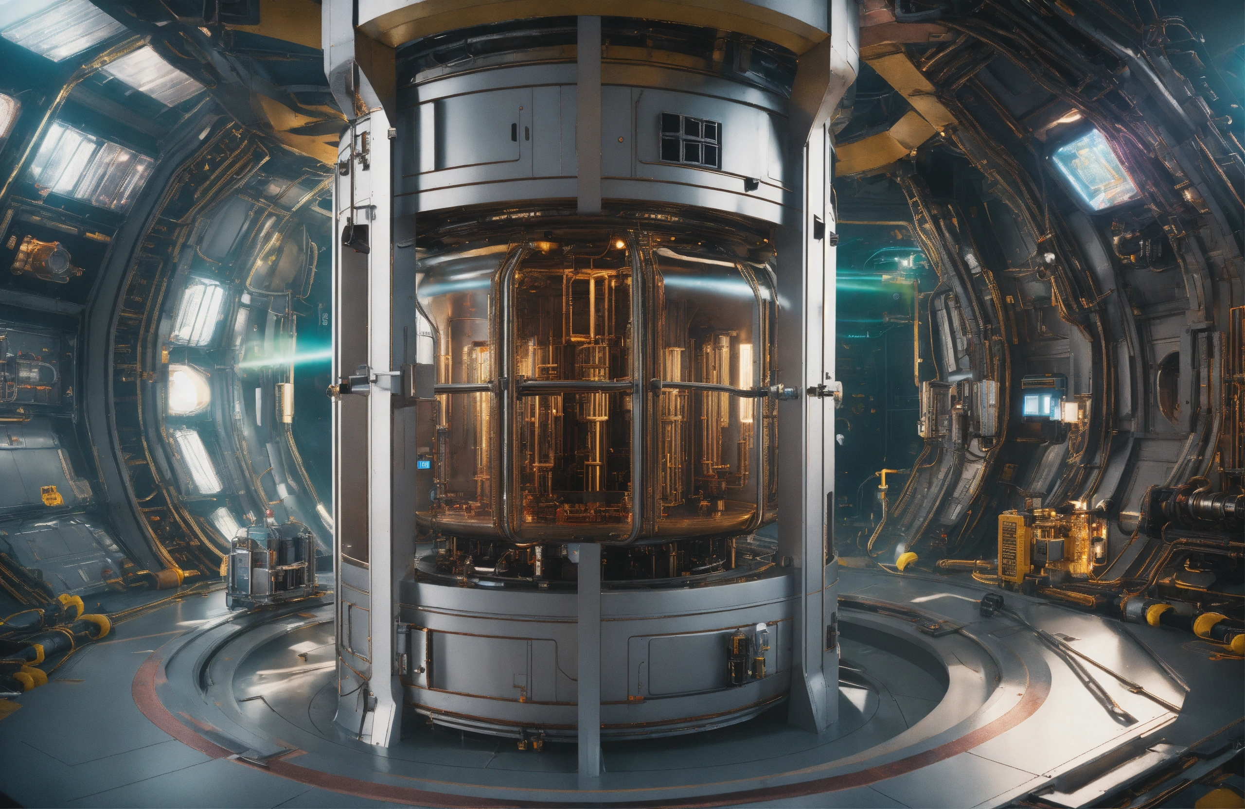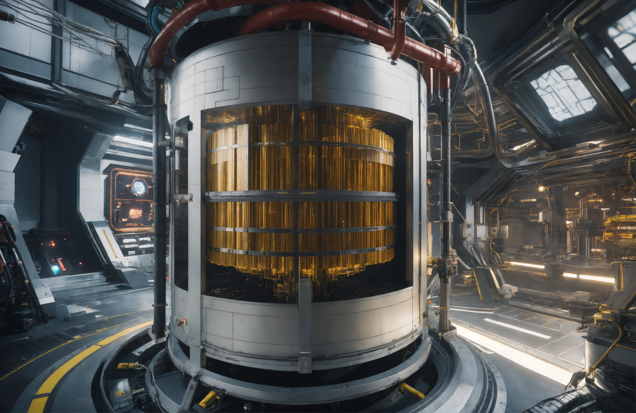 A photo portrait of the antimatter reactor takes up most of the room. the reactor has plasma links to the grav engines. classified area of the ship contains a prototype jump drive. highly detailed, vibrant, production cinematic, stunning realism, reflections, hexagonal patterns, metamaterials, cybertech neo-organic next-gen industrial design, 8k, film grain, 70mm, portra 800