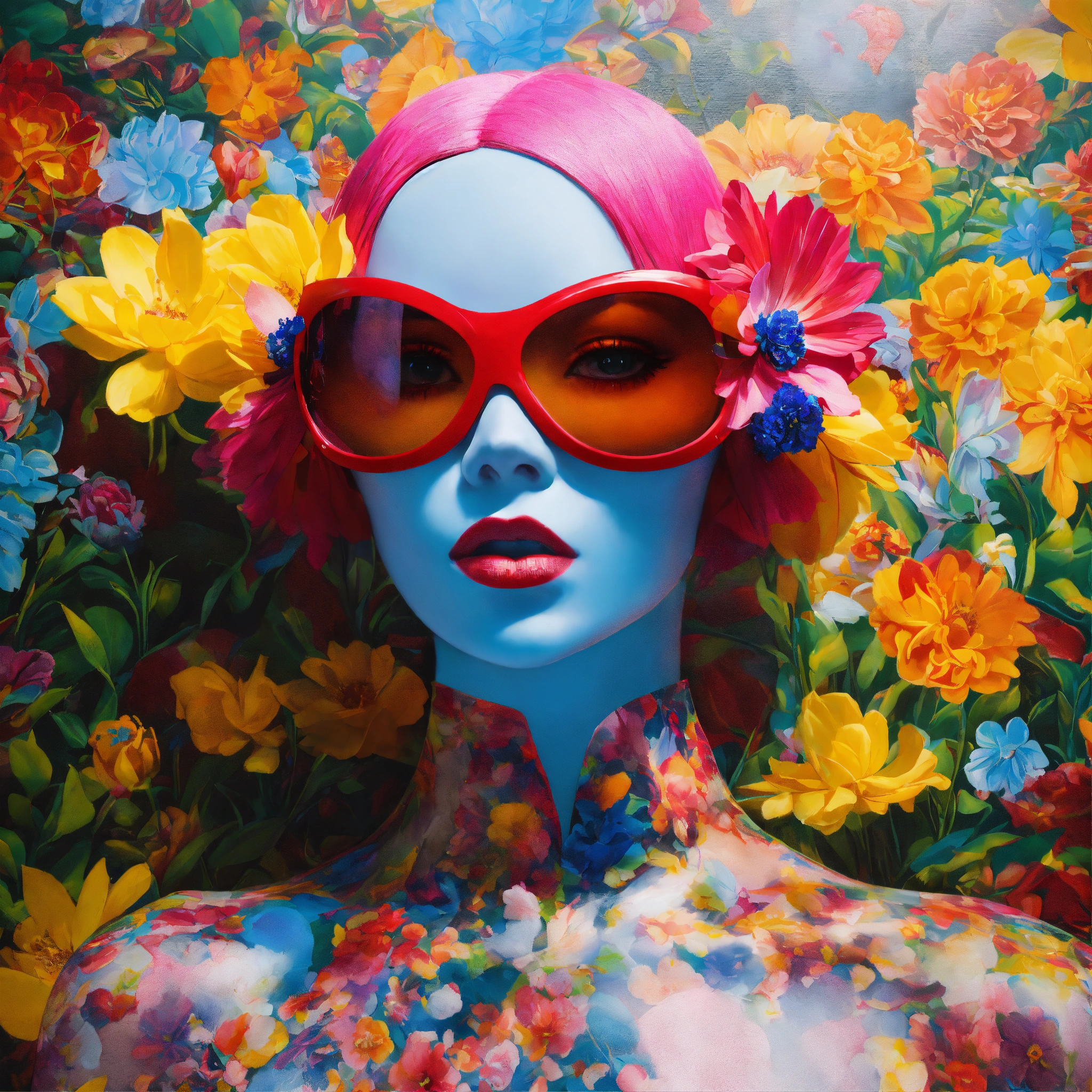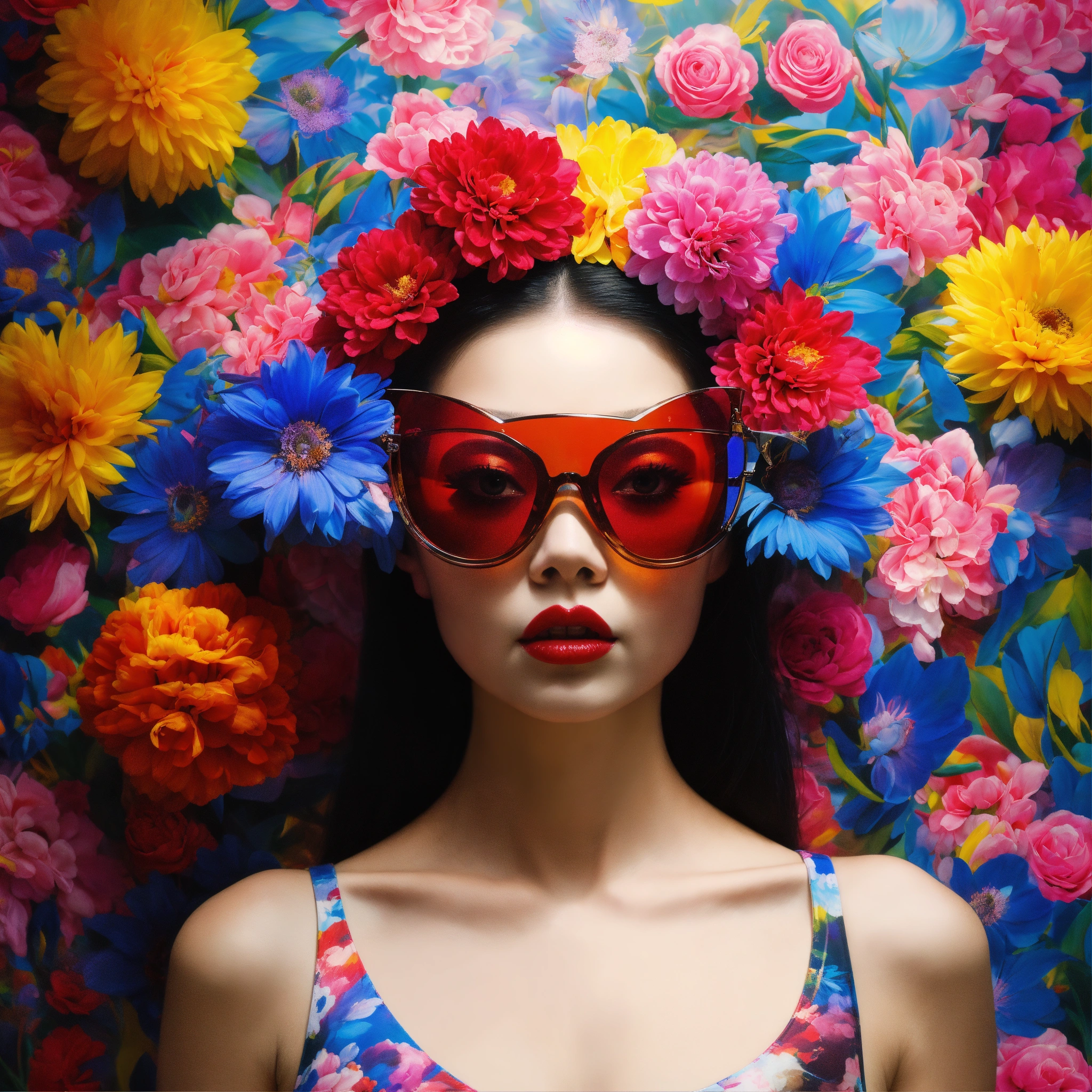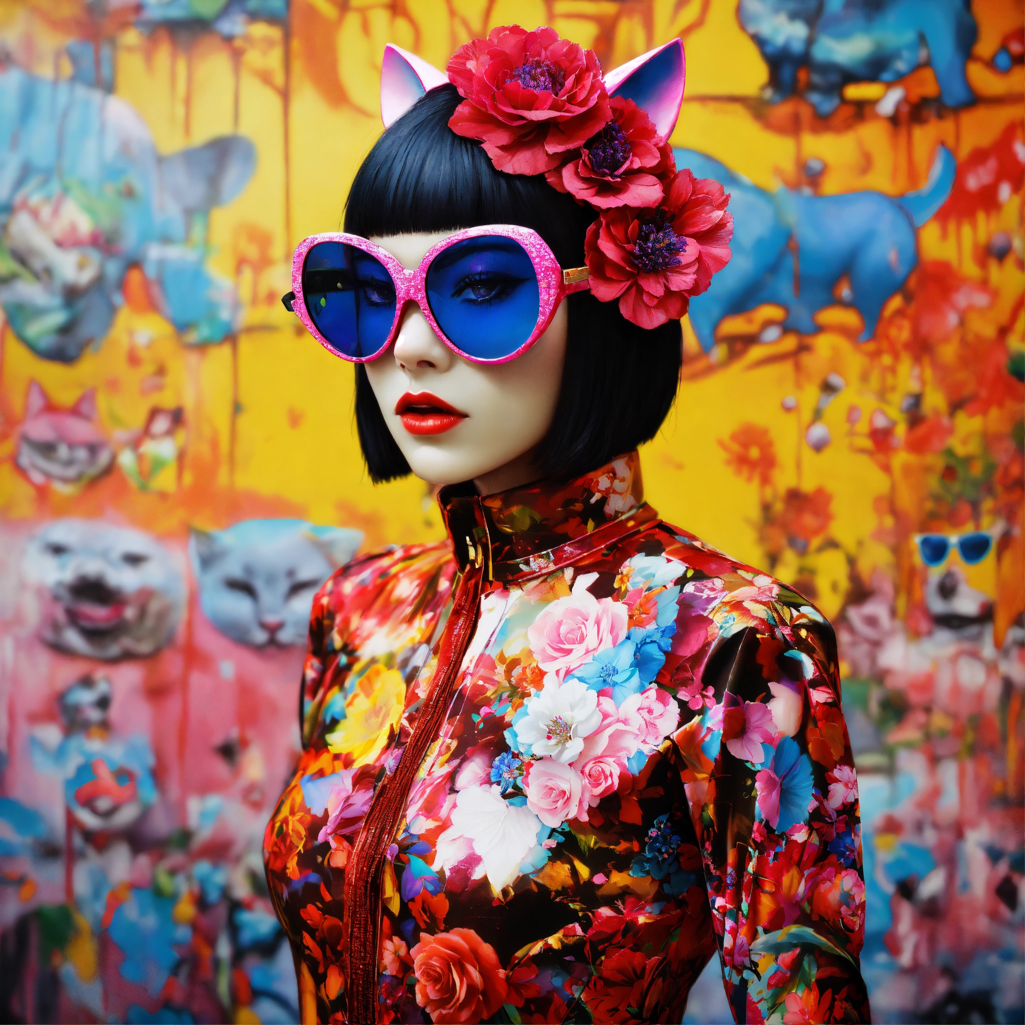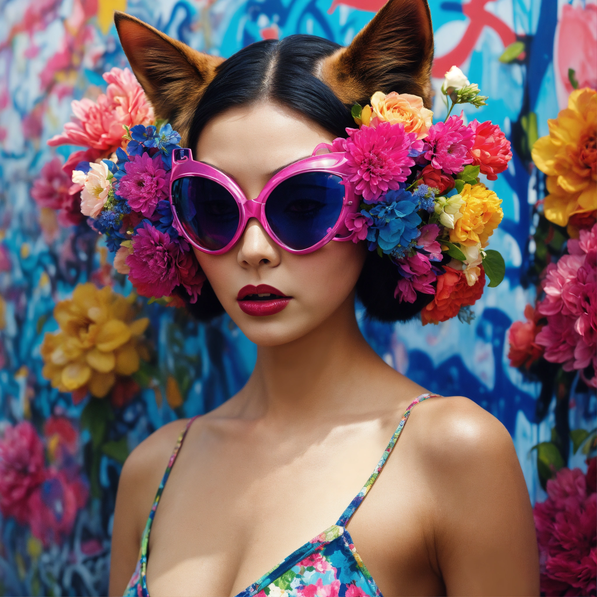 Vibrant flowers and color front portrait photography, a woman's face in an asian american cat woman mask with sunglasses, emerges from graffiti tags, an attractive plexiglass body, 80 degree view, art by sergio lopez, natalie shau, james jean and salvador dali