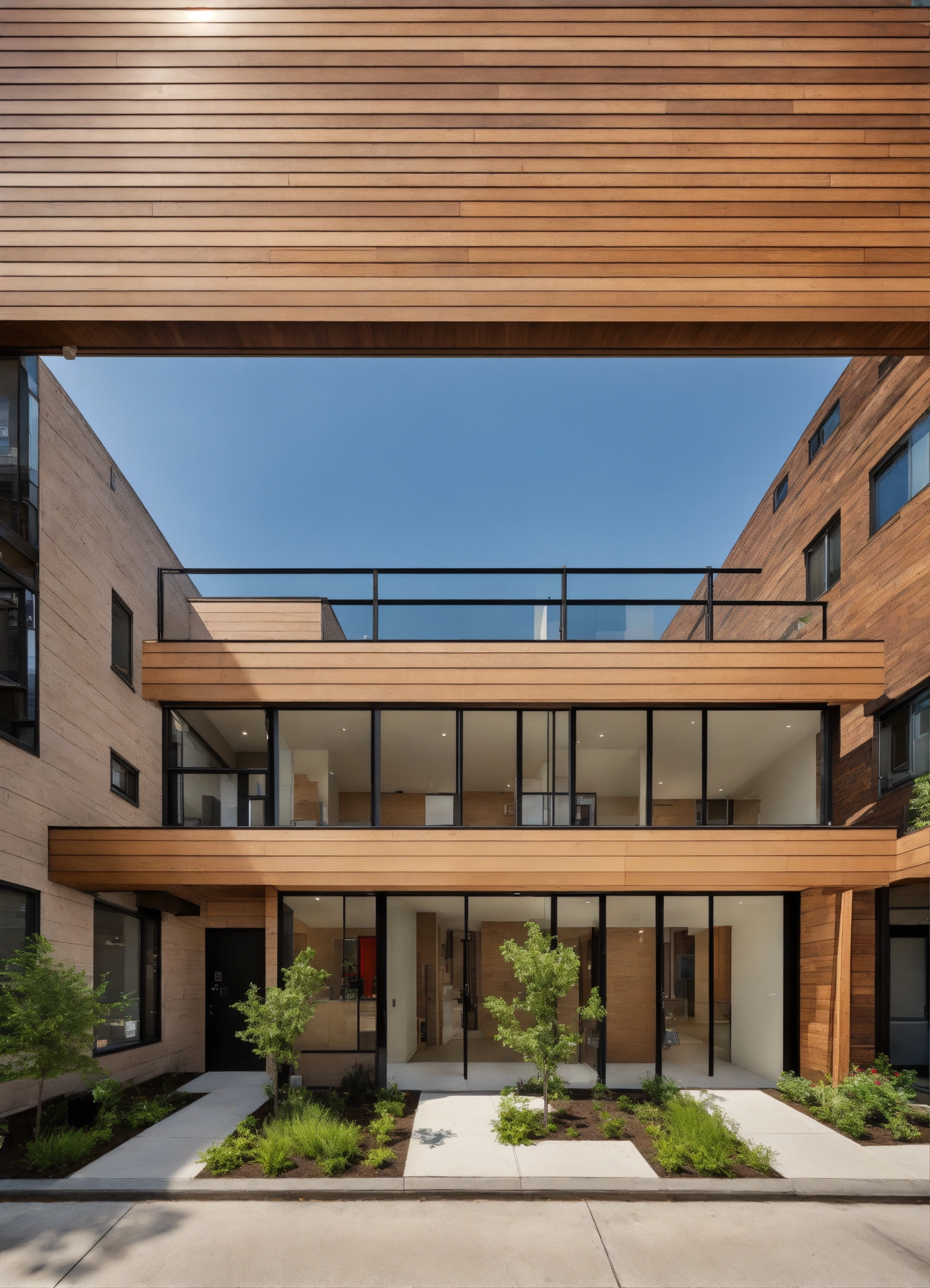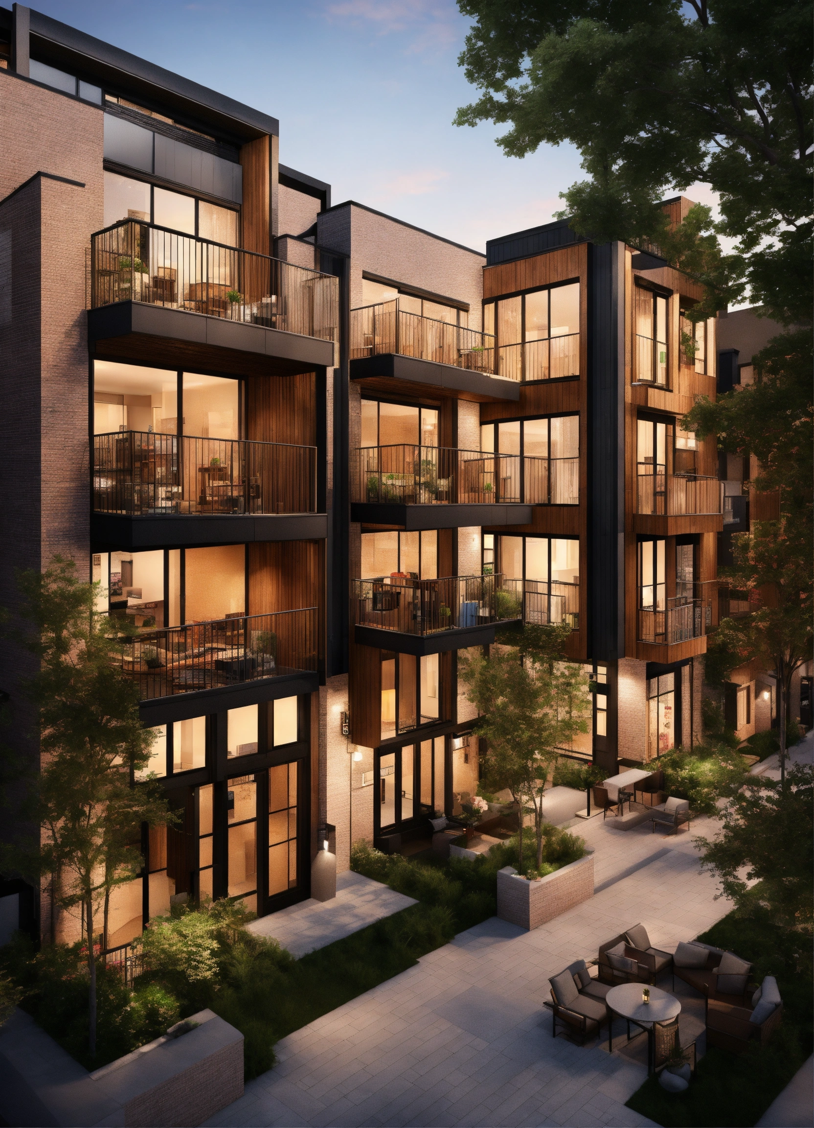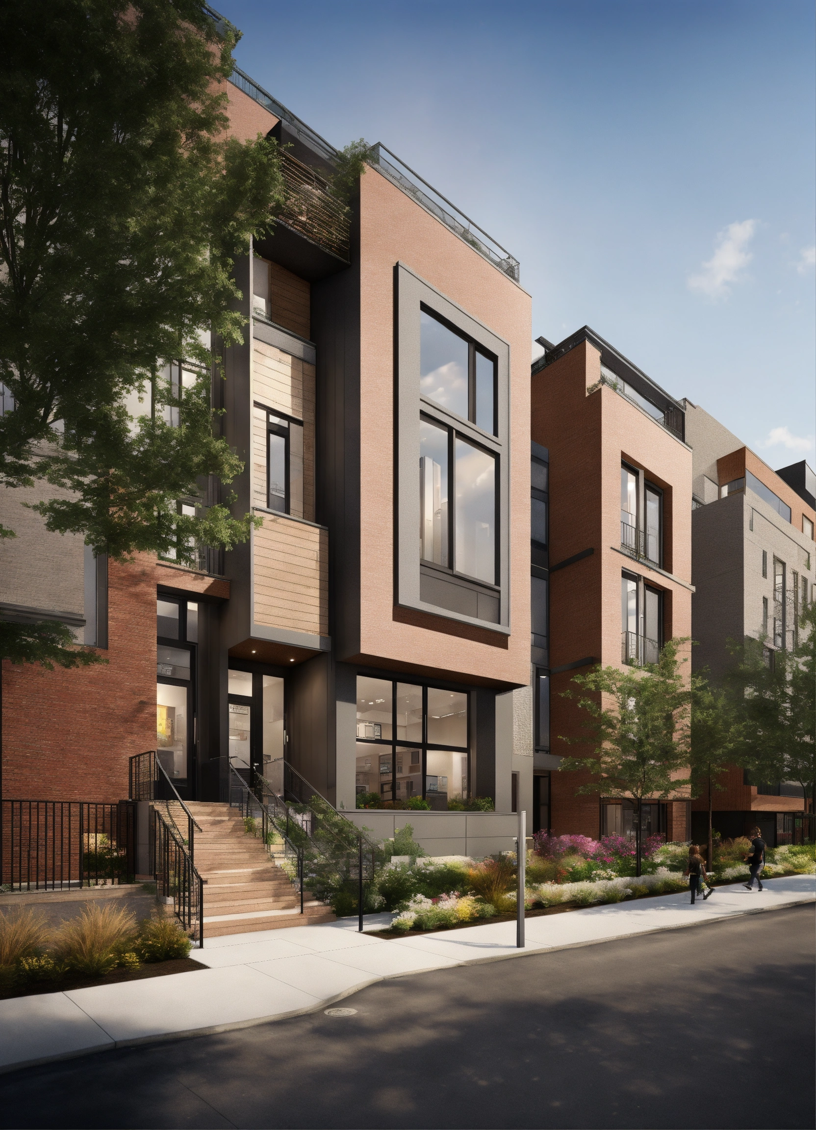 Sleek and modern 1st and second-floor amenity 3rd to 8th-floor condos, 9th and 10th penthouse. building in a vibrant neighborhood offers everything you need to live a comfortable and convenient lifestyle. the ground floor features retail shops, restaurants, a grocery store, and a pharmacy on the south and west side on the east side it has townhomes. the second-floor houses a community center with a gym, swimming pool, rooftop terrace, meeting room, and children's play area. the upper floors offer a mix of condos and rental apartments, with a lofted-story penthouse and terrace on top. make the image 4k wide angle showing the whole building and surrounding sidewalks. give me options on how the townhouses will look on only the east side of the building the area of the site is 164x175 in the shape of a rhombus