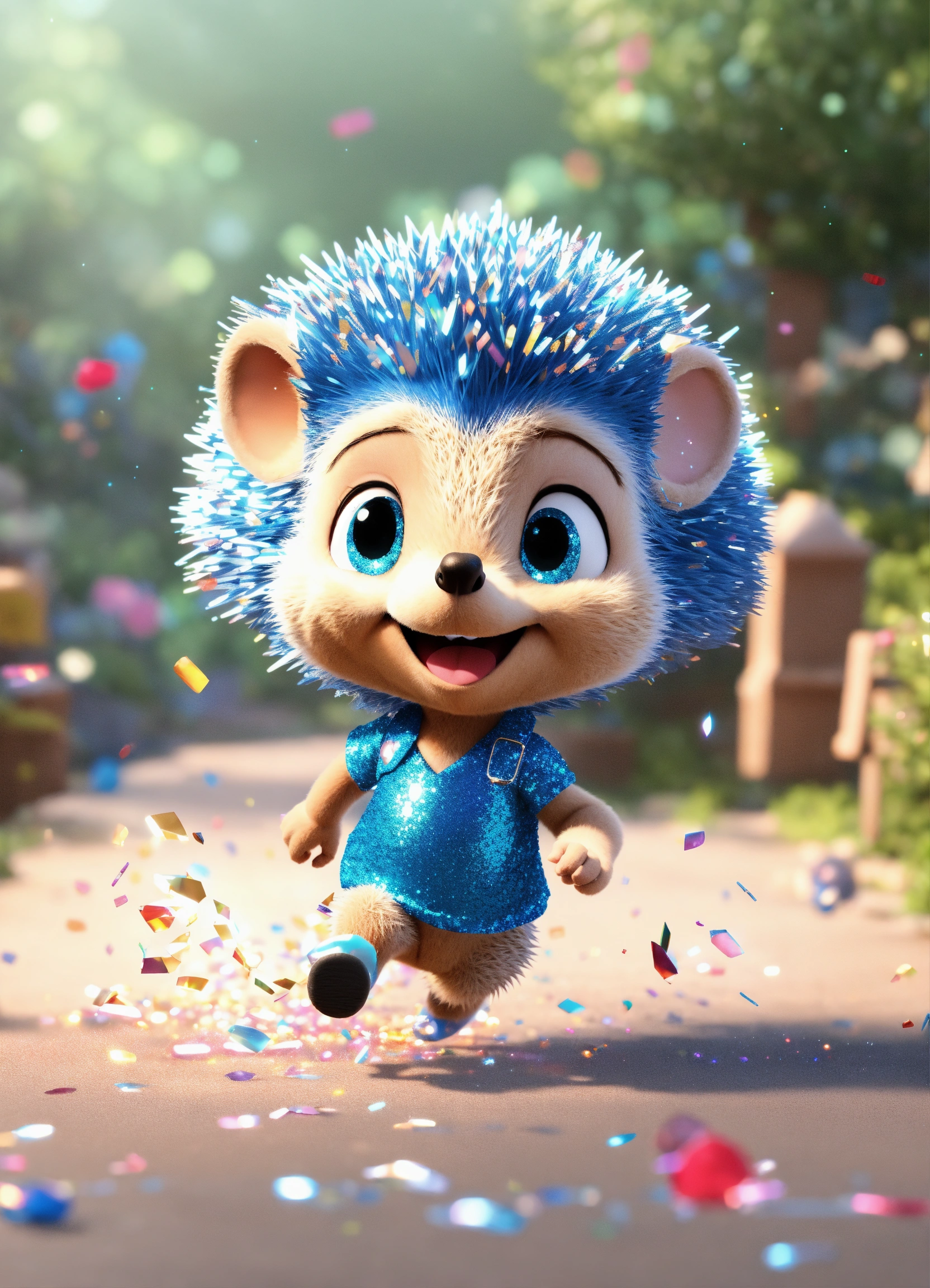 Disney cartoon character, chibi, kind hedgehog glittery running, wearing glitter and smiling, sprinkled with glitter dust, magic glitter, blue blouse, full length, hedgehog running, unreal engine render, 8k, on white background