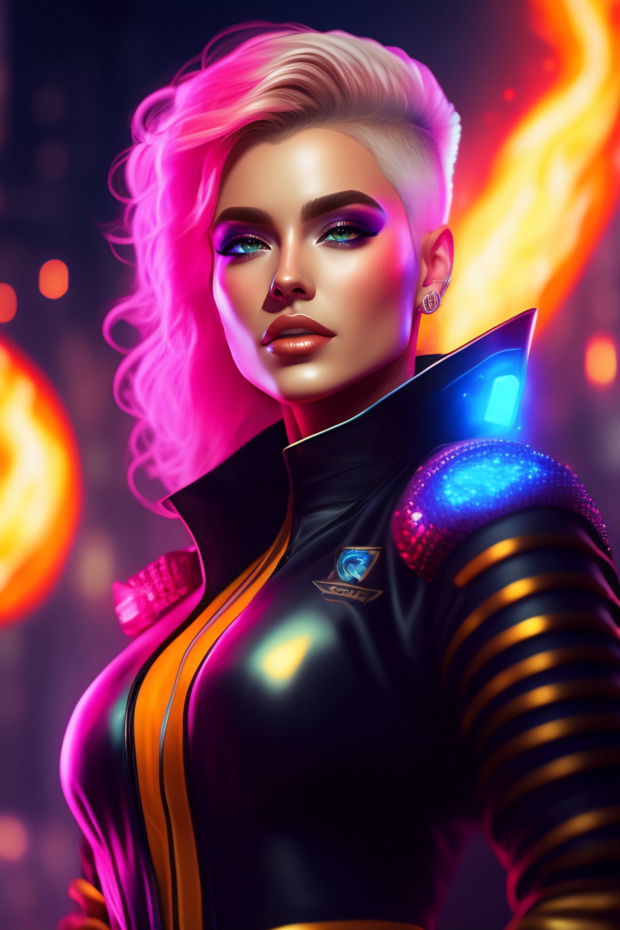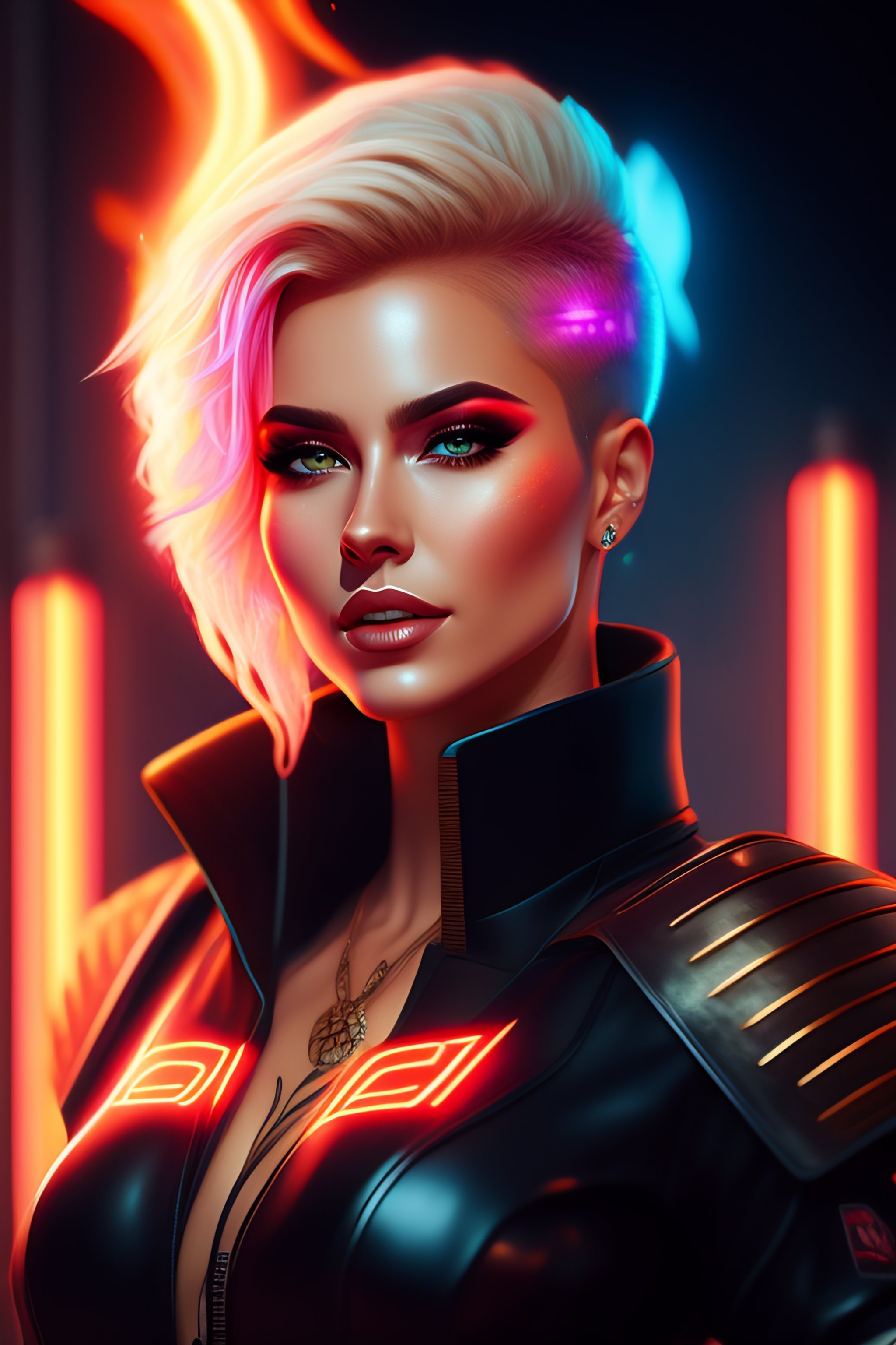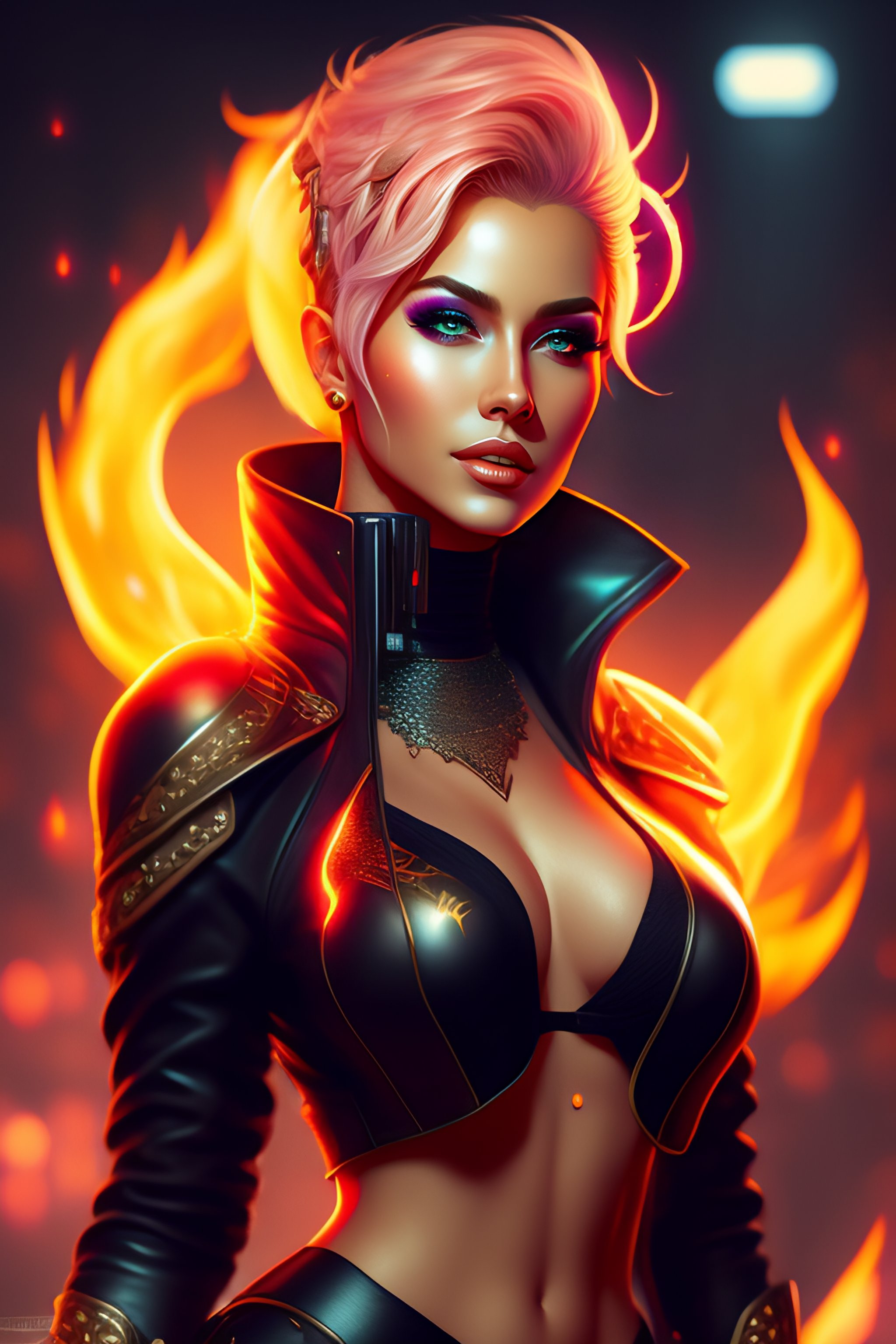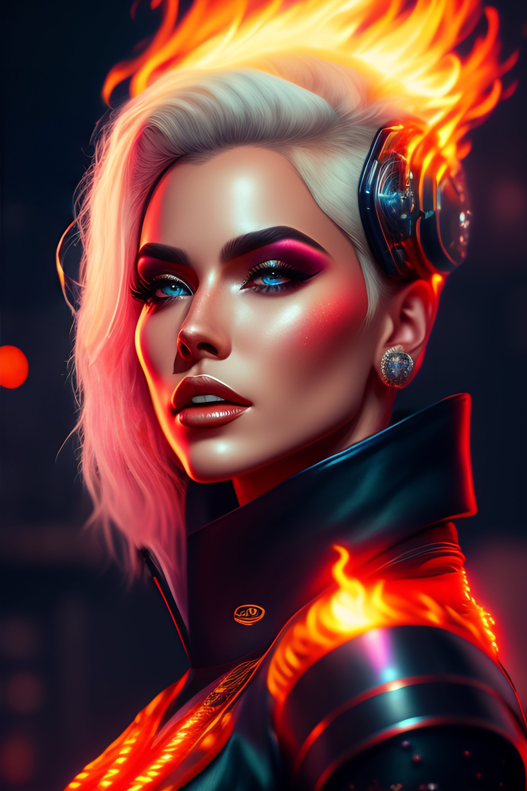 Luiza sonza as a cyberpunk singer with short blond hair, flames in background, full body view. 8 k resolution, hyper detailed, d & d, character design, digital painting, trending on artstation, sharp focus, illustration, art by artgerm, viktoria gavrilenko, steve zheng, terry rogers