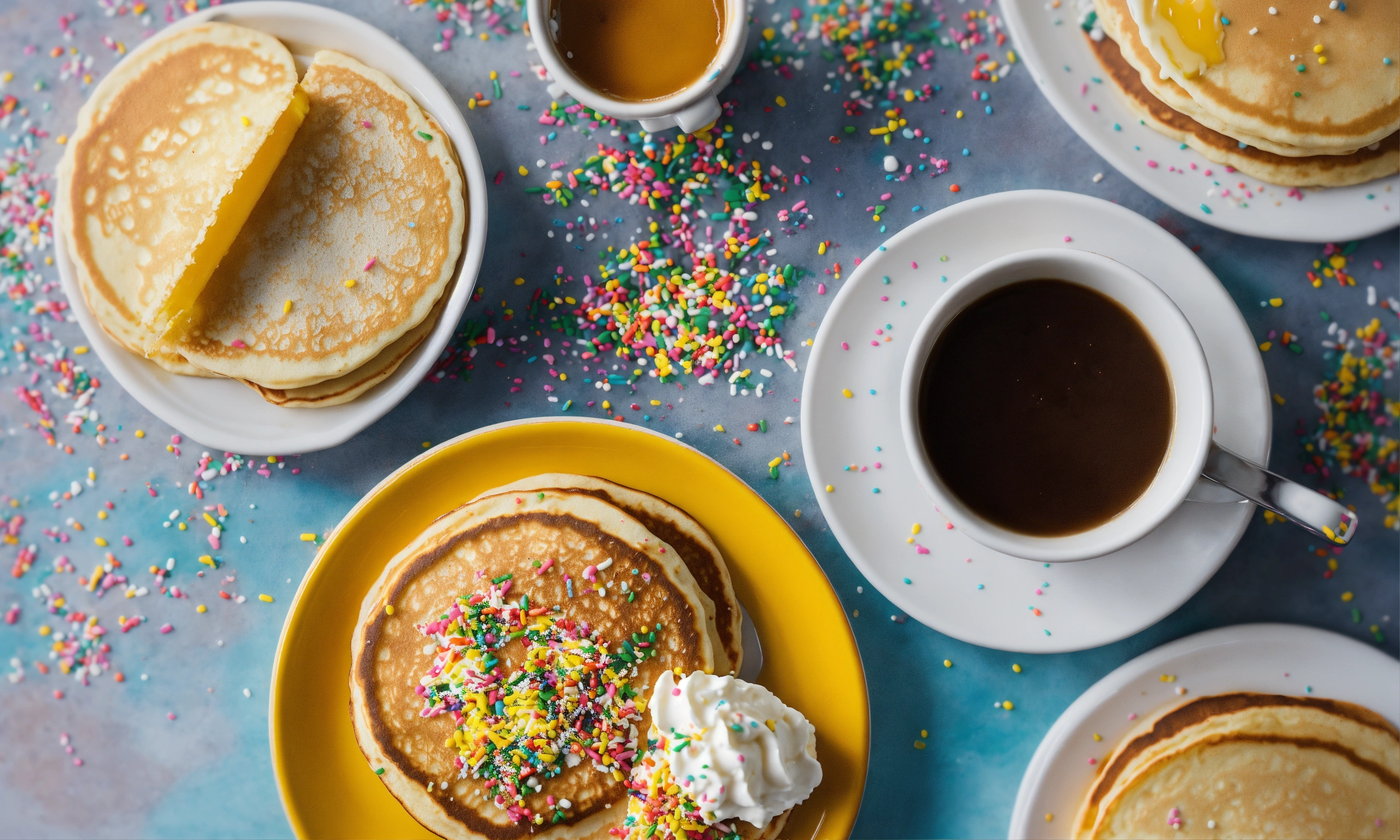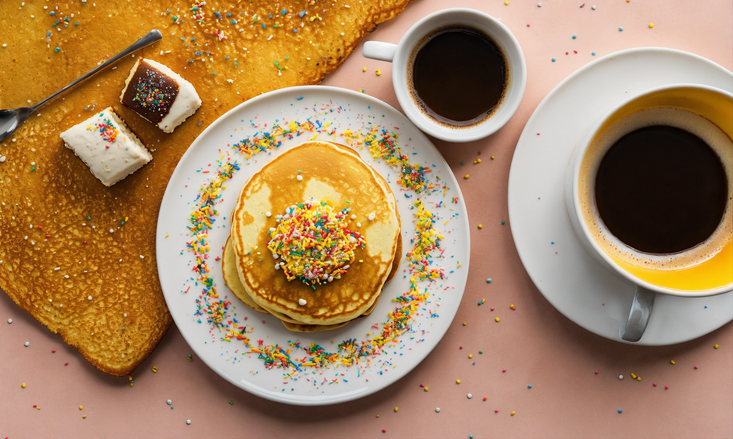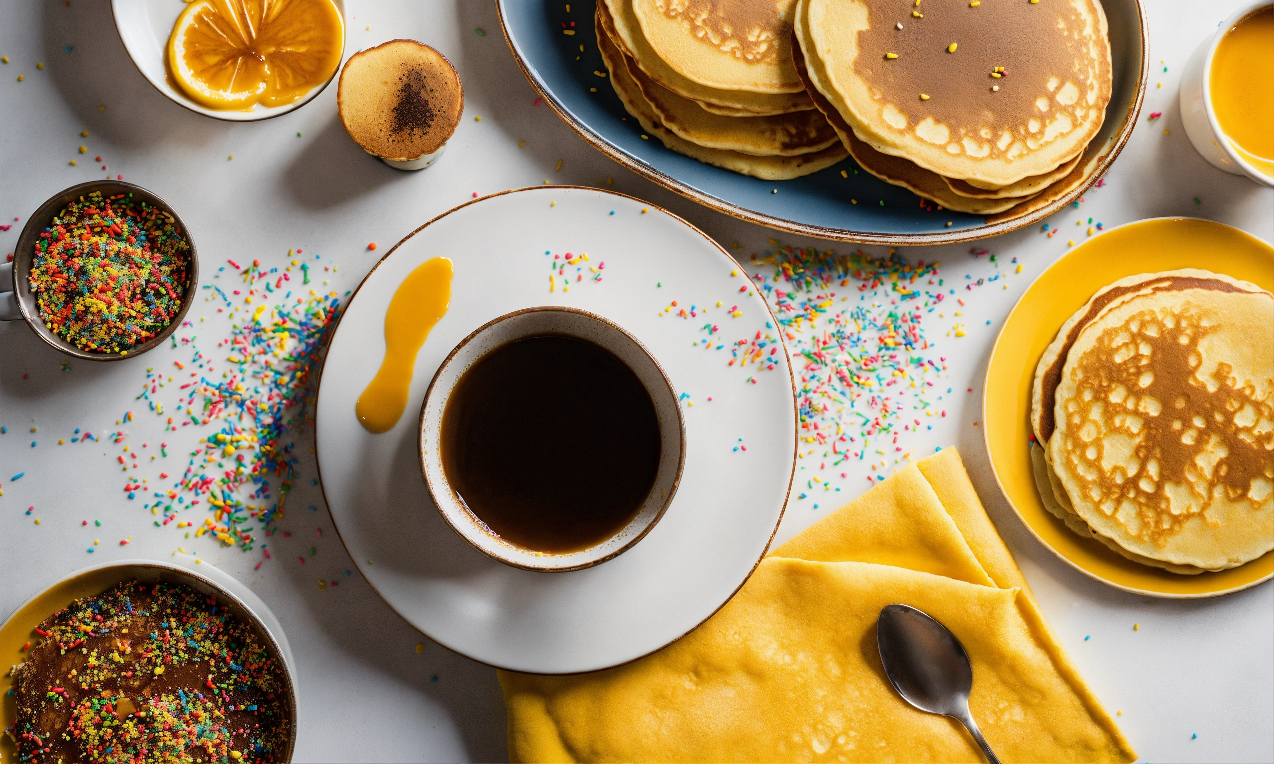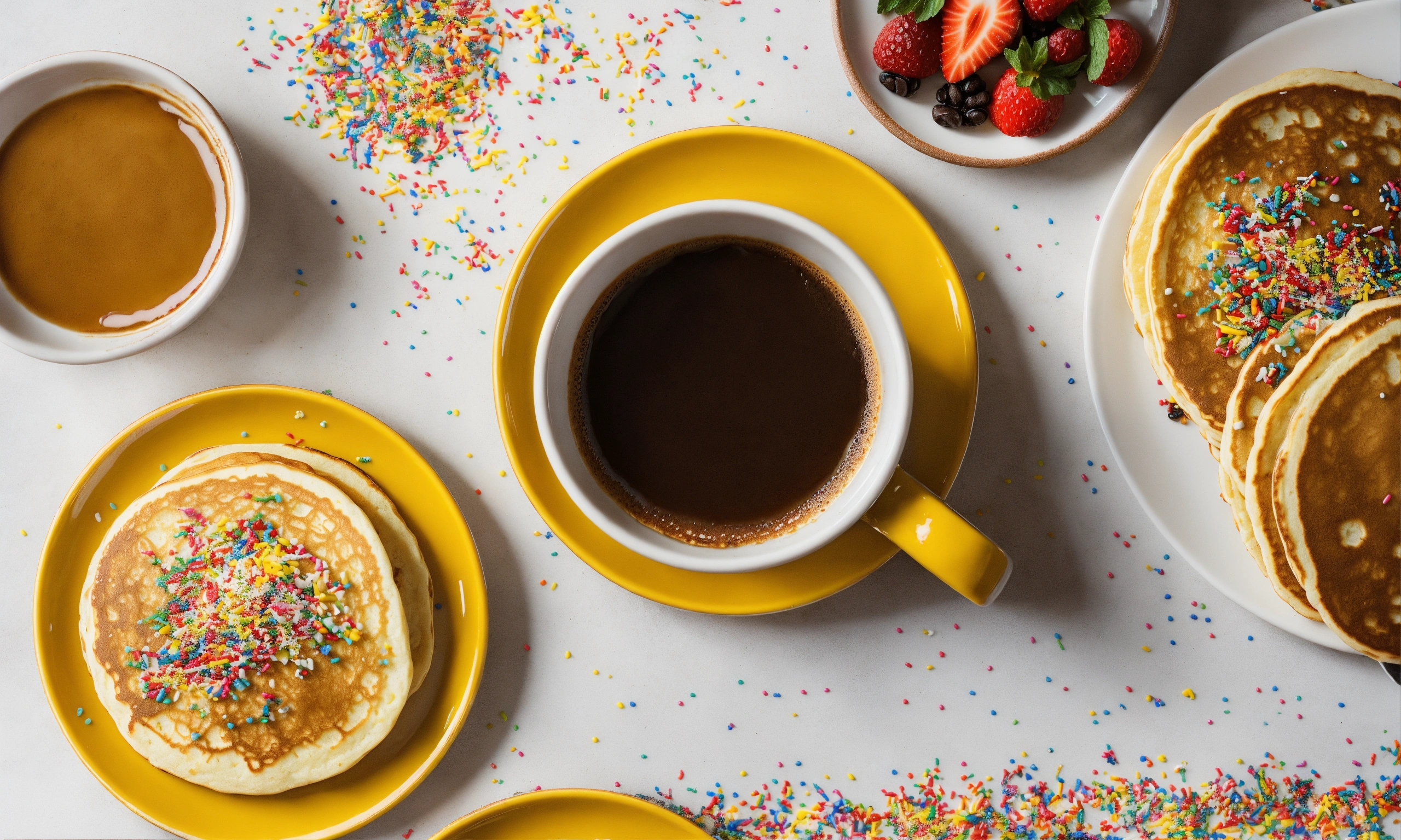 Top view of a white kitchen table, on which there is a small yellow plate with pancakes, and next to it is a cup of coffee. the drink is decorated with sprinkles in the shape of the inscription iek