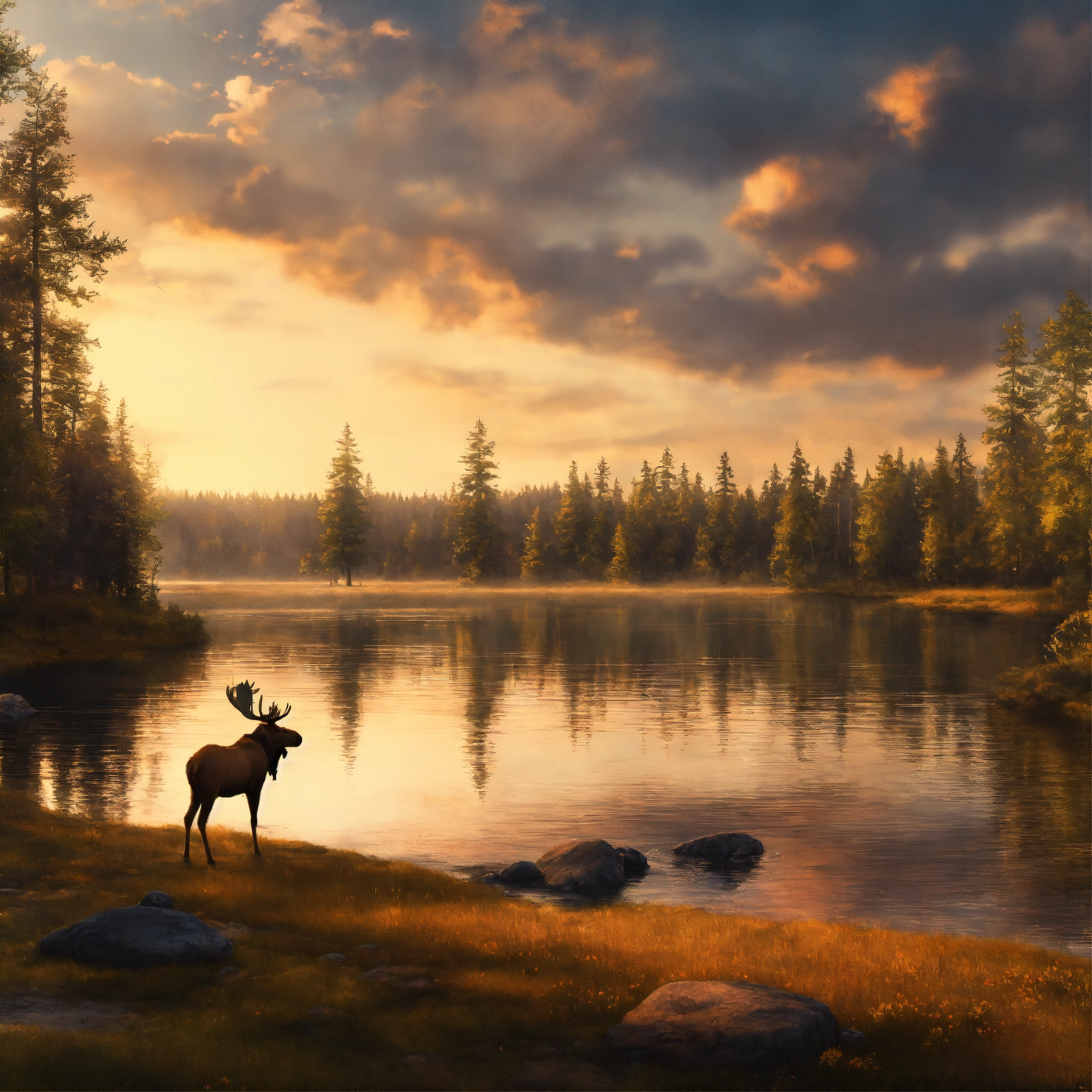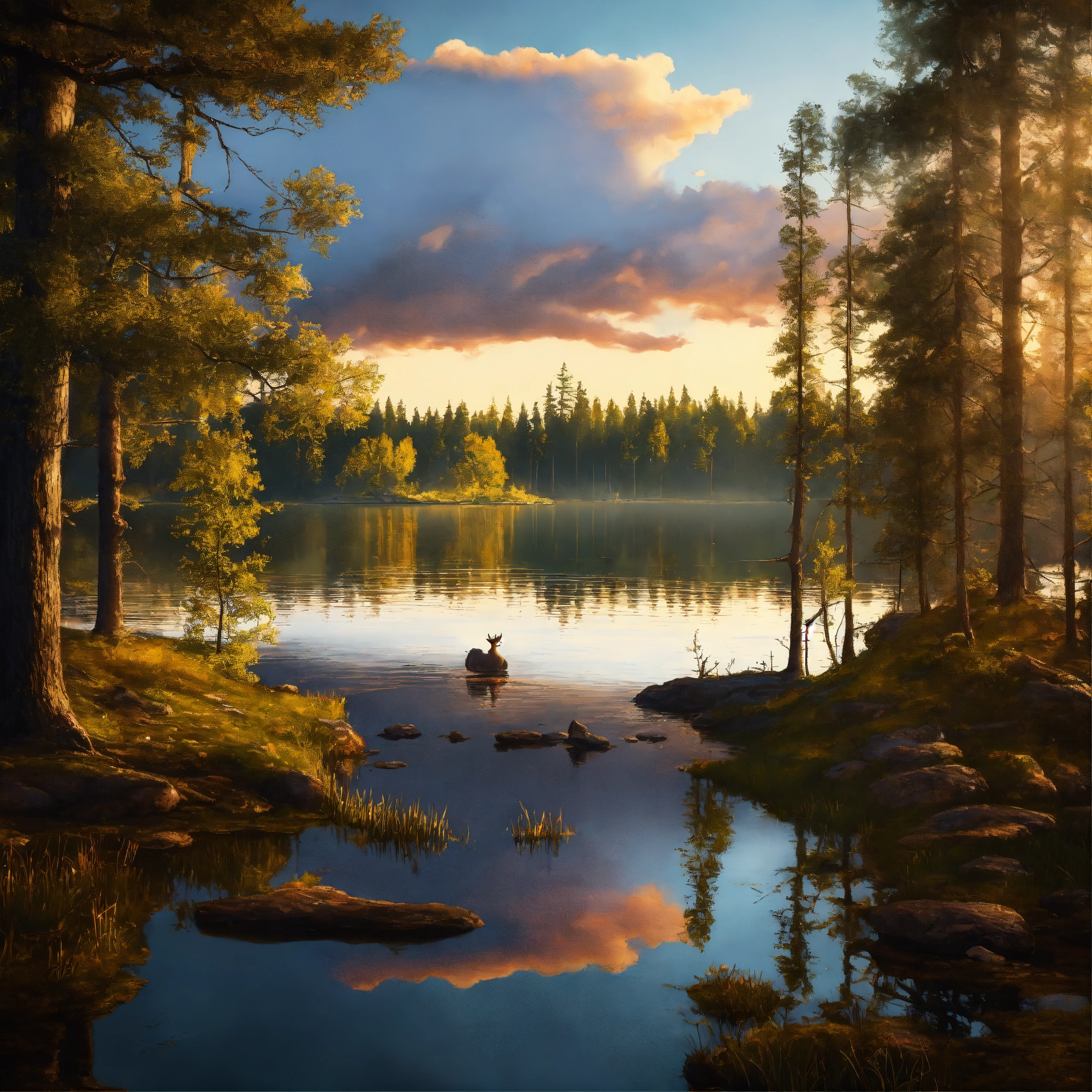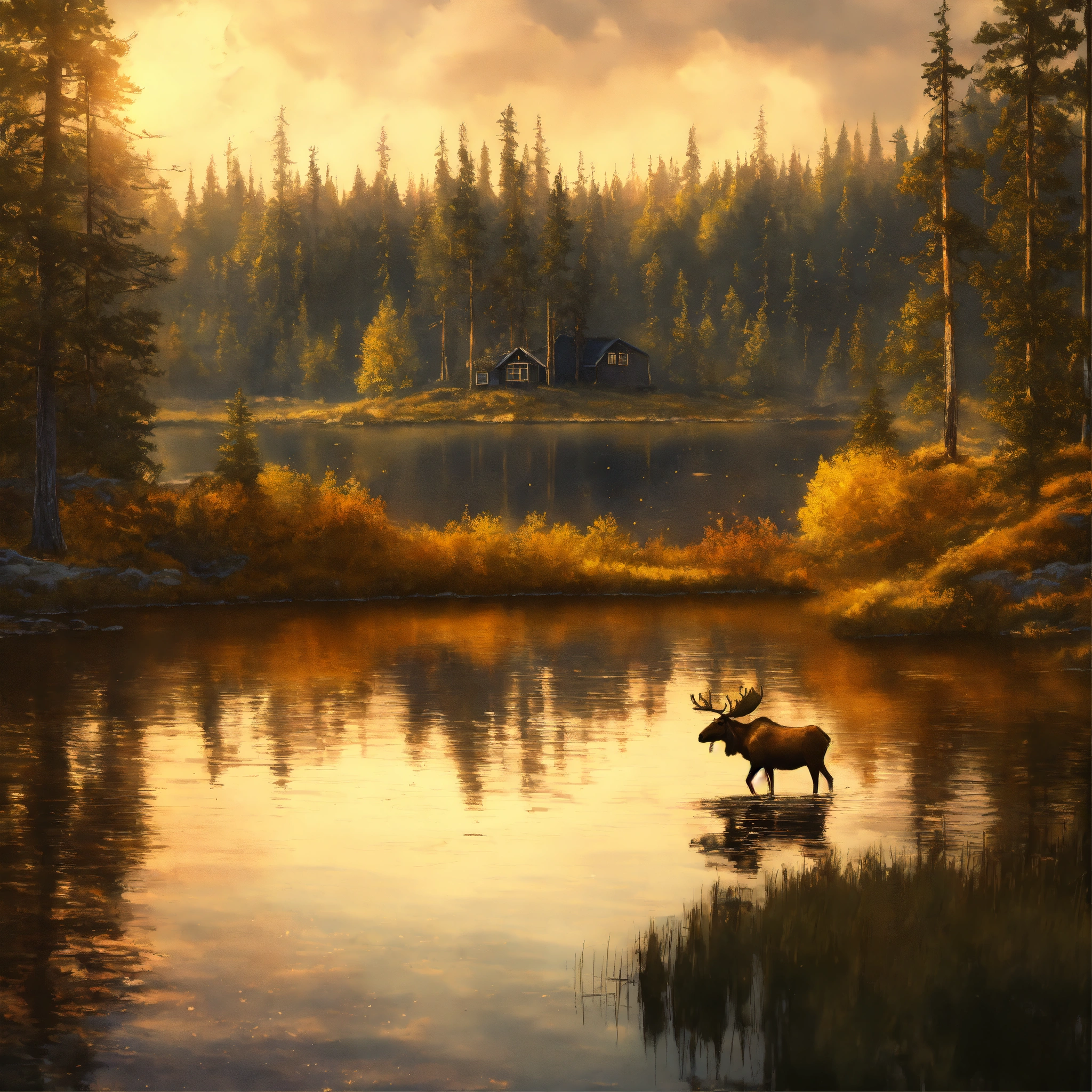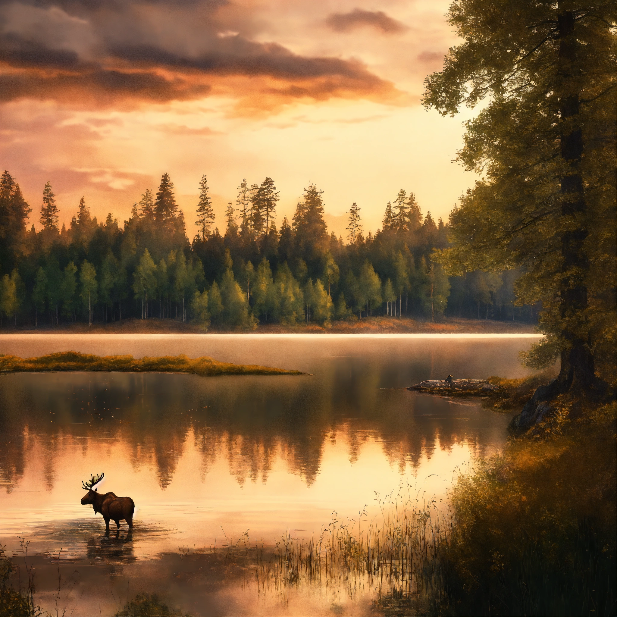 Epic shot of sweden, ultra detailed lake with am moose, nostalgic vintage, ultra cozy and inviting, wonderful light atmosphere, fairy, little photorealistic, digital painting, sharp focus, ultra cozy and inviting, wish to be there. very detailed, arty, should rank high on youtube for a dream trip.