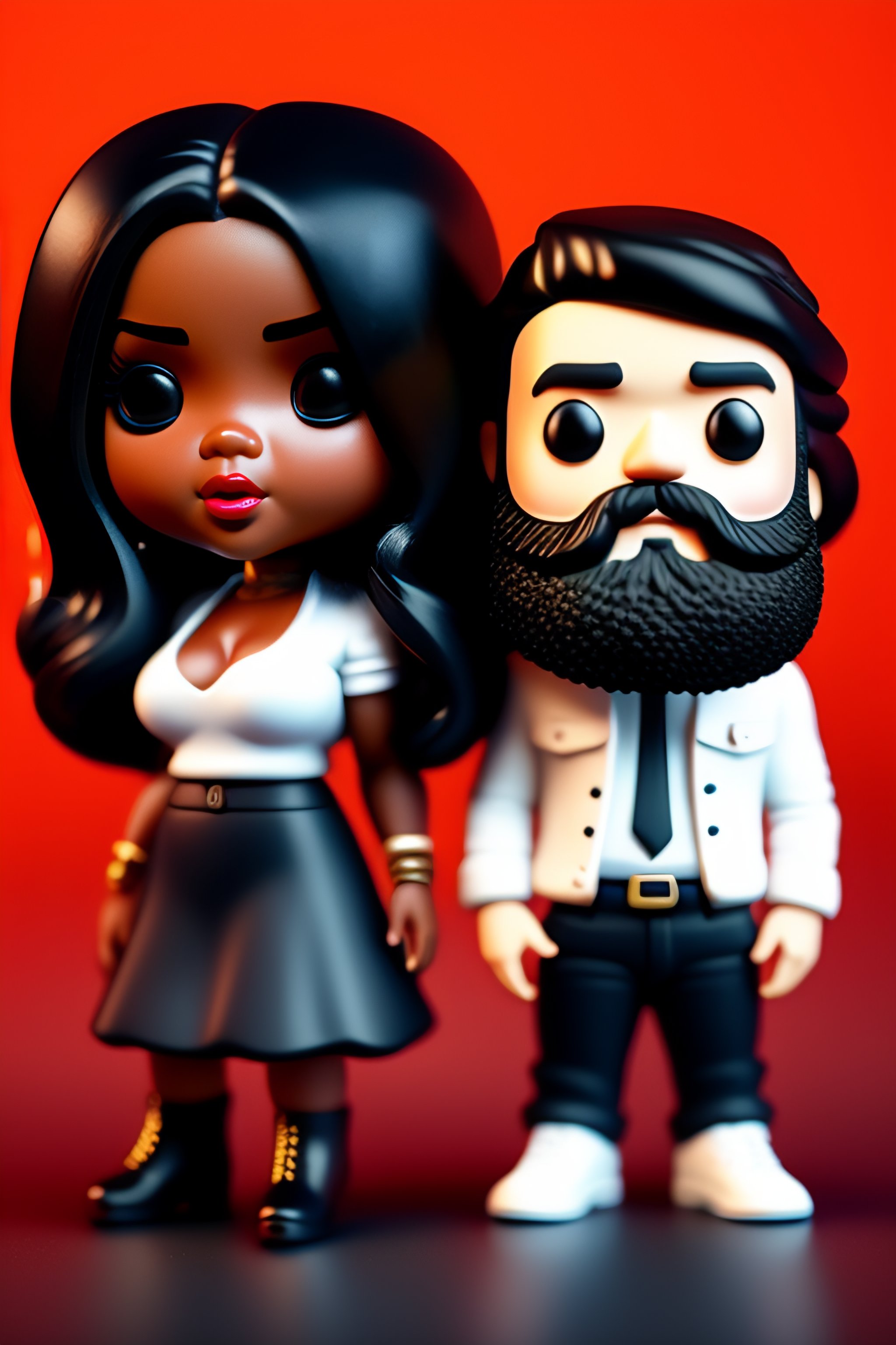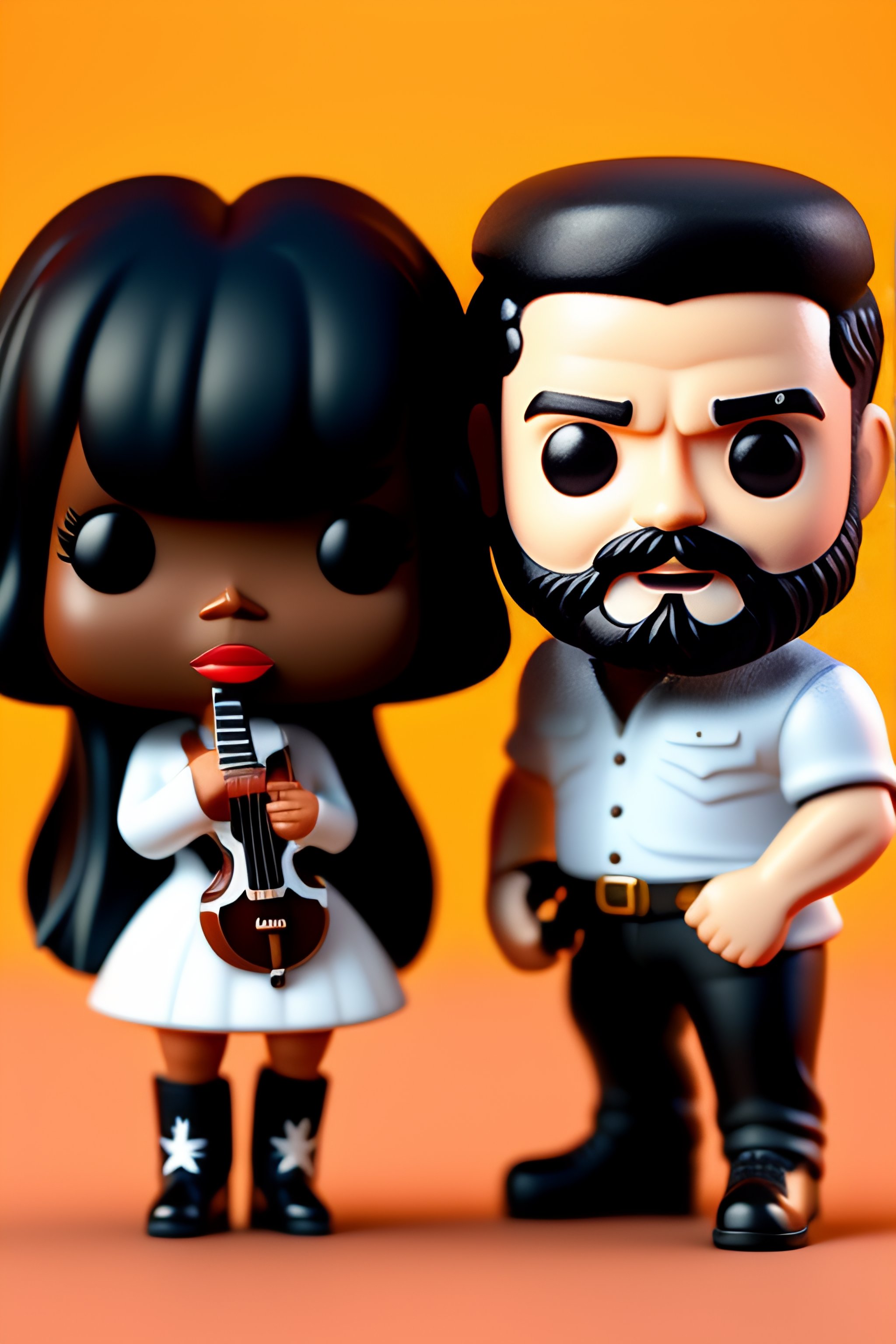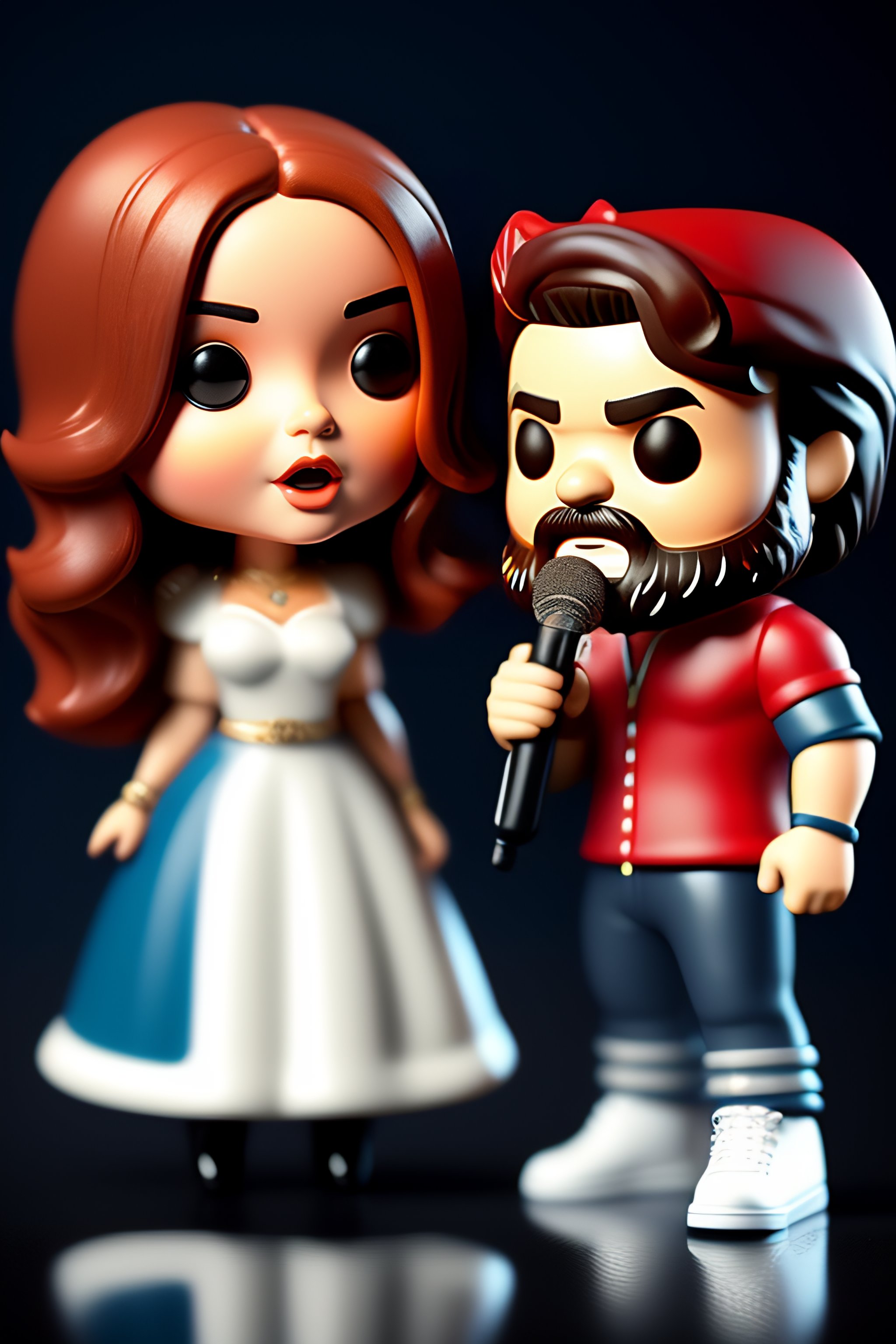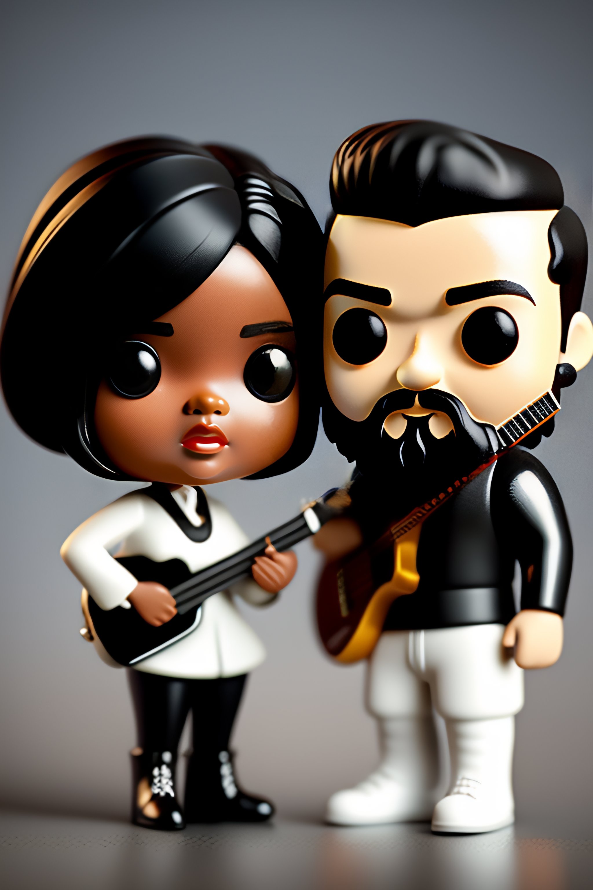 3d render of two funko pop, one is a white boy with dark hair and a beard playing guitar, the other is a white woman with black hair singing with a microphone.