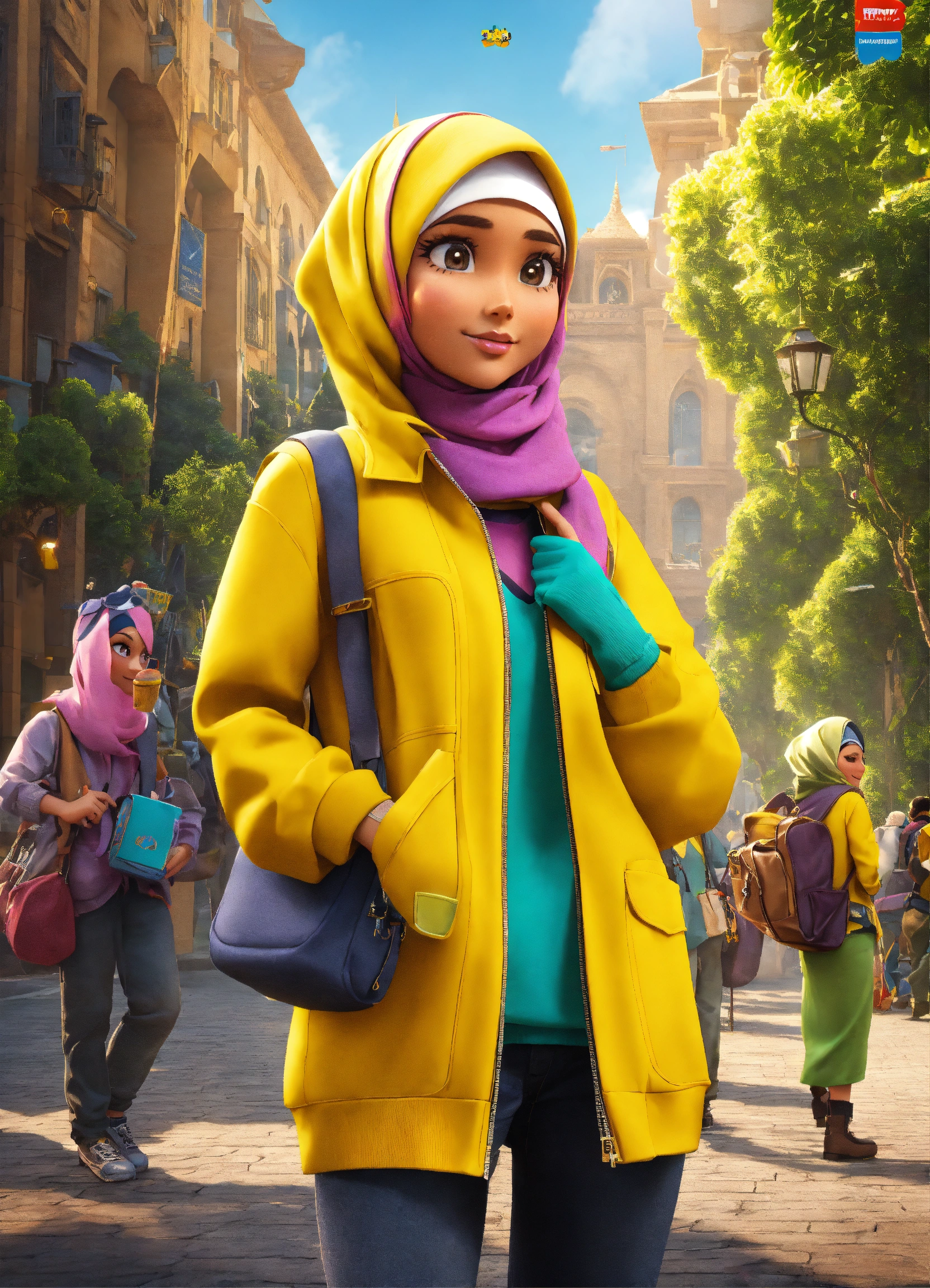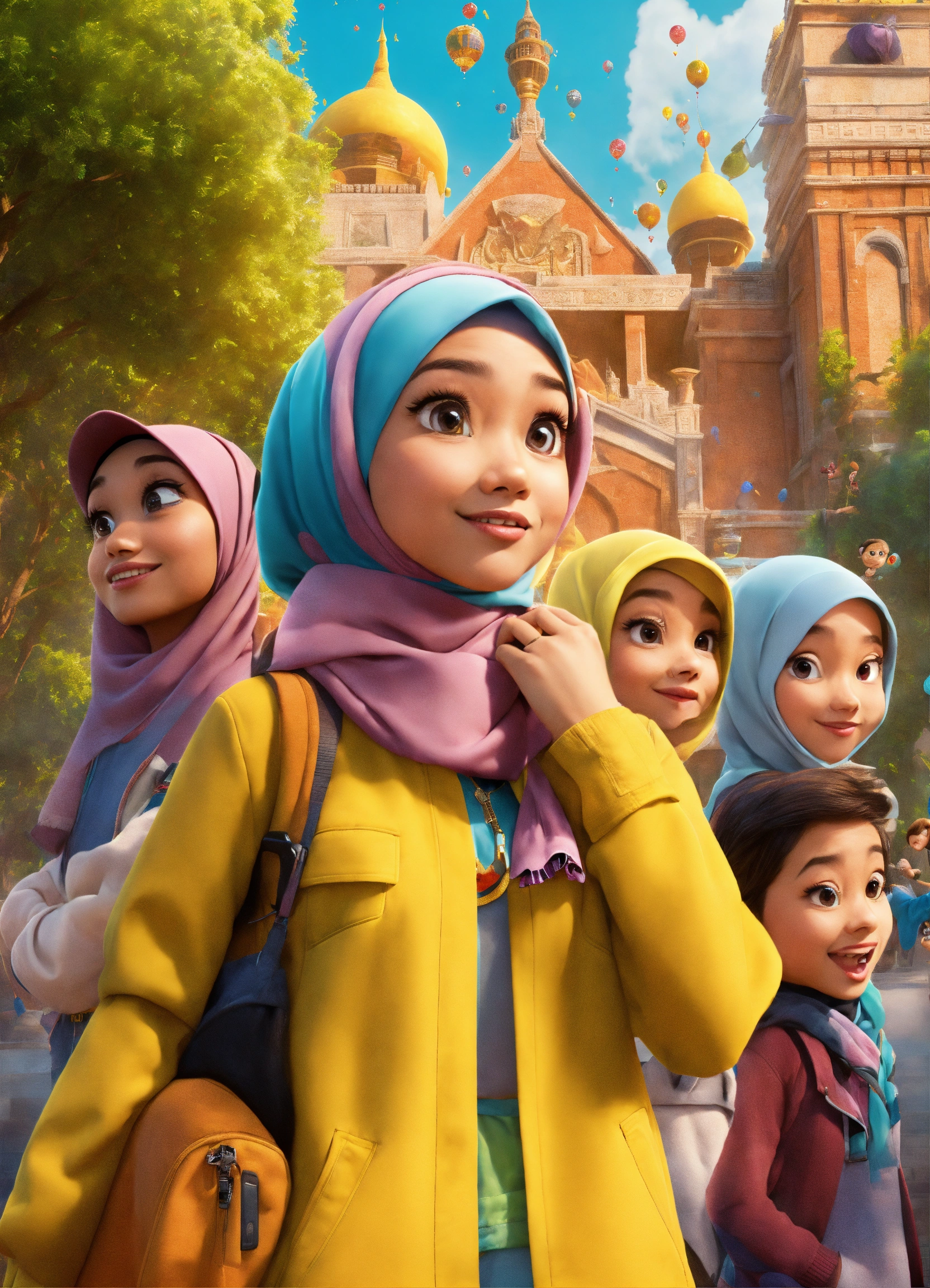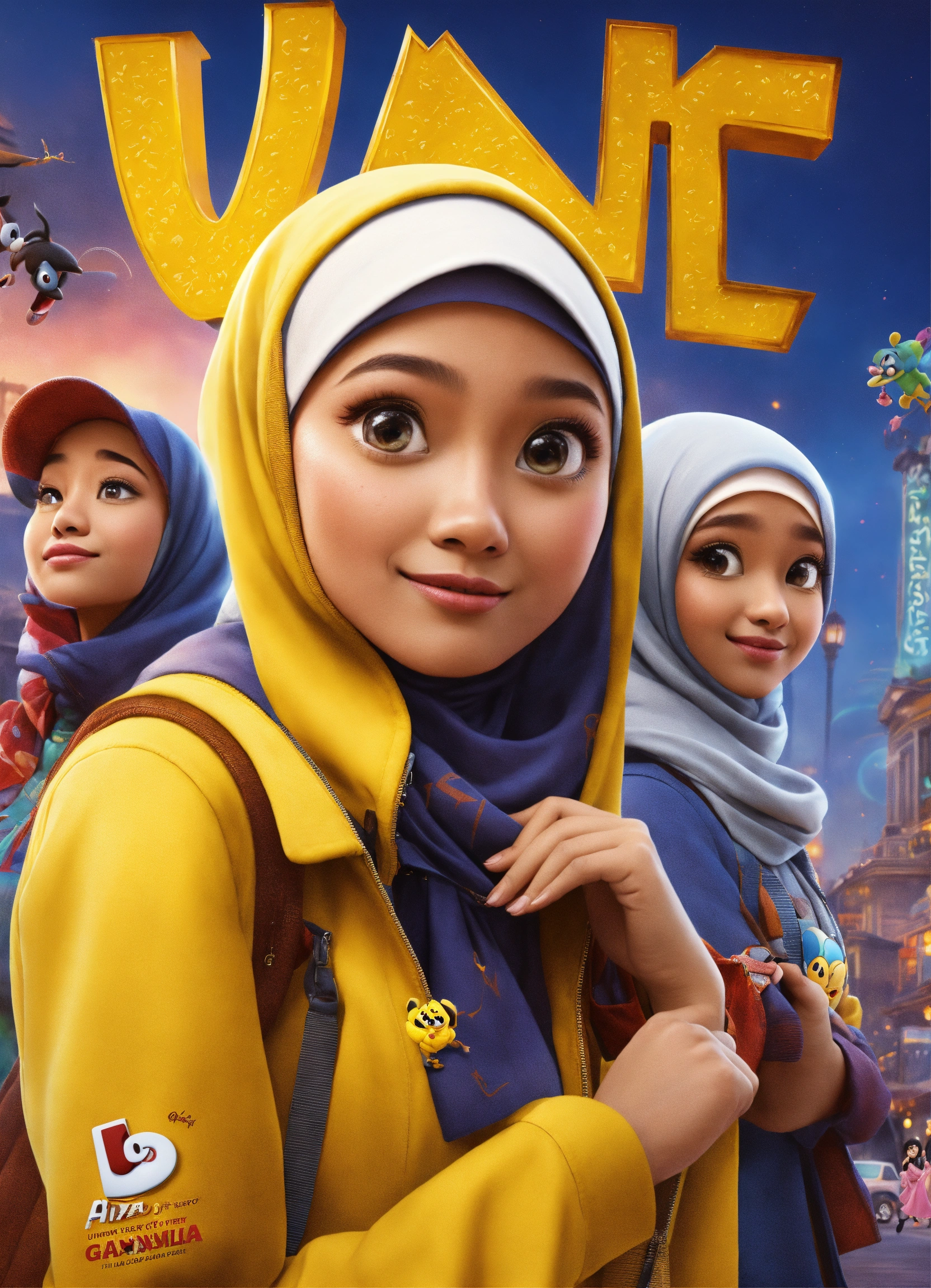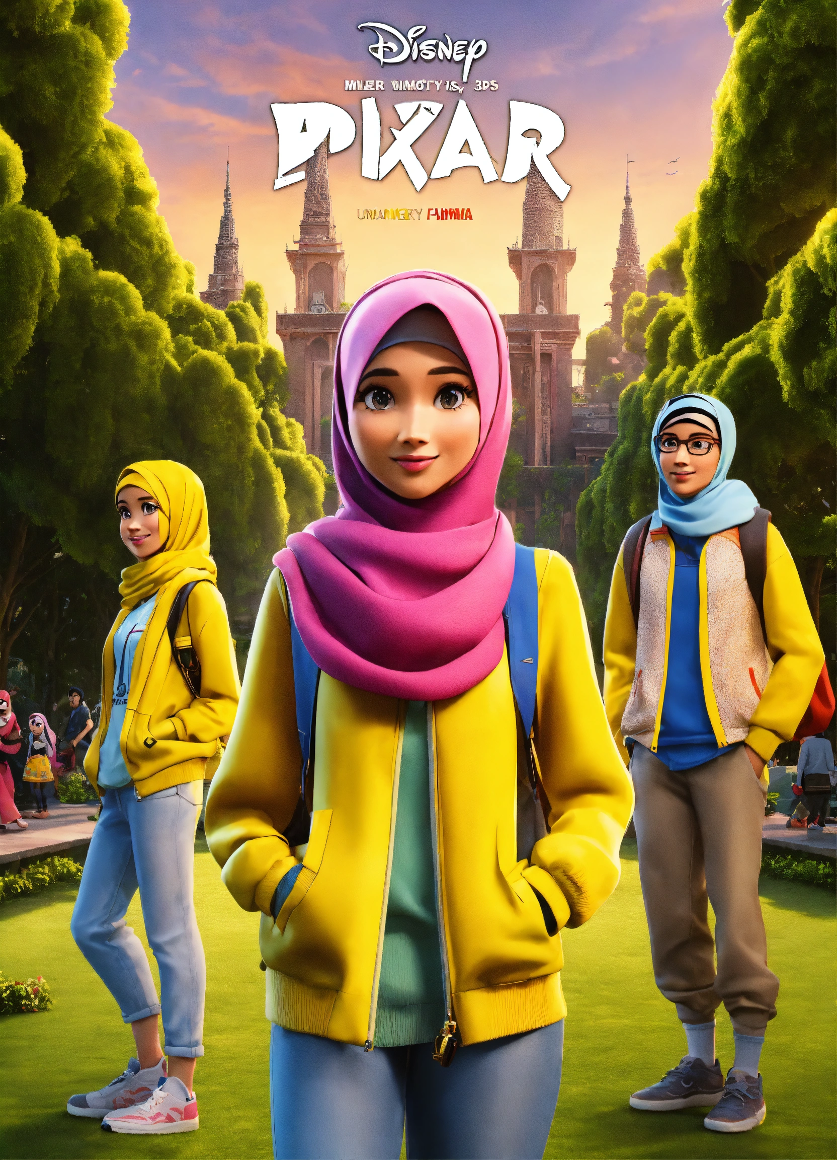 Disney pixar film poster, university, gang of friends with yellow almamater jacket, woman wearing hijab, city, indonesia, 3d, cartoon