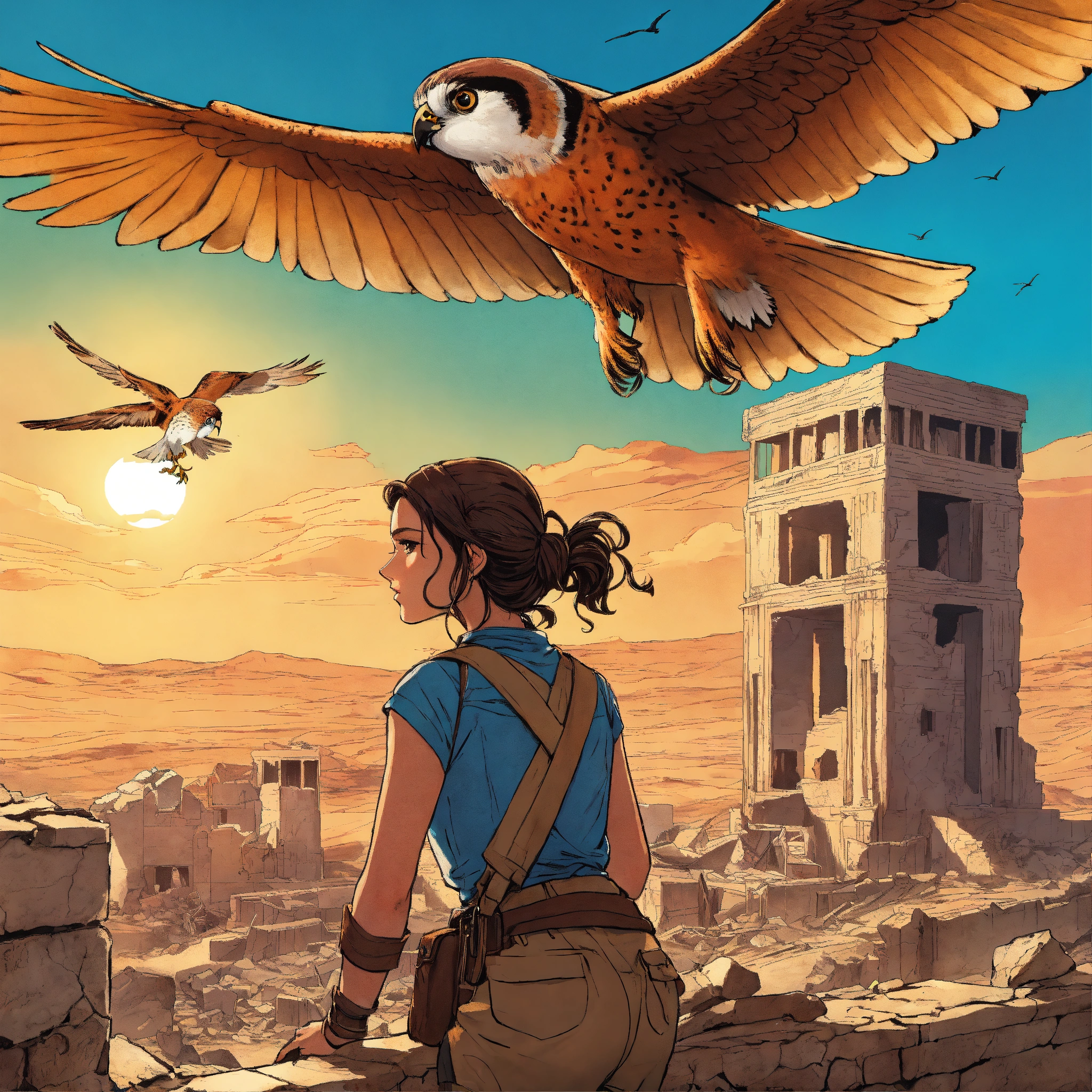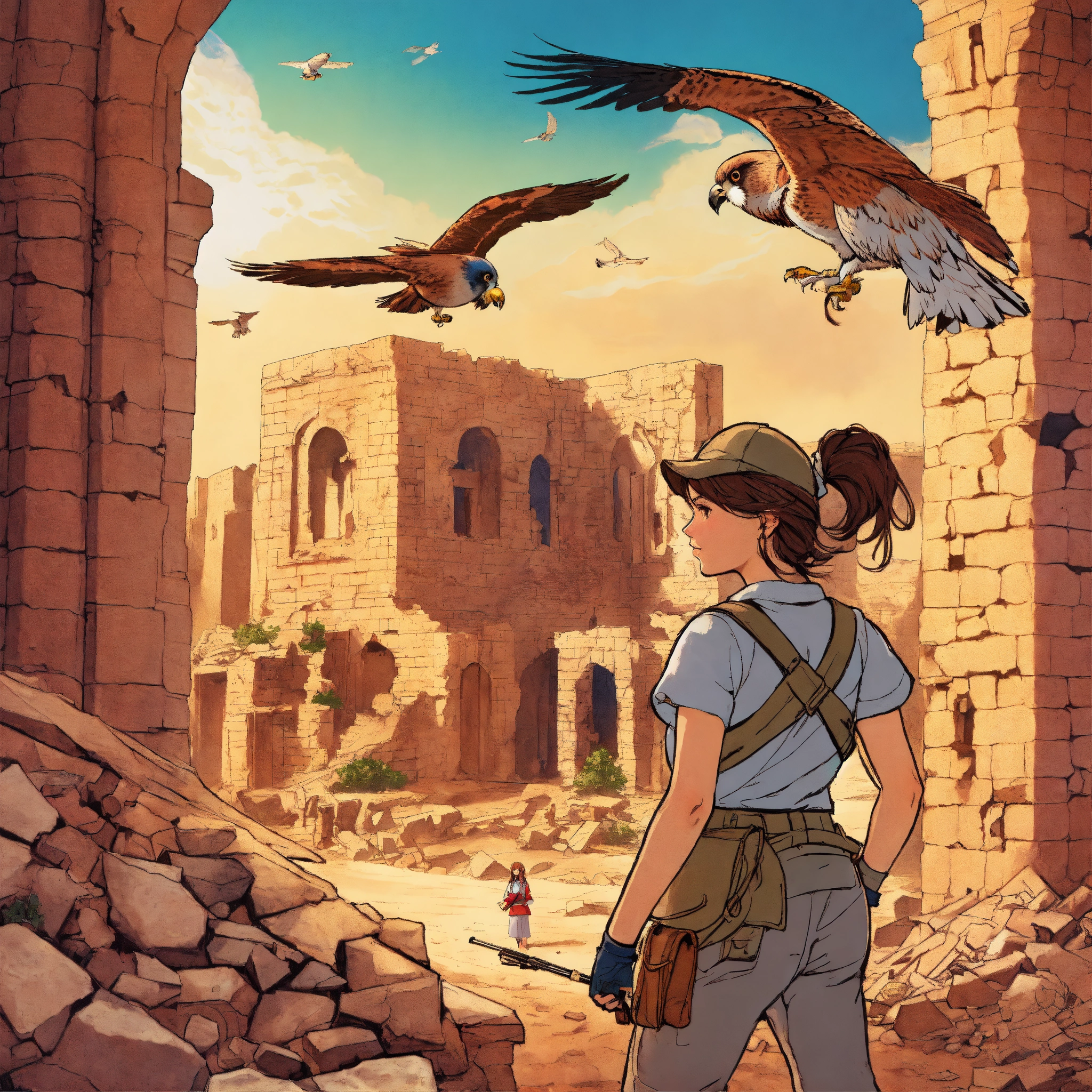 Textless 80s artwork poster of a caucasian female archeologist investigating ruins of irak while two kestrels fly above, romantic manga style