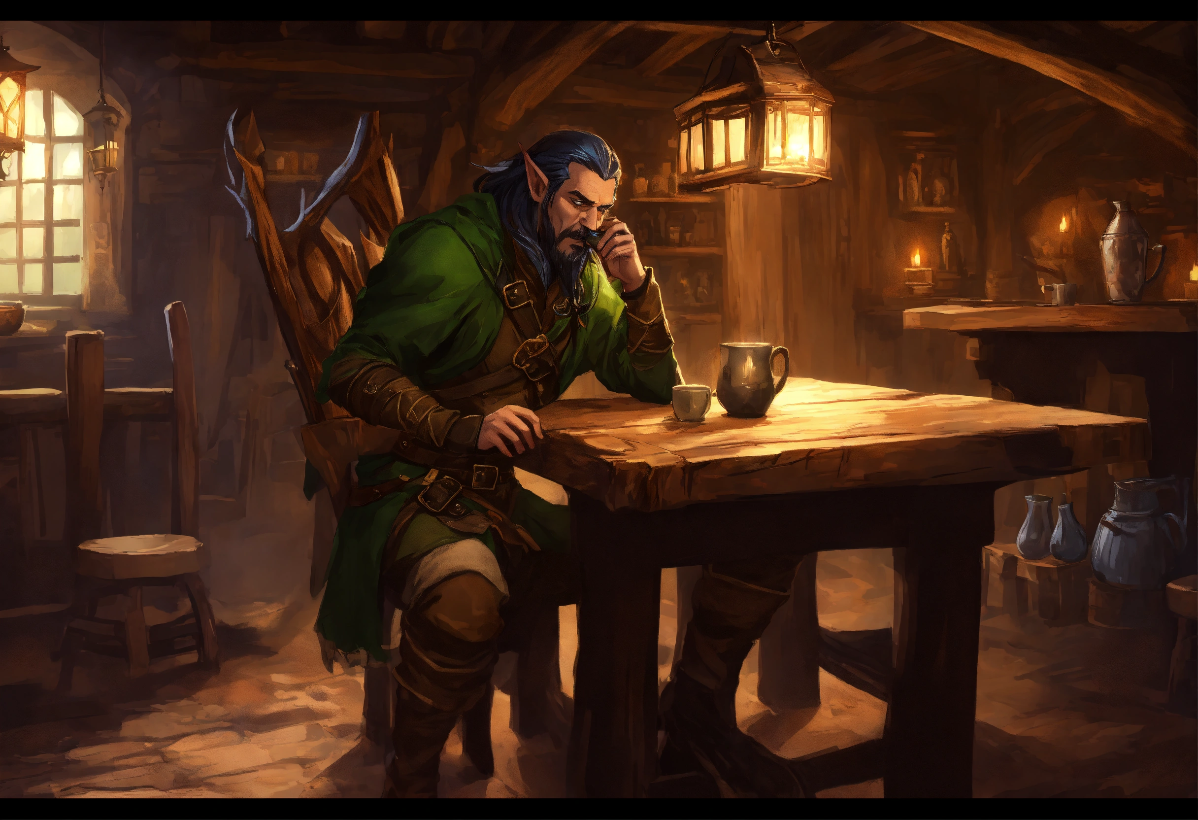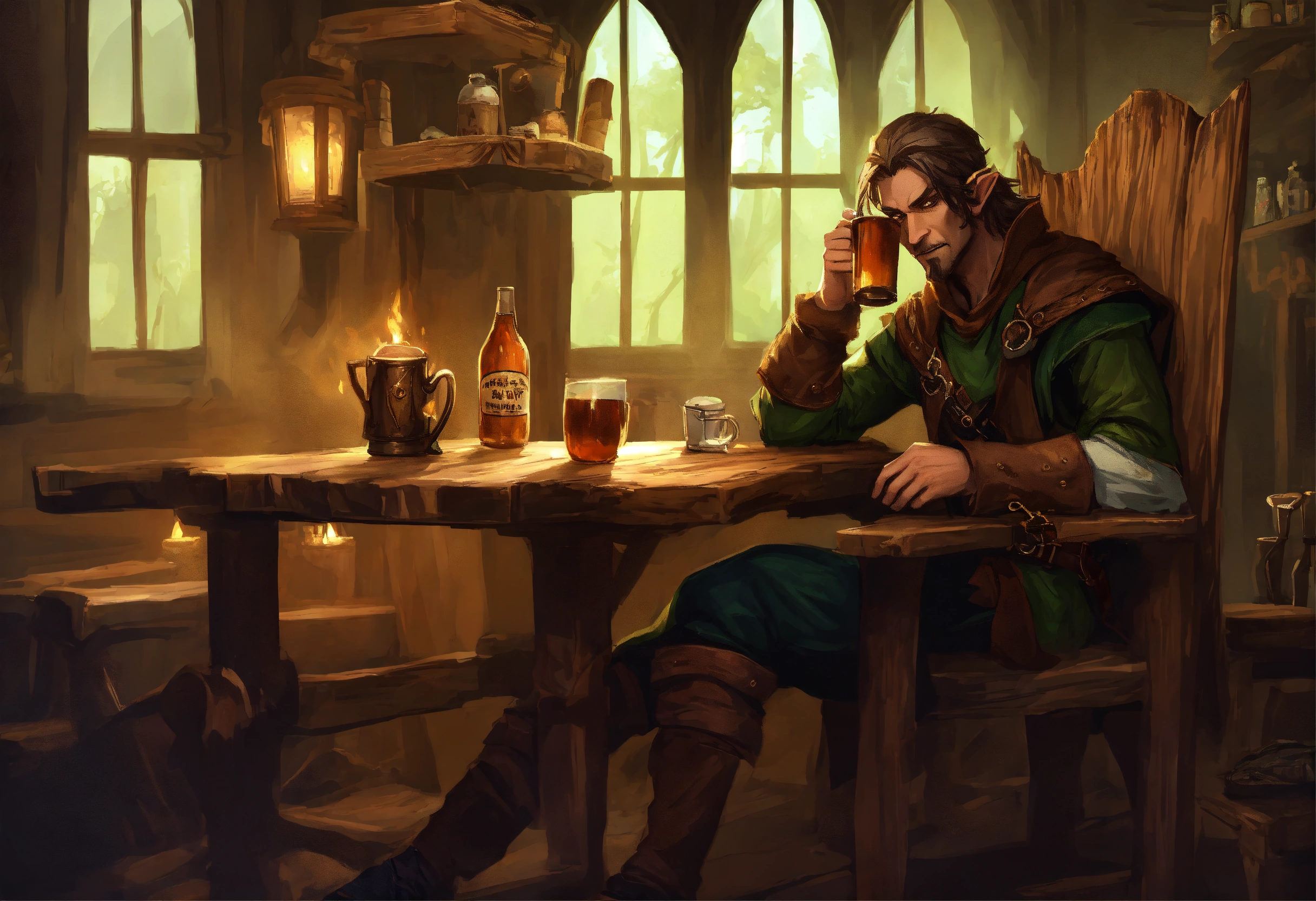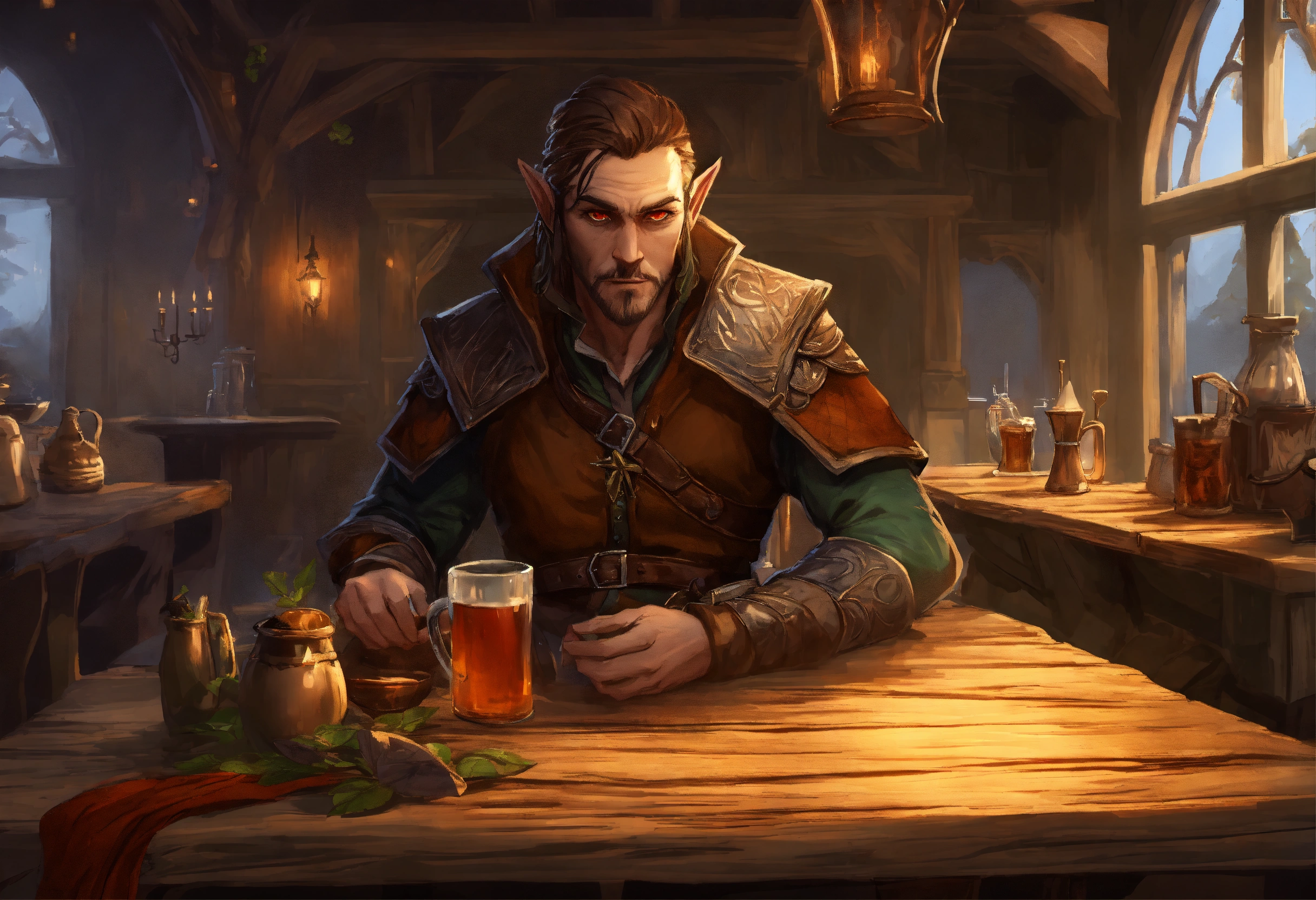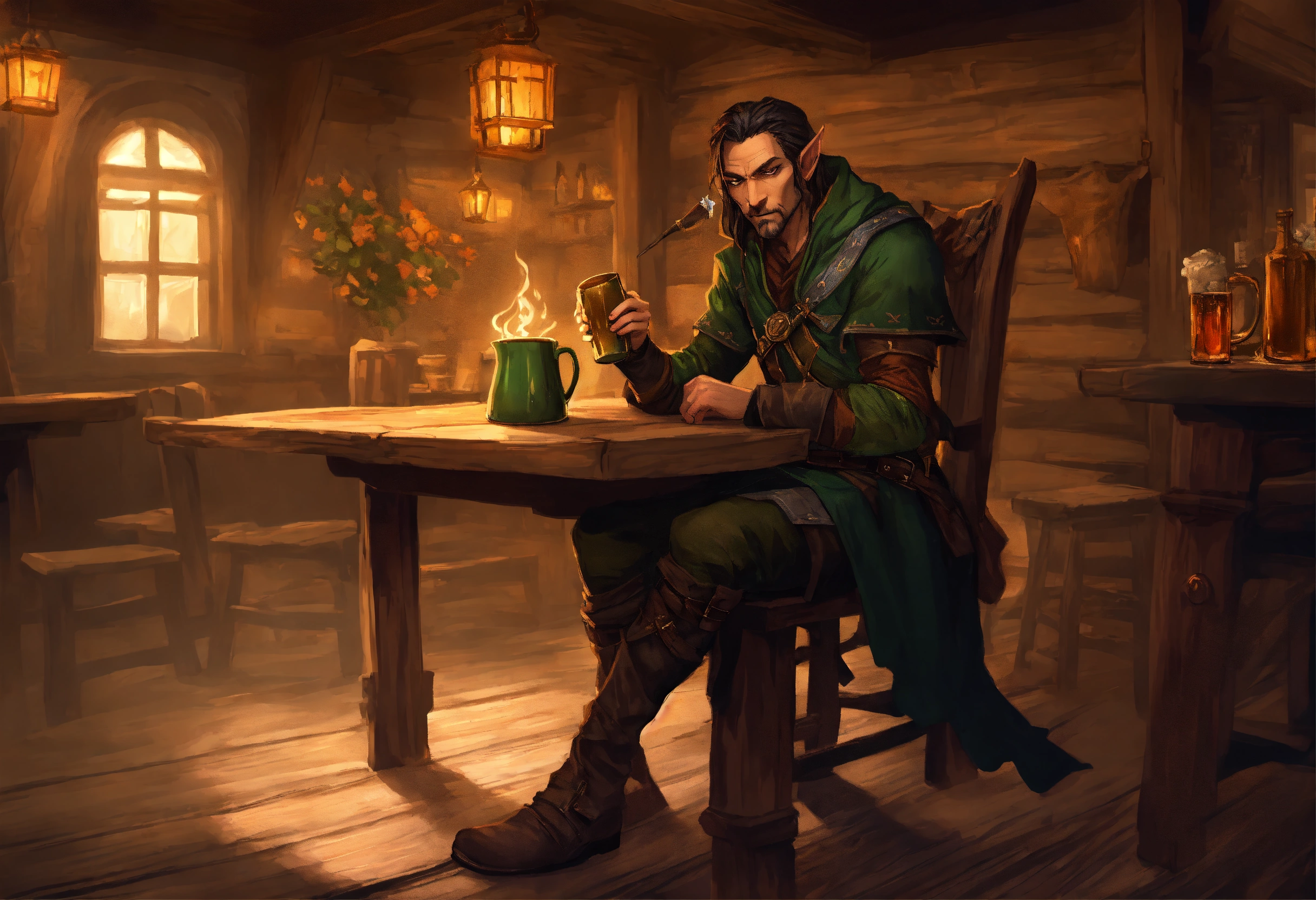 Fantasy tavern with a sinister-looking wood-elf rogue, sitting at a table, with his feet up on a chair, drinking from a wooden mug, digital art
