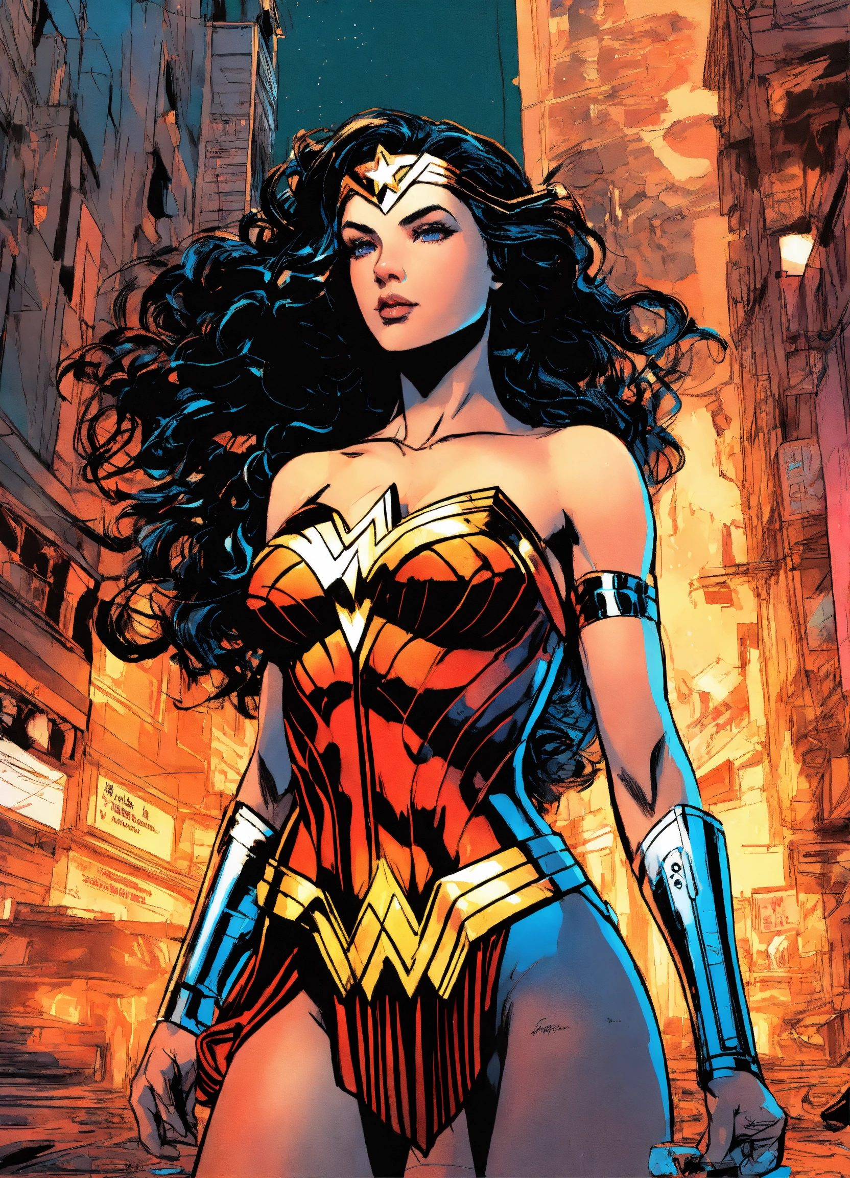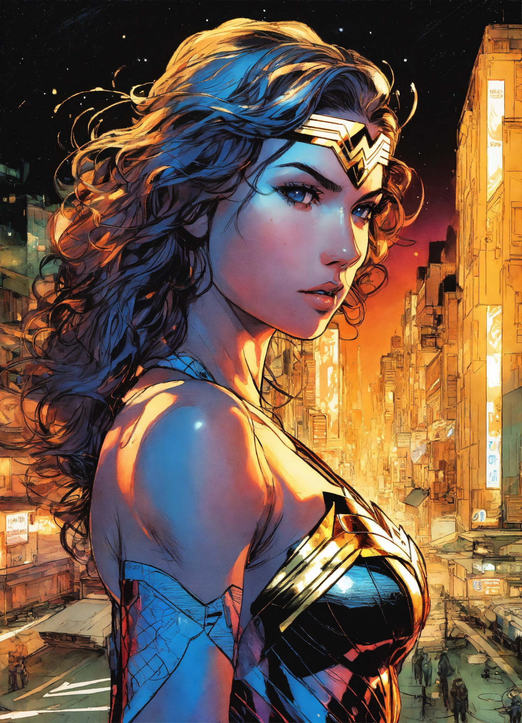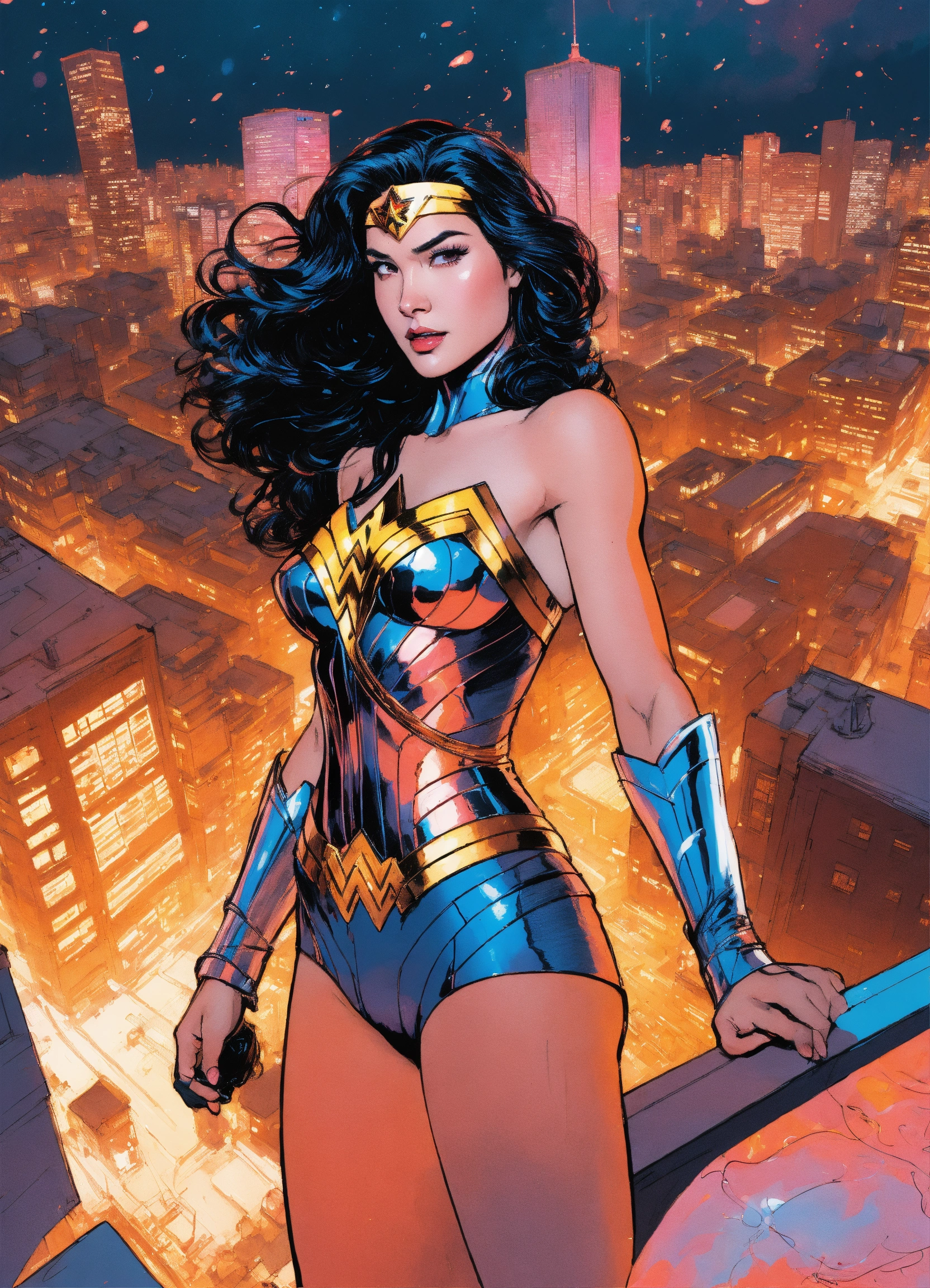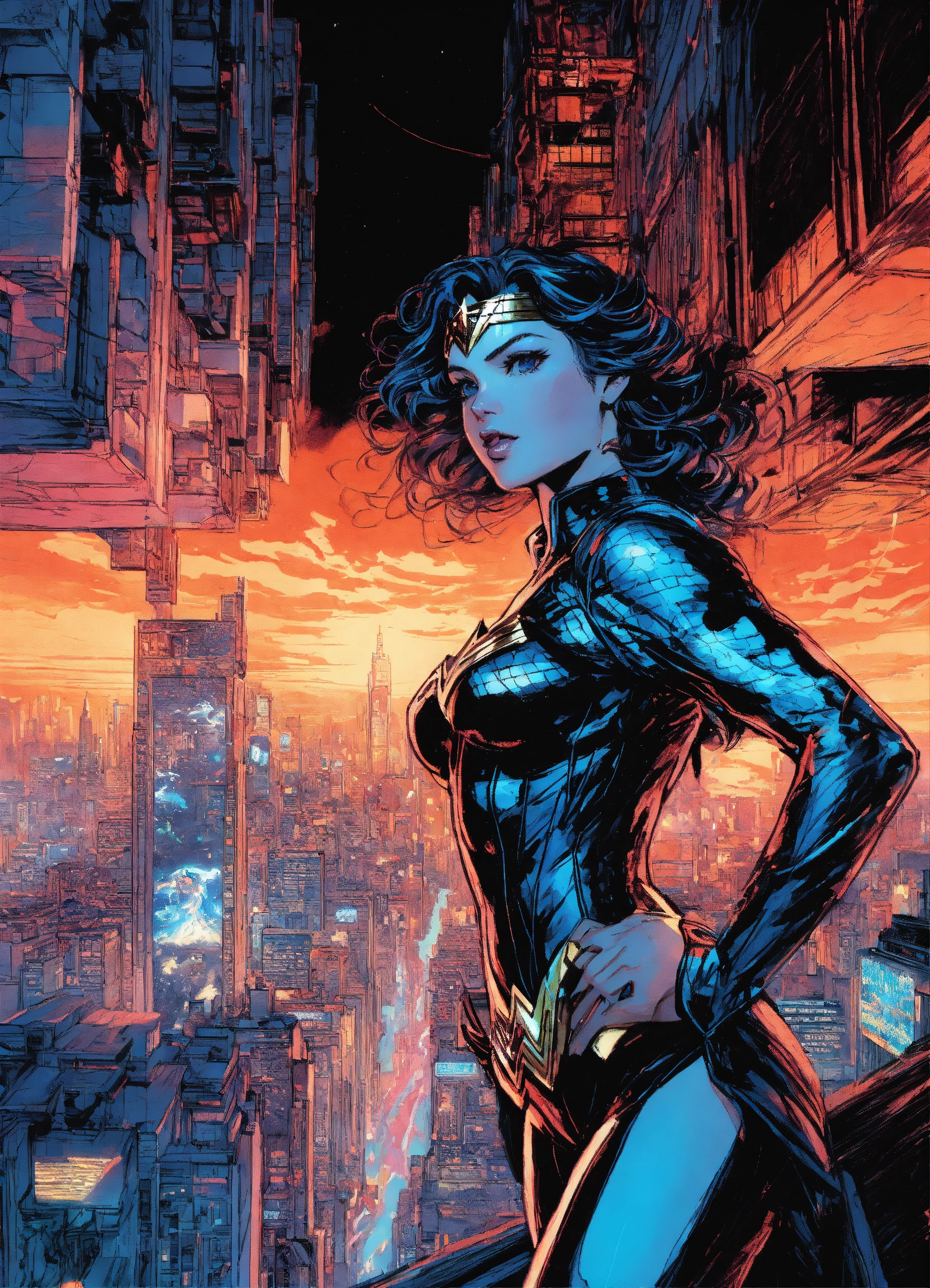 Hajime sorayama, greg tocchini, virgil finlay, sci-fi, high angle shot, digital ink sketch art, wonder woman, nightmarish illustration costume, swirling vortex behind her, urban cityscape environmental wise shot by hajime sorayama, greg tocchini, virgil finlay, sci-fi, colors, neon lights. line art. contemporary art, dry-erase marker --ar 916 --v5.1