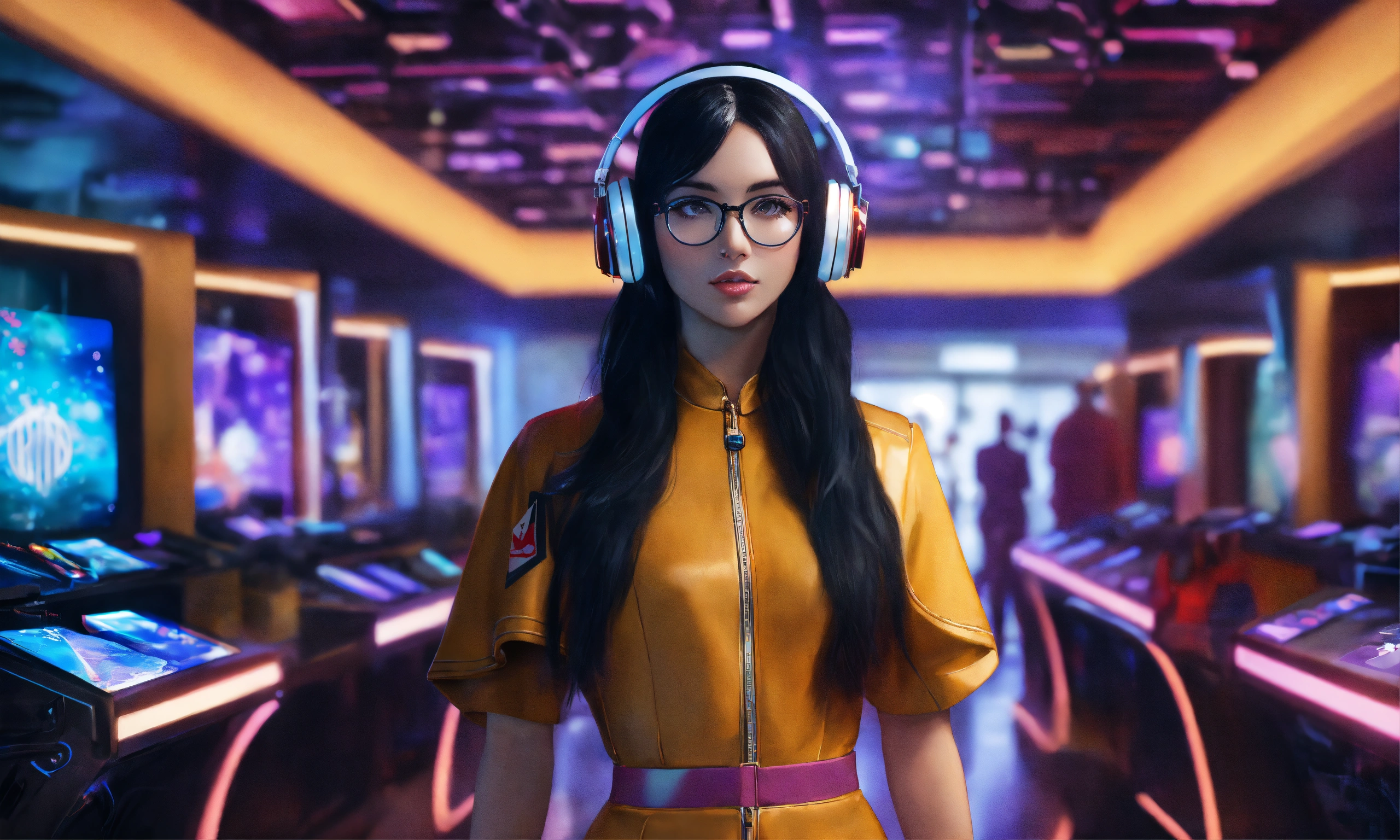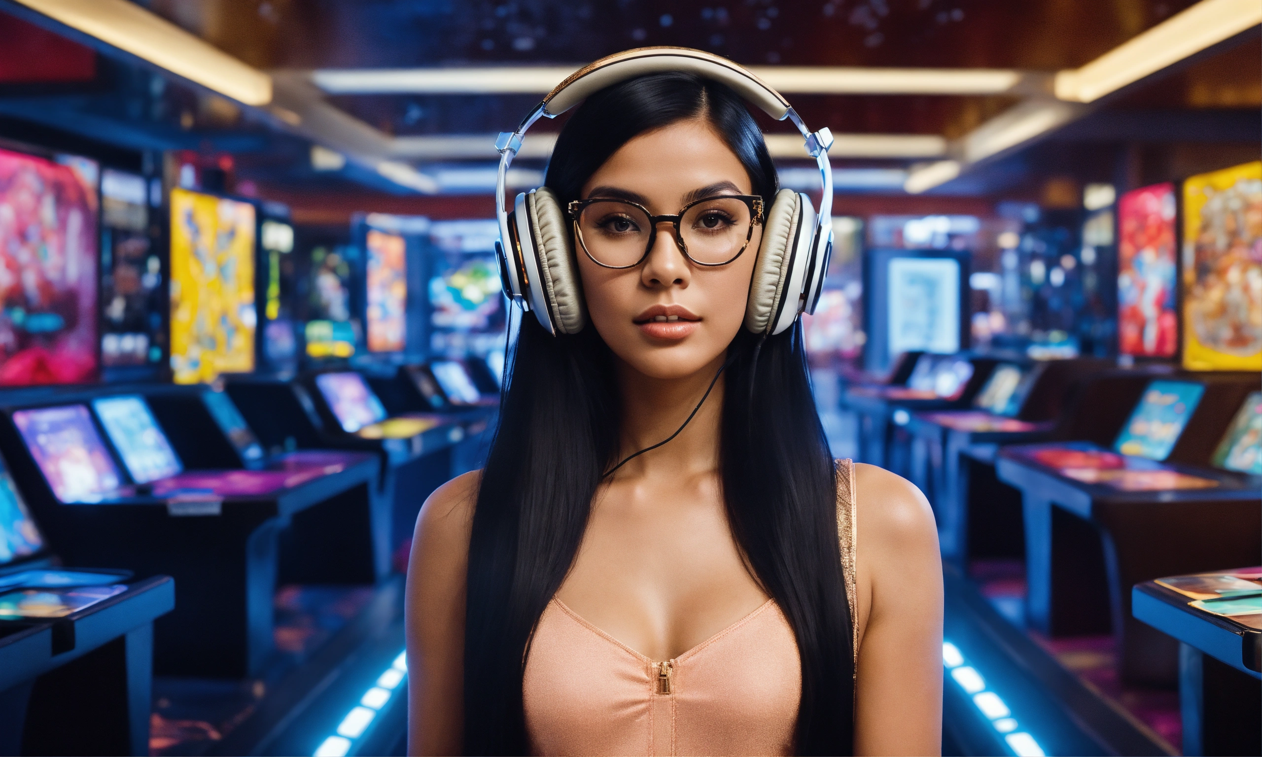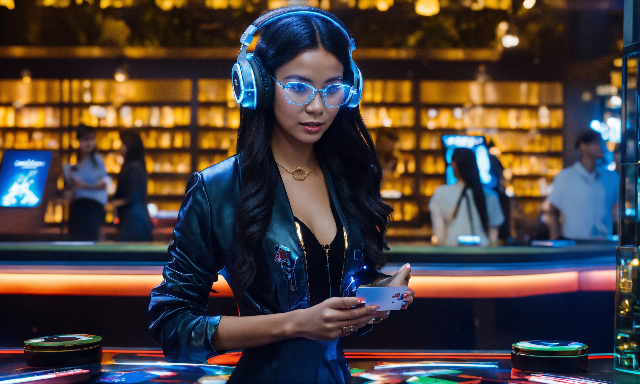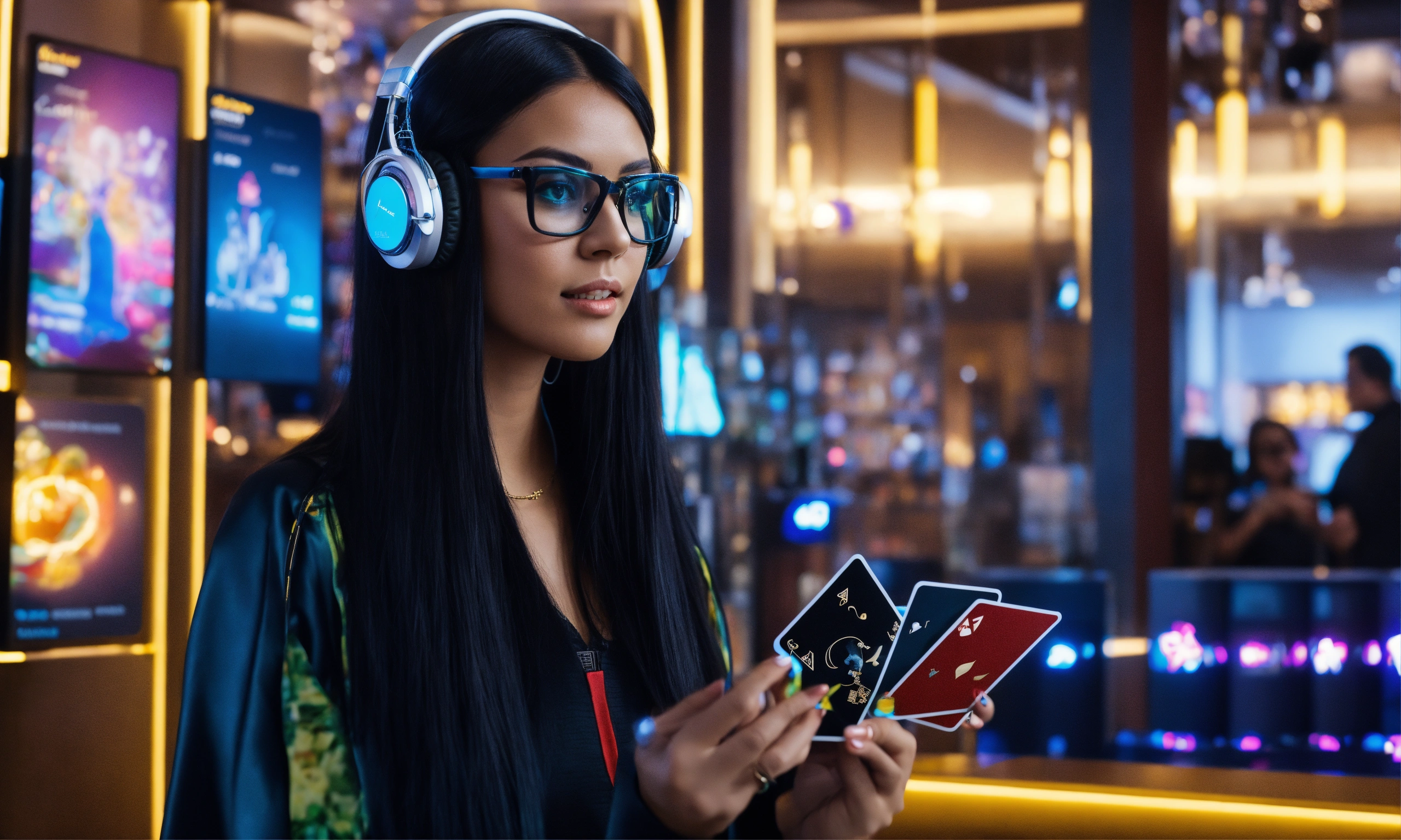 A lady with black long hair in glasses and headphones, in a fashionable outfit, stands at the card lounge with cards in her hands with a futuristic touch.