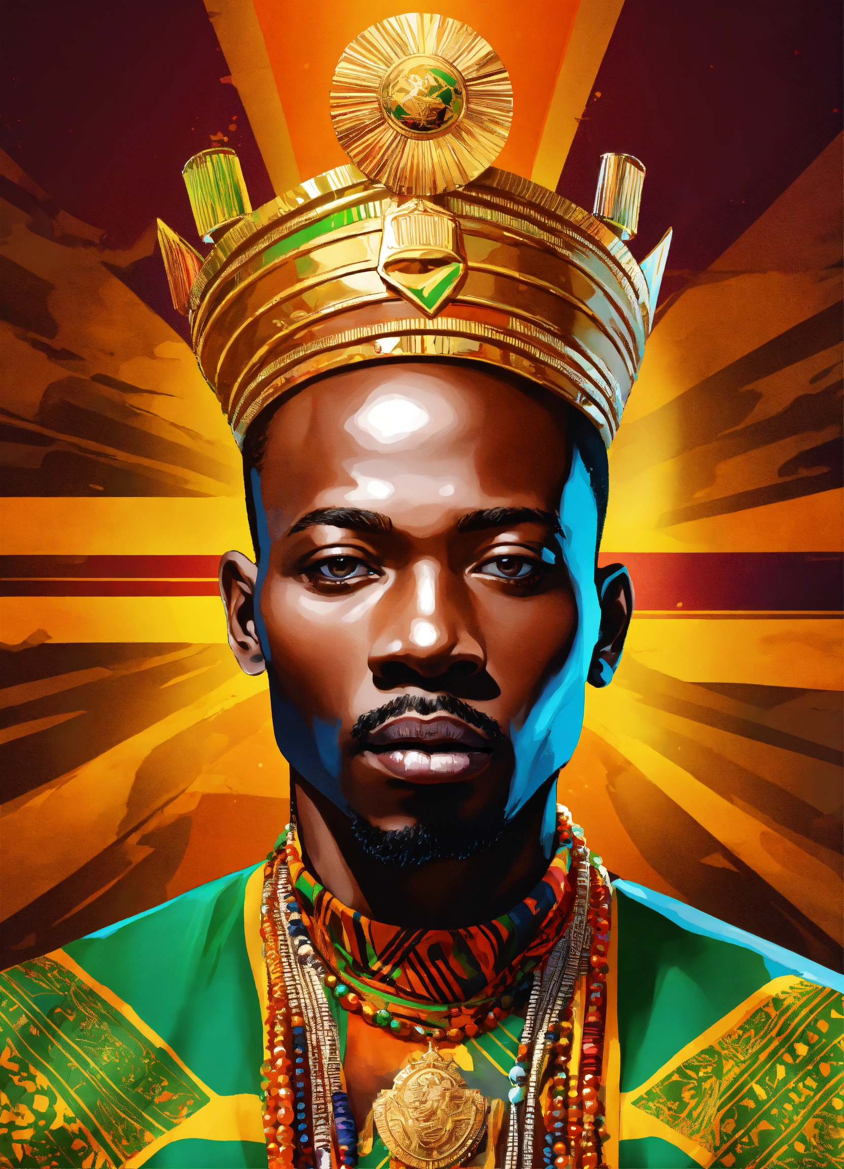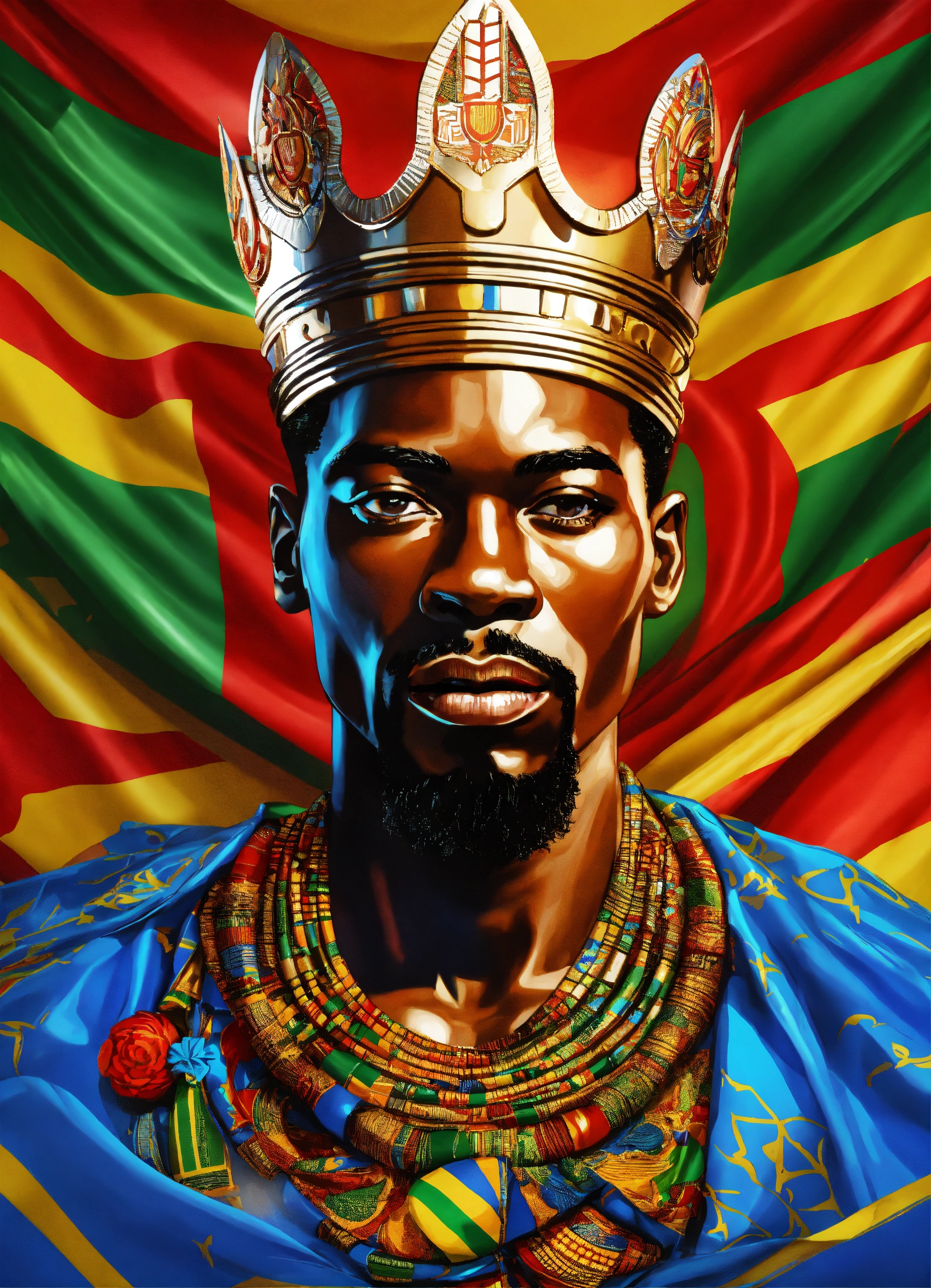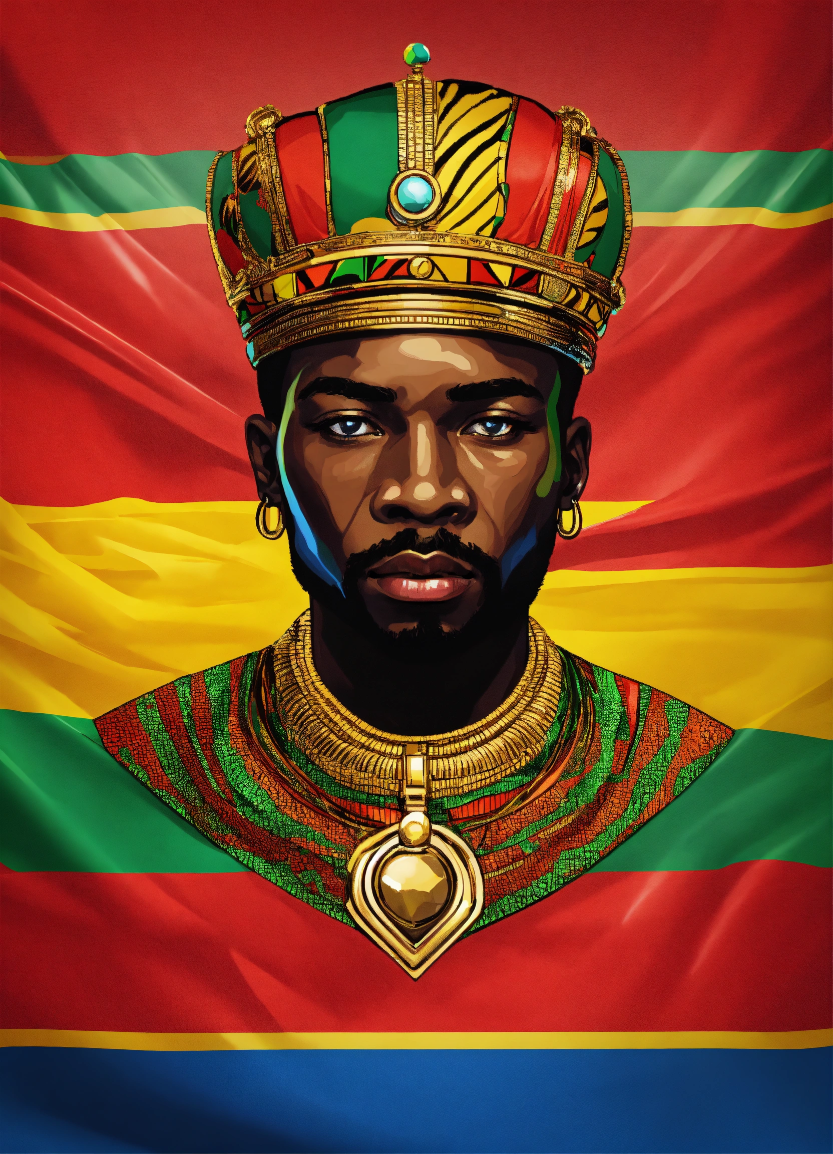 Bright african flag in background liquid with african king, hyper detailed, ultra-sharp, 8 k, illustration, highly detailed, smooth and clean vector, no jagged lines, vector art, smooth