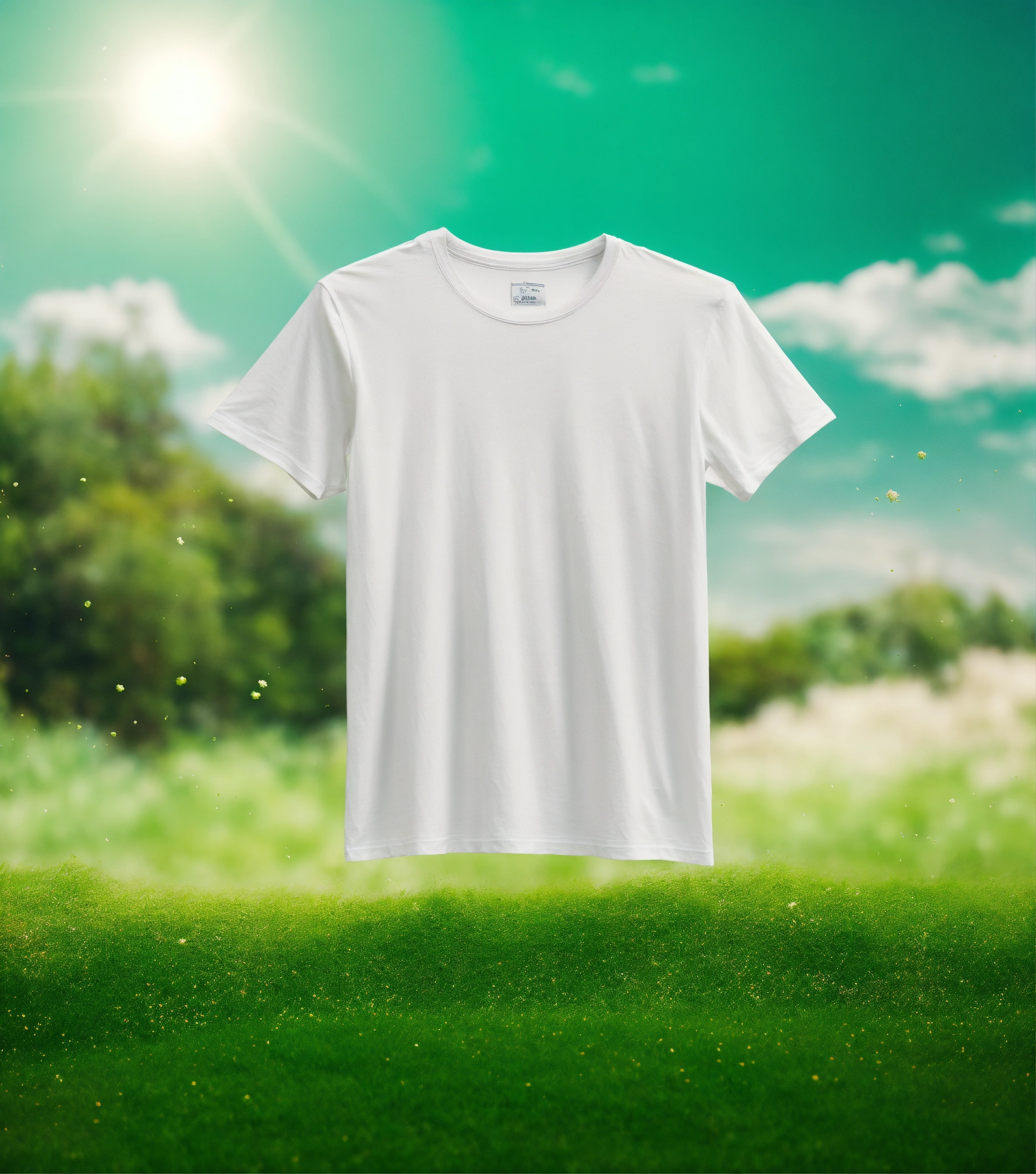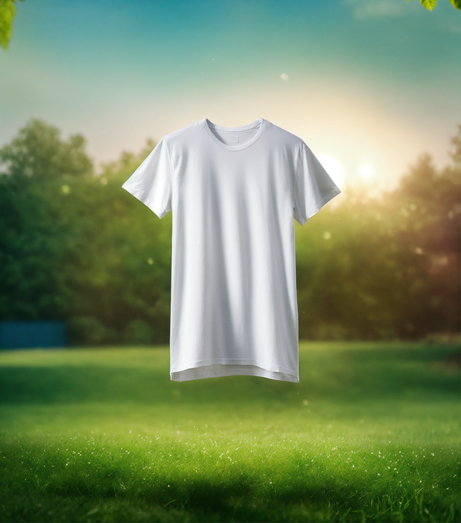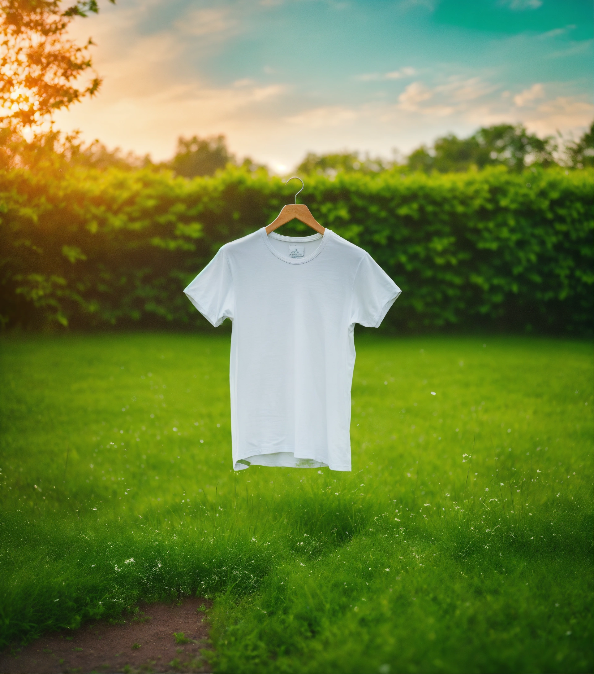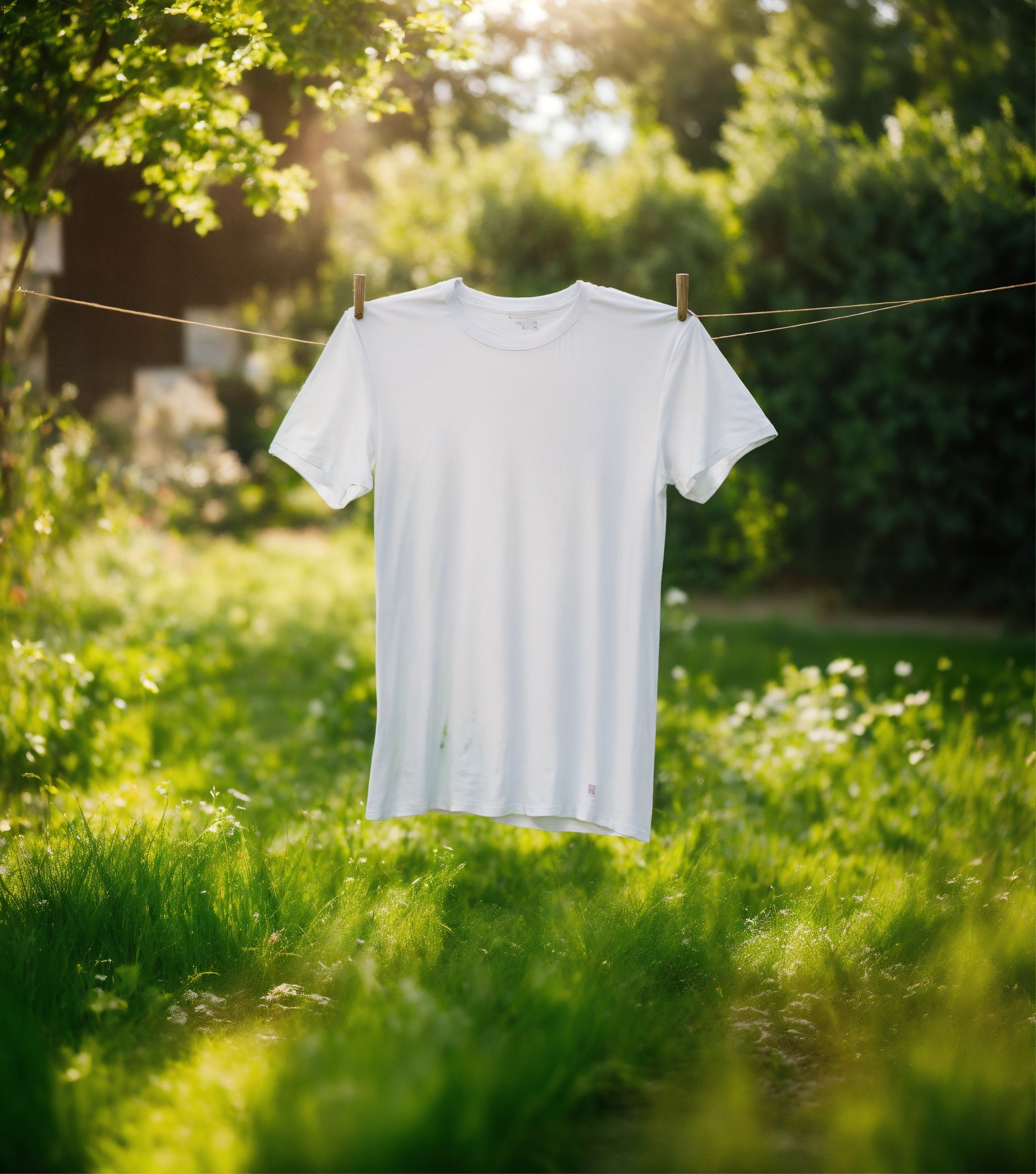 Create an image of a white t-shirt floating in mid-air with a brown dirt stain and green grass fading into thin air, set against a blurred garden background. use vibrant shades of green and white, with bright daylight to emphasize freshness and clarity