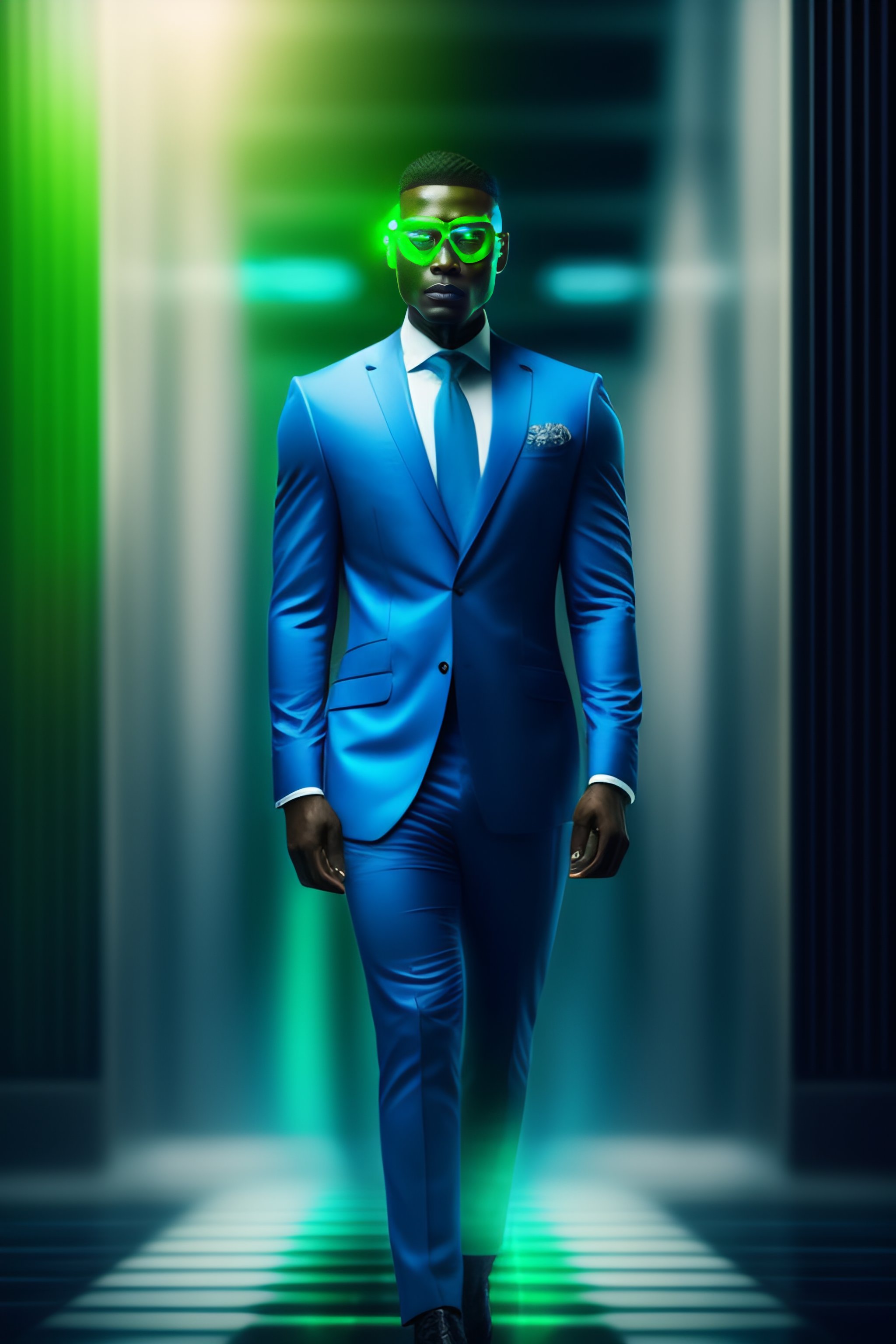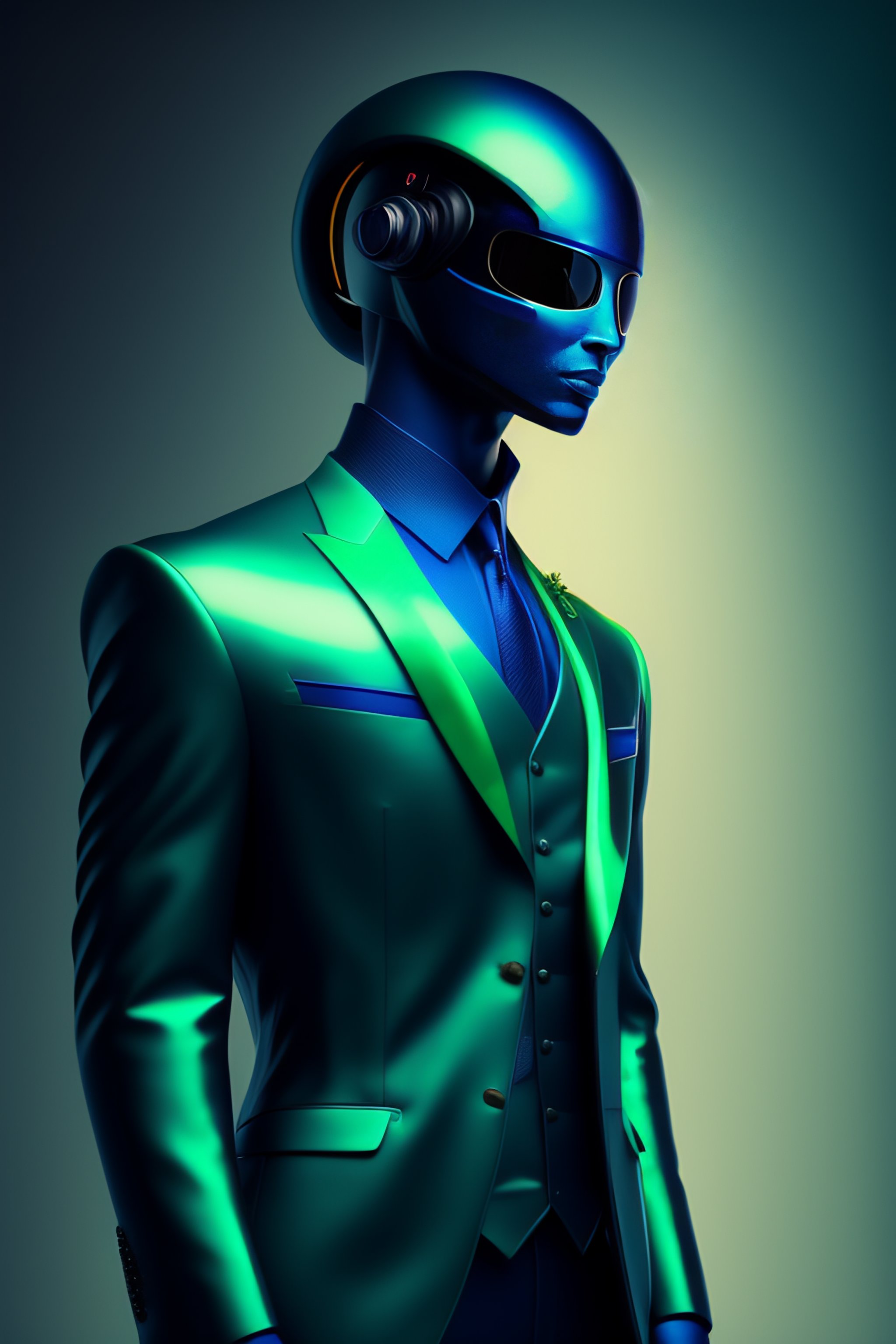 Humanoid alien scientist, green and blue suit, a character side portrait, realistic, half body shot, sharp focus, elegant