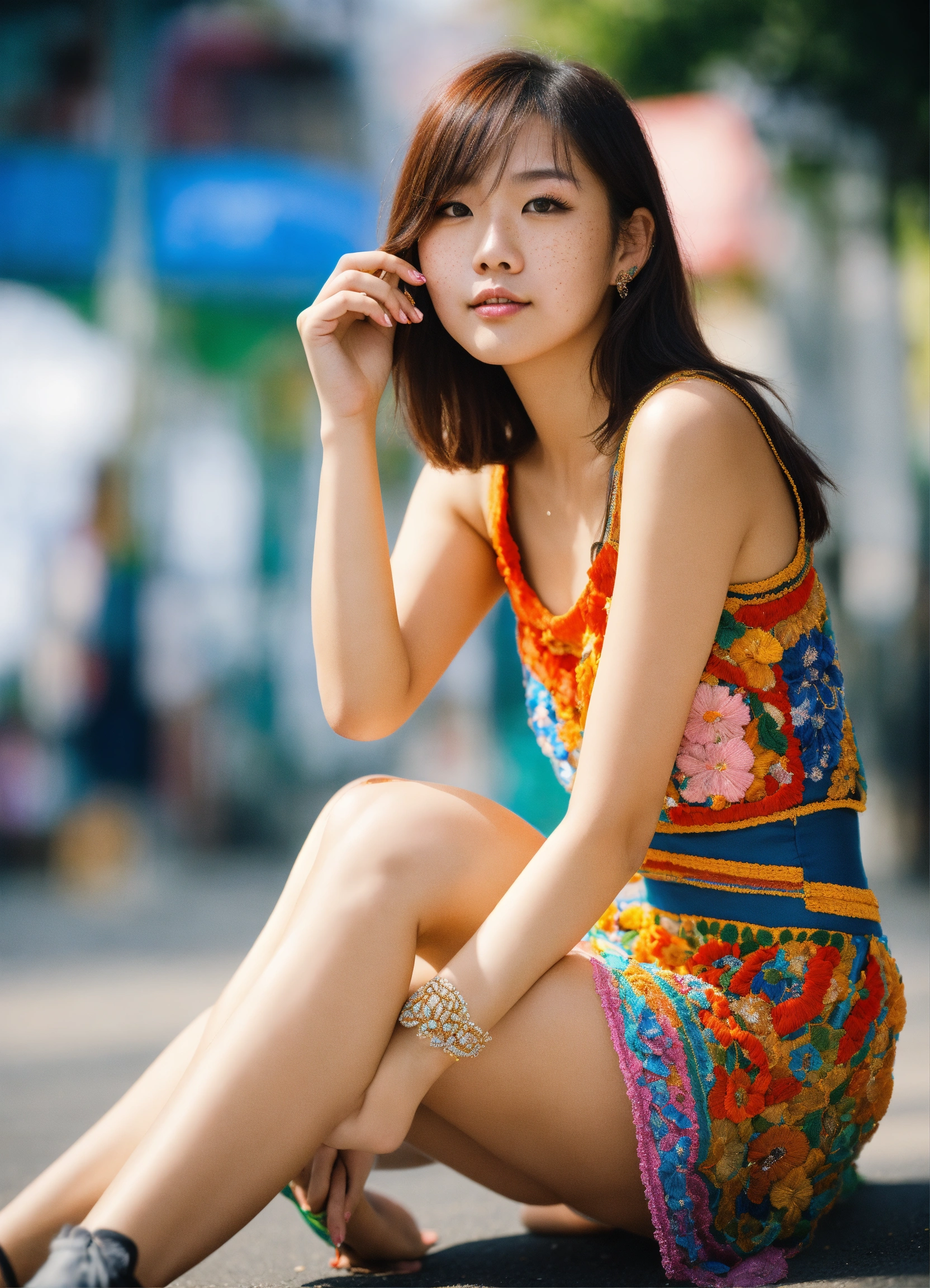 Front view, beautiful hong kong lady with freckles, age 23, pretty outlook, cutie face, shiny eyes, wearing a colorful, vibrant, detailed embroidered one piece mini skirt, sitting on the ground, full body, wide shot, super low angle, sunny day, main road background