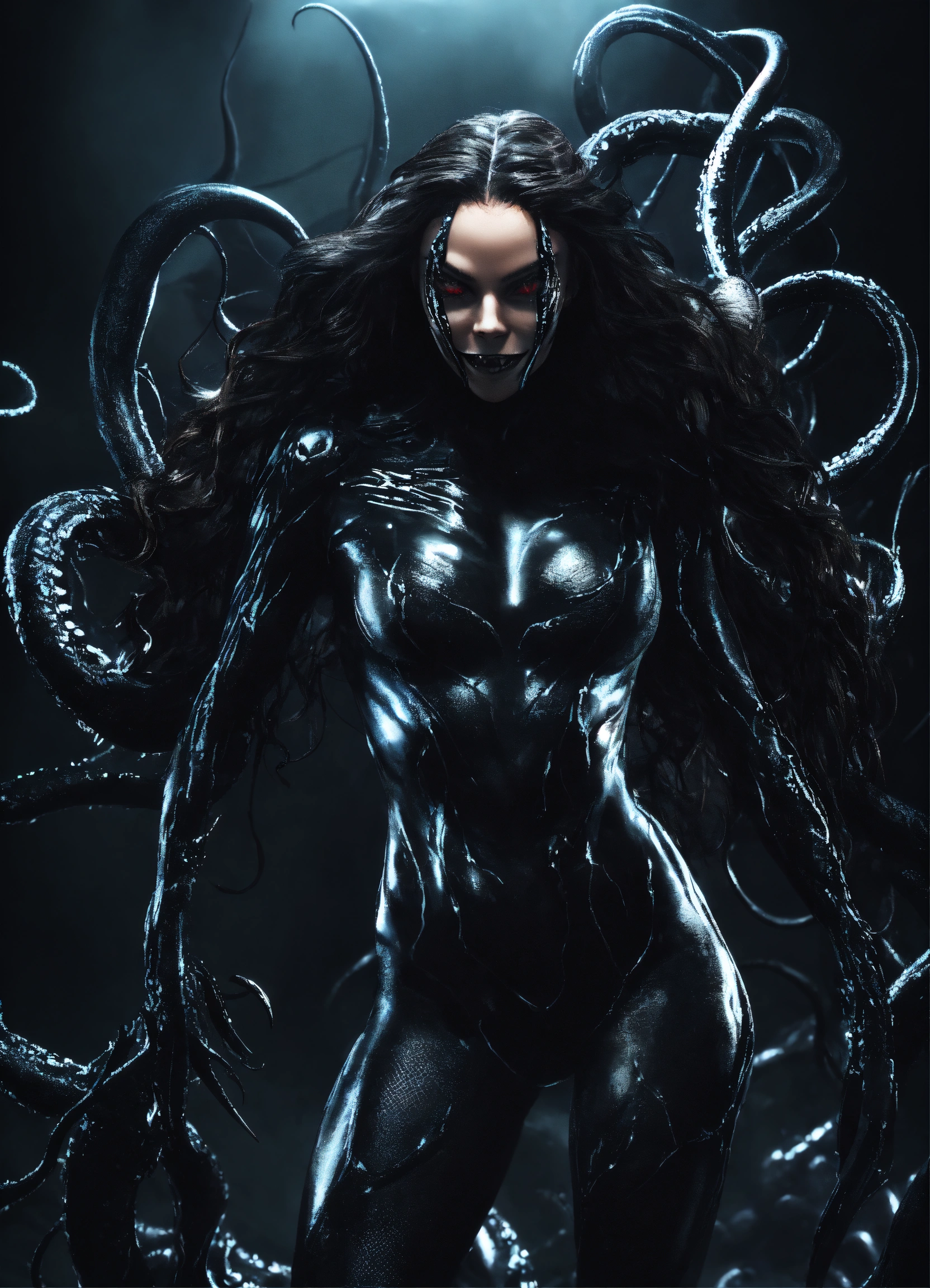 An ultrarealistic full body photograph of woman venom symbiote, laying in dark black liquid with tentacles, long hair, evil smile, evil glowing eyes, venom symbiote on skin, venom symbiote, 8k