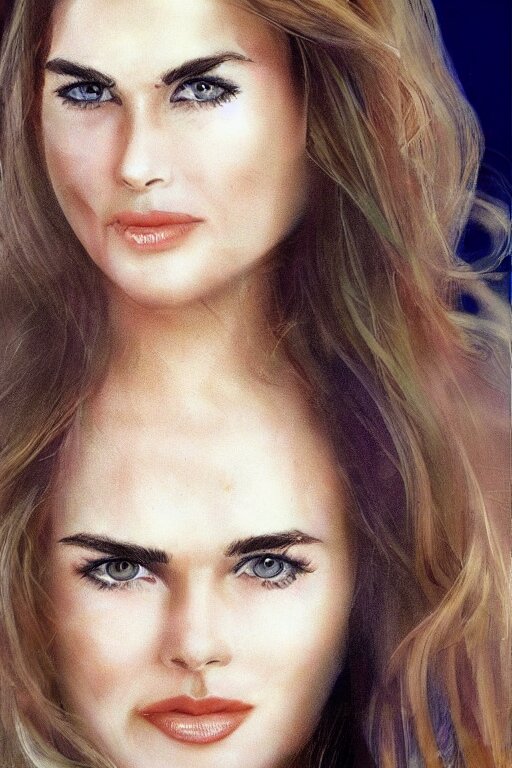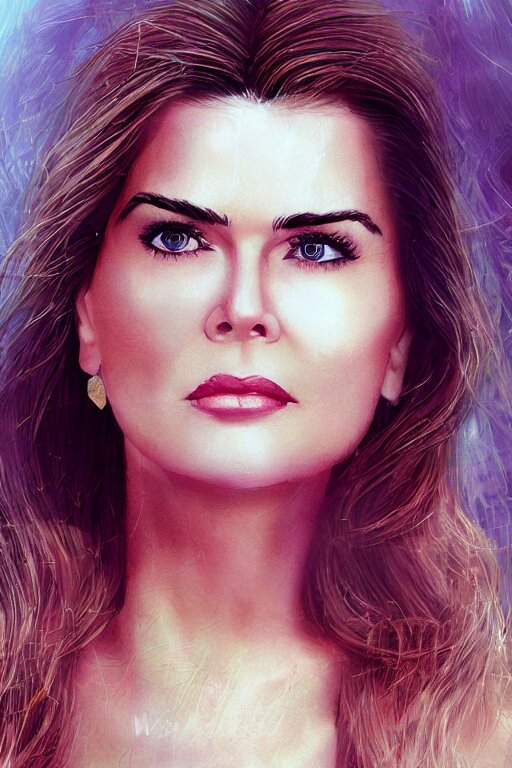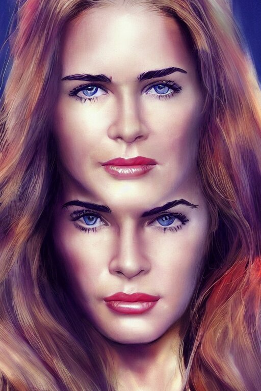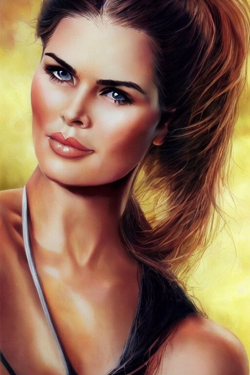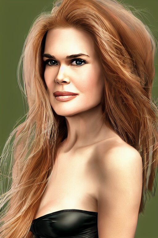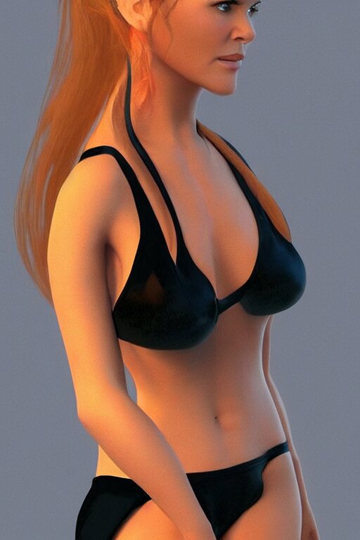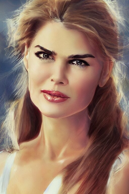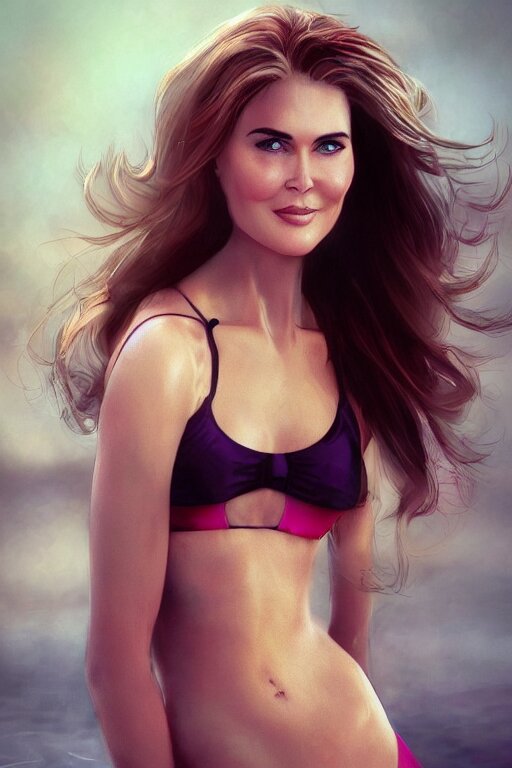 Mix of beautiful young maria shriver, mariel hemmingway, brooke shields, nicole kidman and elle macpherson as a young bikini model, thin lips, hair tied up in a pony tail, dark blonde hair, colorful, artstation, cgsociety