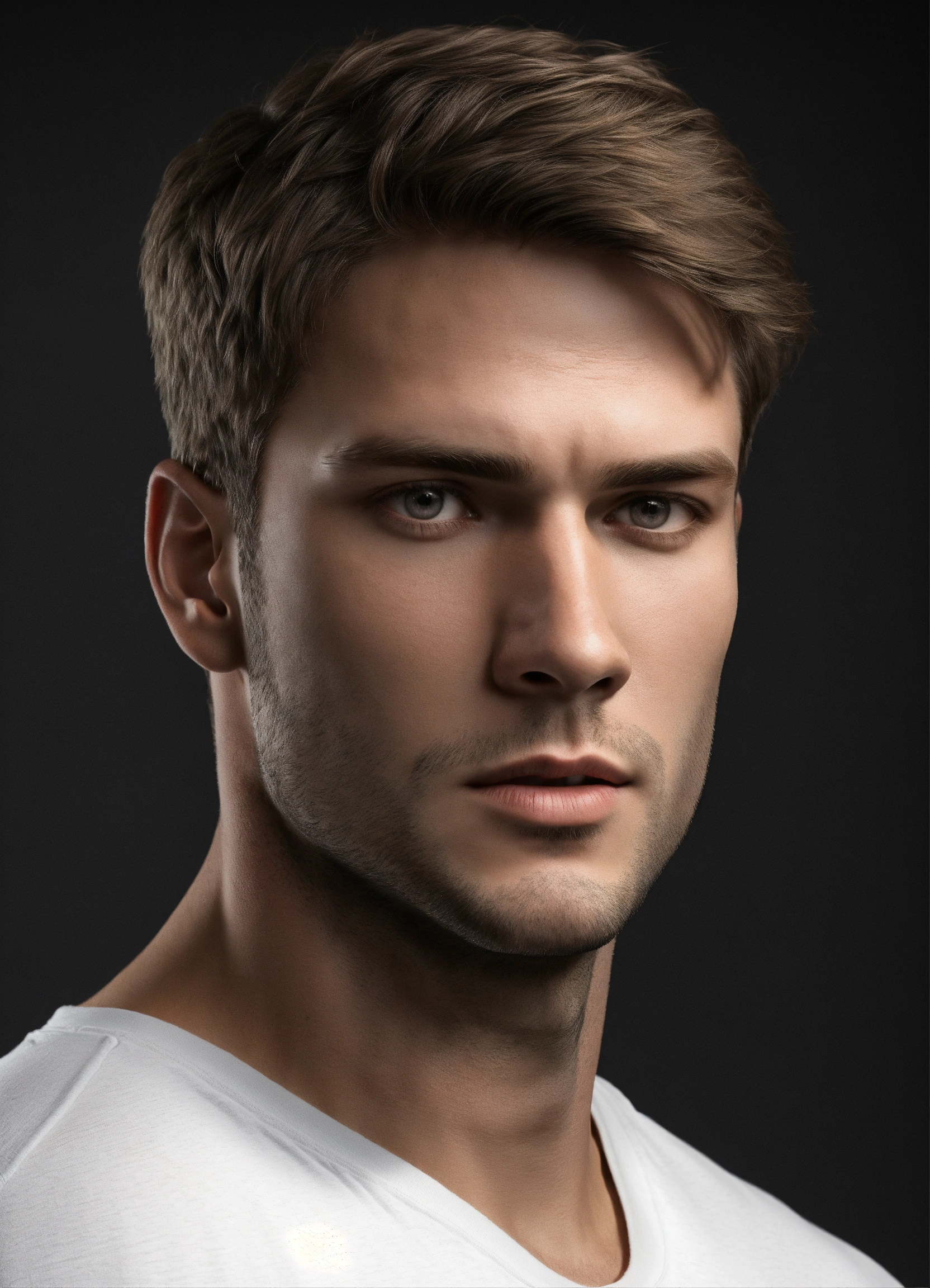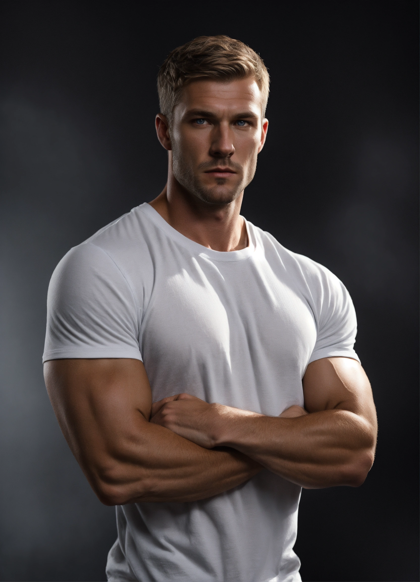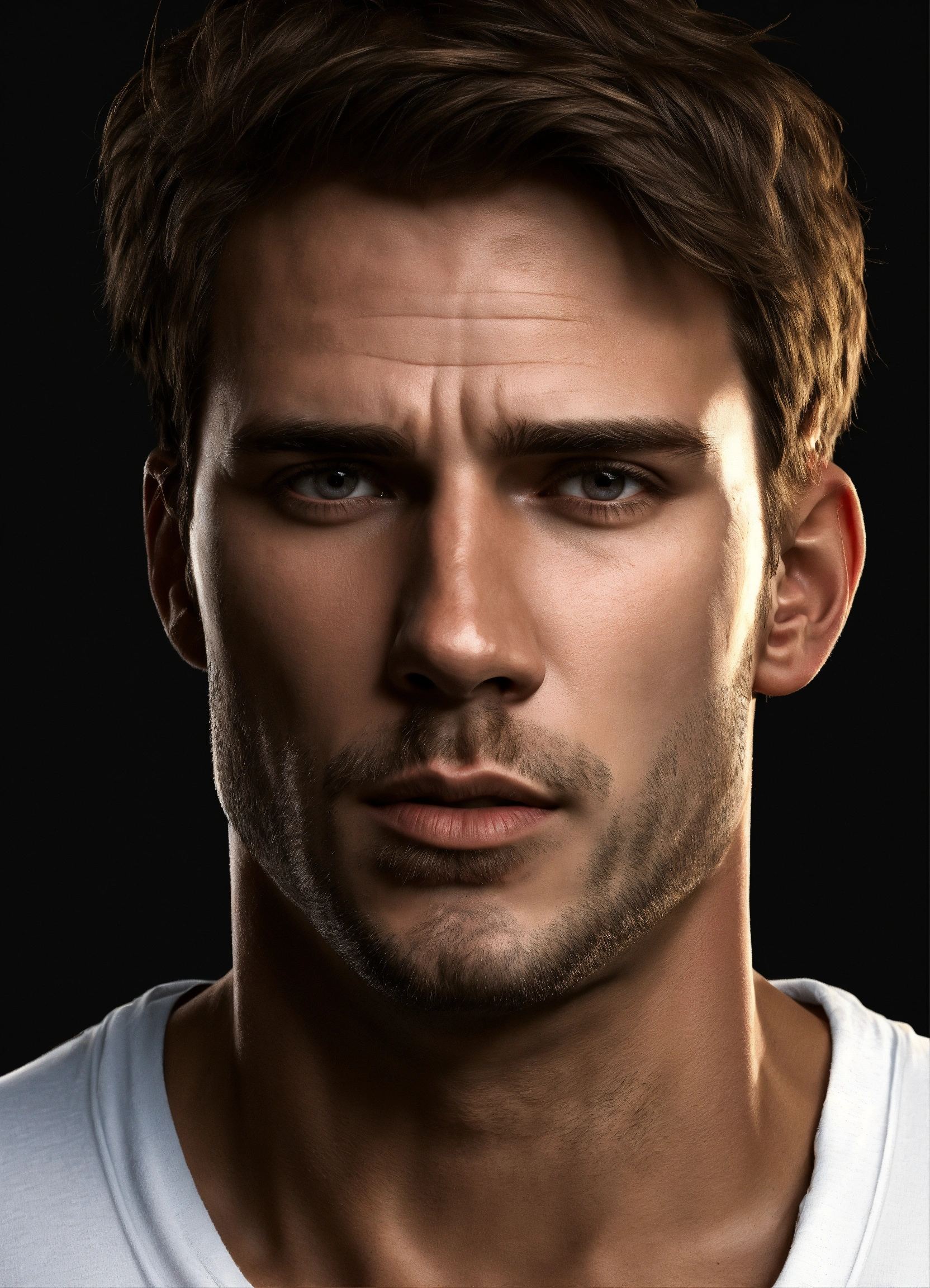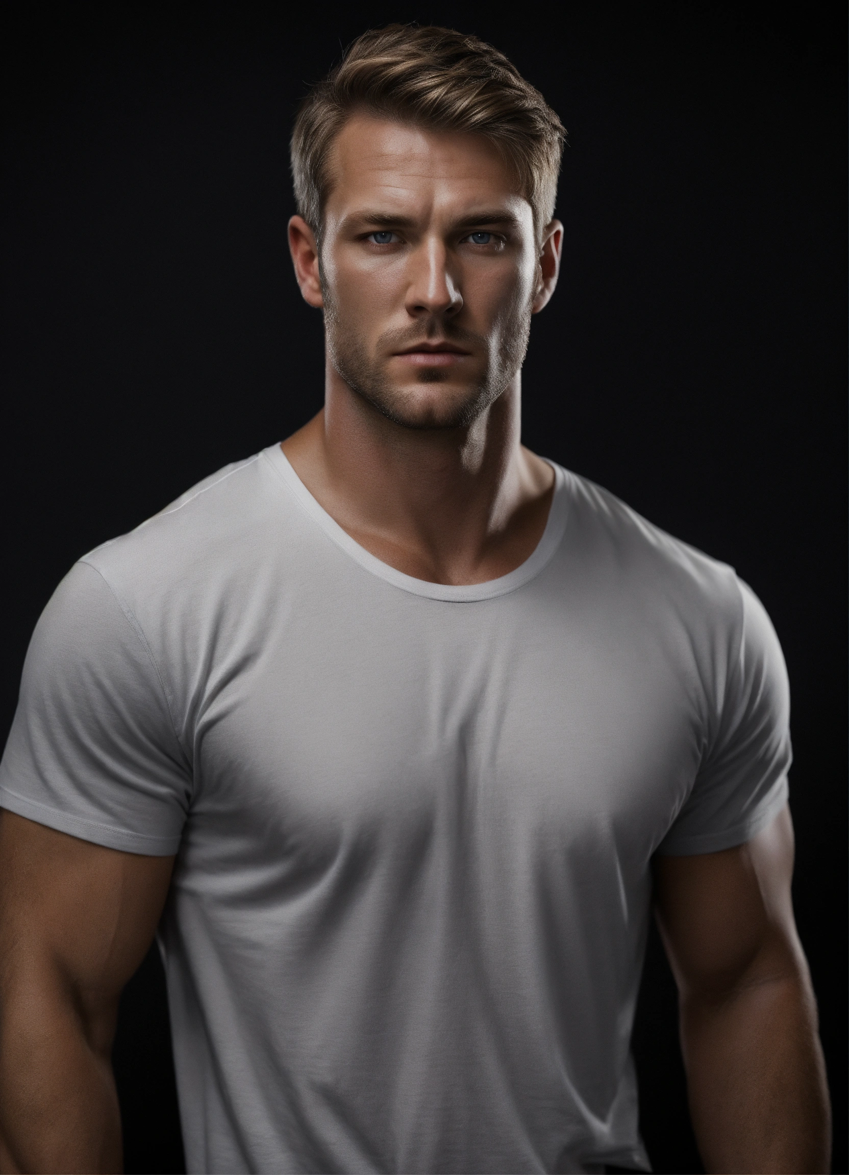 Realistic man, solid black background, dark blond hair, tall, standing, waist-up, broad-shouldered, 30 years, haunted, tough, realistic skin, clean-shaven, realistic dark blond hair, tired, focused realistic light gray eyes, solid black background, well-built, wearing white t-shirt, no pockets