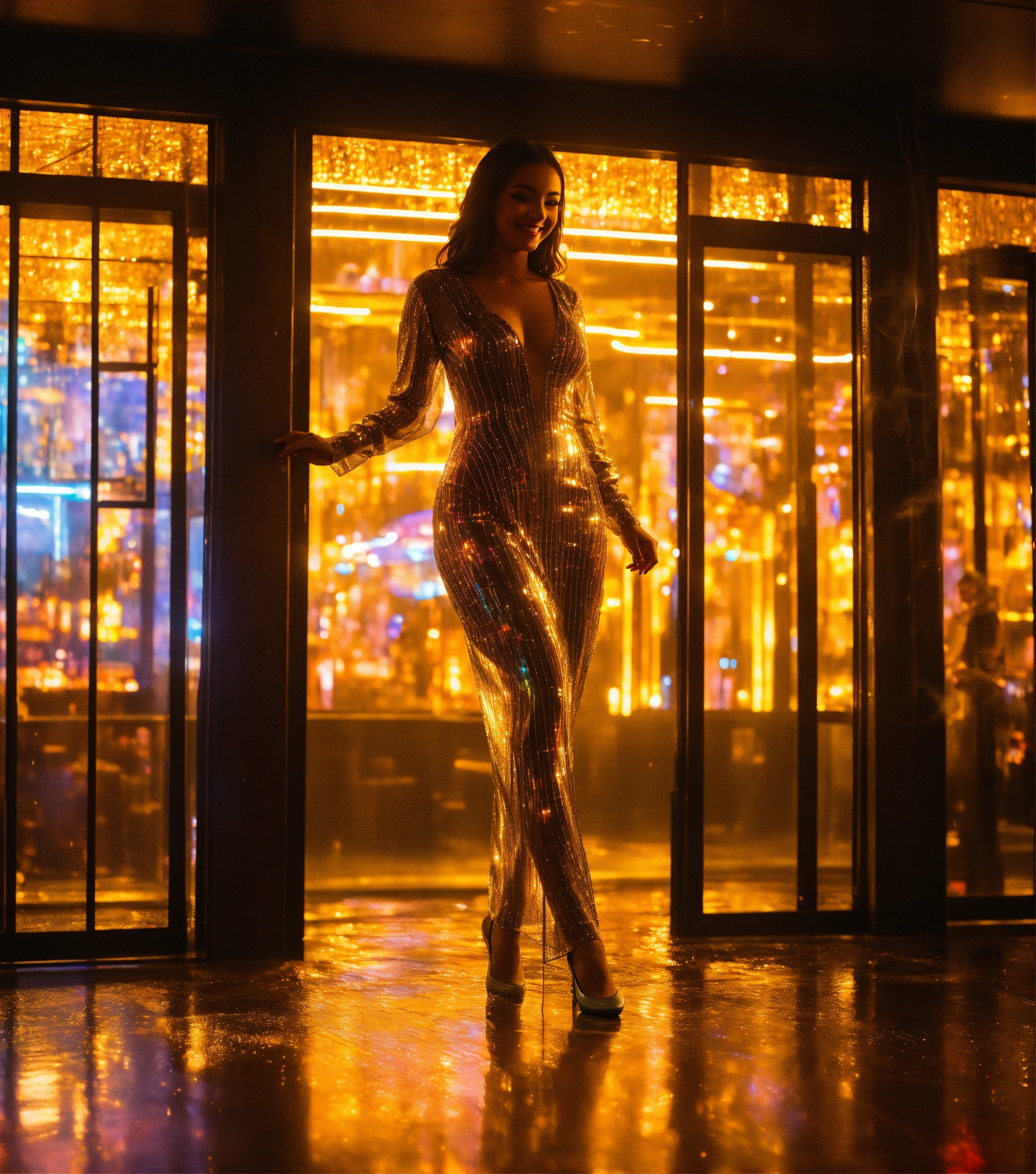 Insane glass dress on a beautiful brazilian female at a golden glass nightclub with iredescent lights and super tall floors divoded intonseparate private lounhes with tall glass doors and wery wide holographic windows, many beautiful smiling female dancers in glass dresses made from this smoke lines, 8k 16k 32k 64k 128k very deep shot, sured detailed, real reflections, rain and water, neon signs, futuristic