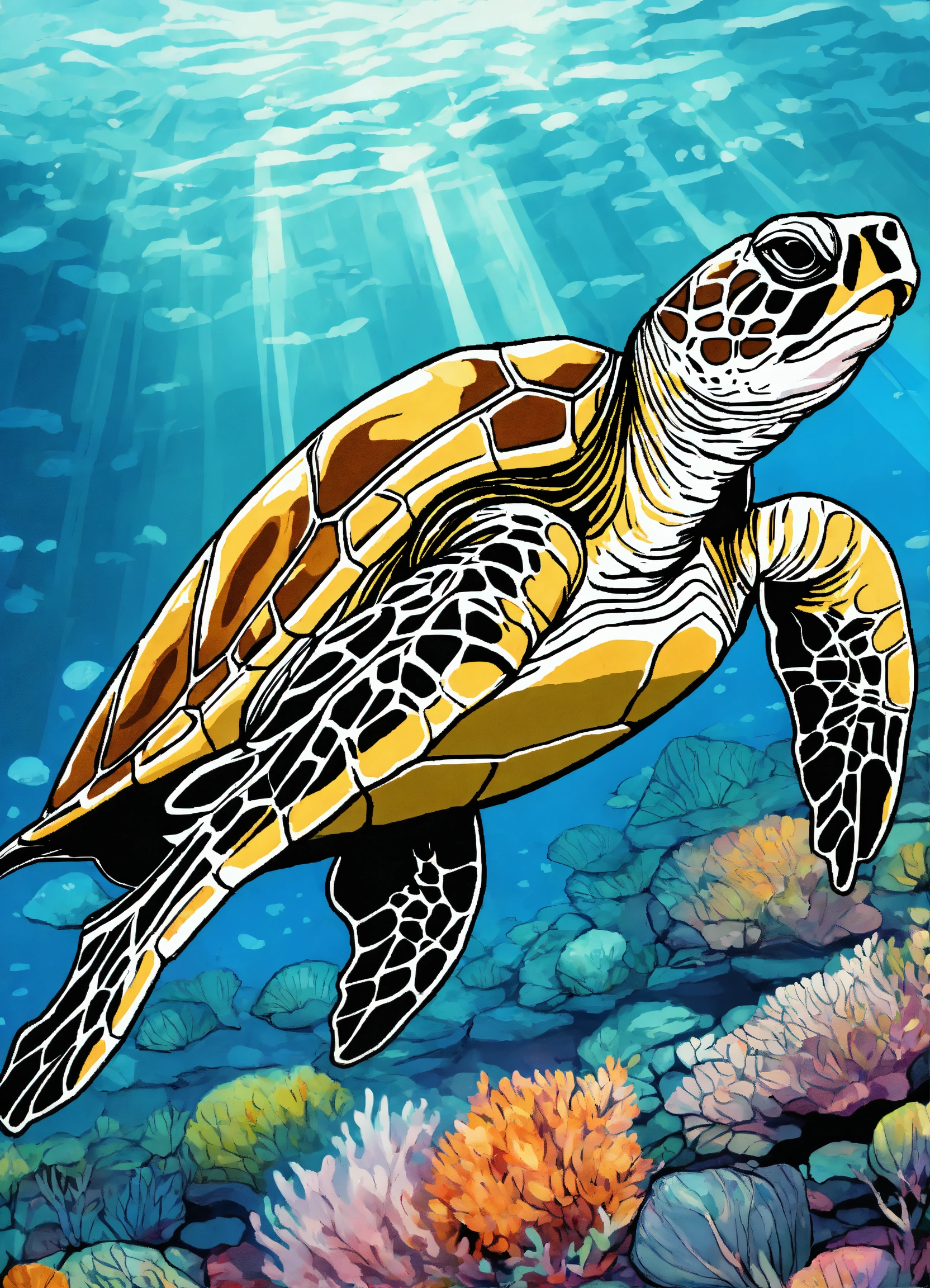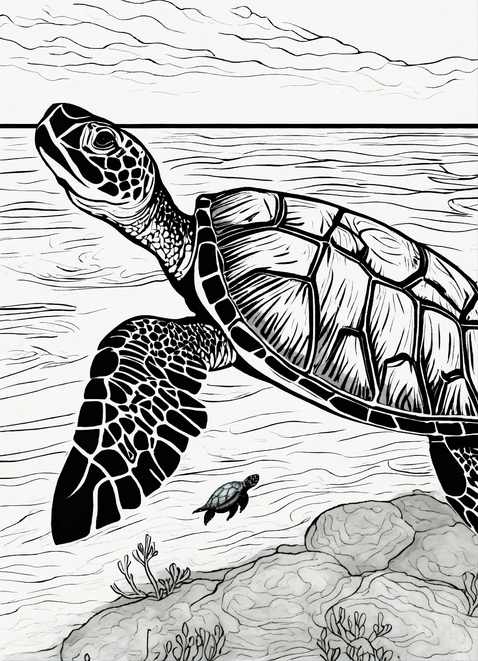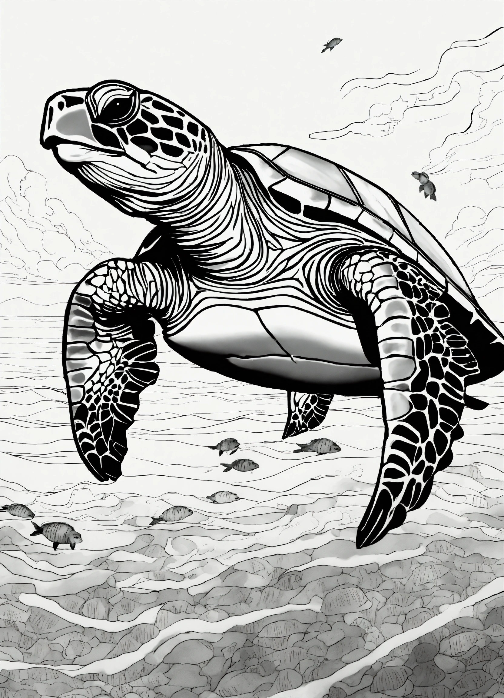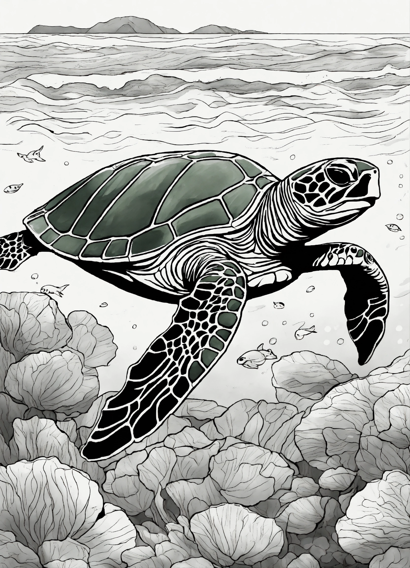 Olive ridley sea turtle in the sea, impressionist art, line art for a coloring page, white background.