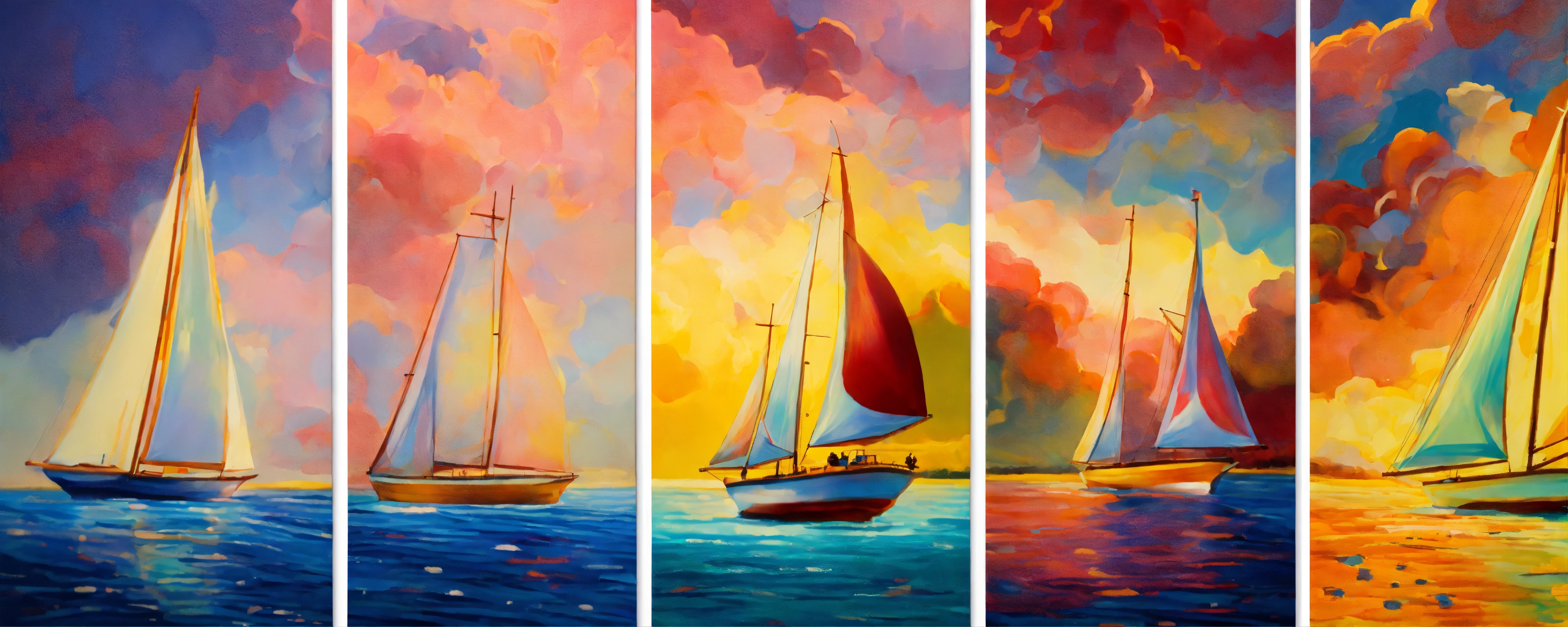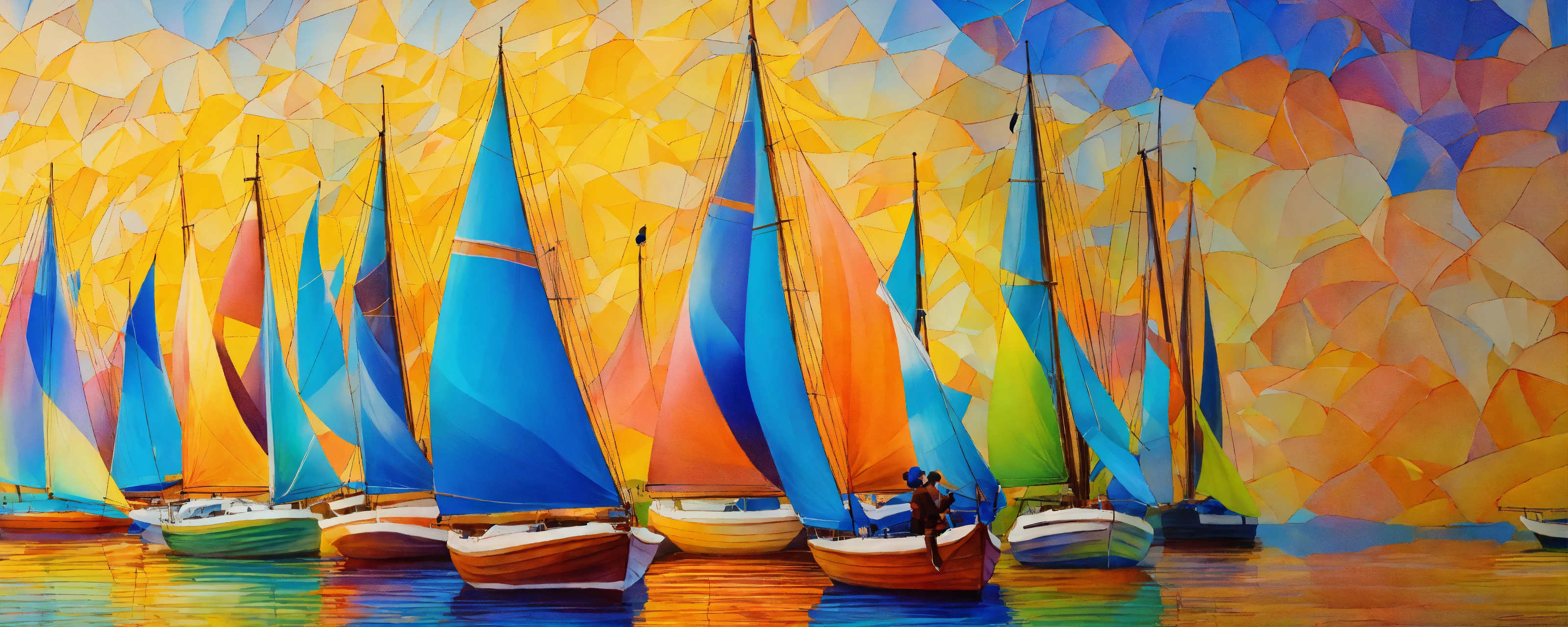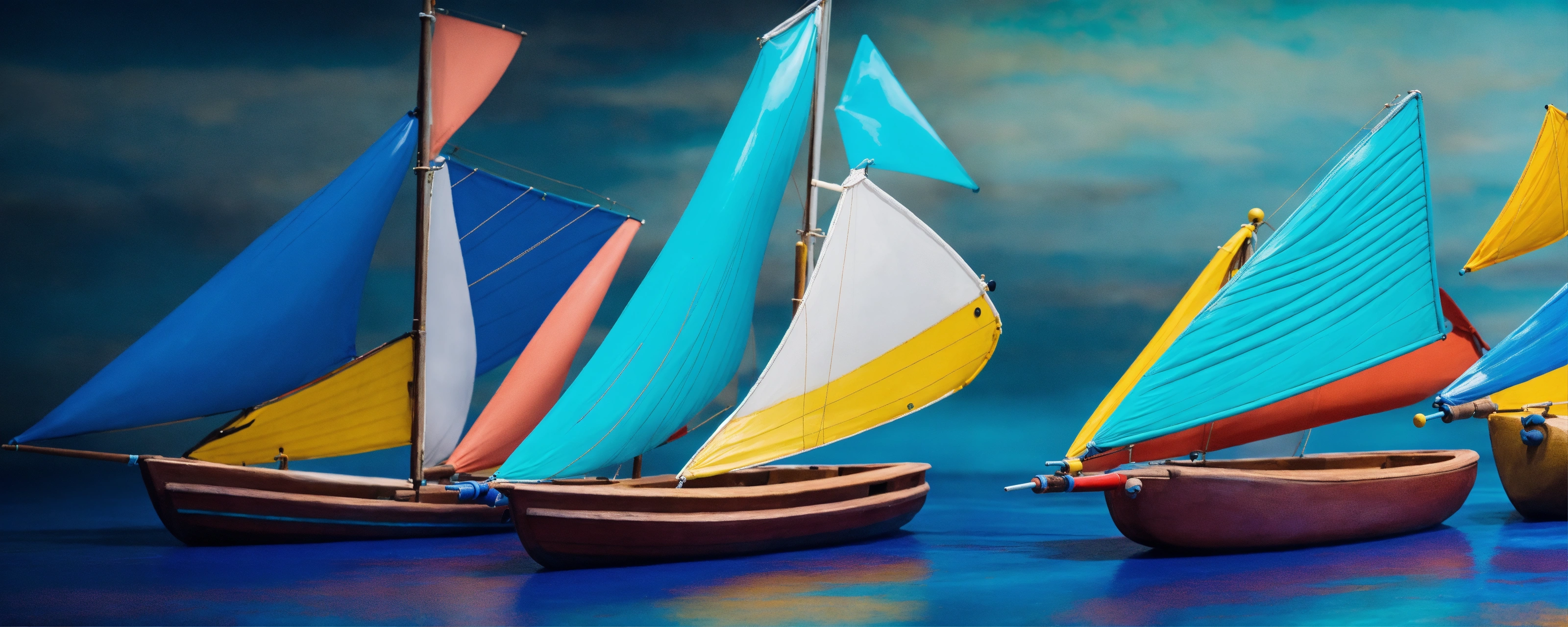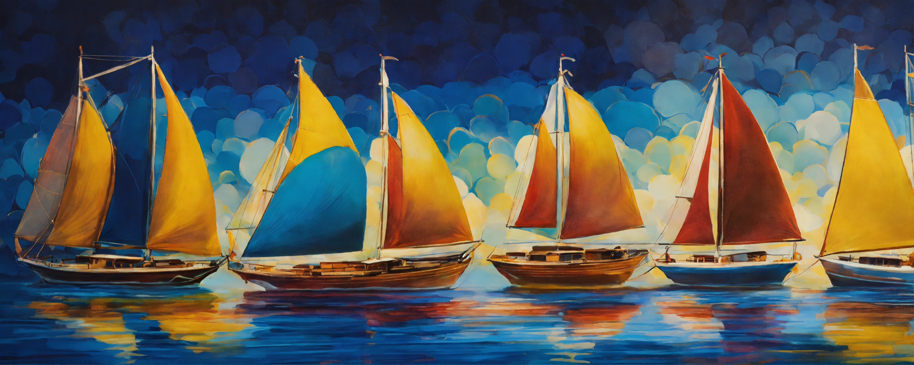 Newton.. barcos de vela. fondo azul marino, textura brillante, degradado desde el centro. figuras con una apariencia tridimensional utilizando la técnica del impresionismo. colores que contrasten con el fondo azul marino, como el blanco, amarillo o colores pastel. figuras claramente visibles. estilo limpio y moderno. todos los elementos deben estar equilibrados y la imagen no esté muy cargada en una parte específica. iluminación sutil que realce las figuras tridimensionales y aporte profundidad a la imagen.