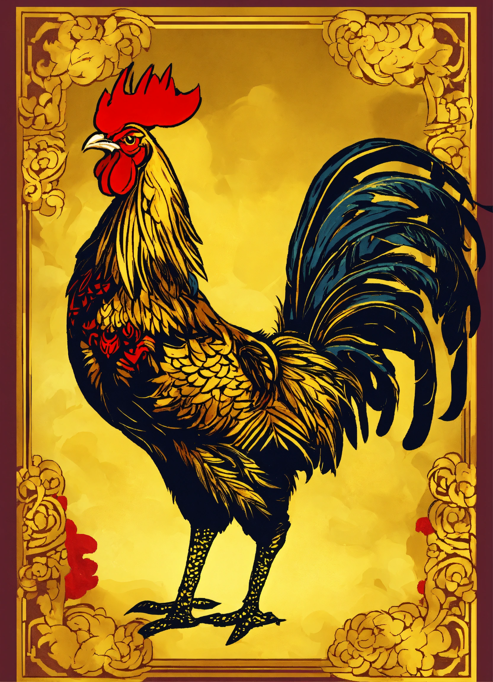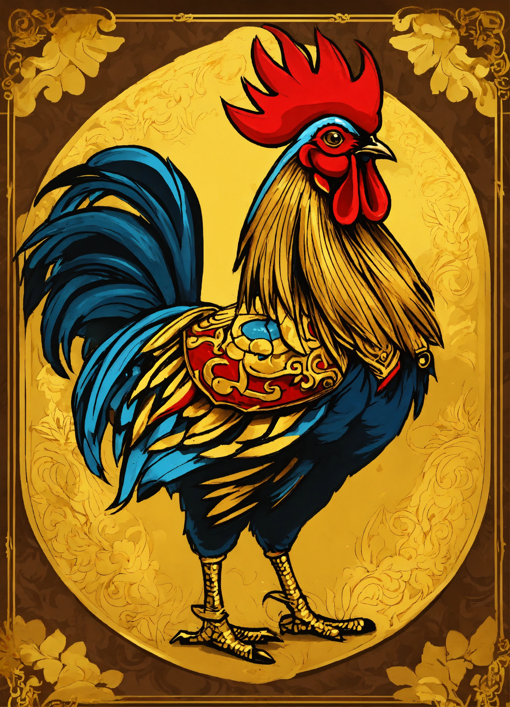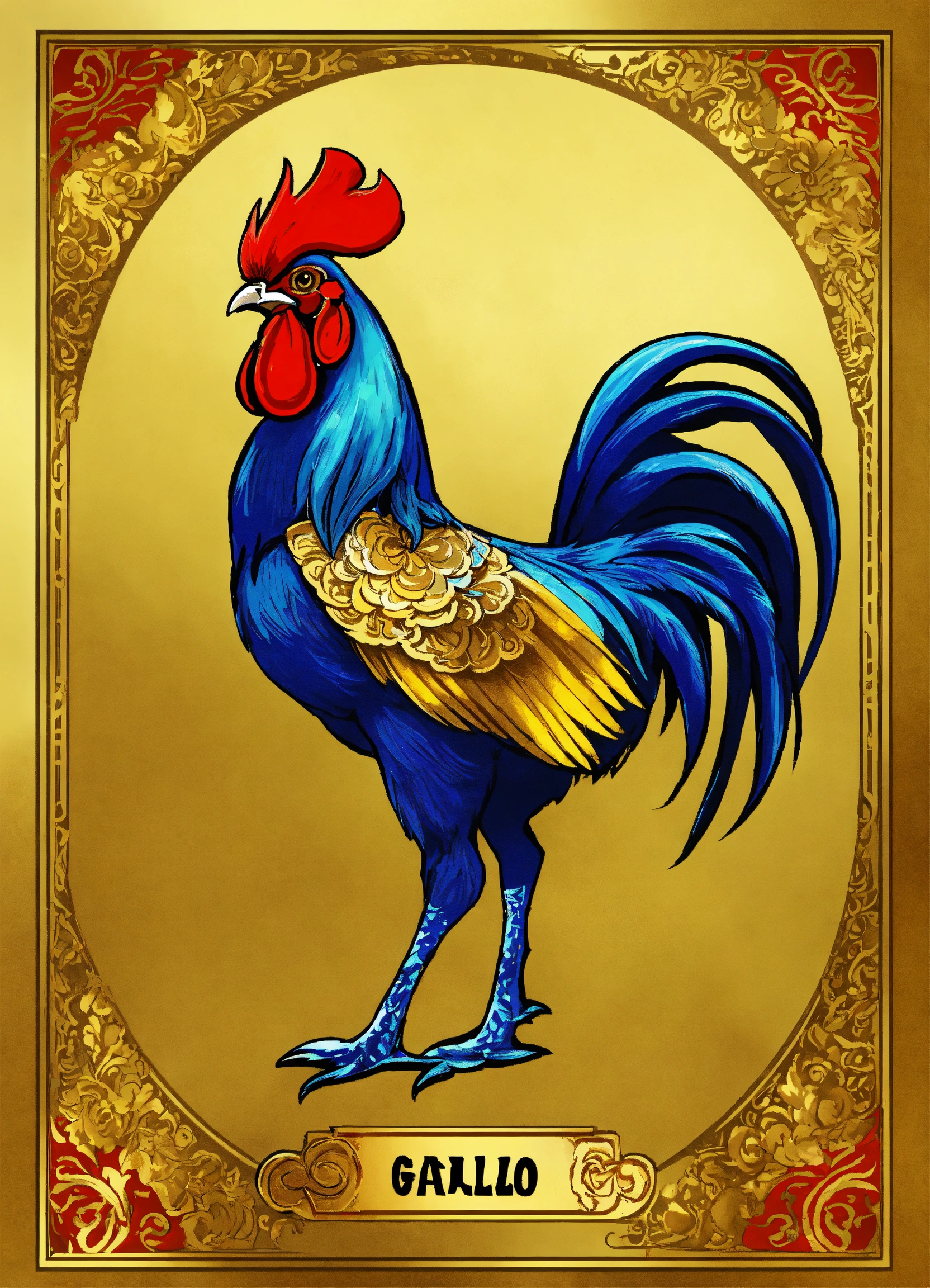 A rooster based on the card el gallo" of the mexican lottery deck in anime style, gold background card styled