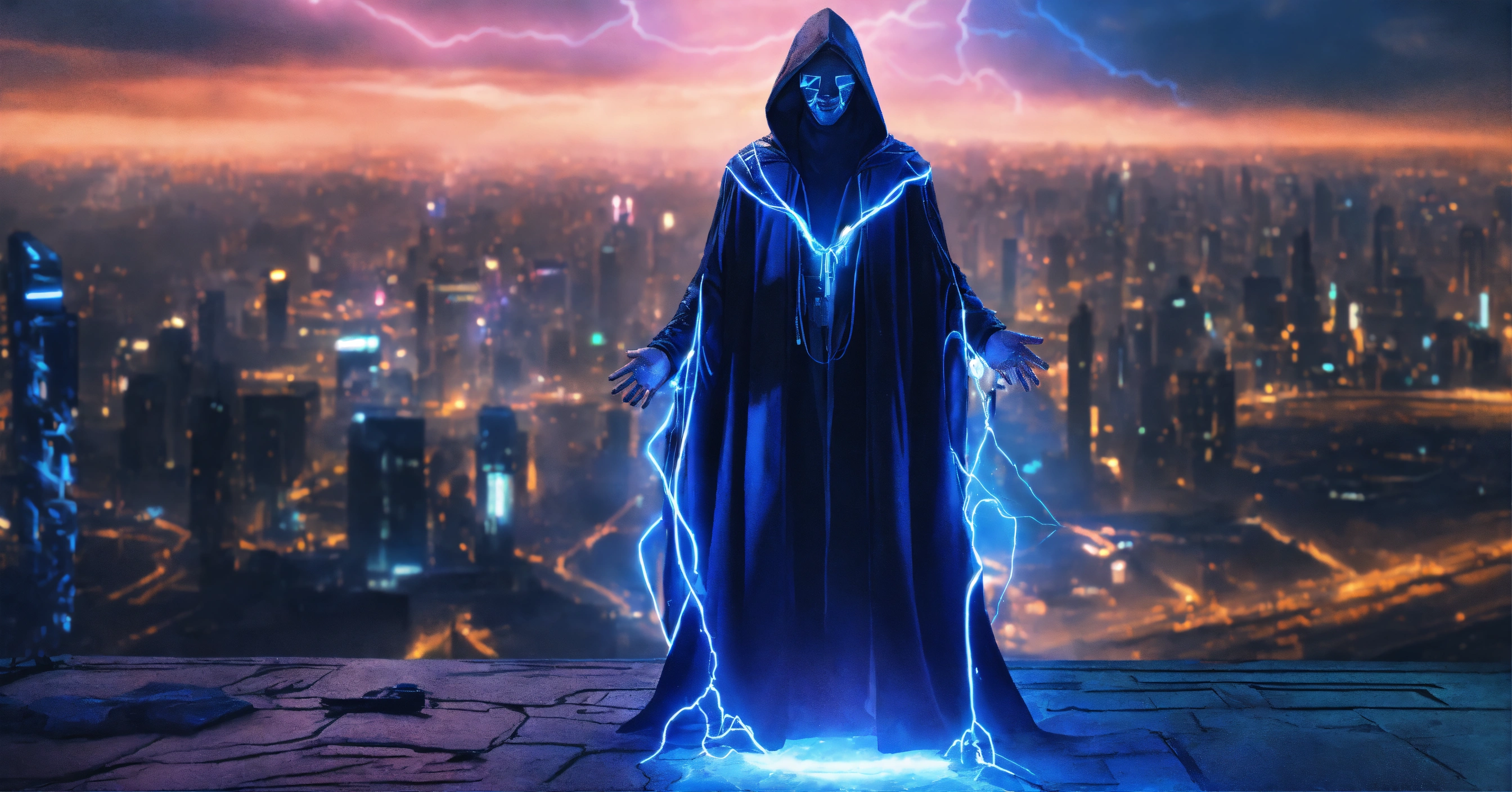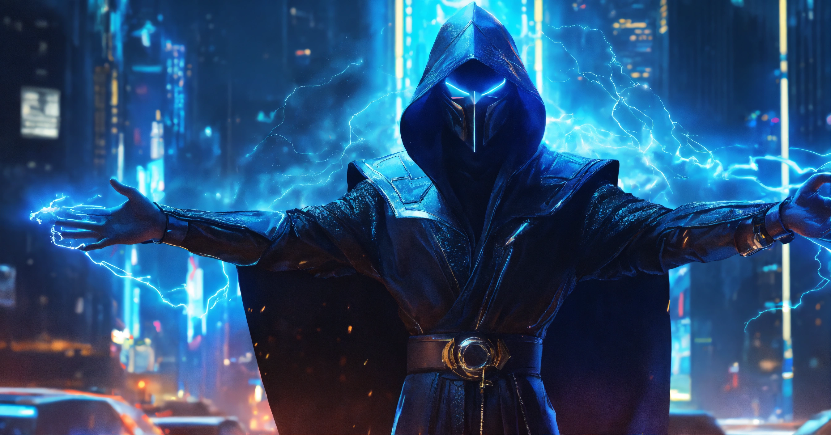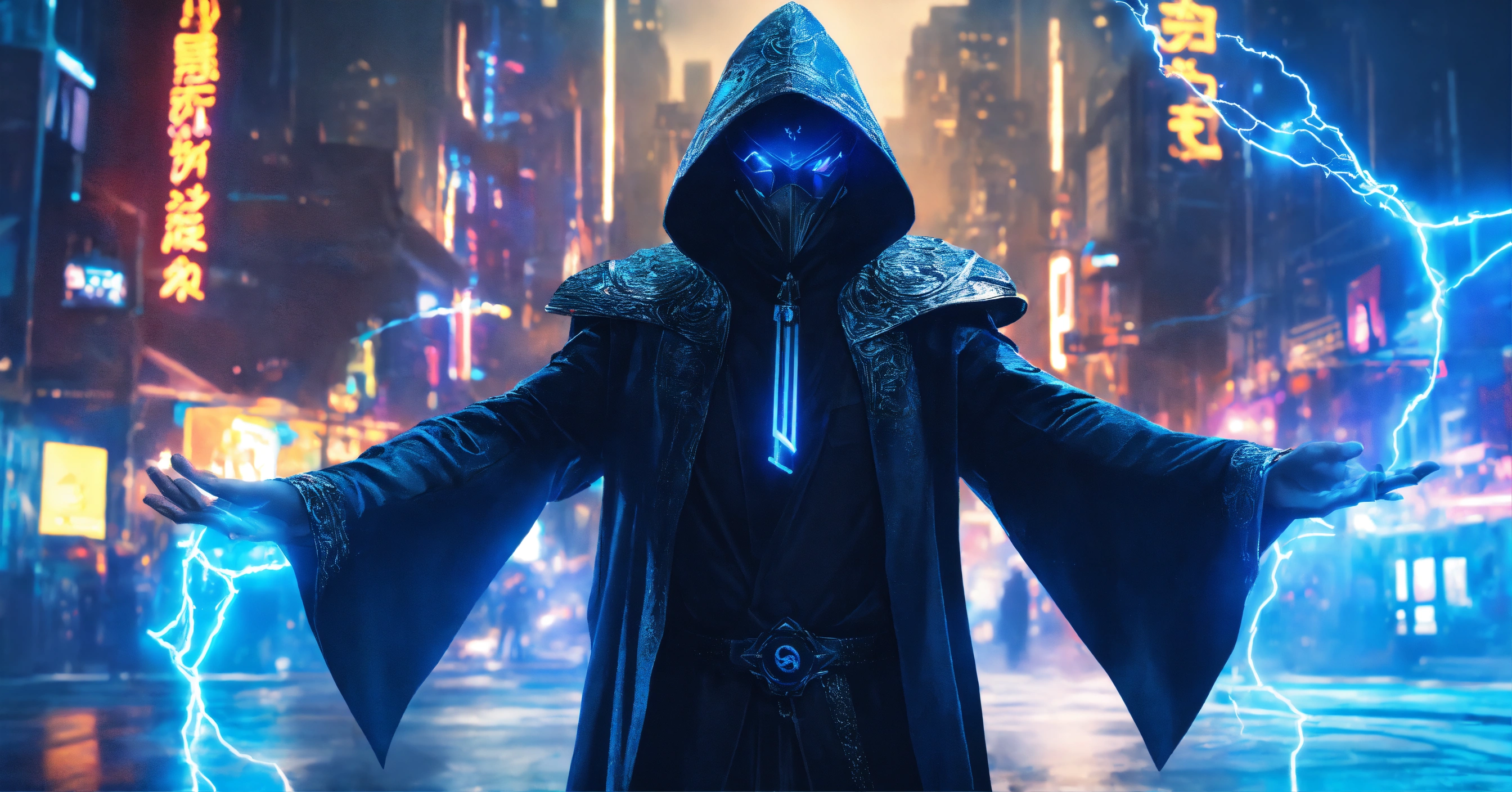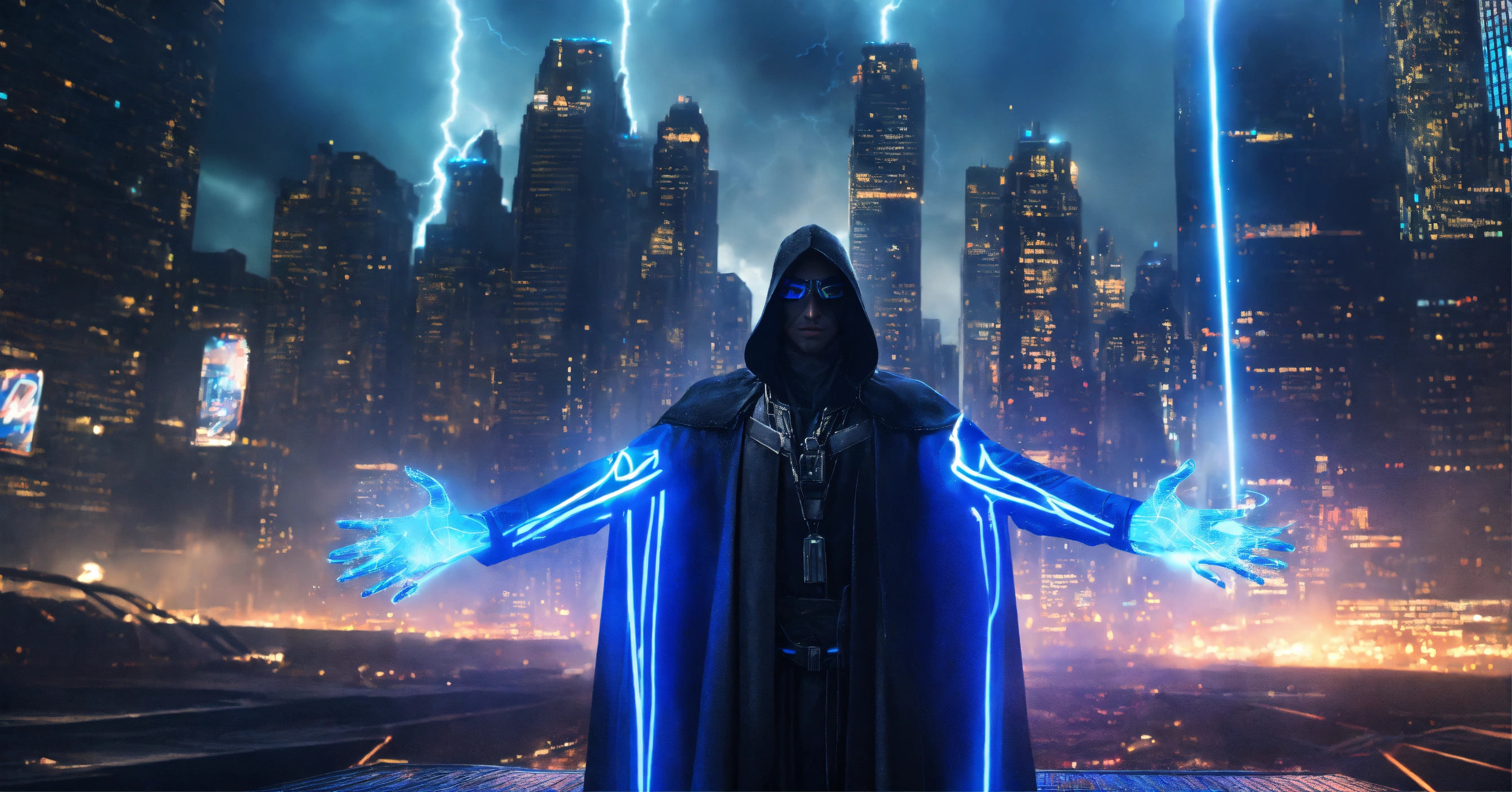 A modern intelligent powerful black and blue cloaked sorcerer casting a spell, lightening coming from his hands, arms open as if to embrace, masked, futuristic city, cyberpunk style, 8k, hyper realistic, neon lights, half body