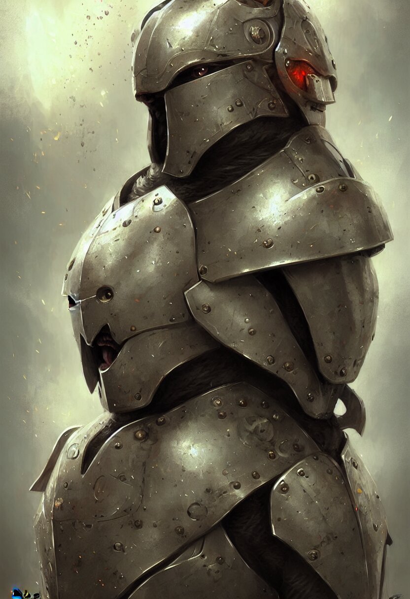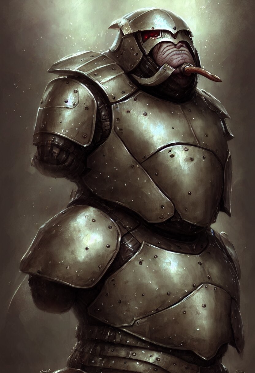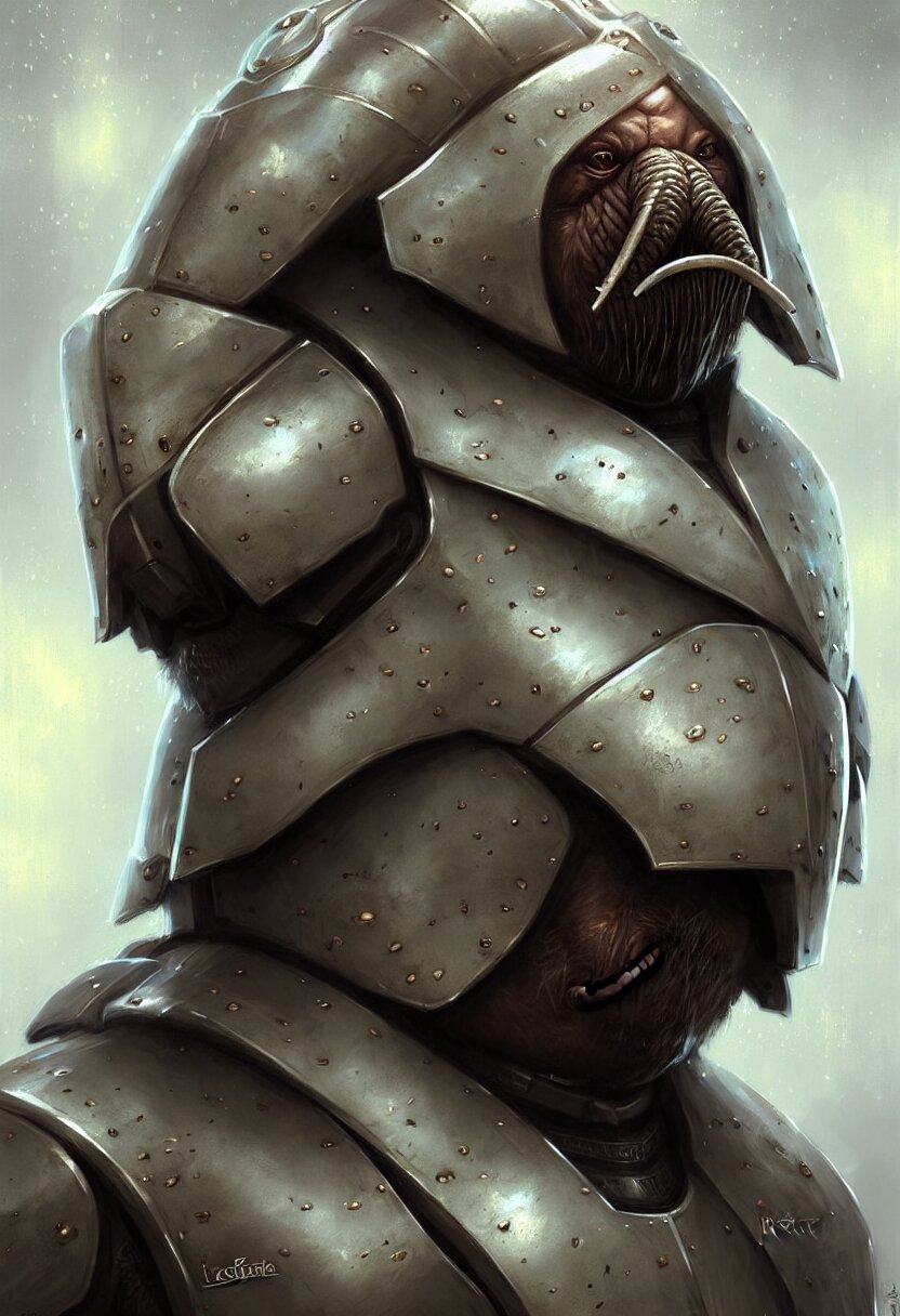 Concept art portrait illustration of a walrus in a suit of armour by bastien lecouffe deharme and greg staples